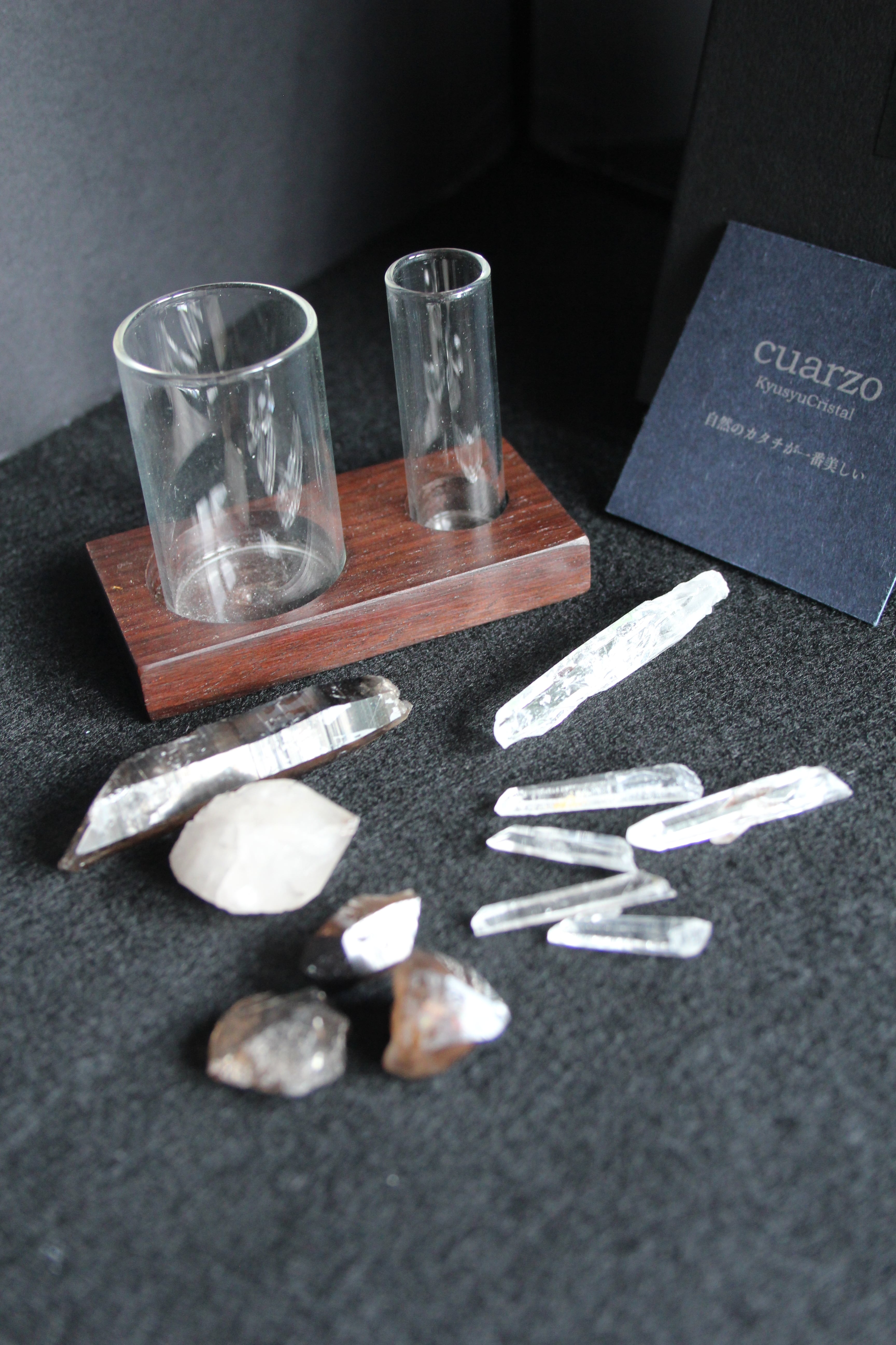 【商品説明】:宮崎産の透明度高い水晶と、ほんのり茶色からモリオンに近い黒水晶など、バリエーションが豊富な煙水晶を各5本づつガラス製の試験管に詰めたセット。試験管台は、もちろんローズウッド。水晶は欠けや傷はありますが、宮崎産水晶の原石をお手元に置きたい人は、とってもお得なセットです。