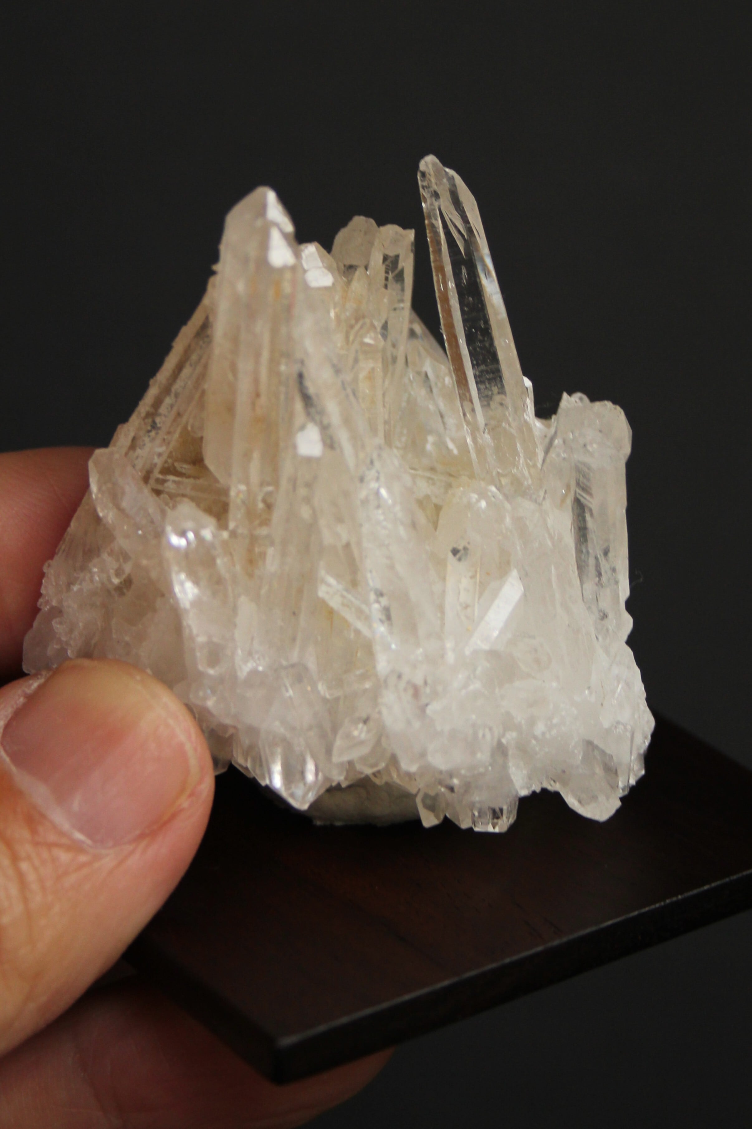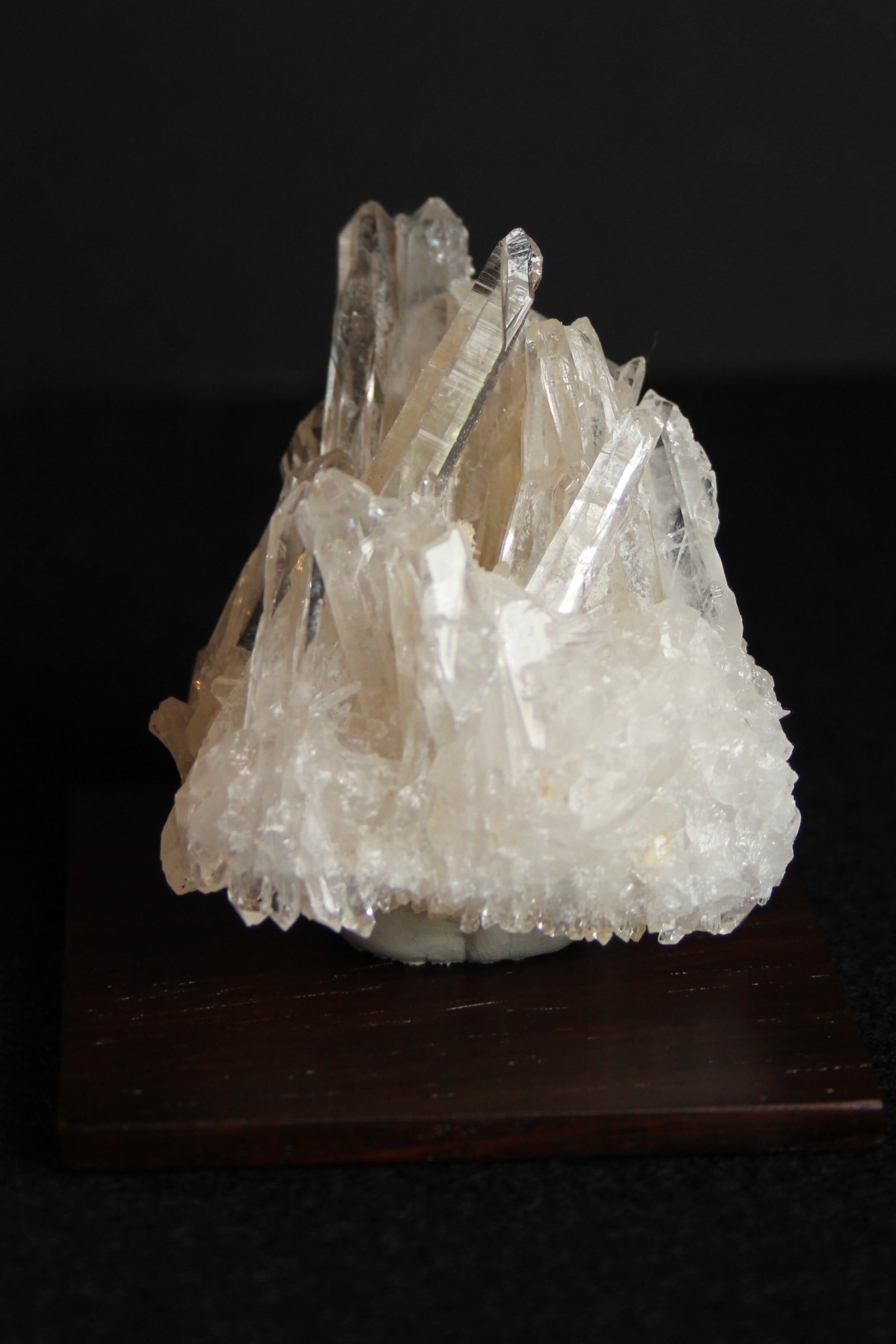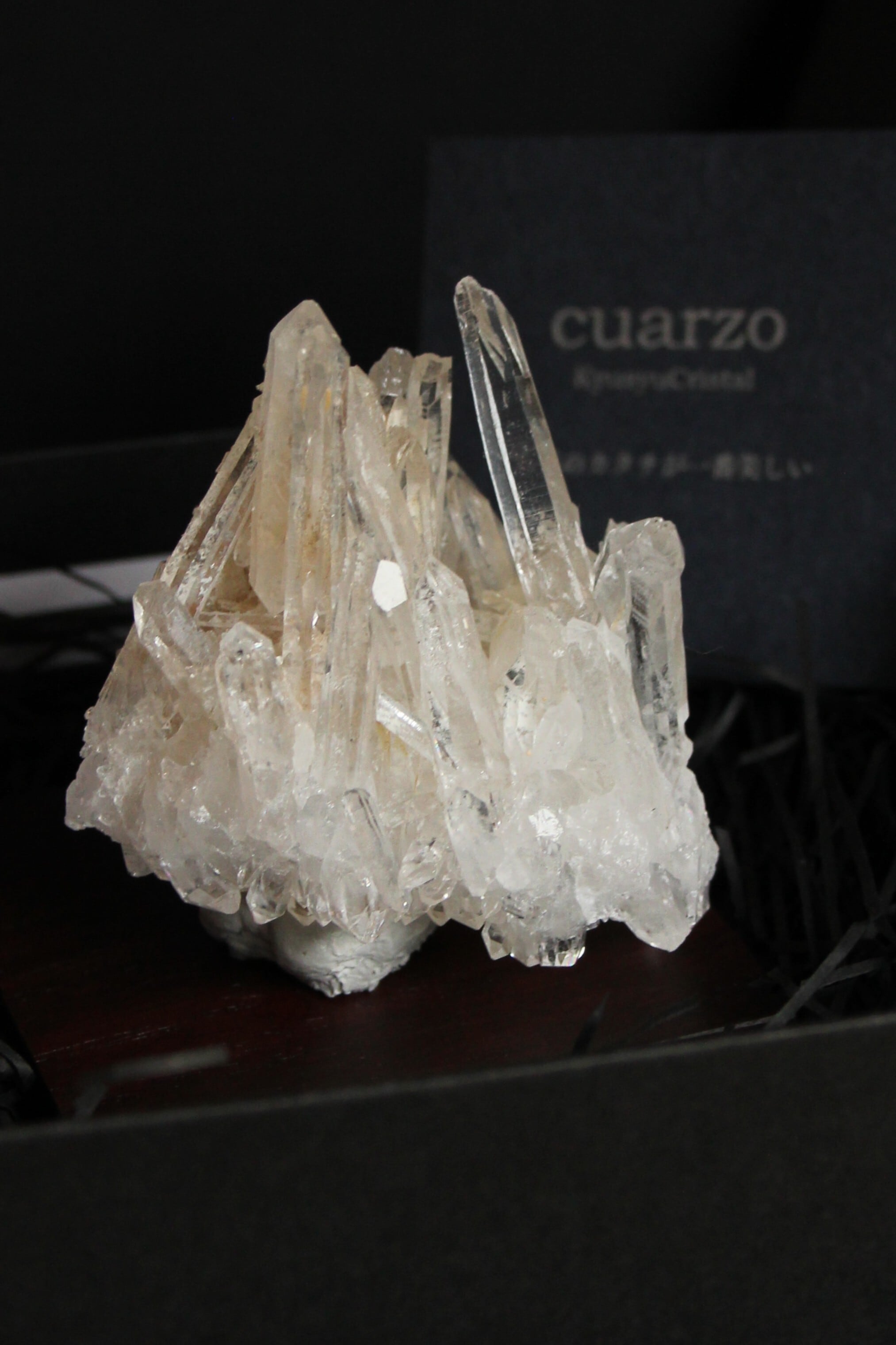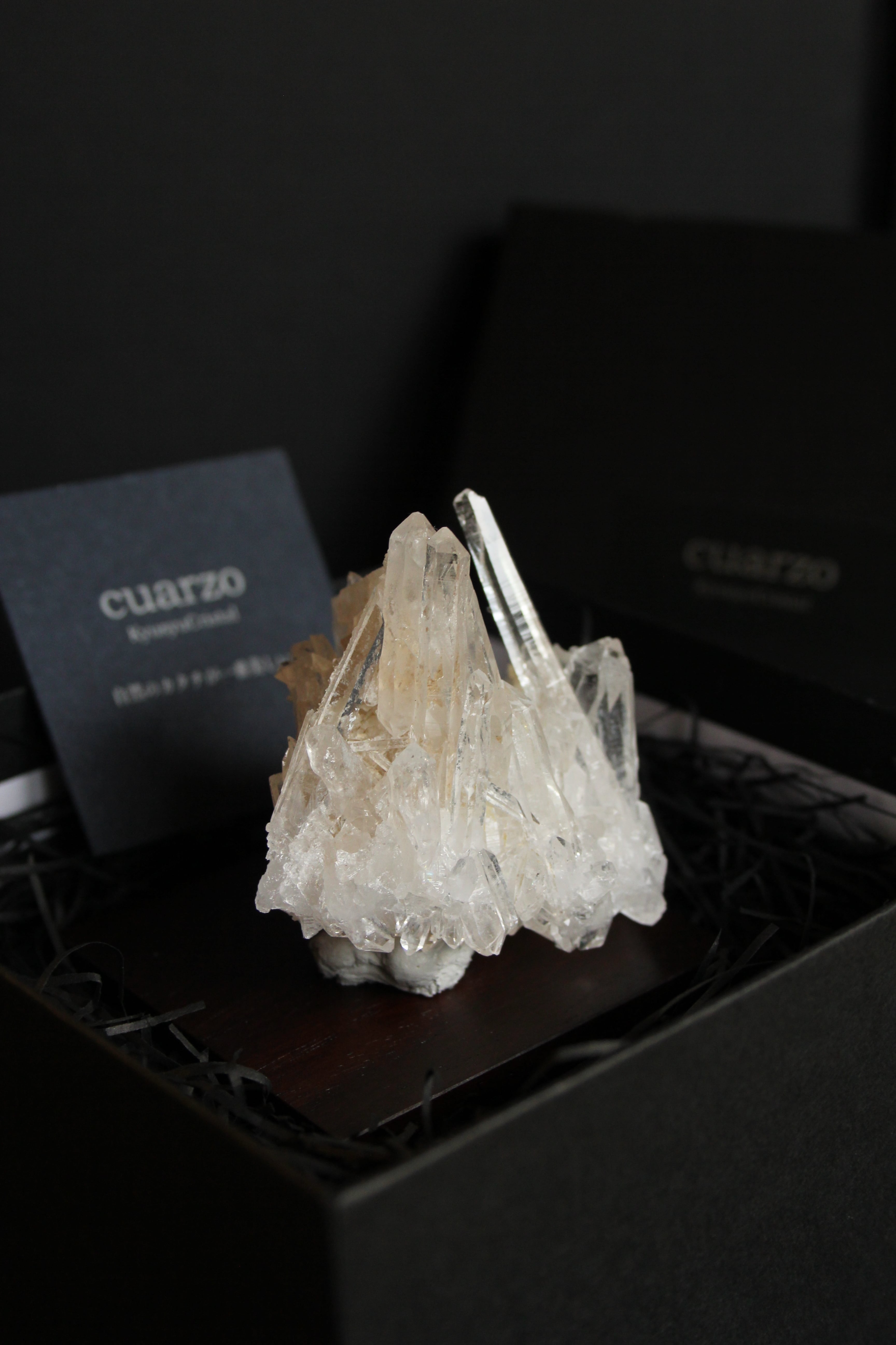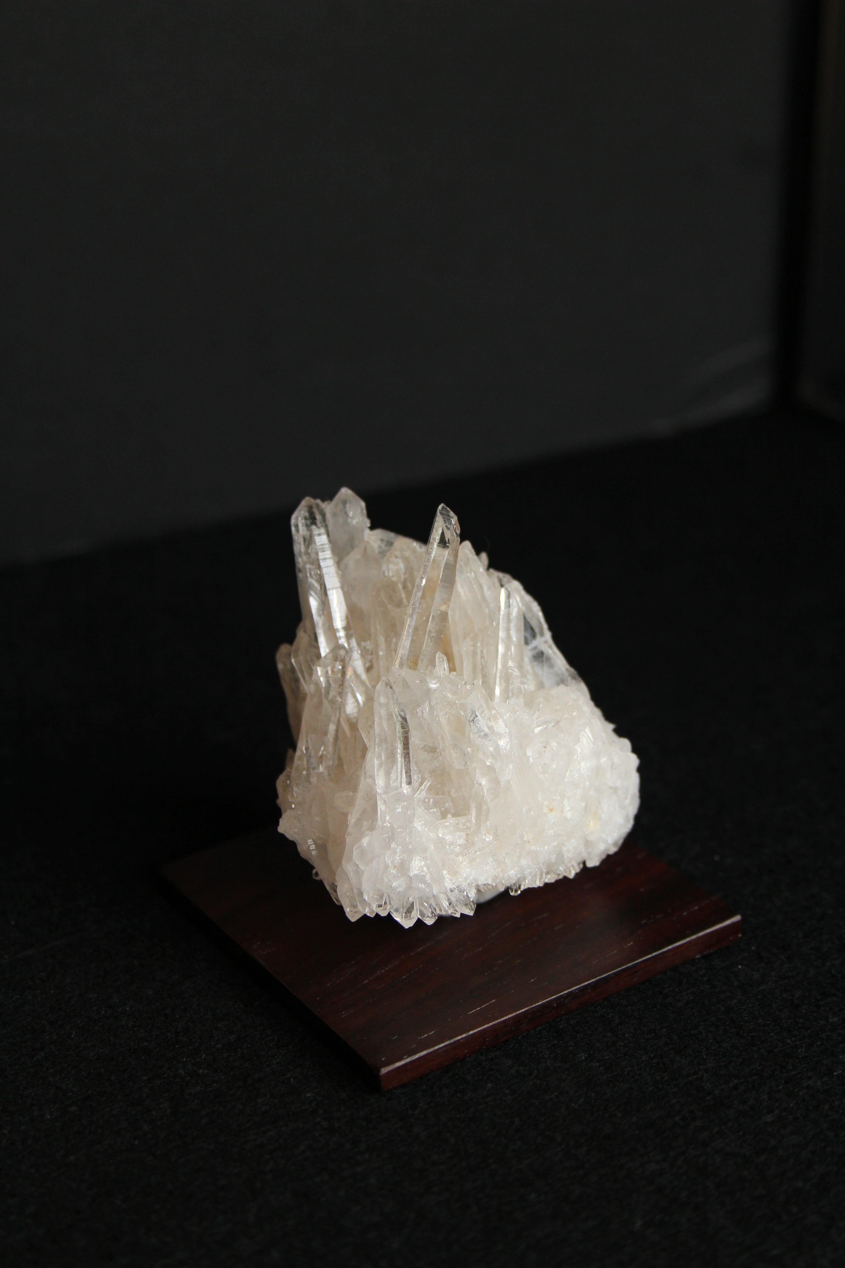 【商品説明】:水晶の原石と高級木材のローズウッドを使用した置物。透明度の高い宮崎産水晶。この産地の特徴をとらえたようなギザギザのクラスターです。ローズウッドスクエア60の大きさ(約60x60x5mm)