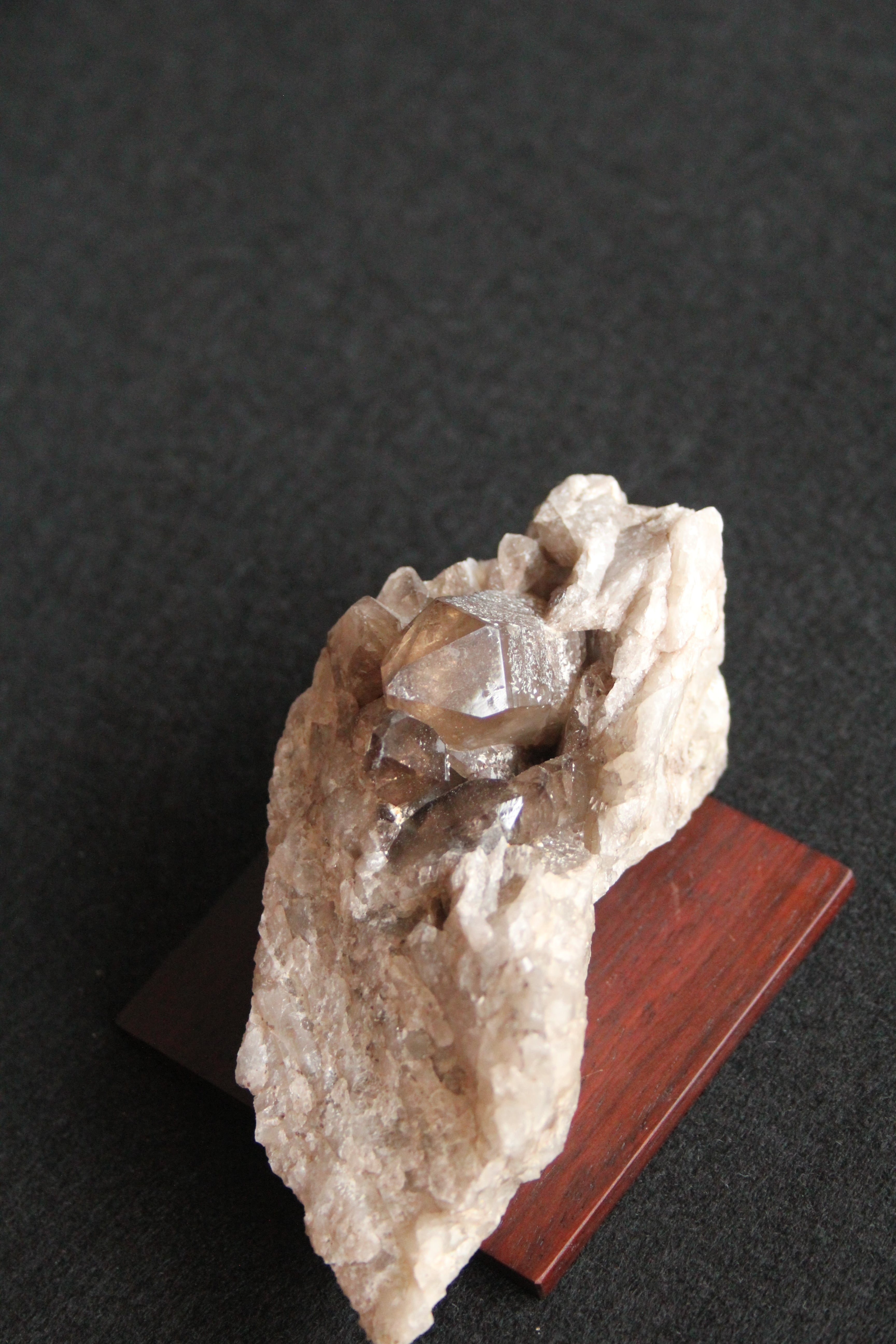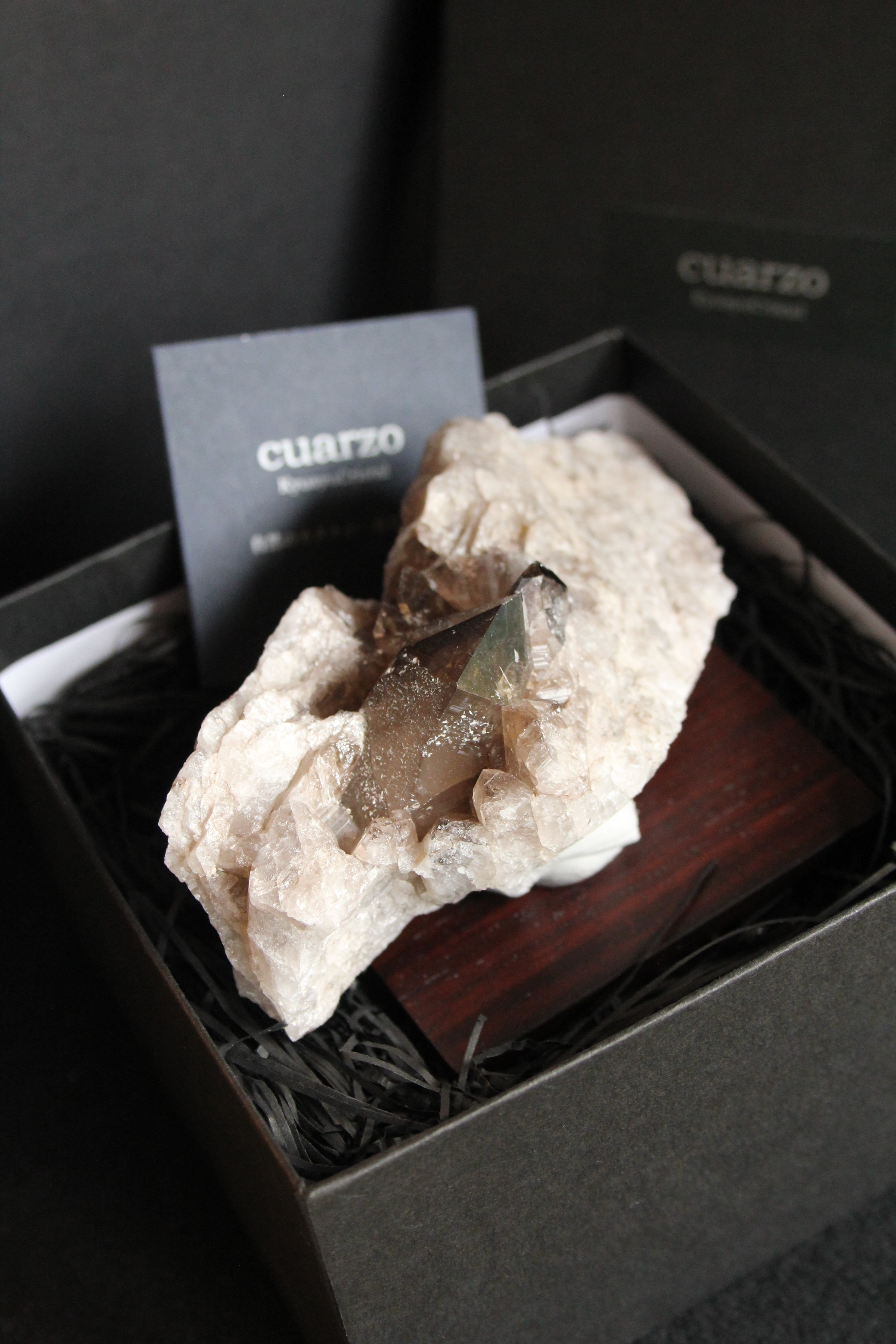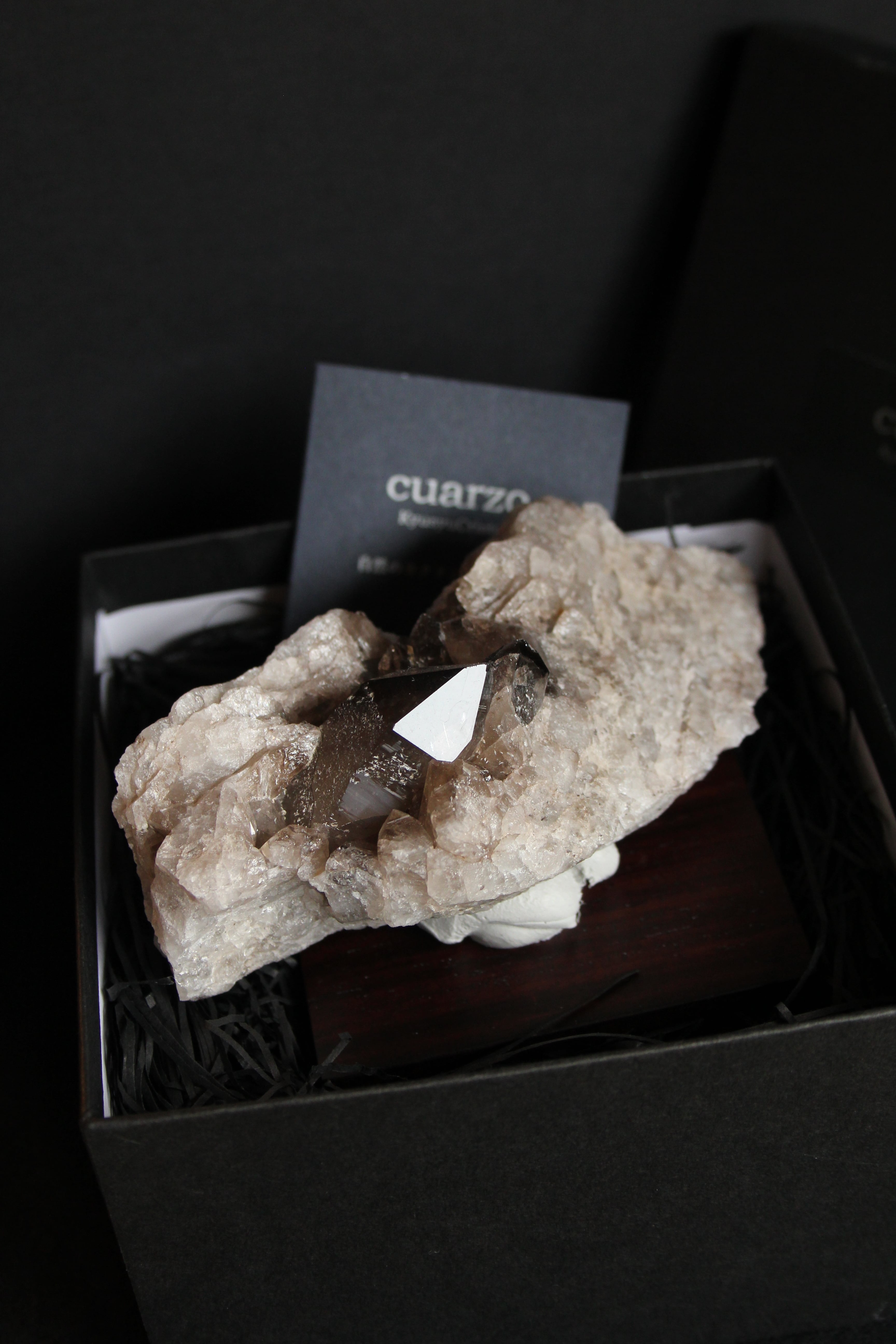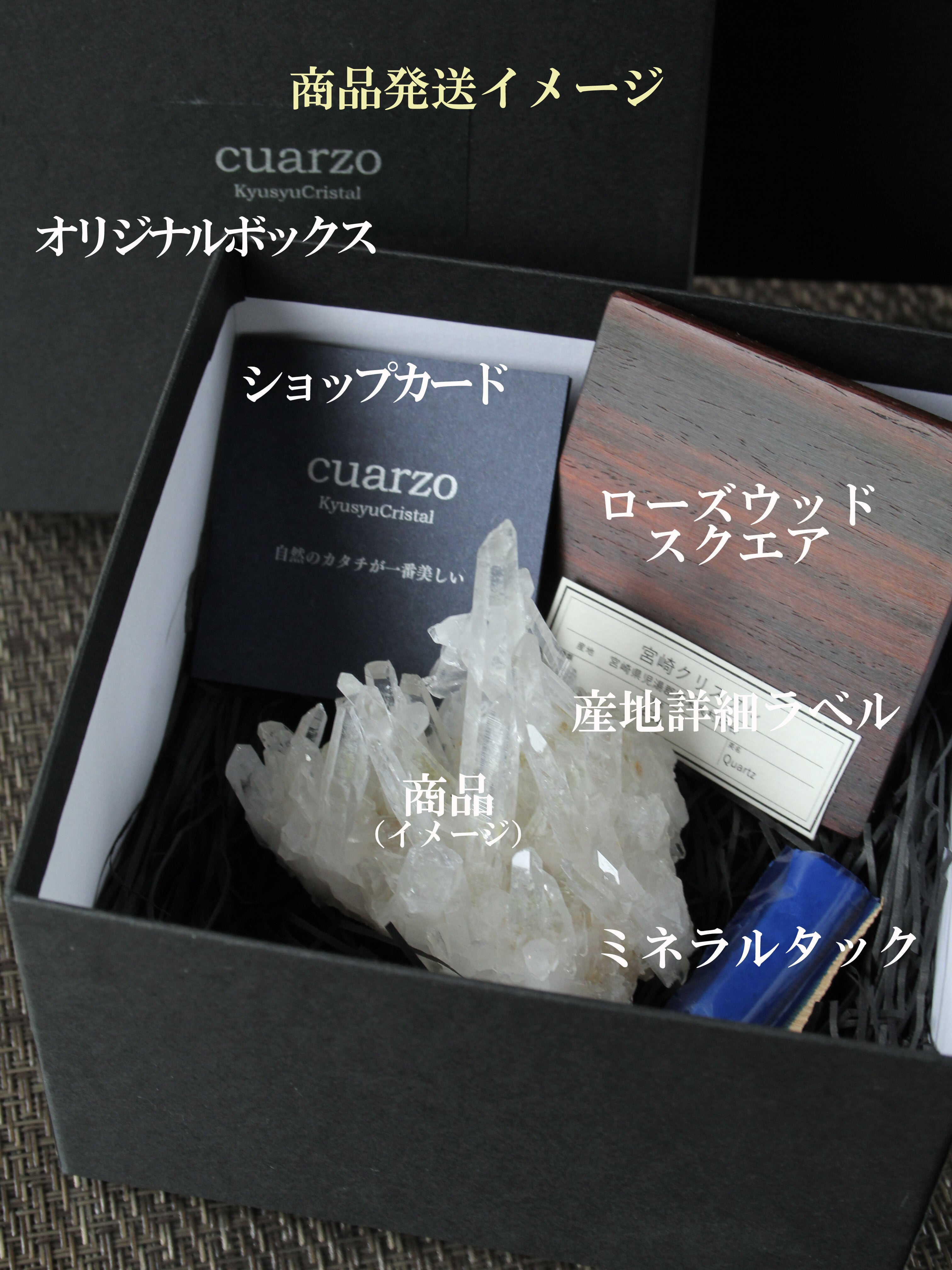 【商品説明】:水晶の原石と高級木材のローズウッドを使用した置物。ペグマタイトから母岩ごとポイント水晶を取り出したような宮崎産の煙水晶です。大きな水晶は、モリオンに近い黒で、透明感があります。この産地の中でも、モリオンに近い黒っぽい煙水晶が取れるのは、ごく限られた地域です。ローズウッドスクエア70の大きさ(約70x70x5mm)
