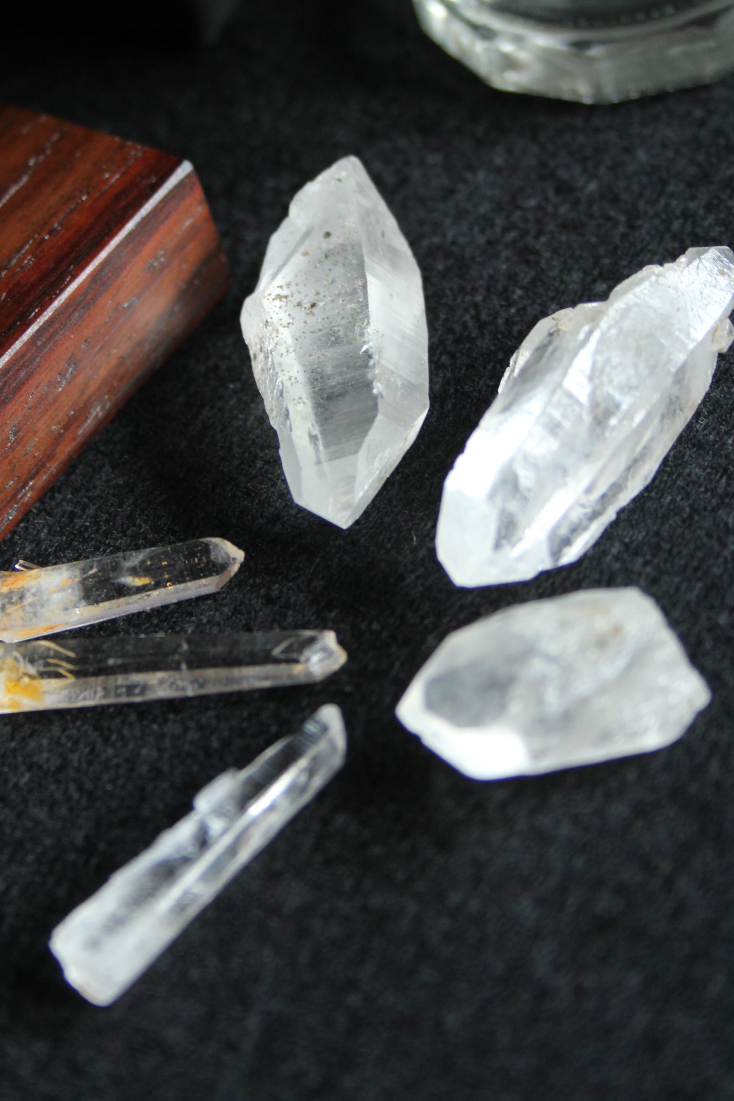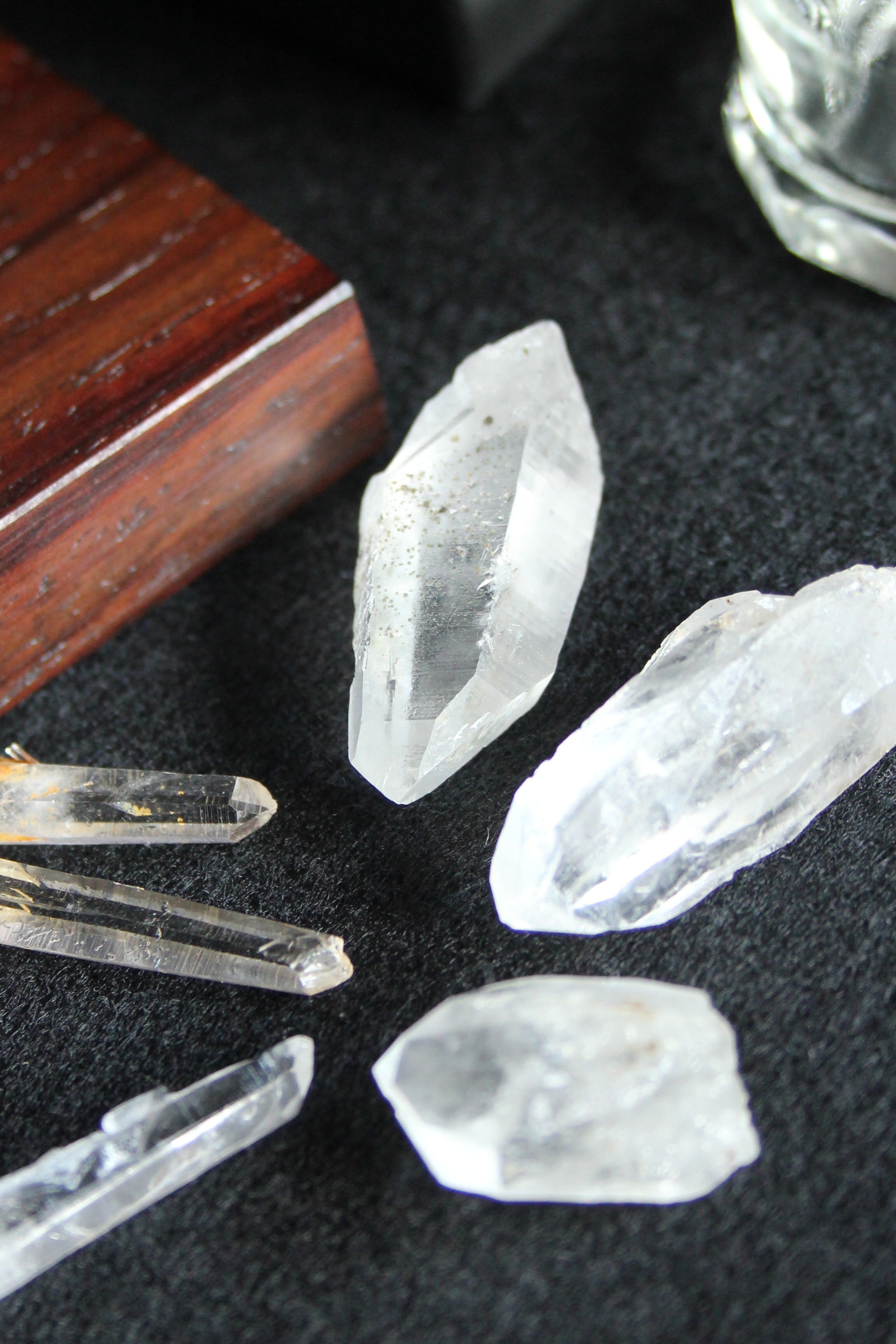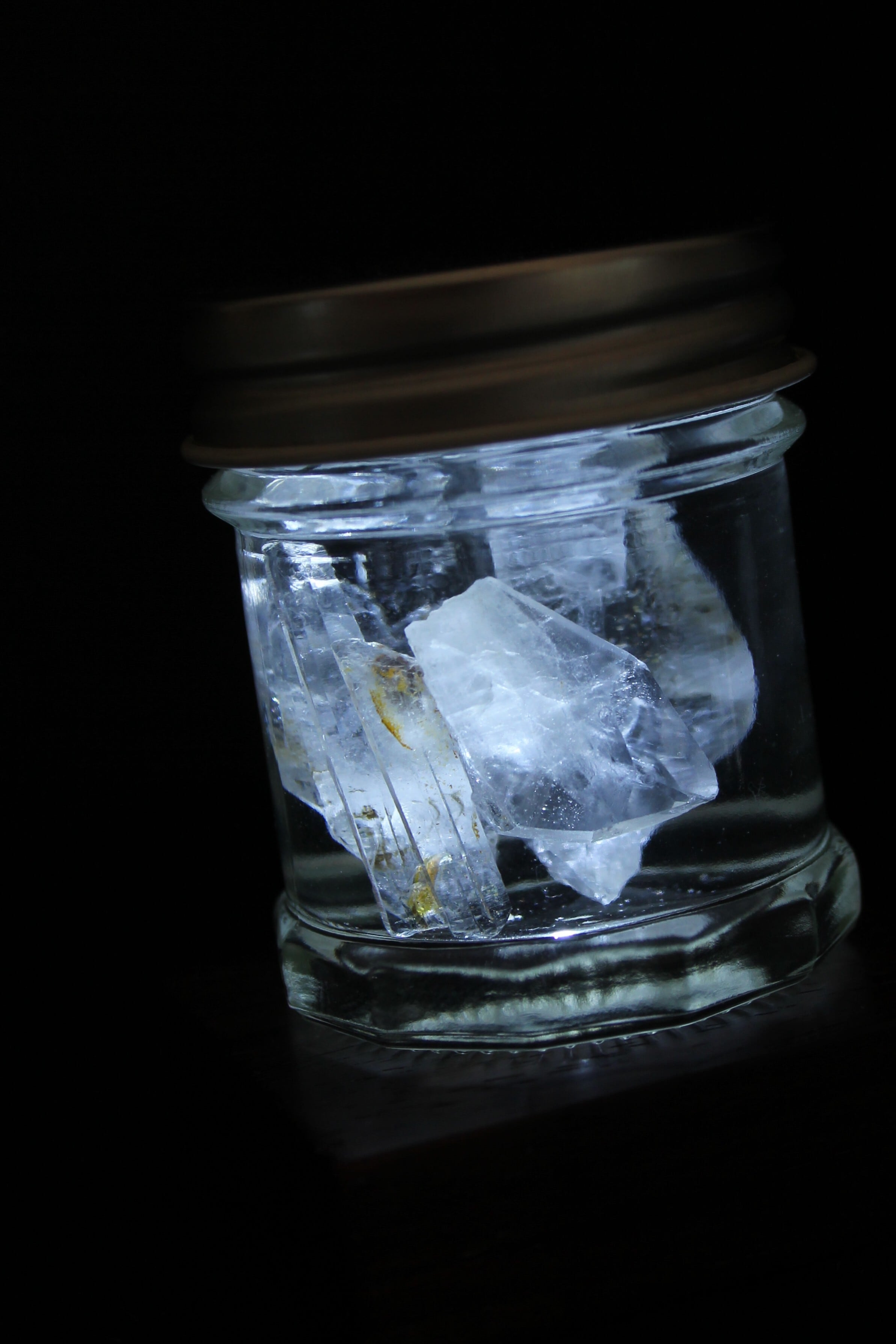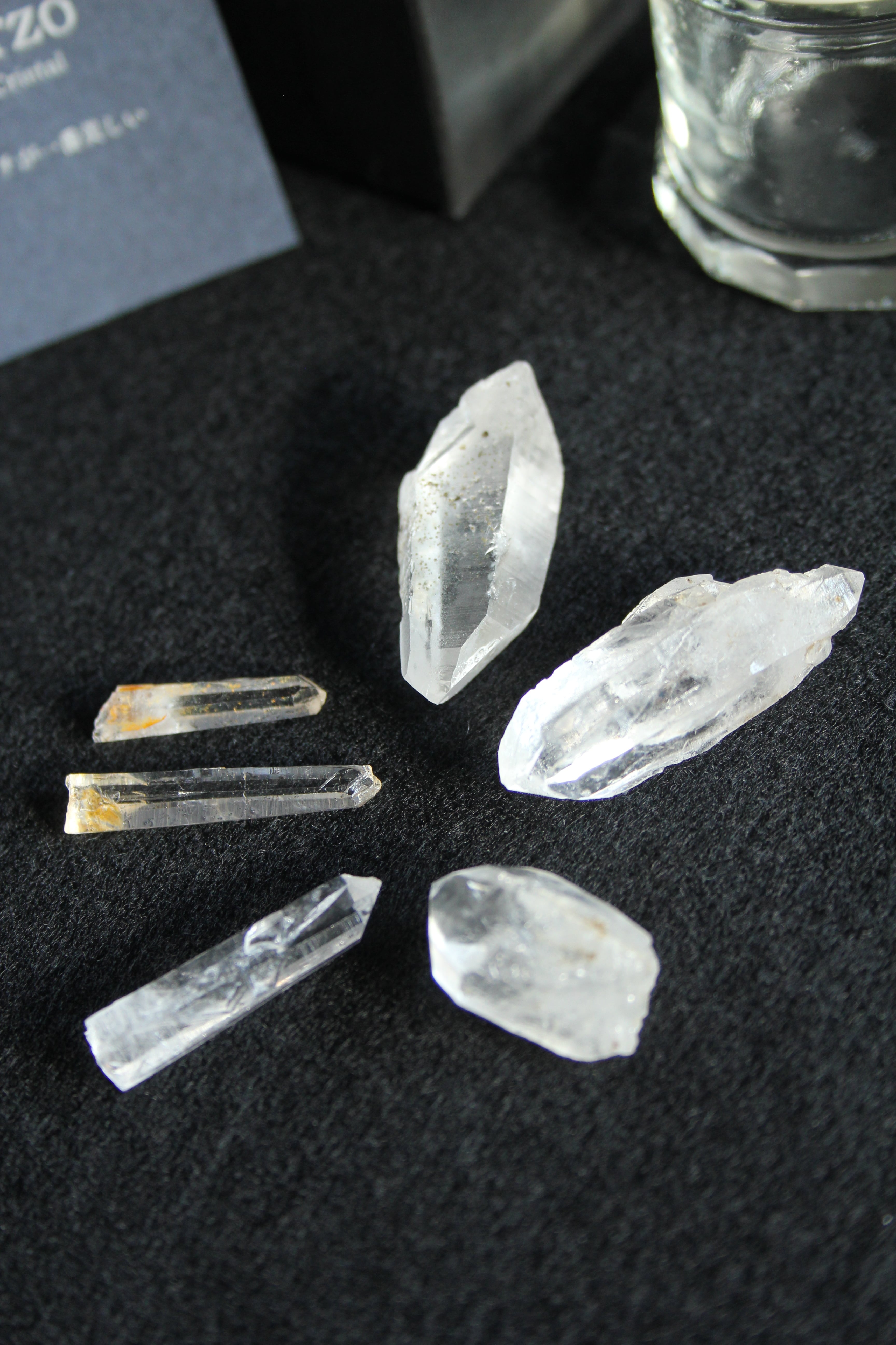 【商品説明】:2種の宮崎産の水晶を使ったアクアリウム。ローズウッドのベースには、LEDが付いており、下から光を当てることができます。産地の違う宮崎産の透明度高い水晶を、それぞれ3個づつ、ビンに詰めています。水晶は欠けや傷はありますが、宮崎産水晶の原石をお手元に置きたい方にはおすすめです。