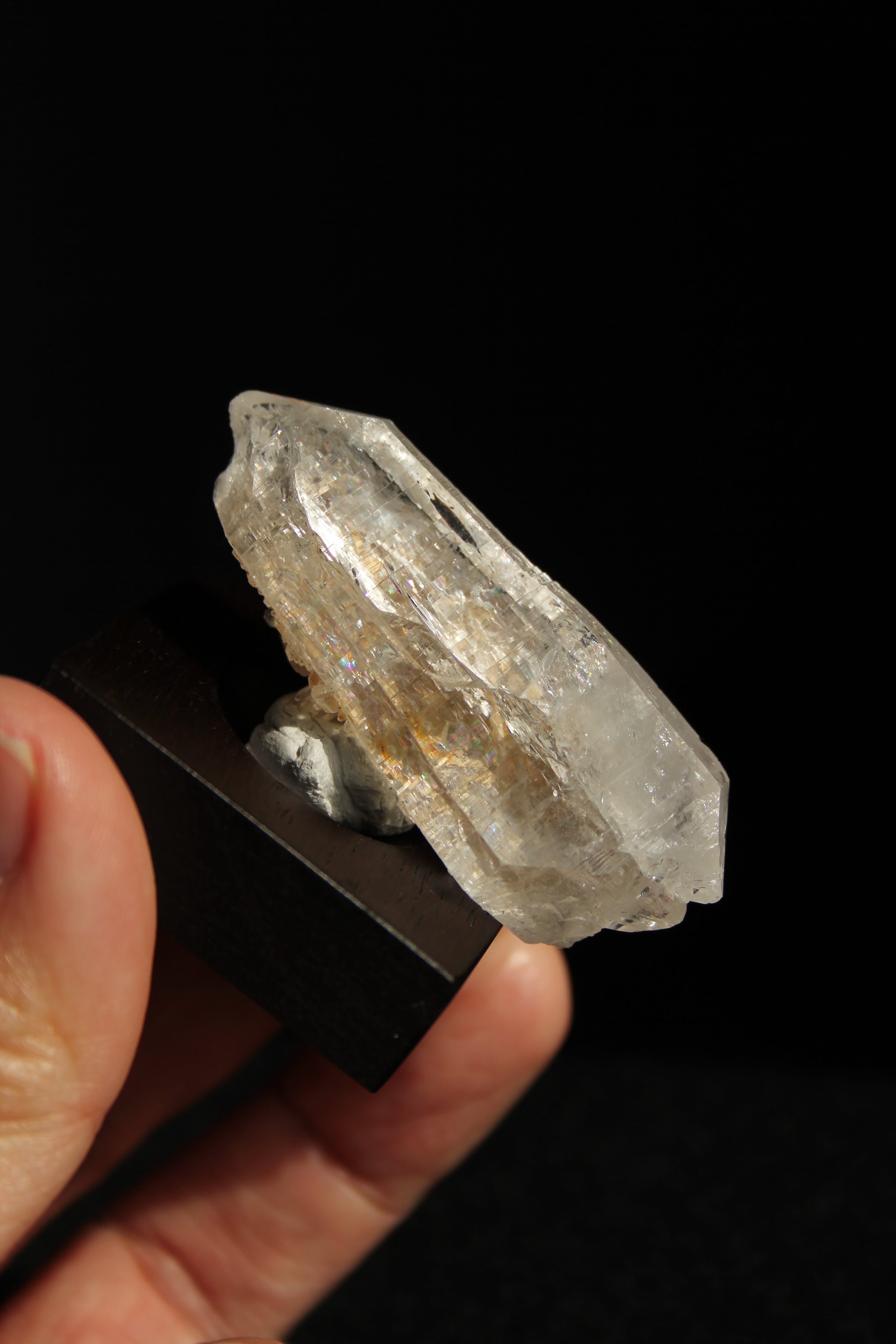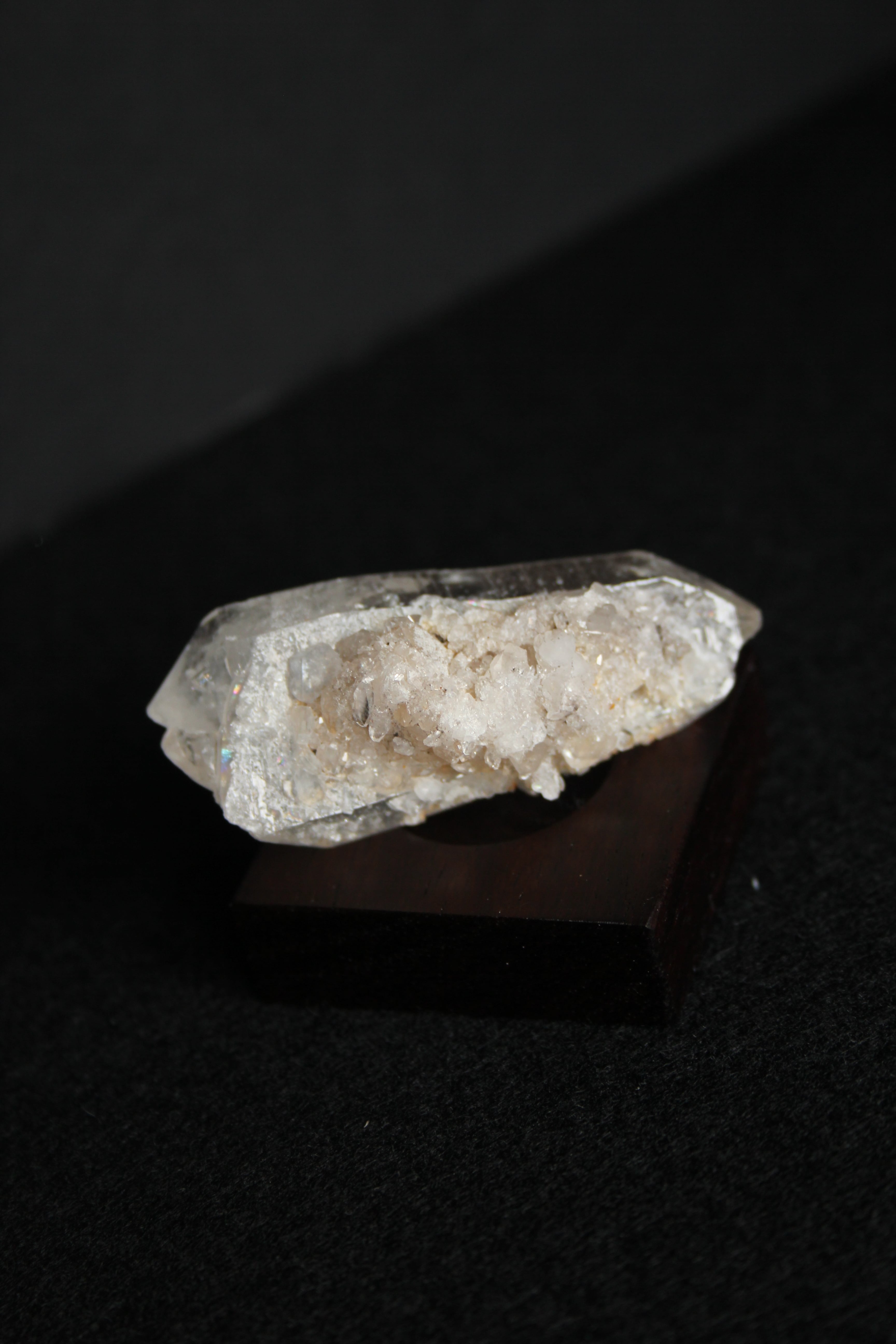 【商品説明】:水晶の原石と高級木材のローズウッドを使用した置物。この産地で稀にとれる5cmを超える両錘の水晶です。クラックもカッコ良く、裏面はこの産地の特徴でもある小さな水晶がまぶしたようにいっぱい付いてます。ローズウッドベースの大きさ(約40x40x12mm)水晶を置く部分には「座ぐり」と呼ばれる円形の溝を掘っております。簡単のように見えますが、硬い木材のローズウッドに、一定の深さの溝を掘るには、非常に高度な技術を用います。木工歴50年の職人が成せる技です