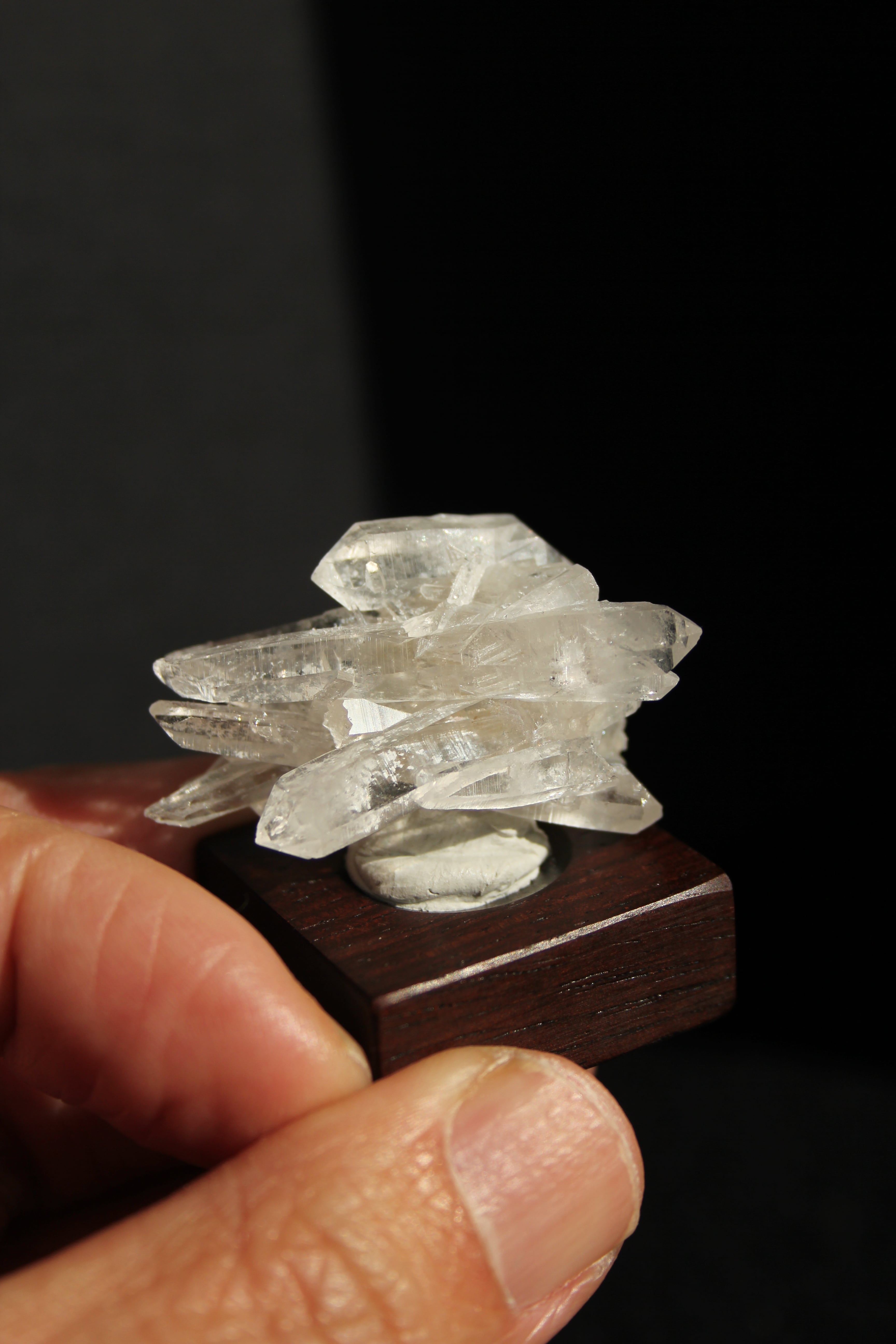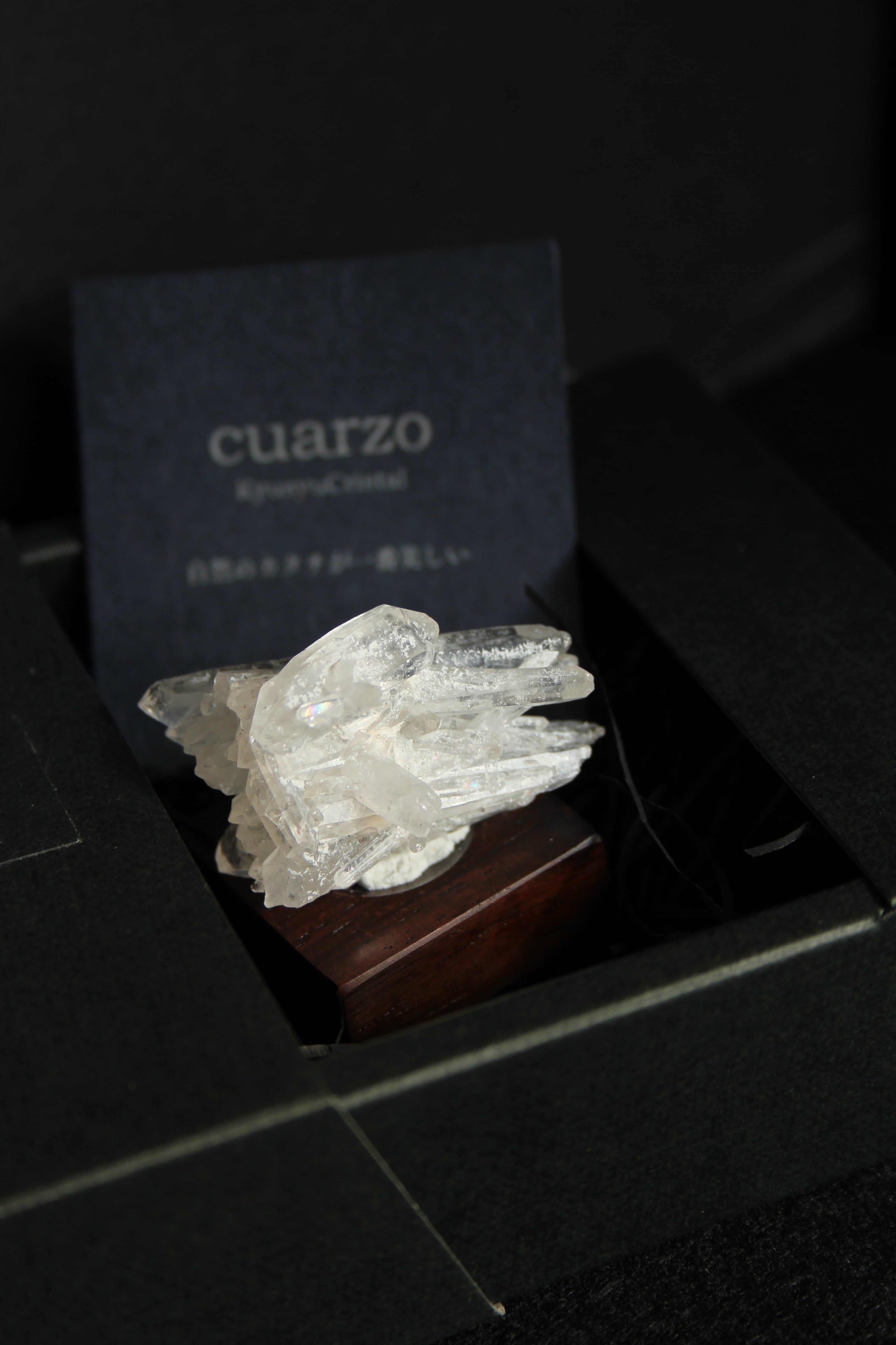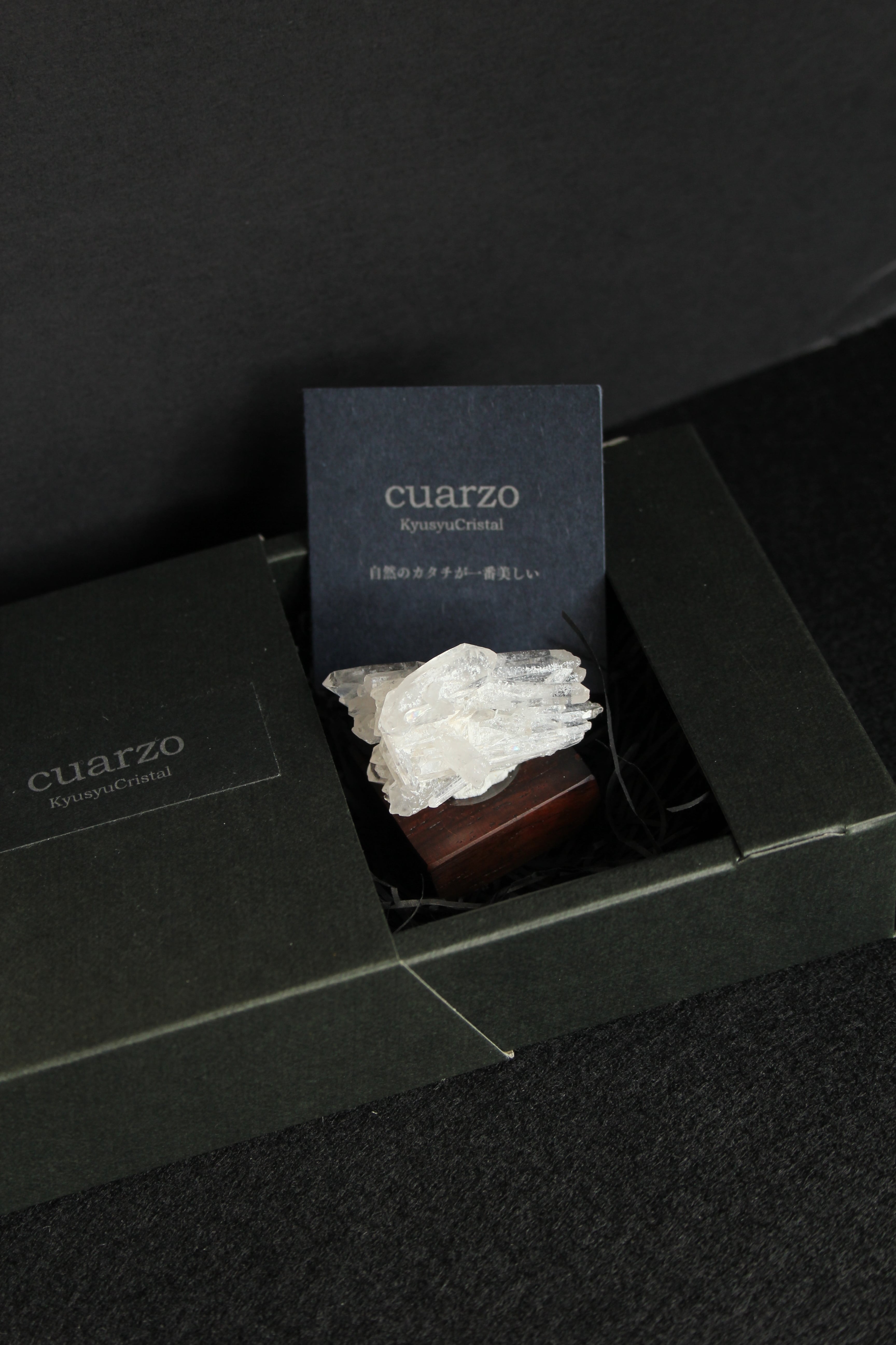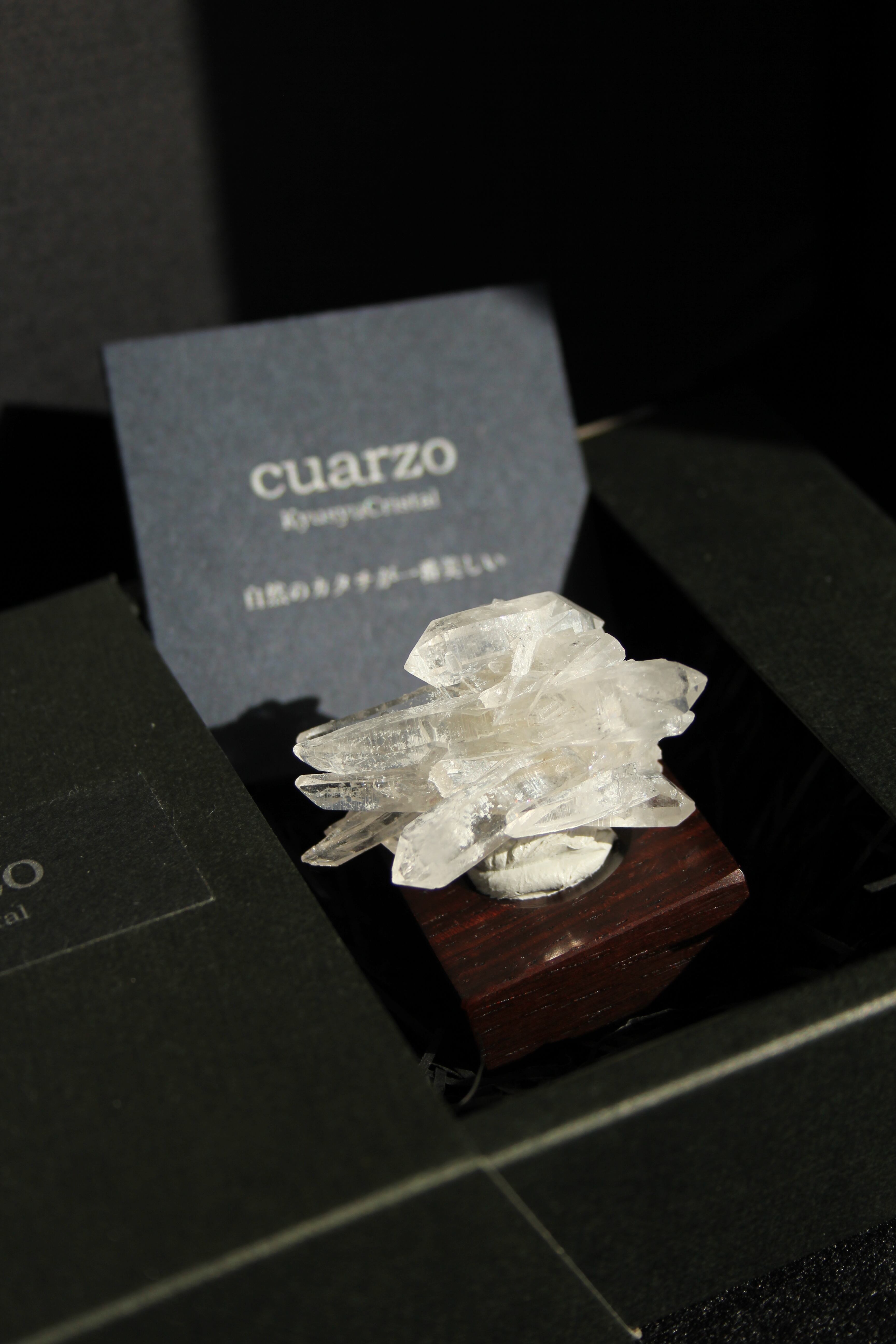 【商品説明】:水晶の原石と高級木材のローズウッドを使用した置物。中心から360度方向に伸びる珍しい形のミニクラスターです。この産地の特徴をとらえたようなギザギザのクラスターです。中に数本両錘が含まれております。ローズウッドベースの大きさ(約30x30x12mm)水晶を置く部分には「座ぐり」と呼ばれる円形の溝を掘っております。簡単のように見えますが、硬い木材のローズウッドに、一定の深さの溝を掘るには、非常に高度な技術を用います。木工歴50年の職人が成せる技です