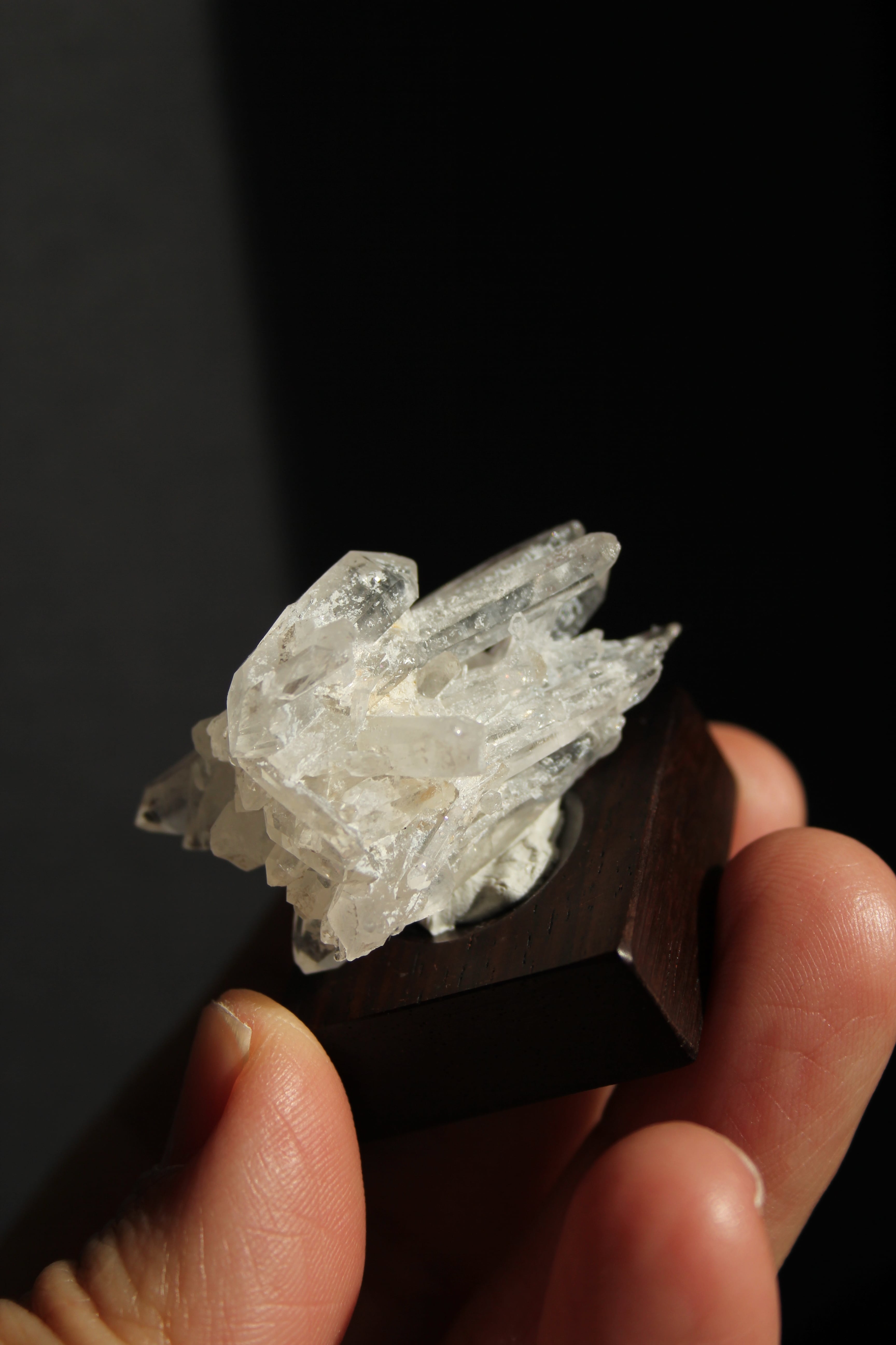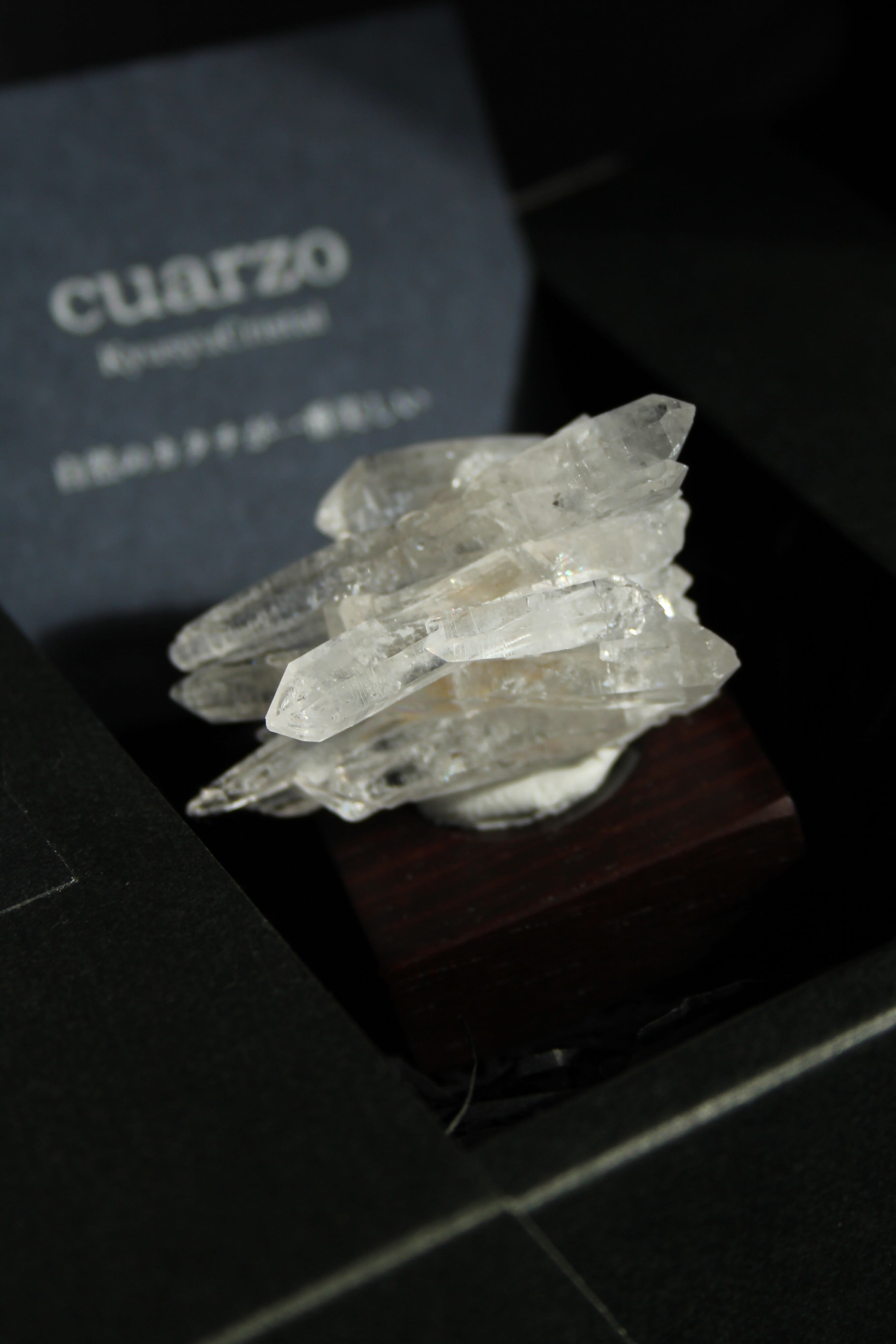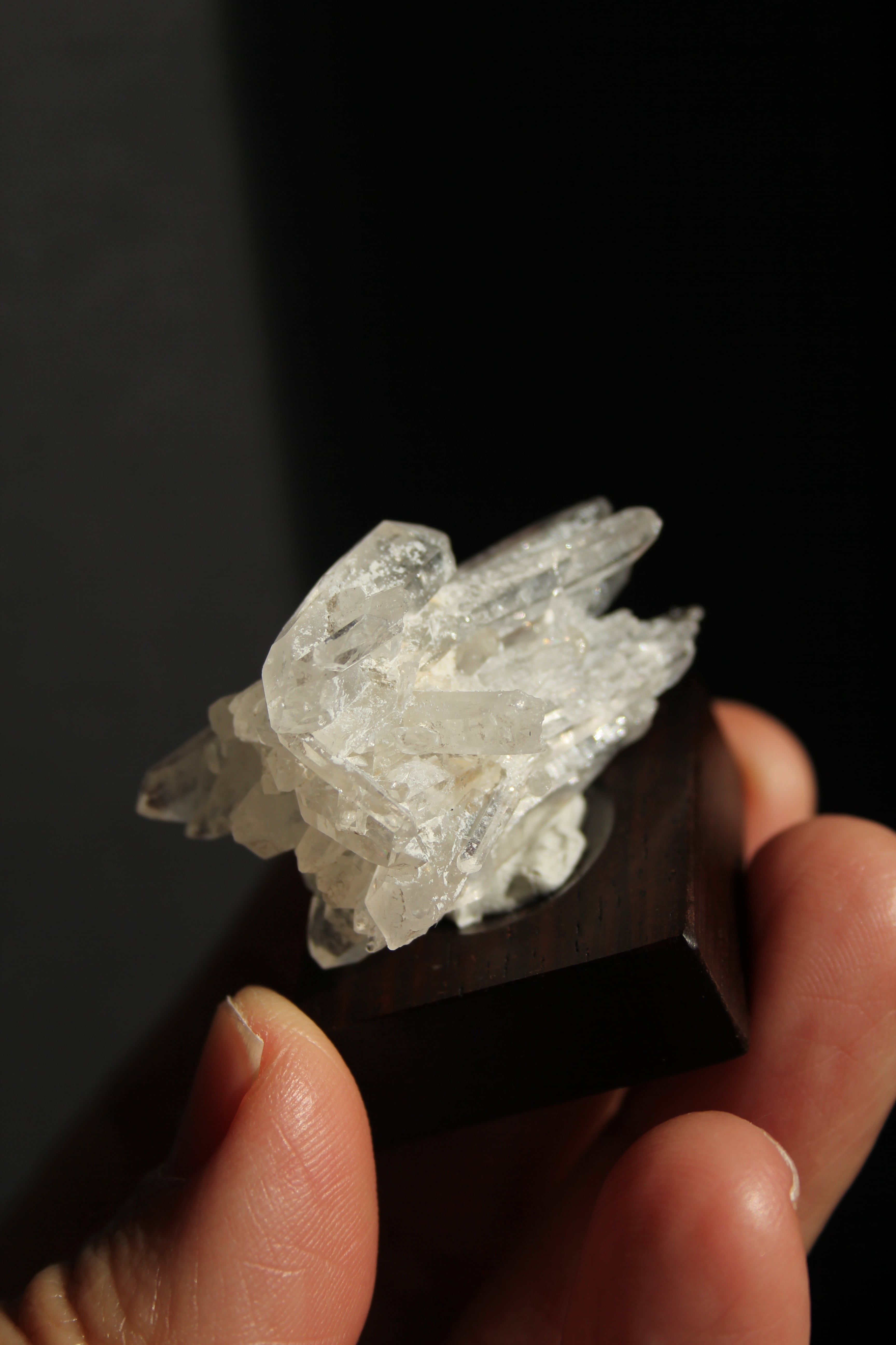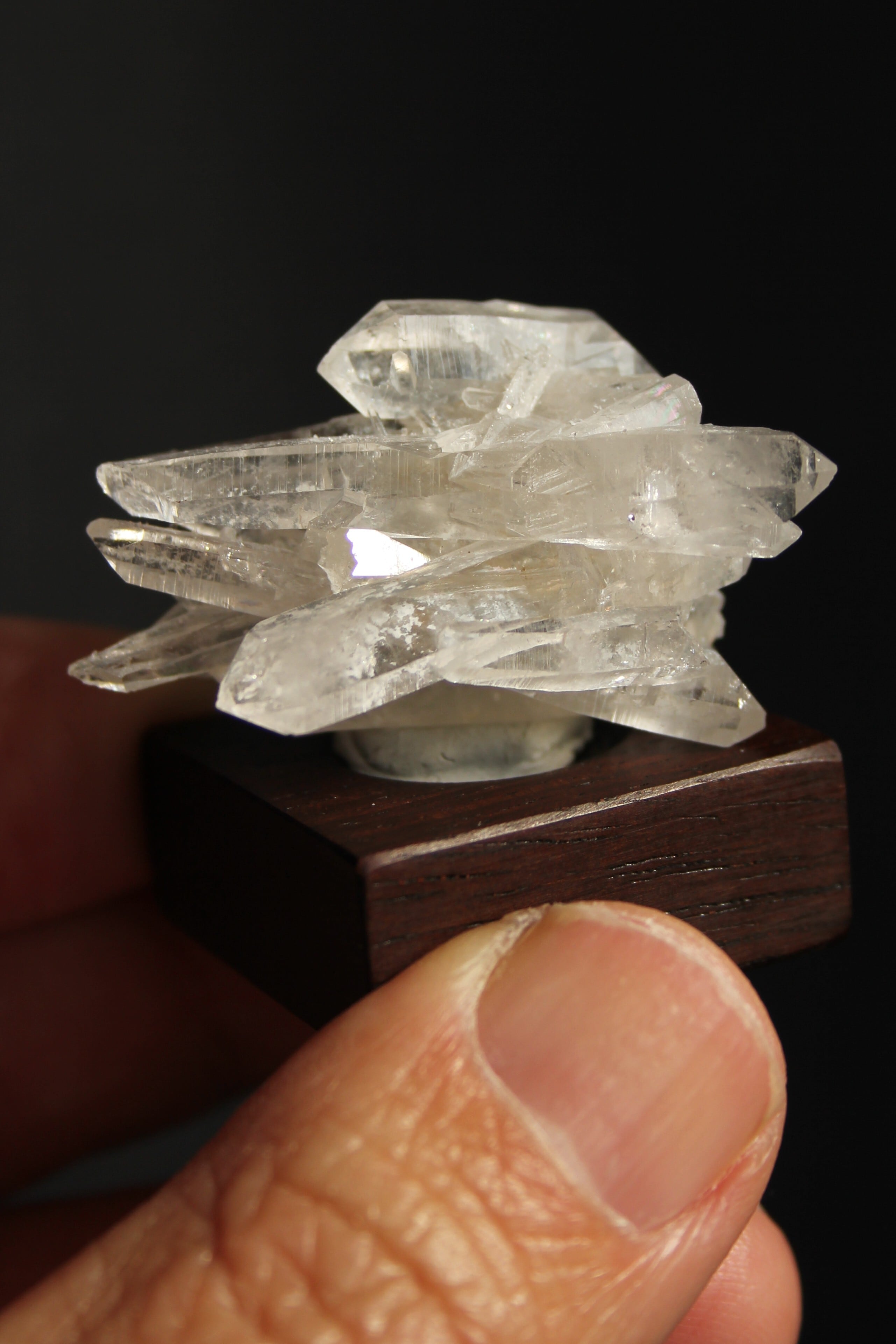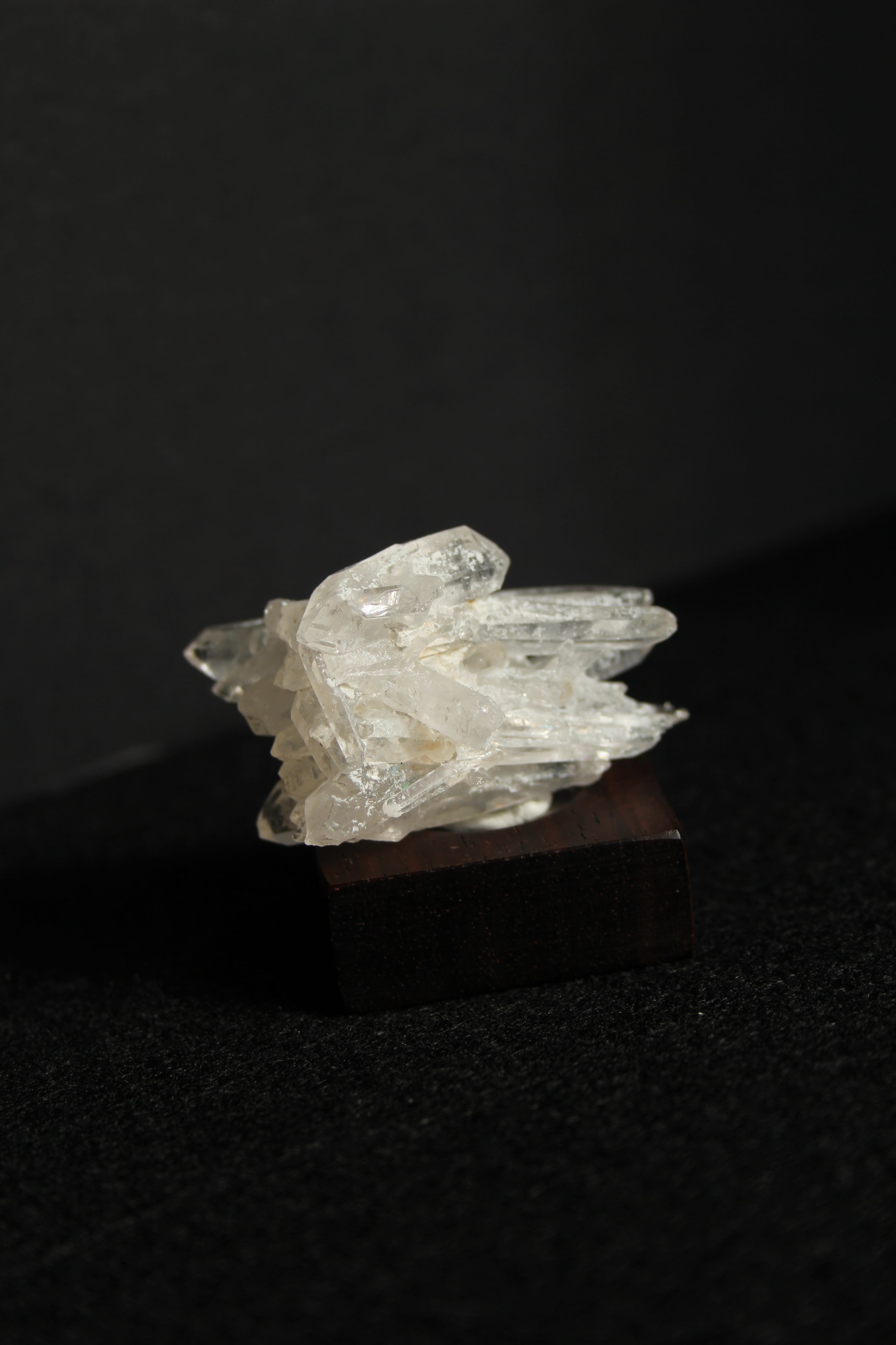 【商品説明】:水晶の原石と高級木材のローズウッドを使用した置物。中心から360度方向に伸びる珍しい形のミニクラスターです。この産地の特徴をとらえたようなギザギザのクラスターです。中に数本両錘が含まれております。ローズウッドベースの大きさ(約30x30x12mm)水晶を置く部分には「座ぐり」と呼ばれる円形の溝を掘っております。簡単のように見えますが、硬い木材のローズウッドに、一定の深さの溝を掘るには、非常に高度な技術を用います。木工歴50年の職人が成せる技です