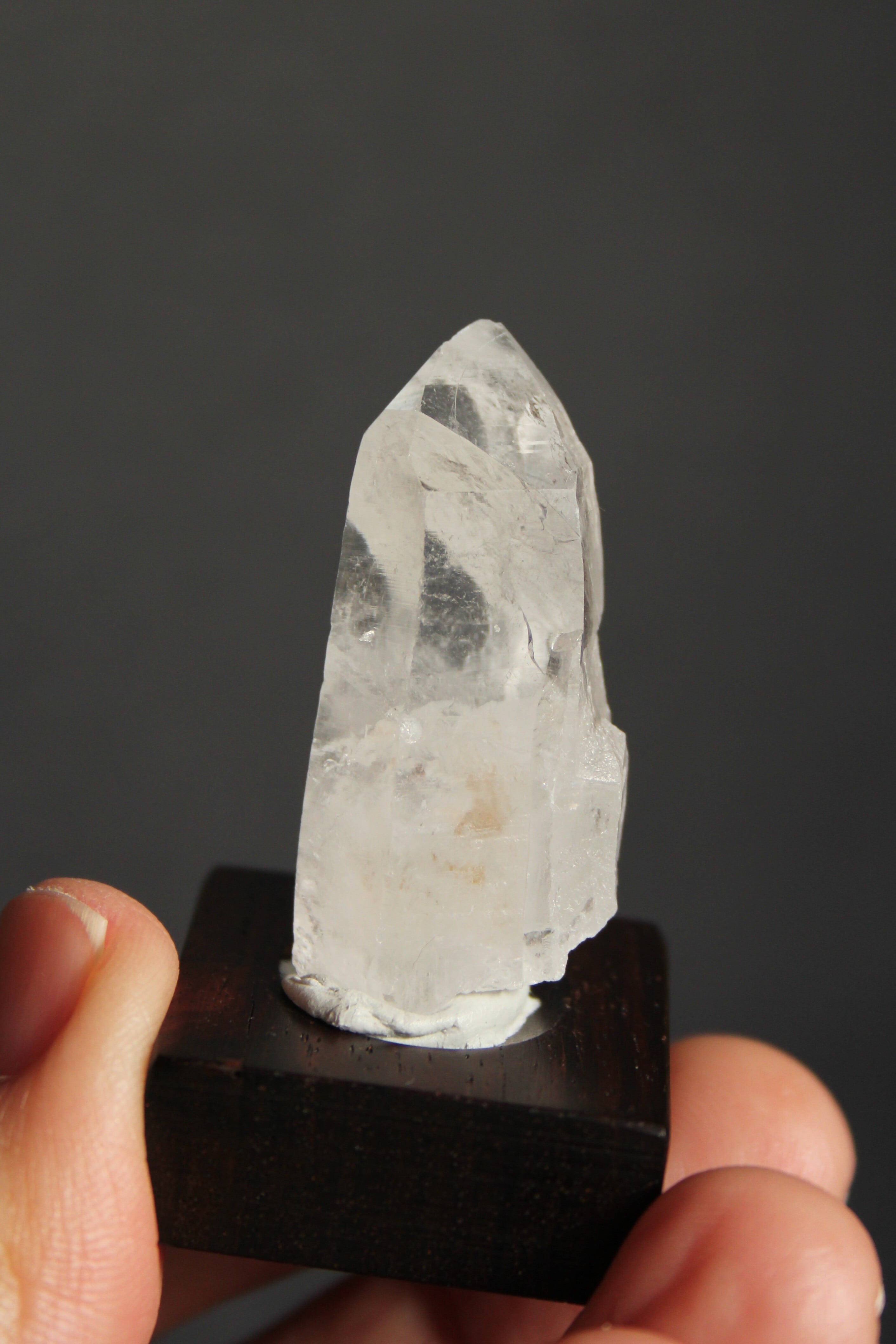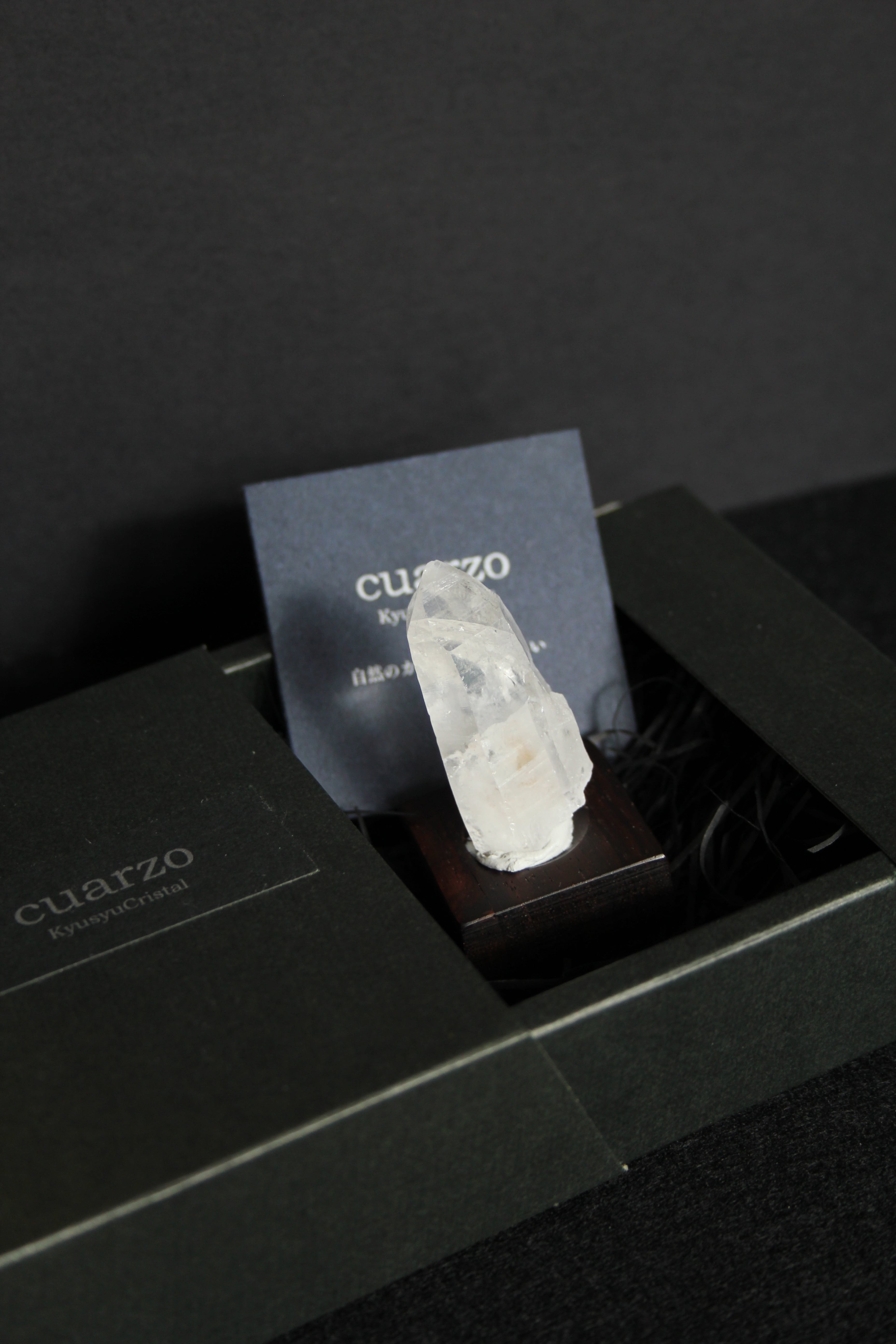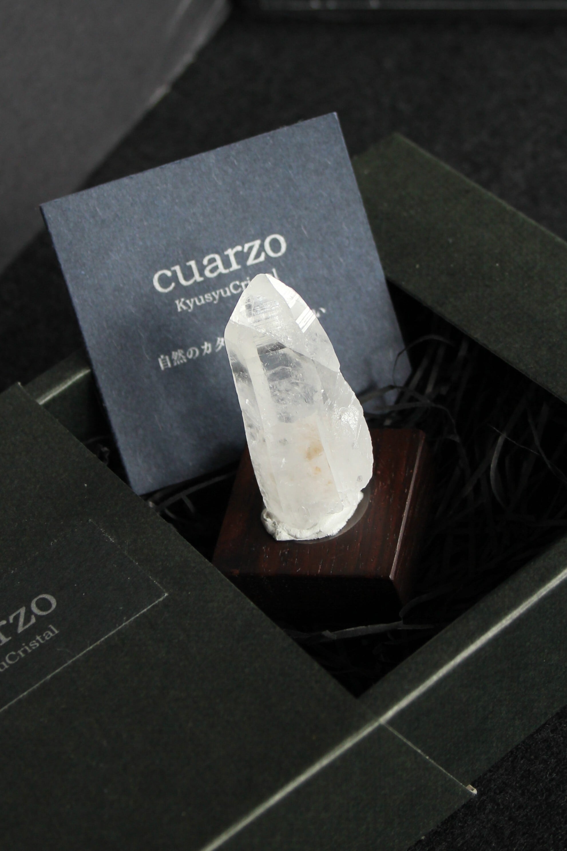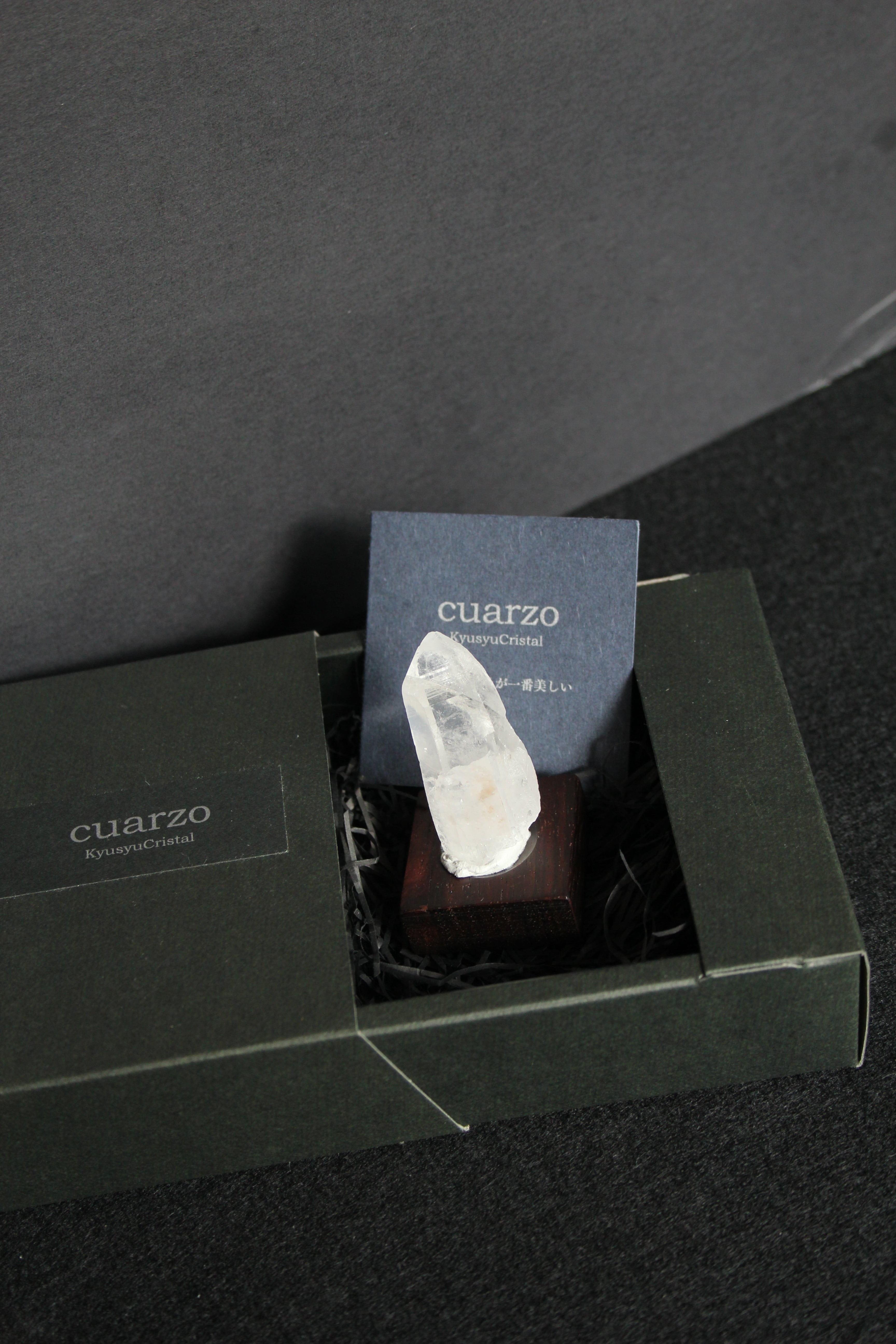 【商品説明】:水晶の原石と高級木材のローズウッドを使用した置物。宮崎クリスタルの中でも、極限られた地域でしか産出されない透明度が抜群に高い日之影町見立産の水晶です。その中でもこの水晶は、抜群の透明度、バランスのとれた六角錘の結晶、惚れぼれするテリ、申し分のない宮崎クリスタルです。良い感じでクラックが入り、中がキラキラしています。ローズウッドベースの大きさ(約30x30x12mm)水晶を置く部分には「座ぐり」と呼ばれる円形の溝を掘っております。簡単のように見えますが、硬い木材のローズウッドに、一定の深さの溝を掘るには、非常に高度な技術を用います。木工歴50年の職人が成せる技です