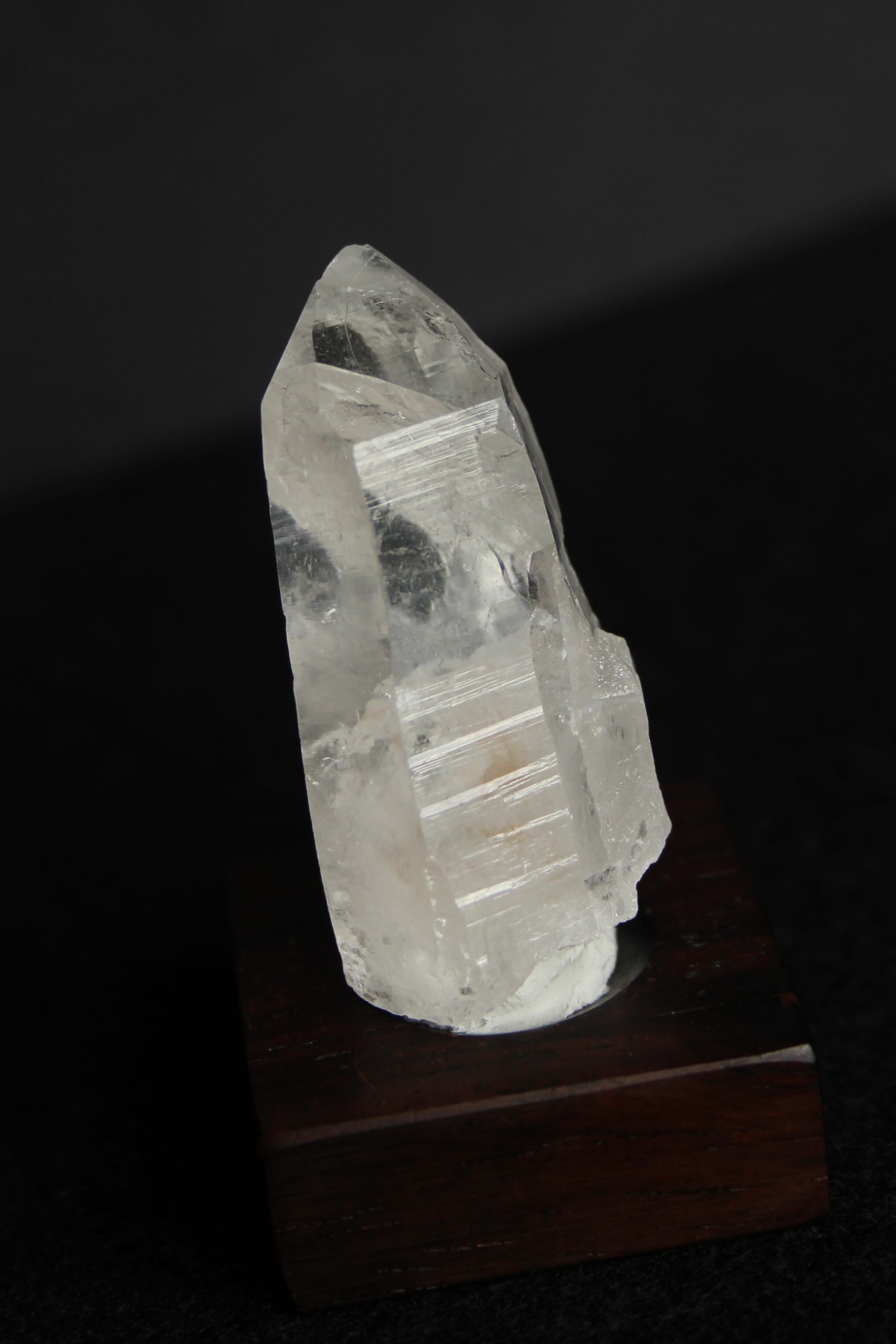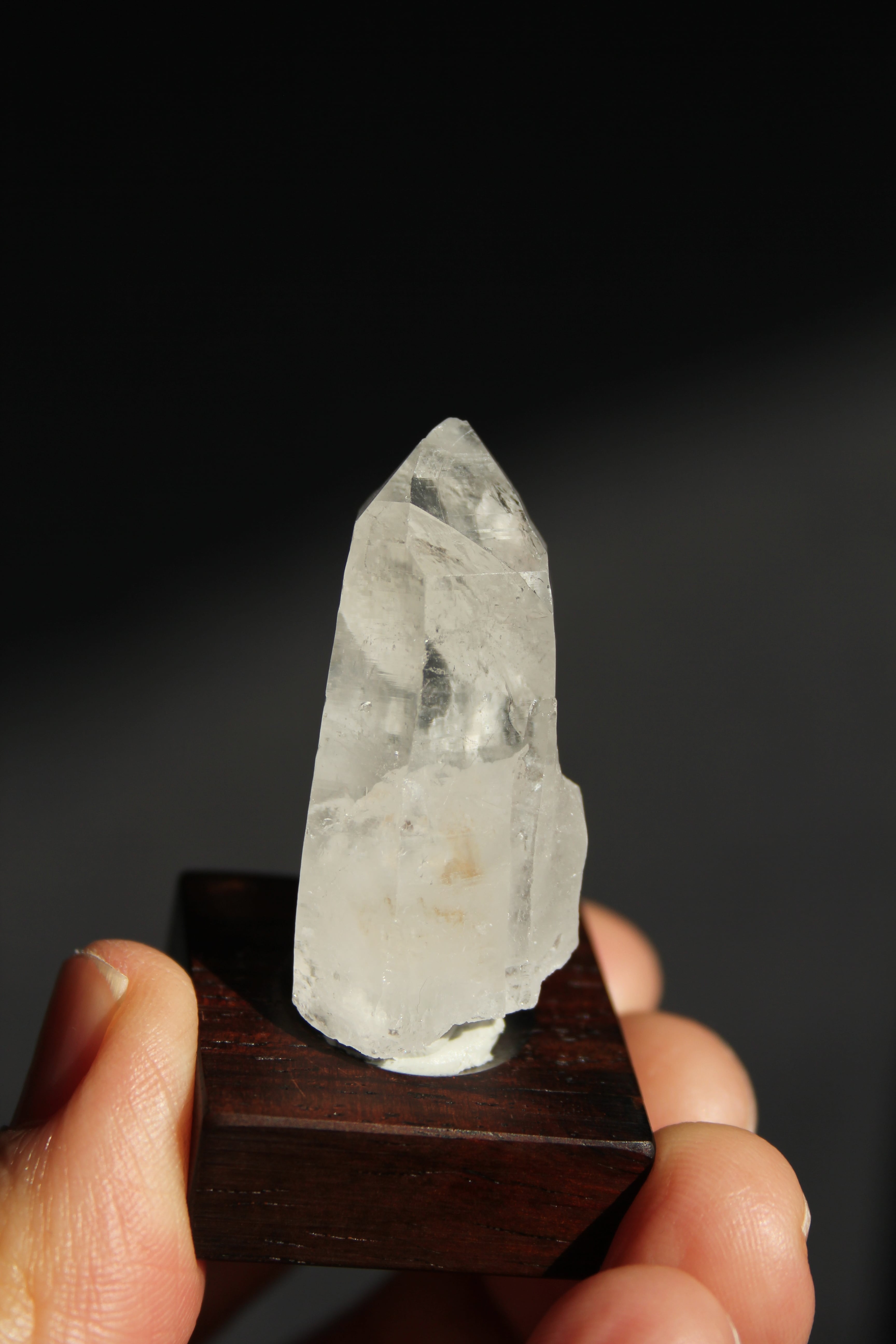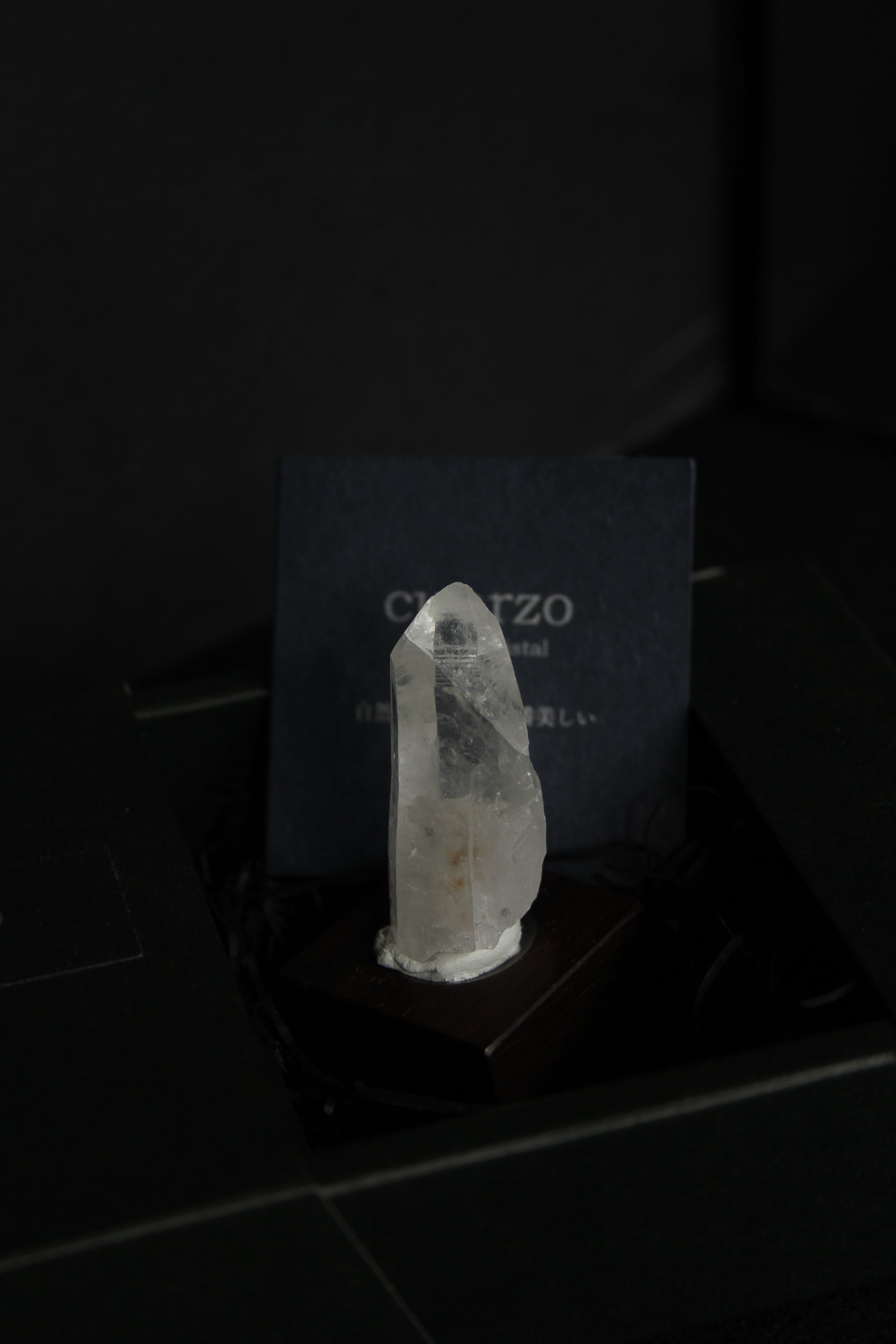 【商品説明】:水晶の原石と高級木材のローズウッドを使用した置物。宮崎クリスタルの中でも、極限られた地域でしか産出されない透明度が抜群に高い日之影町見立産の水晶です。その中でもこの水晶は、抜群の透明度、バランスのとれた六角錘の結晶、惚れぼれするテリ、申し分のない宮崎クリスタルです。良い感じでクラックが入り、中がキラキラしています。ローズウッドベースの大きさ(約30x30x12mm)水晶を置く部分には「座ぐり」と呼ばれる円形の溝を掘っております。簡単のように見えますが、硬い木材のローズウッドに、一定の深さの溝を掘るには、非常に高度な技術を用います。木工歴50年の職人が成せる技です