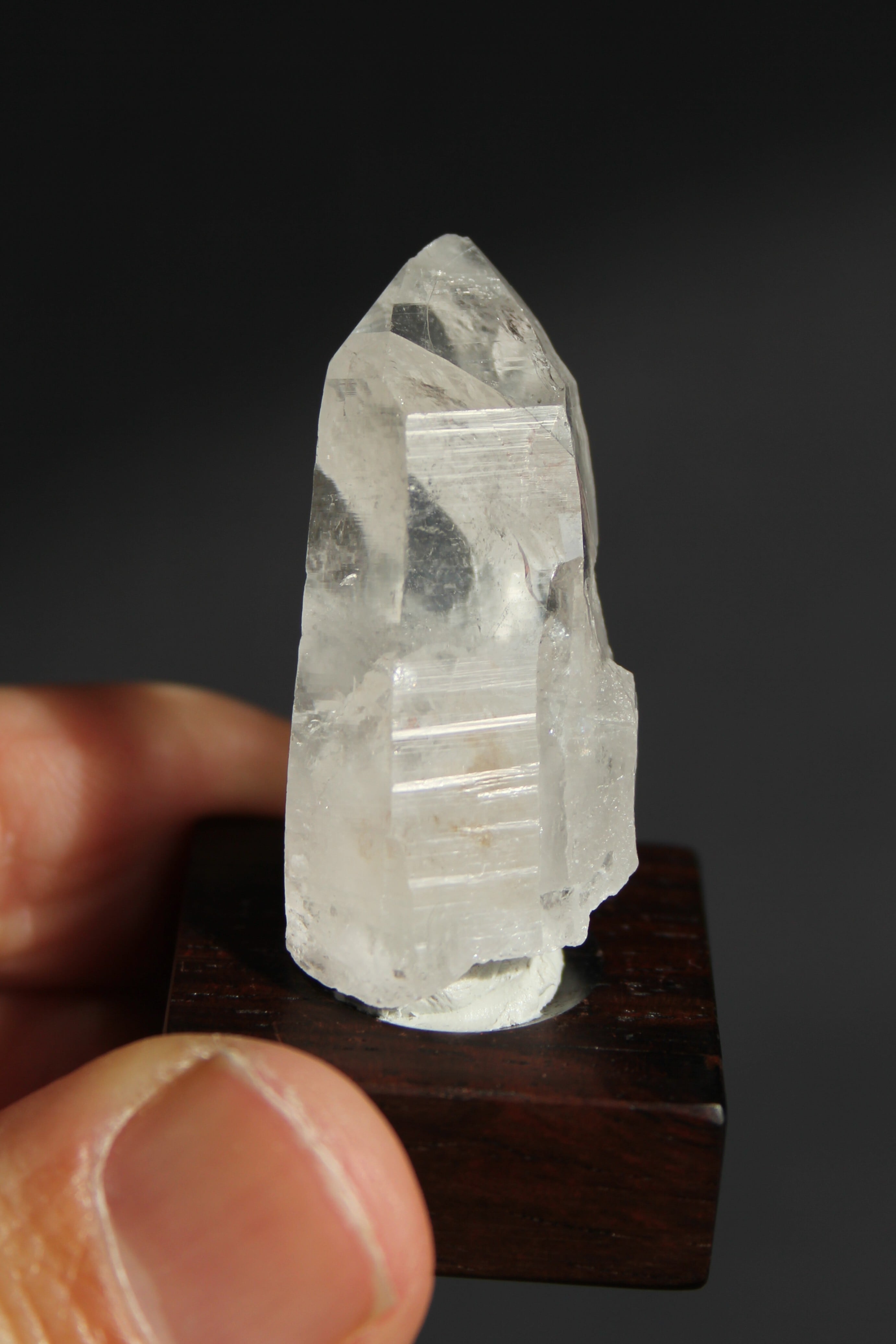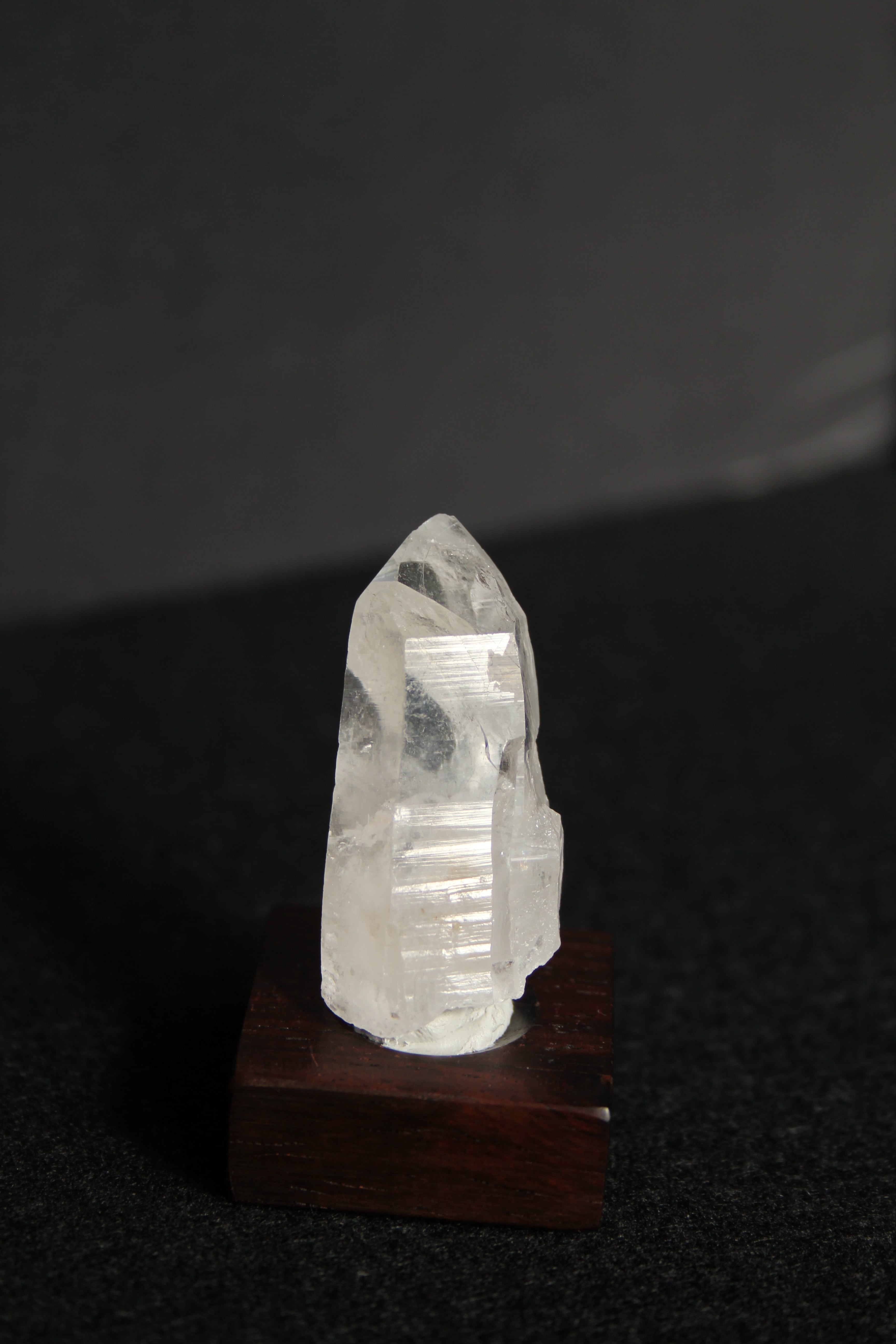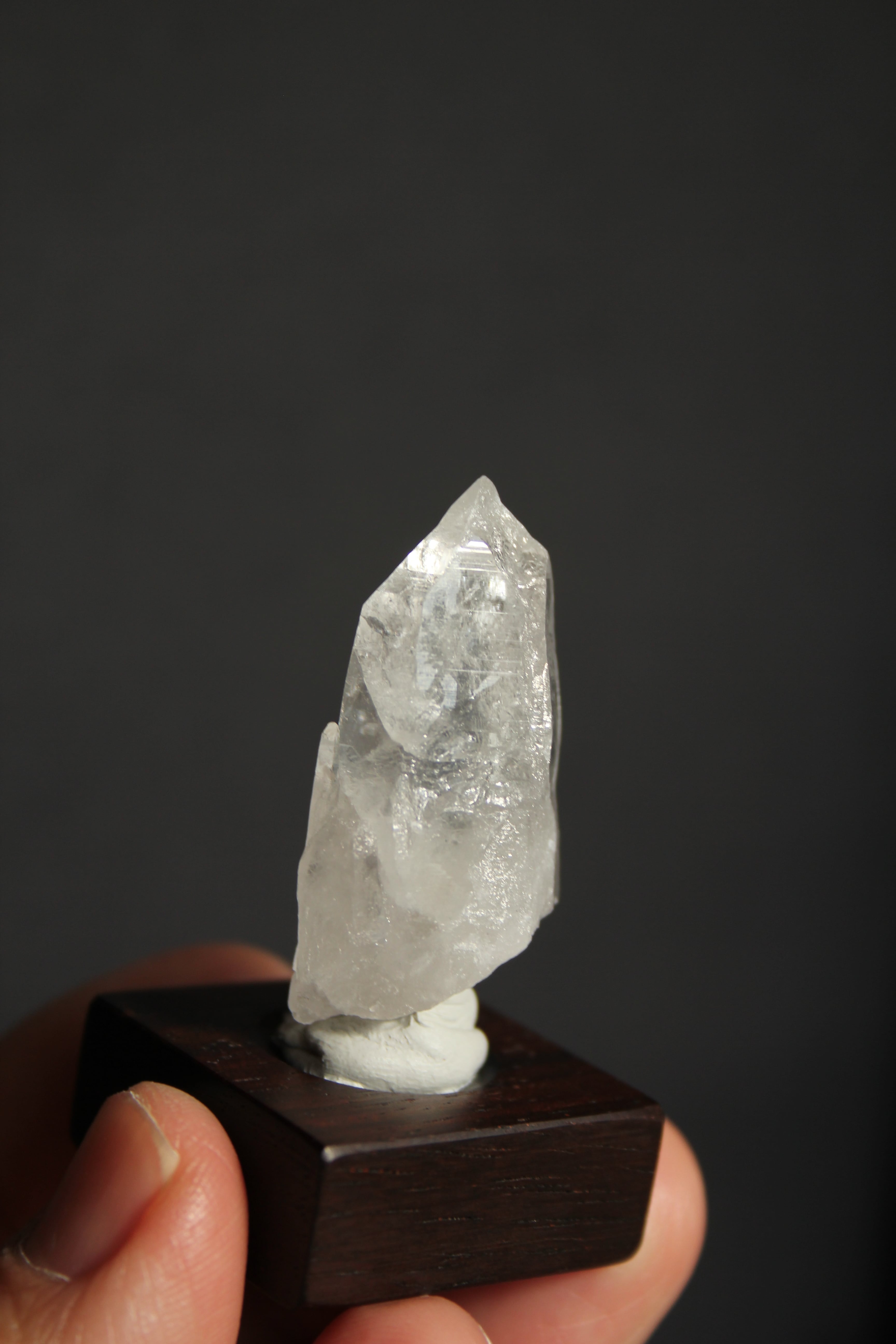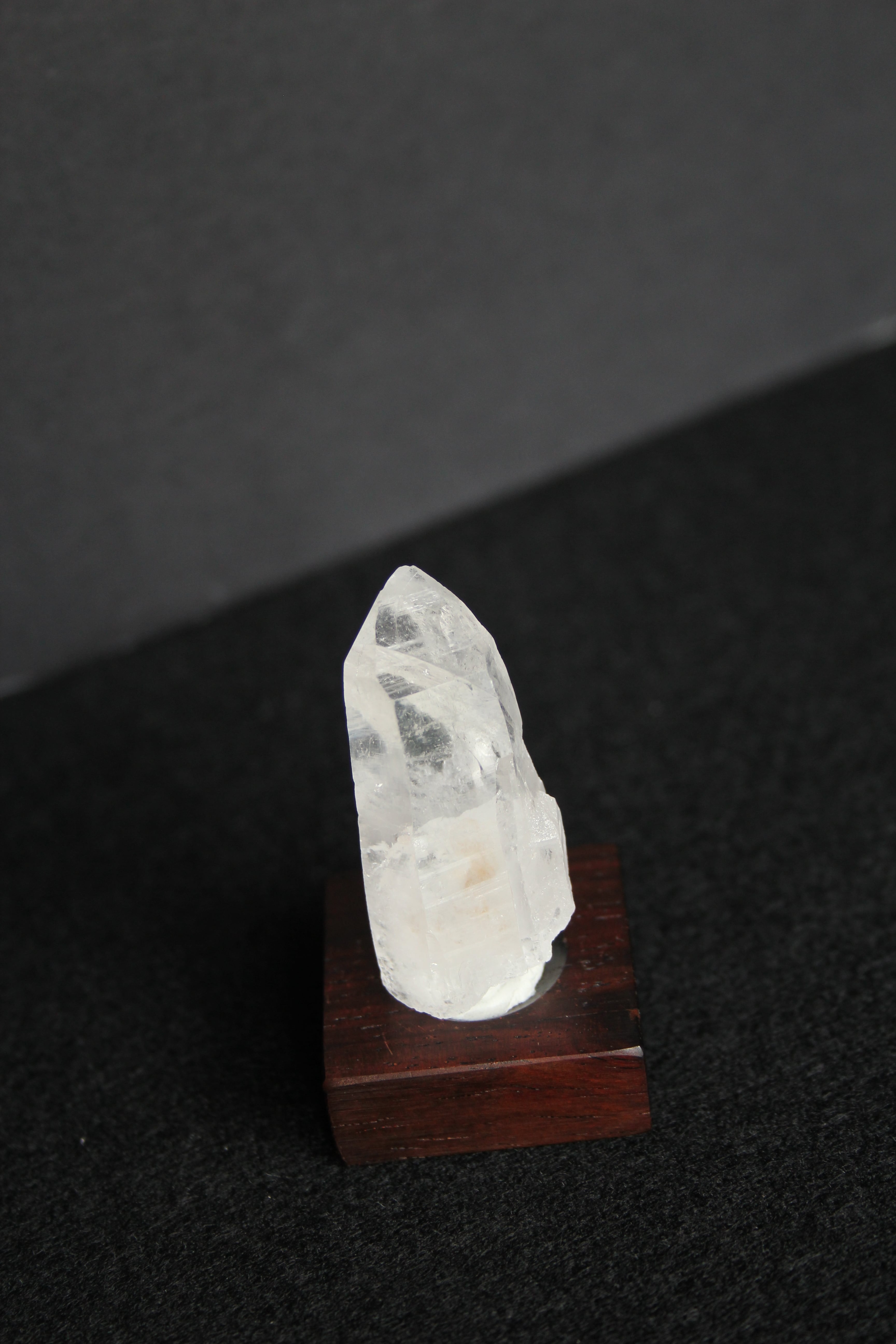 【商品説明】:水晶の原石と高級木材のローズウッドを使用した置物。宮崎クリスタルの中でも、極限られた地域でしか産出されない透明度が抜群に高い日之影町見立産の水晶です。その中でもこの水晶は、抜群の透明度、バランスのとれた六角錘の結晶、惚れぼれするテリ、申し分のない宮崎クリスタルです。良い感じでクラックが入り、中がキラキラしています。ローズウッドベースの大きさ(約30x30x12mm)水晶を置く部分には「座ぐり」と呼ばれる円形の溝を掘っております。簡単のように見えますが、硬い木材のローズウッドに、一定の深さの溝を掘るには、非常に高度な技術を用います。木工歴50年の職人が成せる技です