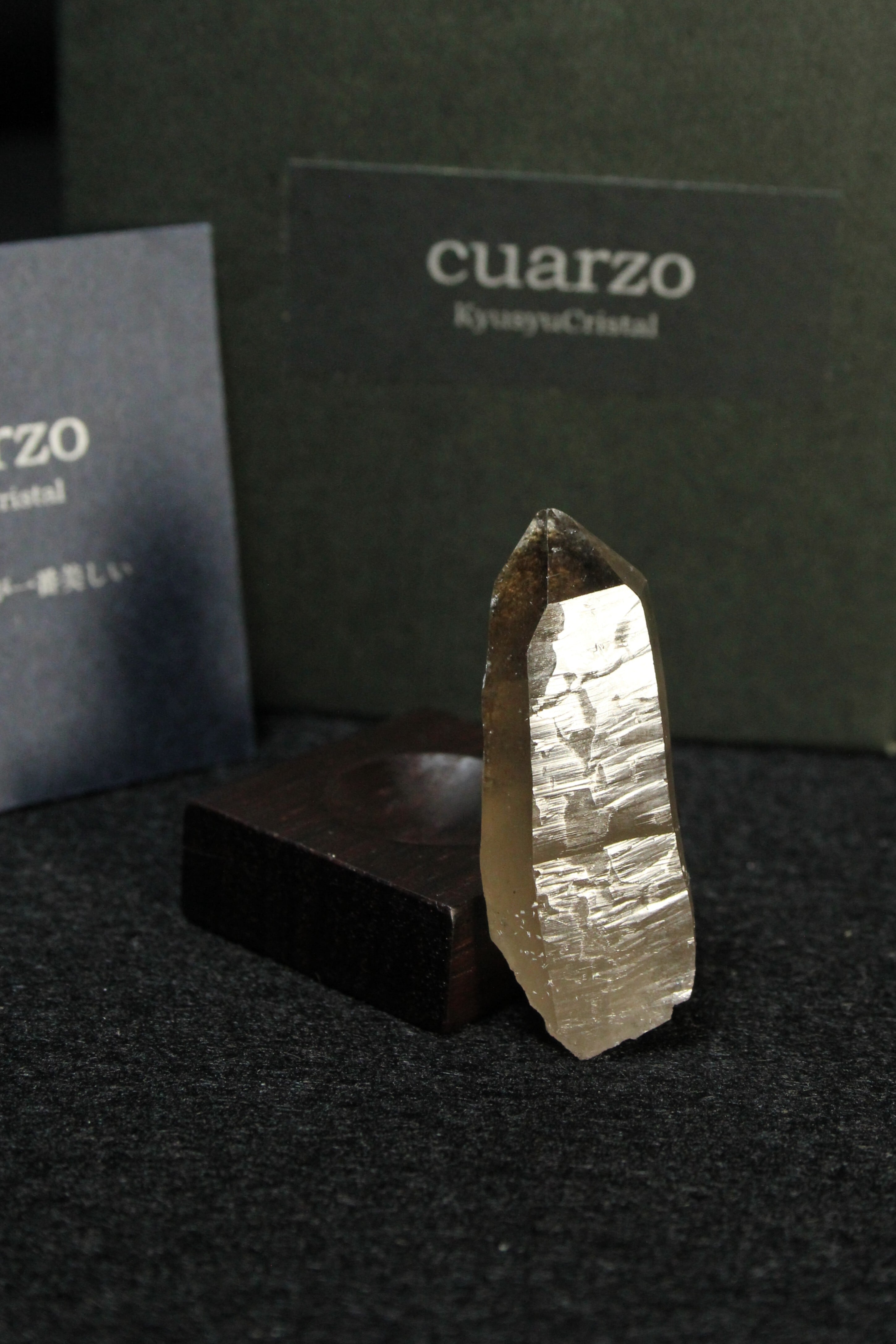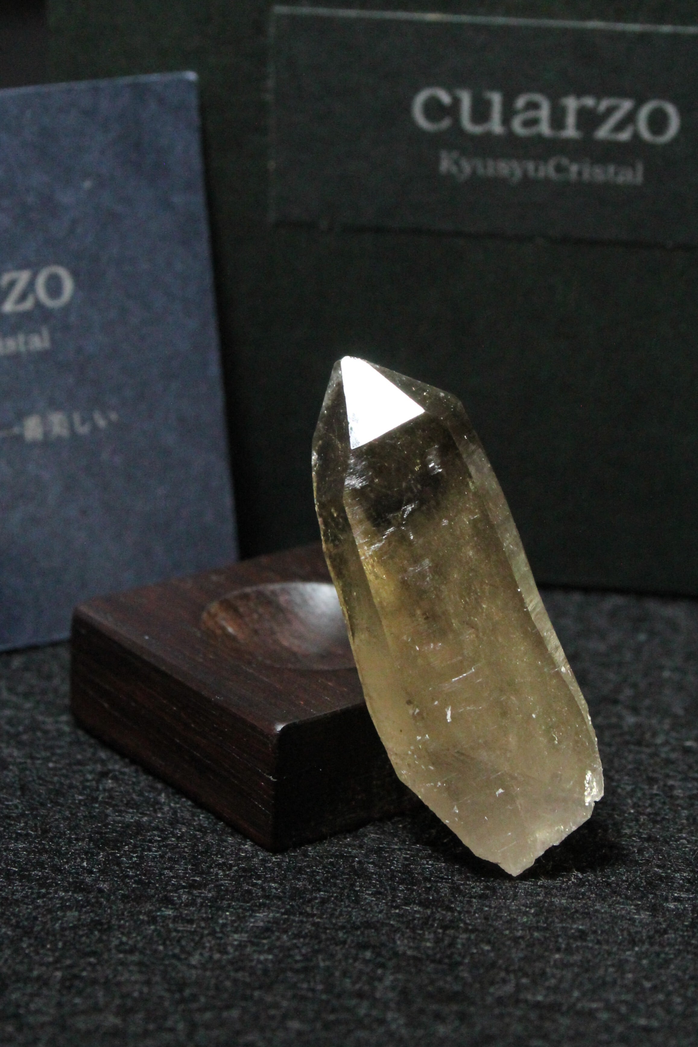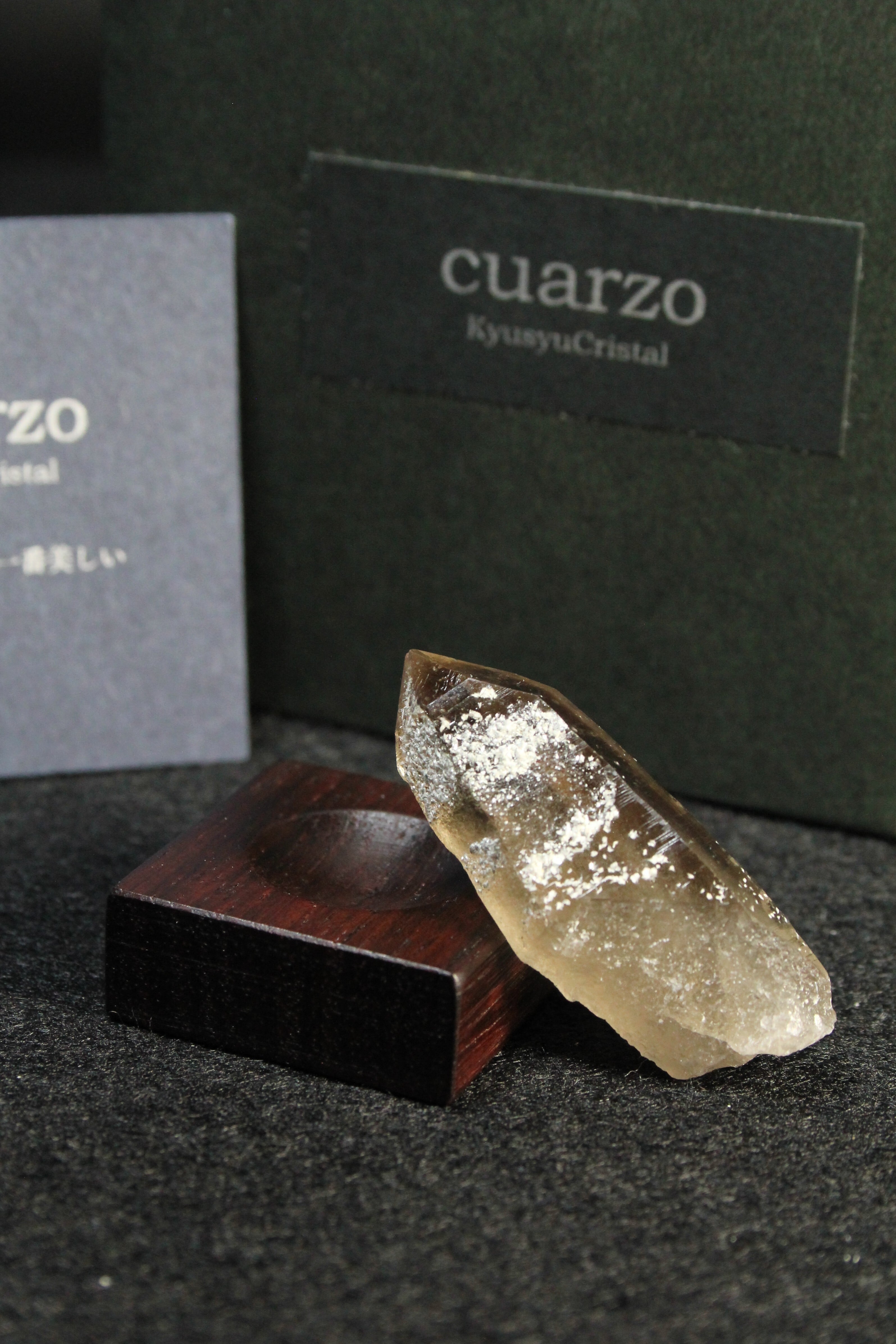 【商品説明】:煙水晶の原石と高級木材のローズウッドを使用した置物。黒から茶色の透明感溢れるきれいな宮崎産のポイント煙水晶です。他の鉱物の干渉によって出来た裏面の白いザラザラがワイルドで、岩石感を物語っています。ローズウッドベースの大きさ(約30x30x12mm)水晶を置く部分には「座ぐり」と呼ばれる円形の溝を掘っております。簡単のように見えますが、硬い木材のローズウッドに、一定の深さの溝を掘るには、非常に高度な技術を用います。木工歴50年の職人が成せる技です