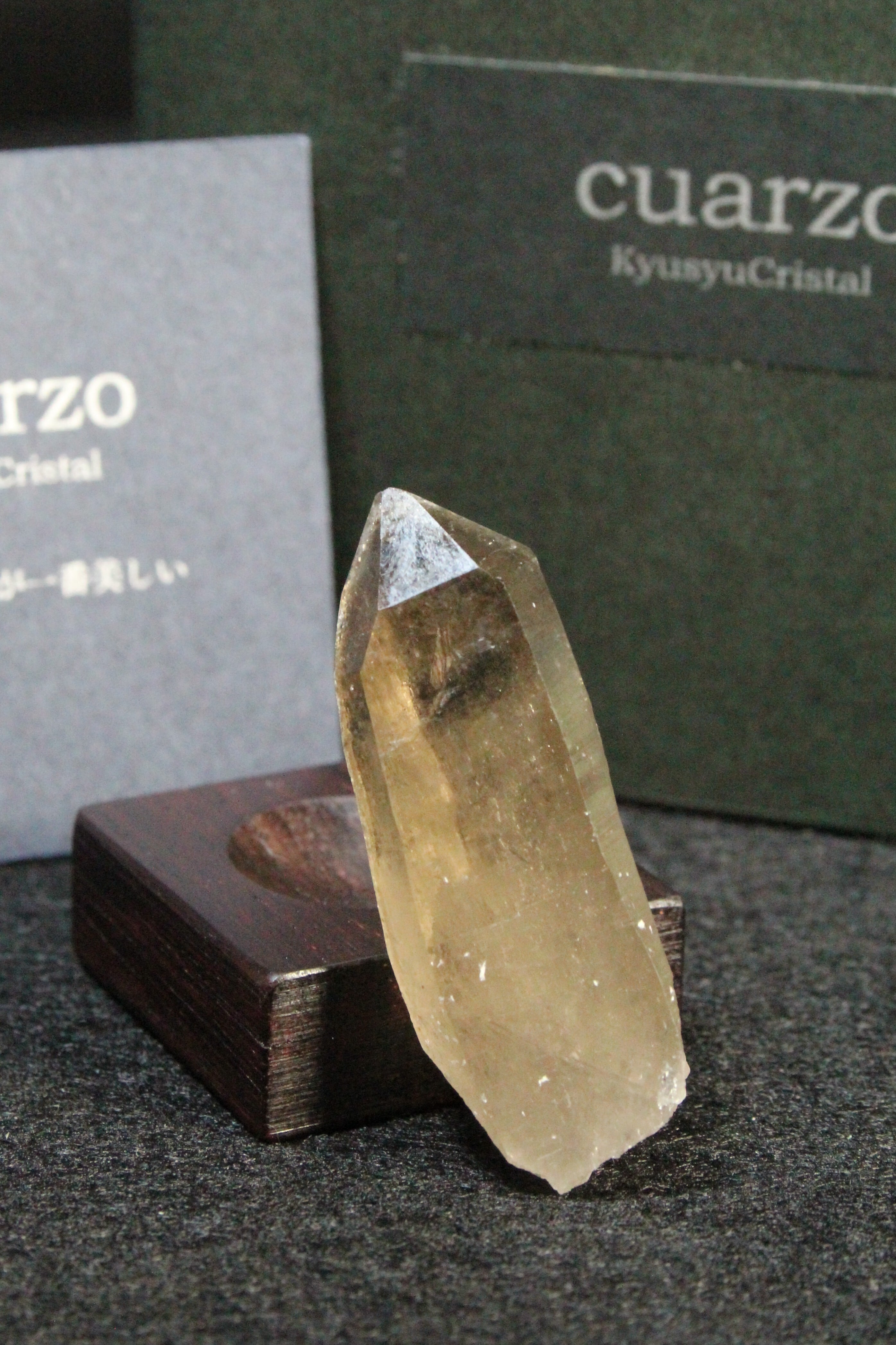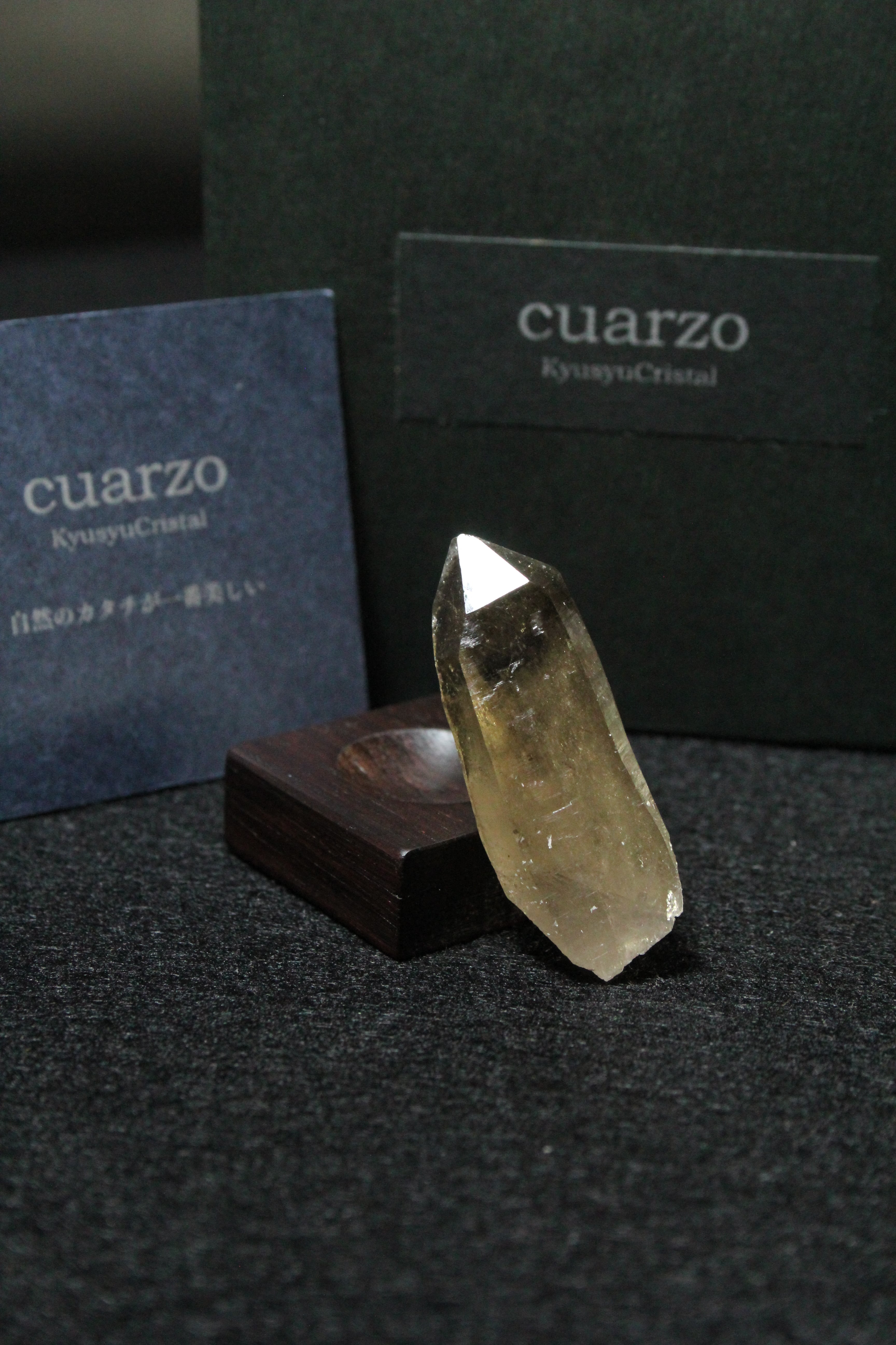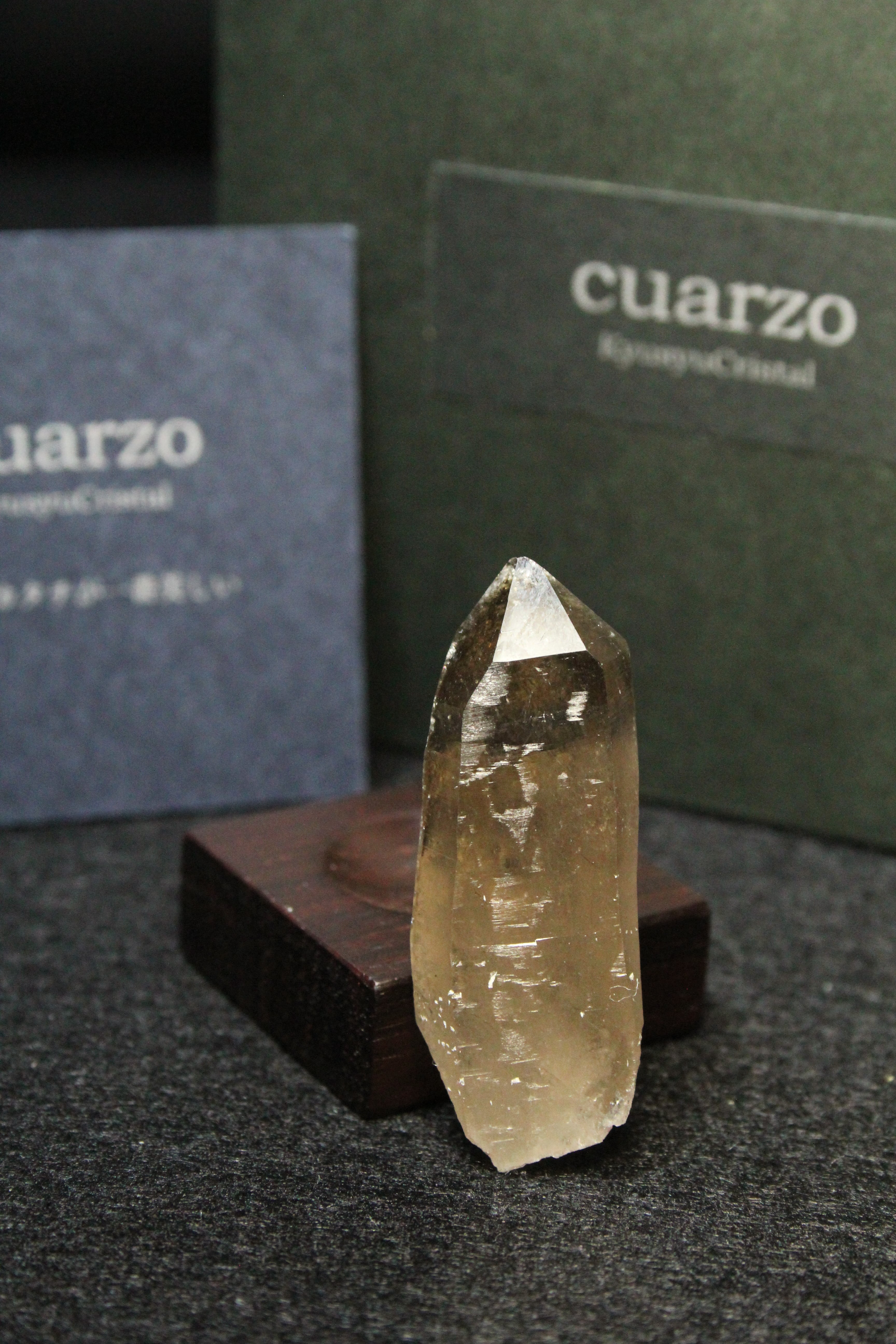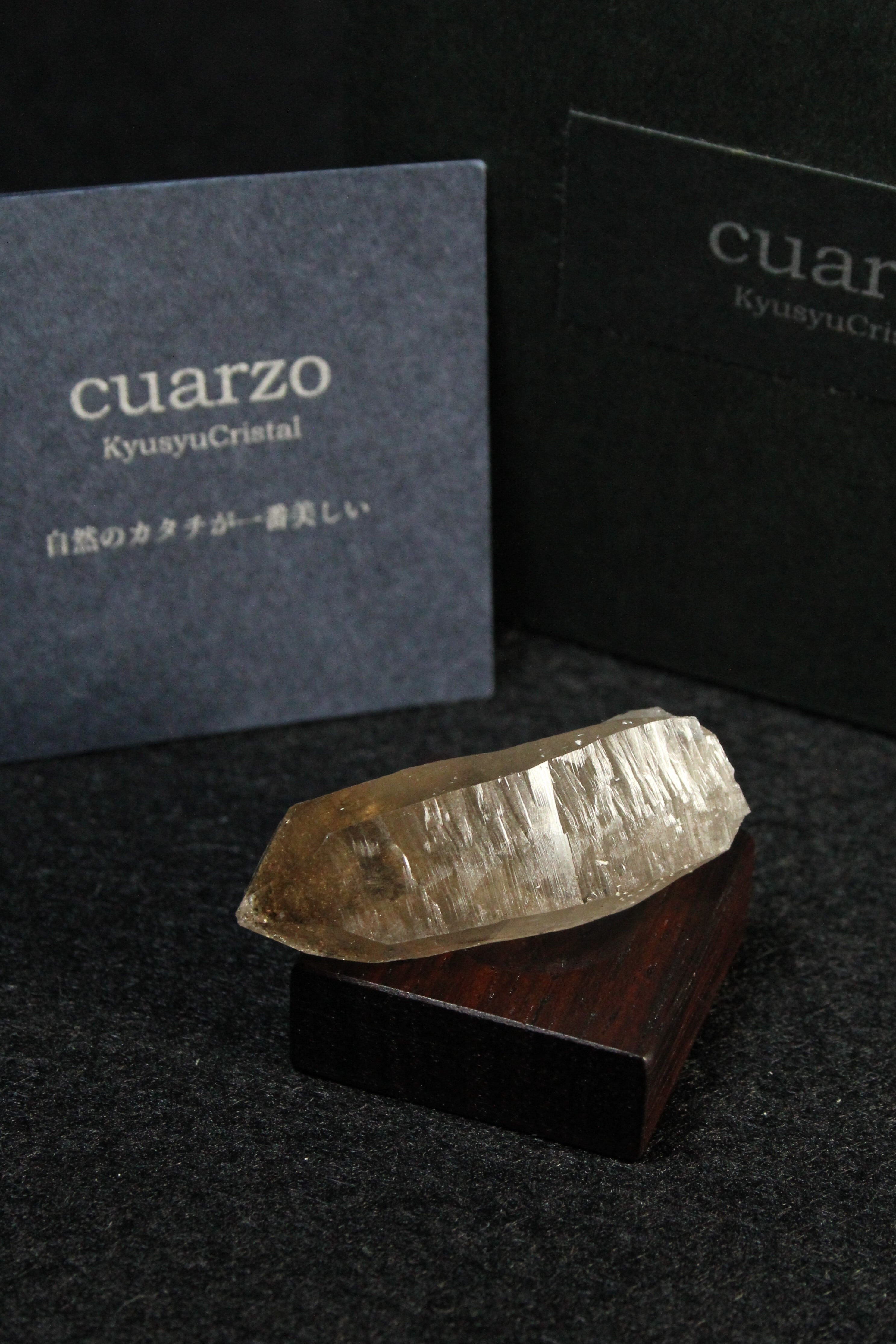 【商品説明】:煙水晶の原石と高級木材のローズウッドを使用した置物。黒から茶色の透明感溢れるきれいな宮崎産のポイント煙水晶です。他の鉱物の干渉によって出来た裏面の白いザラザラがワイルドで、岩石感を物語っています。ローズウッドベースの大きさ(約30x30x12mm)水晶を置く部分には「座ぐり」と呼ばれる円形の溝を掘っております。簡単のように見えますが、硬い木材のローズウッドに、一定の深さの溝を掘るには、非常に高度な技術を用います。木工歴50年の職人が成せる技です