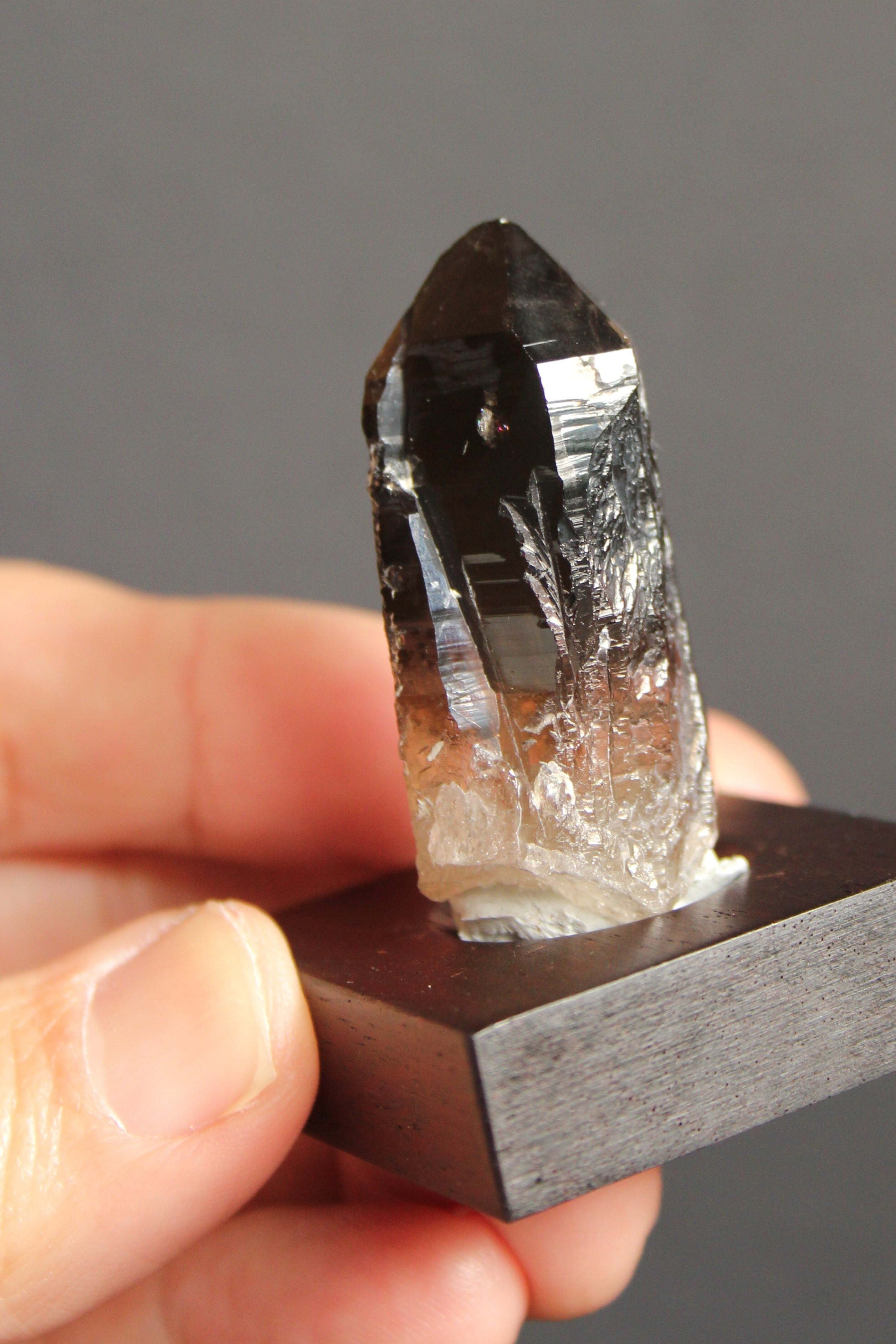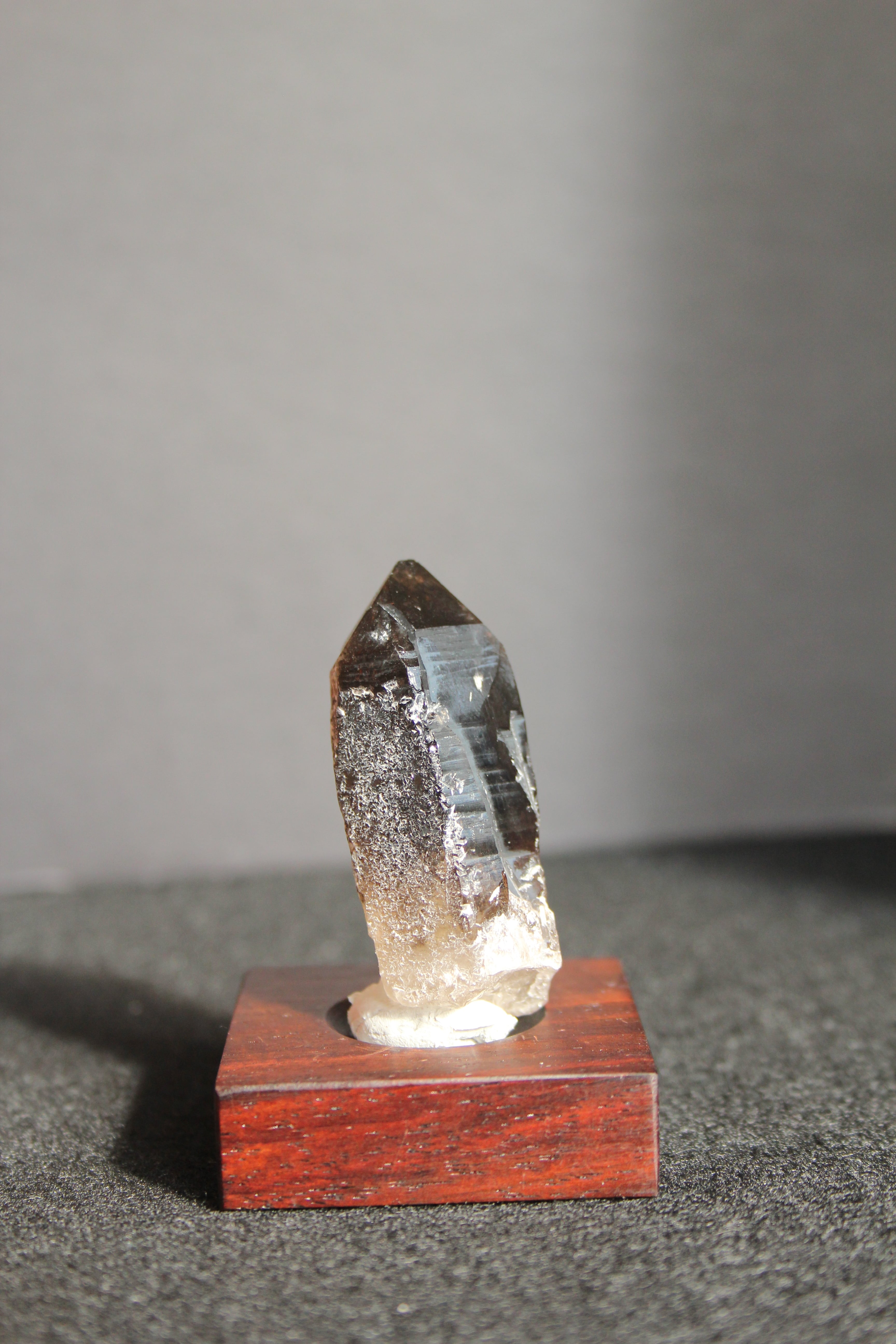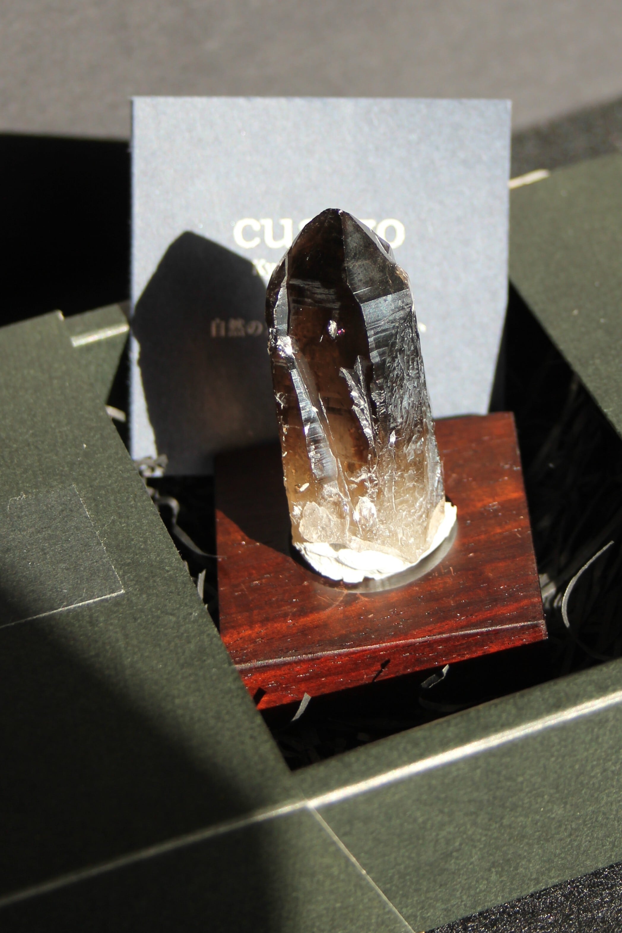 【商品説明】:煙水晶の原石と高級木材のローズウッドを使用した置物。モリオンほど漆黒ではないけれど、黒に近い透明感のある宮崎産煙水晶です。今では、5cm近い黒いポイント水晶は、なかなか採れません。ローズウッドベースの大きさ(約40x40x12mm)水晶を置く部分には「座ぐり」と呼ばれる円形の溝を掘っております。簡単のように見えますが、硬い木材のローズウッドに、一定の深さの溝を掘るには、非常に高度な技術を用います。木工歴50年の職人が成せる技です