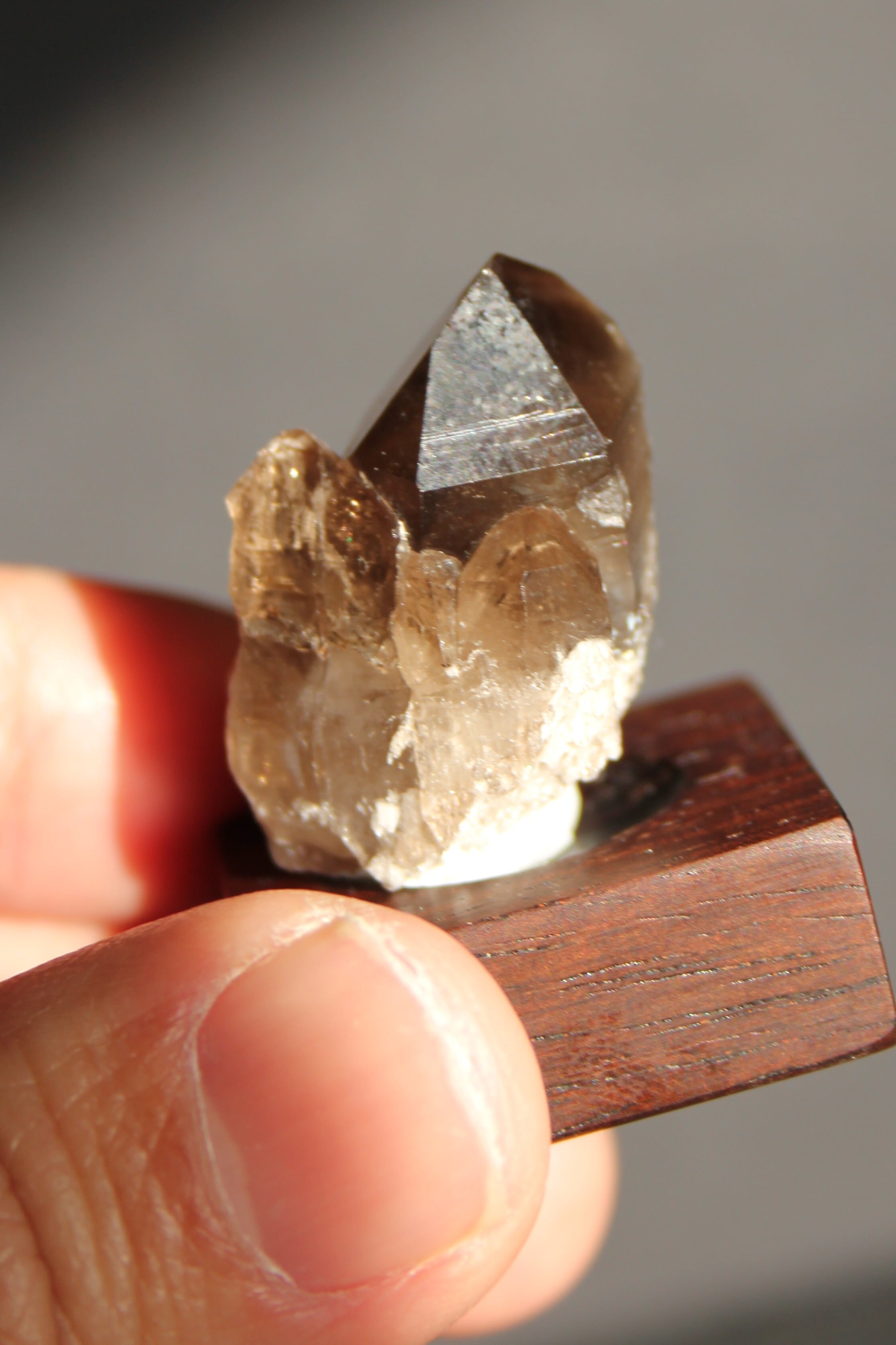 【商品説明】:煙水晶の原石と高級木材のローズウッドを使用した置物。透明感溢れる黒に近い宮崎産の煙水晶です。根元に付いた他の鉱物の干渉が、よりワイルド感を出しています。ローズウッドベースの大きさ(約30x30x12mm)水晶を置く部分には「座ぐり」と呼ばれる円形の溝を掘っております。簡単のように見えますが、硬い木材のローズウッドに、一定の深さの溝を掘るには、非常に高度な技術を用います。木工歴50年の職人が成せる技です
