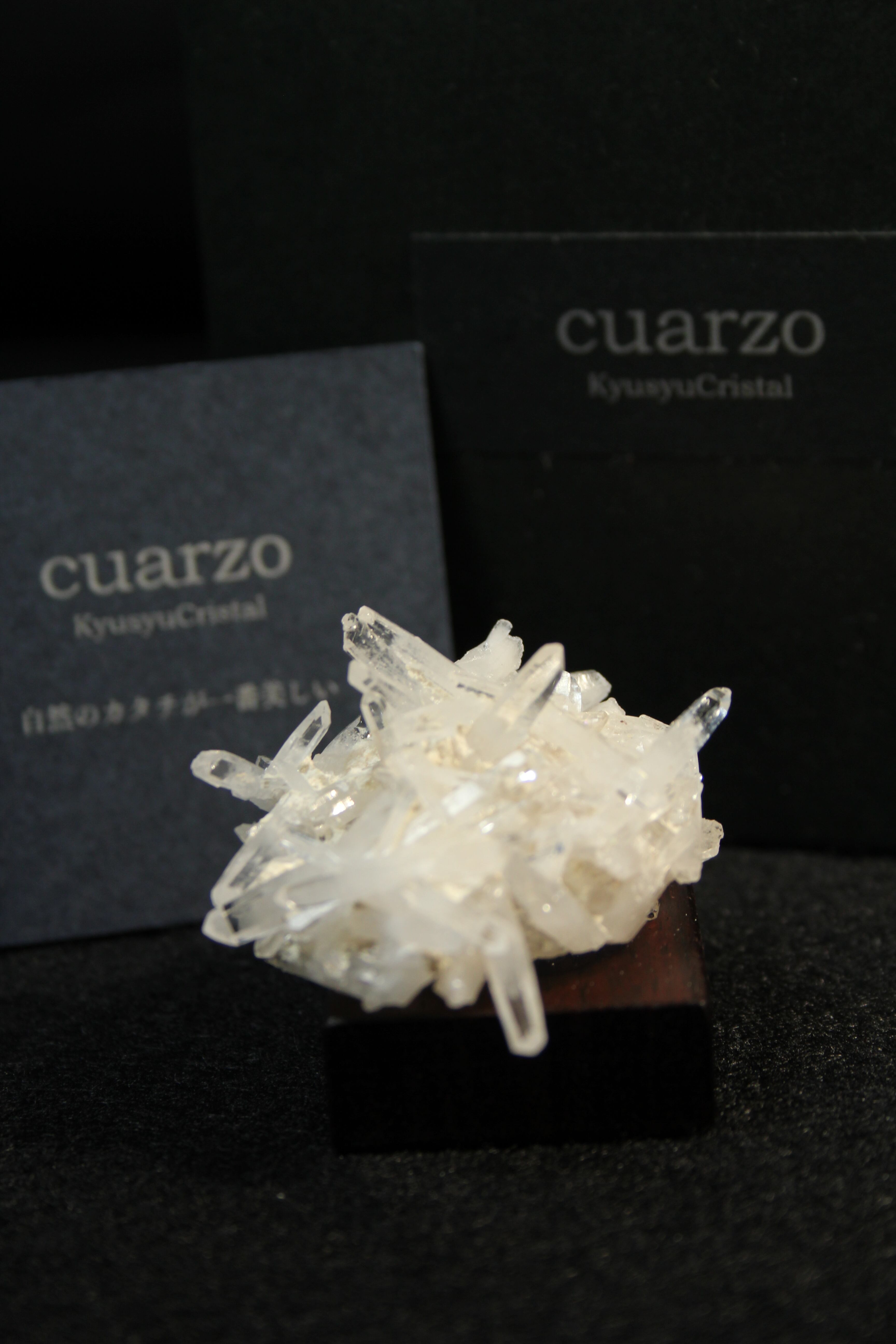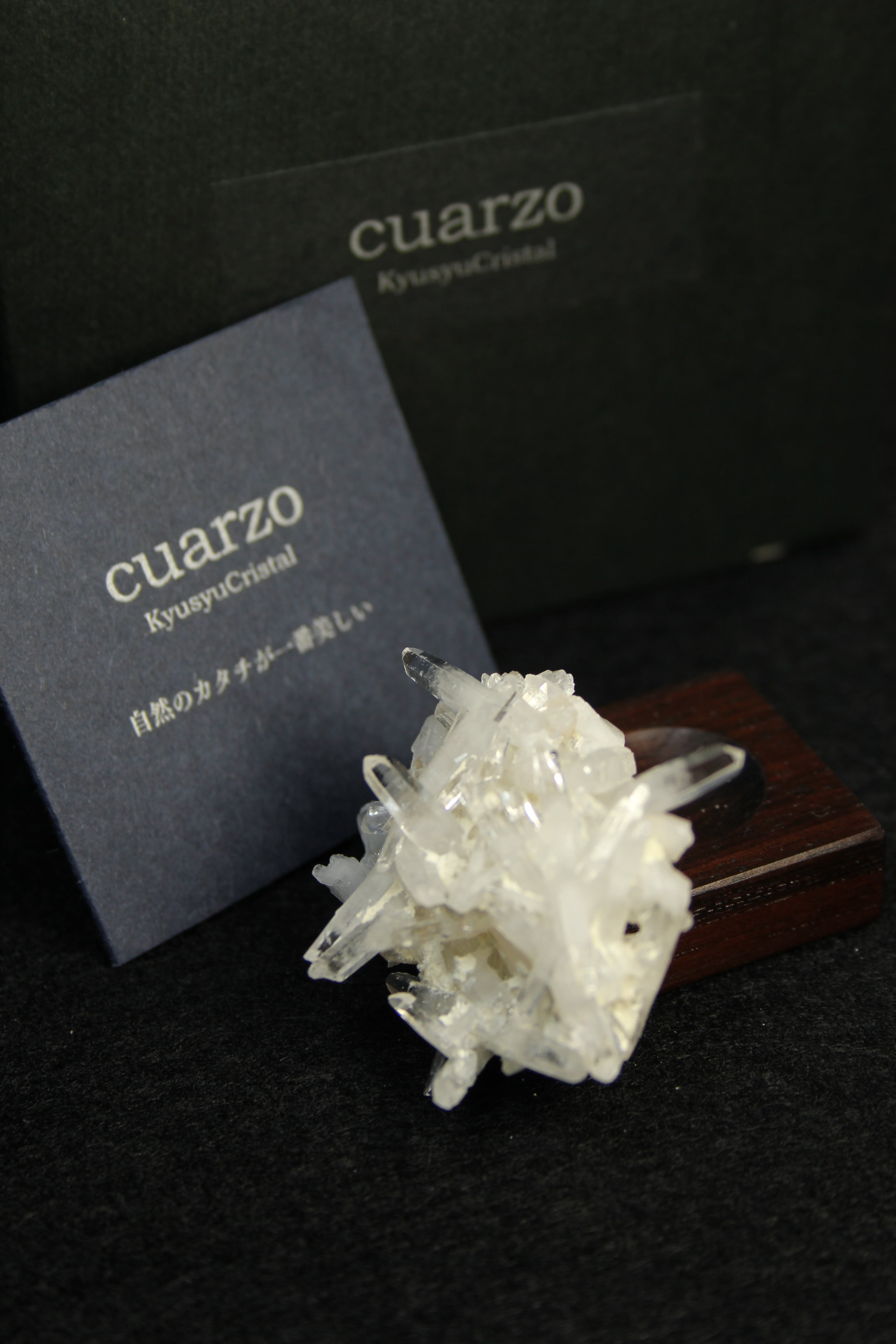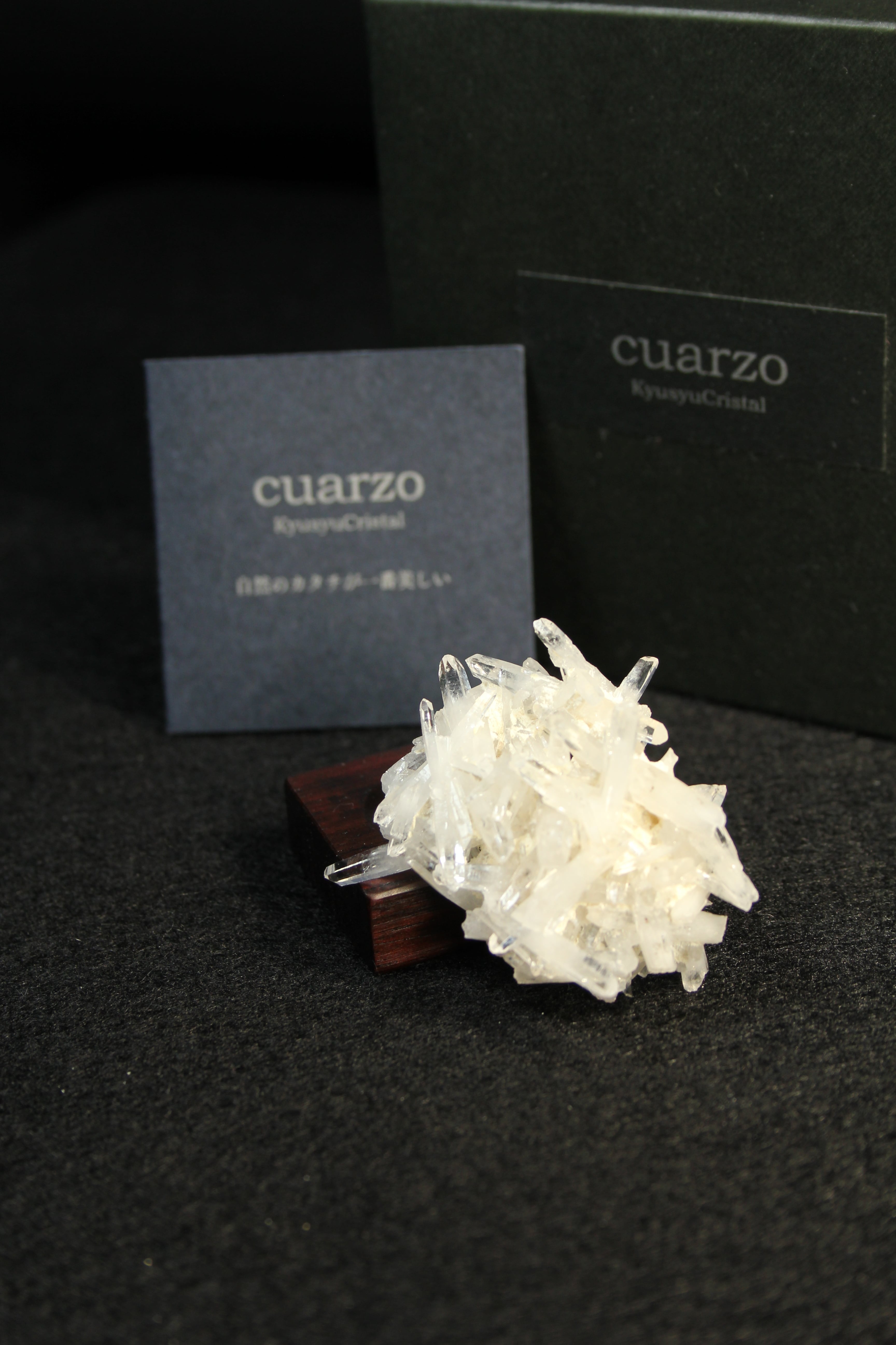 【商品説明】:クラスター水晶の原石と高級木材のローズウッドを使用した置物。無数に絡み合うかき揚げの様な大分産のミニ水晶クラスターです。各ポイントの先はとても透明度が高いです。ここの水晶は、スパっと輪切りにカットすると、断面が桜の花びらのような模様に見えるらしく、そのことから「桜水晶」と言われています。ローズウッドベースの大きさ(約30x30x12mm)水晶を置く部分には「座ぐり」と呼ばれる円形の溝を掘っております。簡単のように見えますが、硬い木材のローズウッドに、一定の深さの溝を掘るには、非常に高度な技術を用います。木工歴50年の職人が成せる技です
