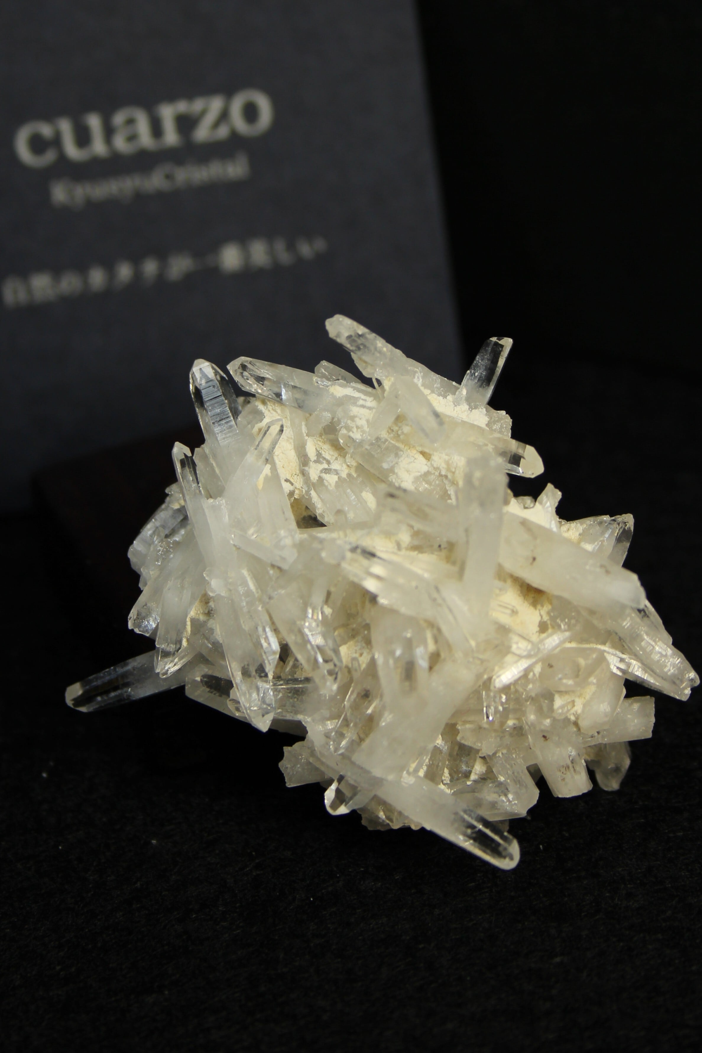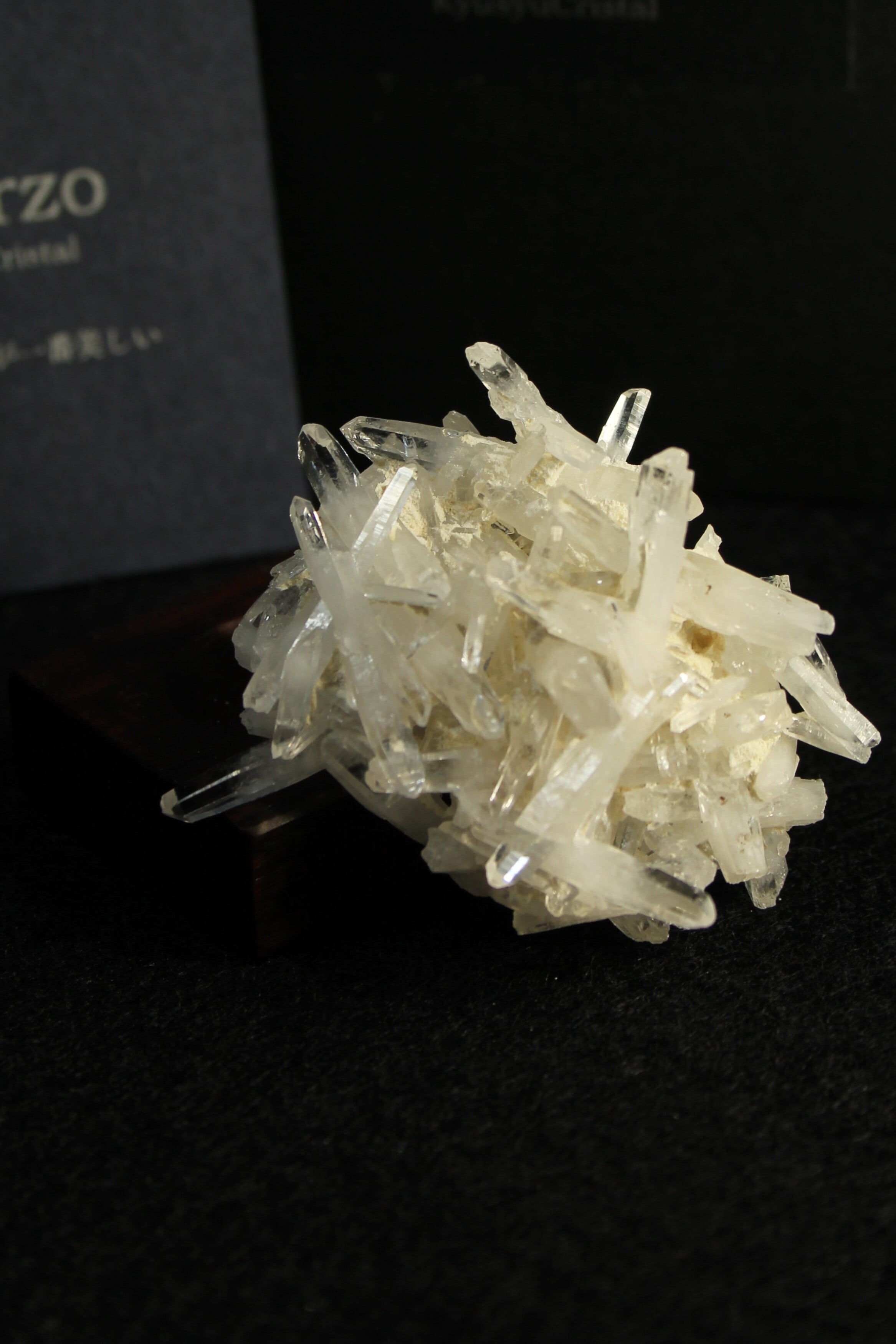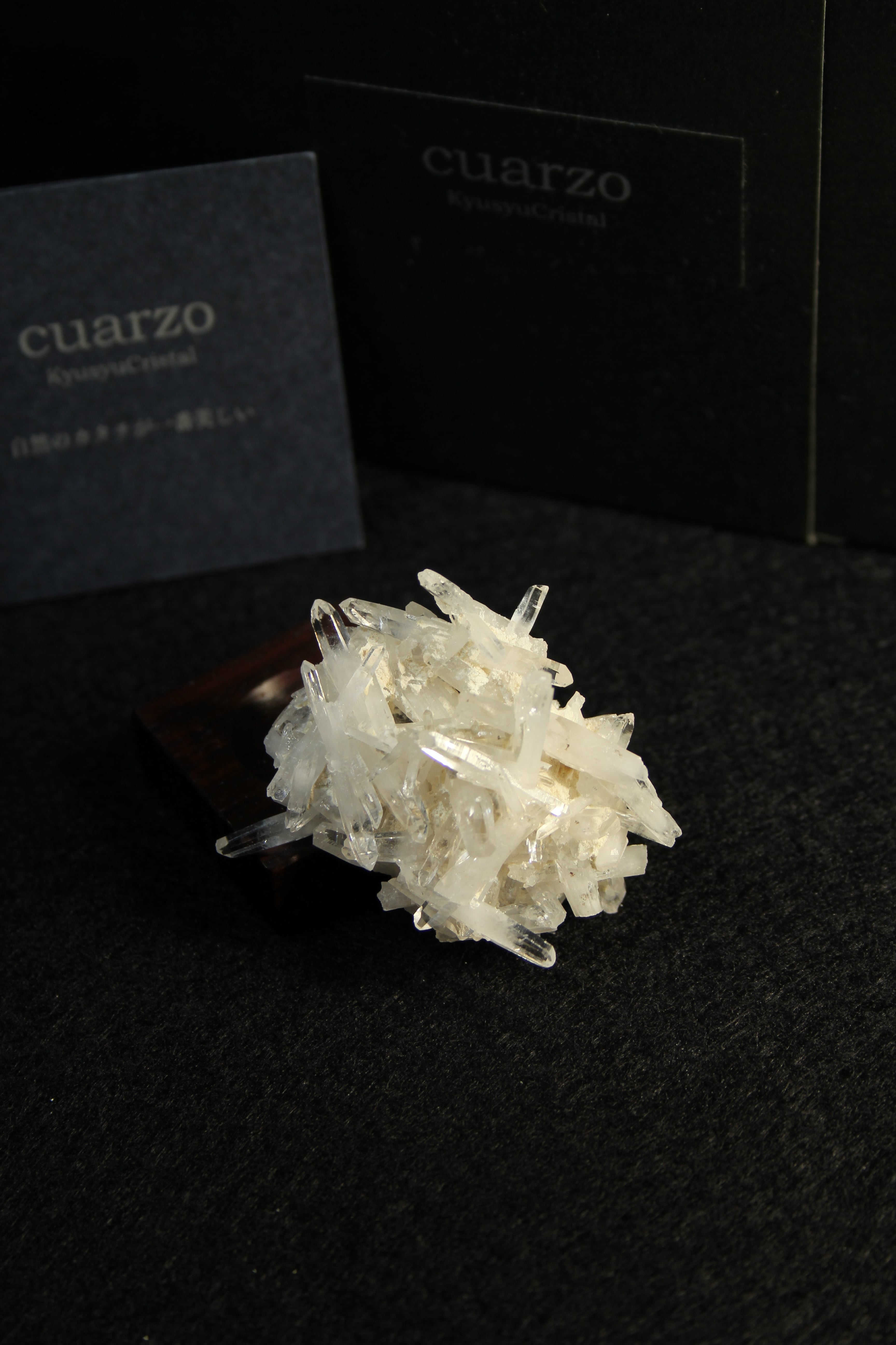 【商品説明】:クラスター水晶の原石と高級木材のローズウッドを使用した置物。無数に絡み合うかき揚げの様な大分産のミニ水晶クラスターです。各ポイントの先はとても透明度が高いです。ここの水晶は、スパっと輪切りにカットすると、断面が桜の花びらのような模様に見えるらしく、そのことから「桜水晶」と言われています。ローズウッドベースの大きさ(約30x30x12mm)水晶を置く部分には「座ぐり」と呼ばれる円形の溝を掘っております。簡単のように見えますが、硬い木材のローズウッドに、一定の深さの溝を掘るには、非常に高度な技術を用います。木工歴50年の職人が成せる技です