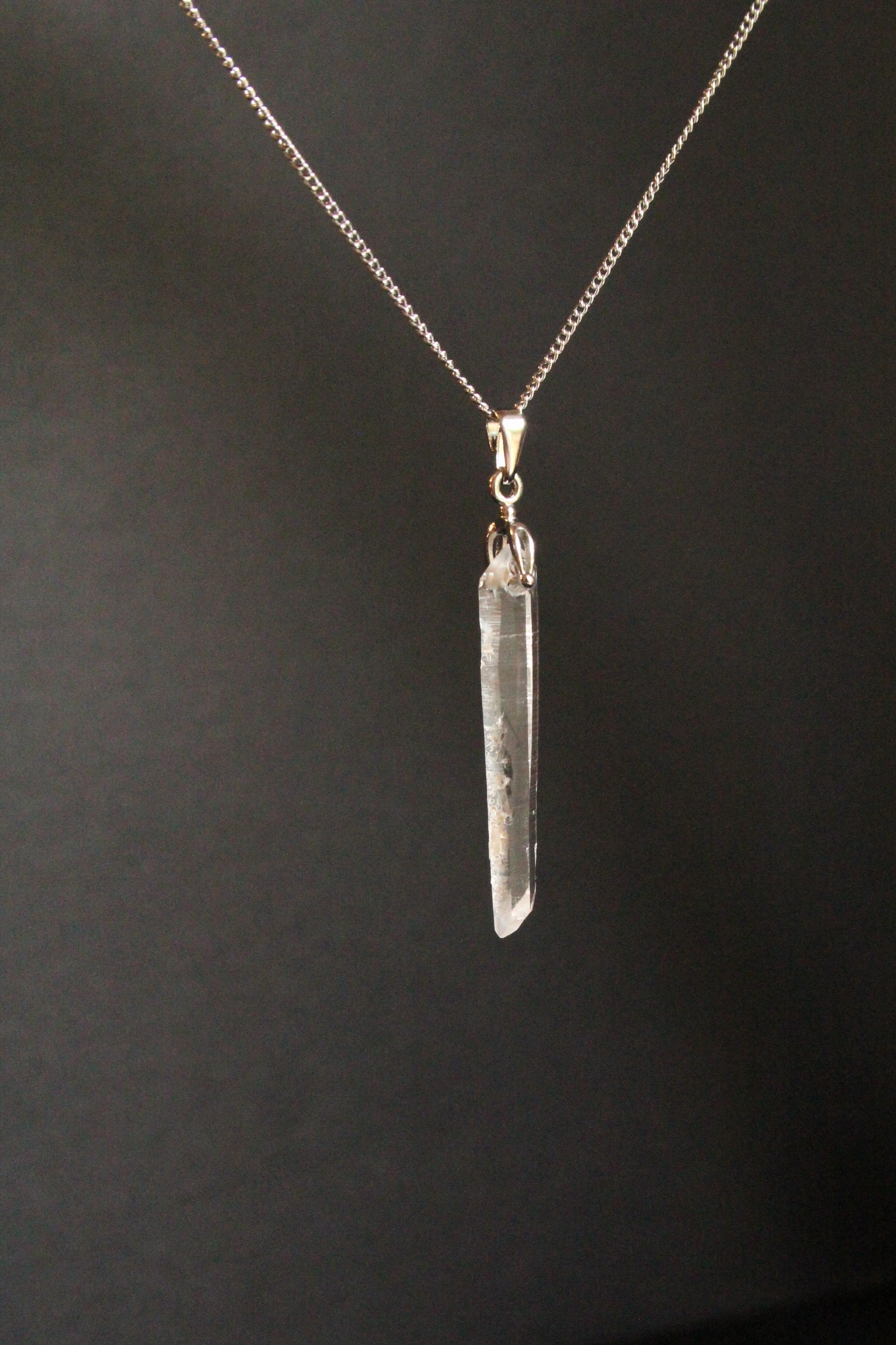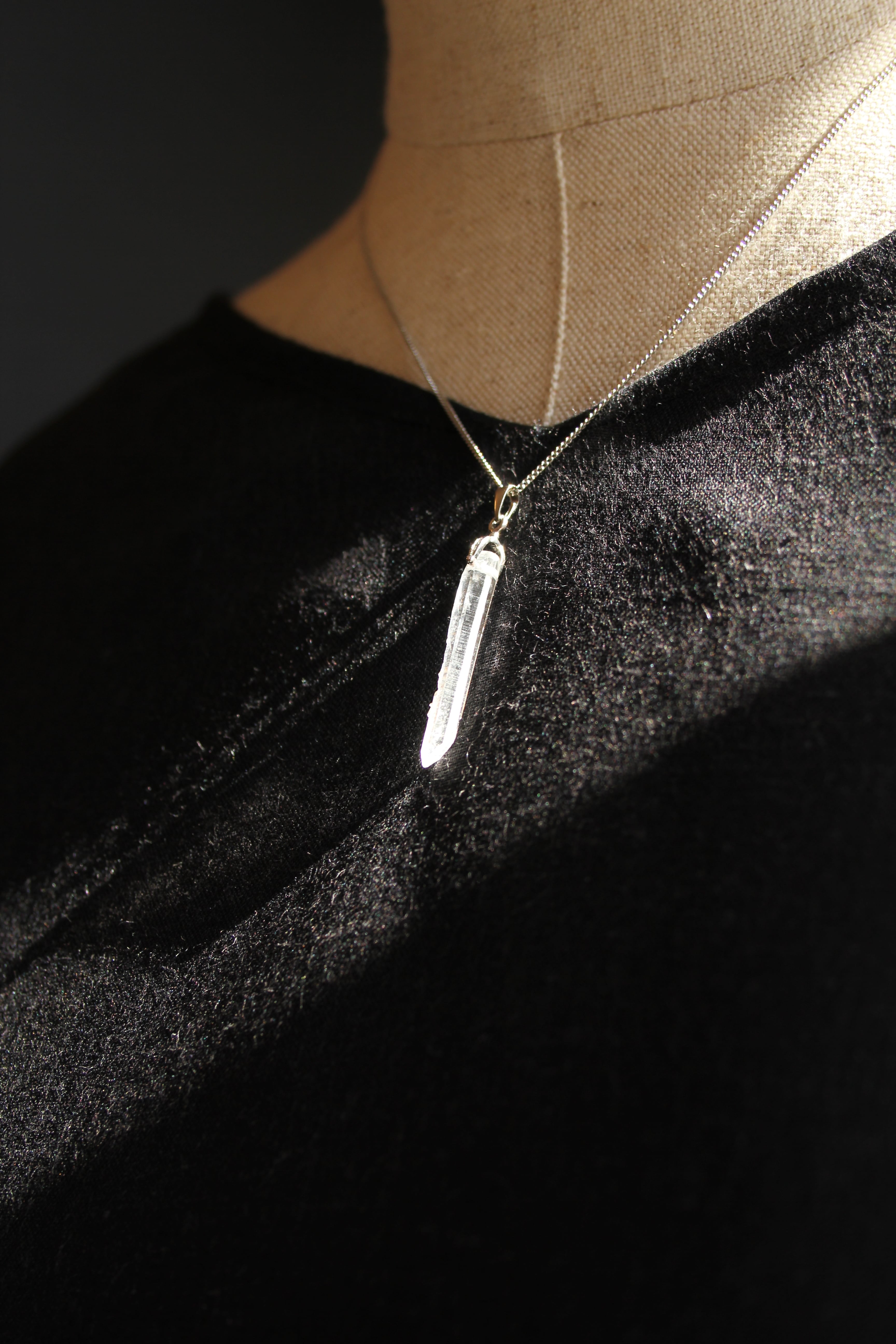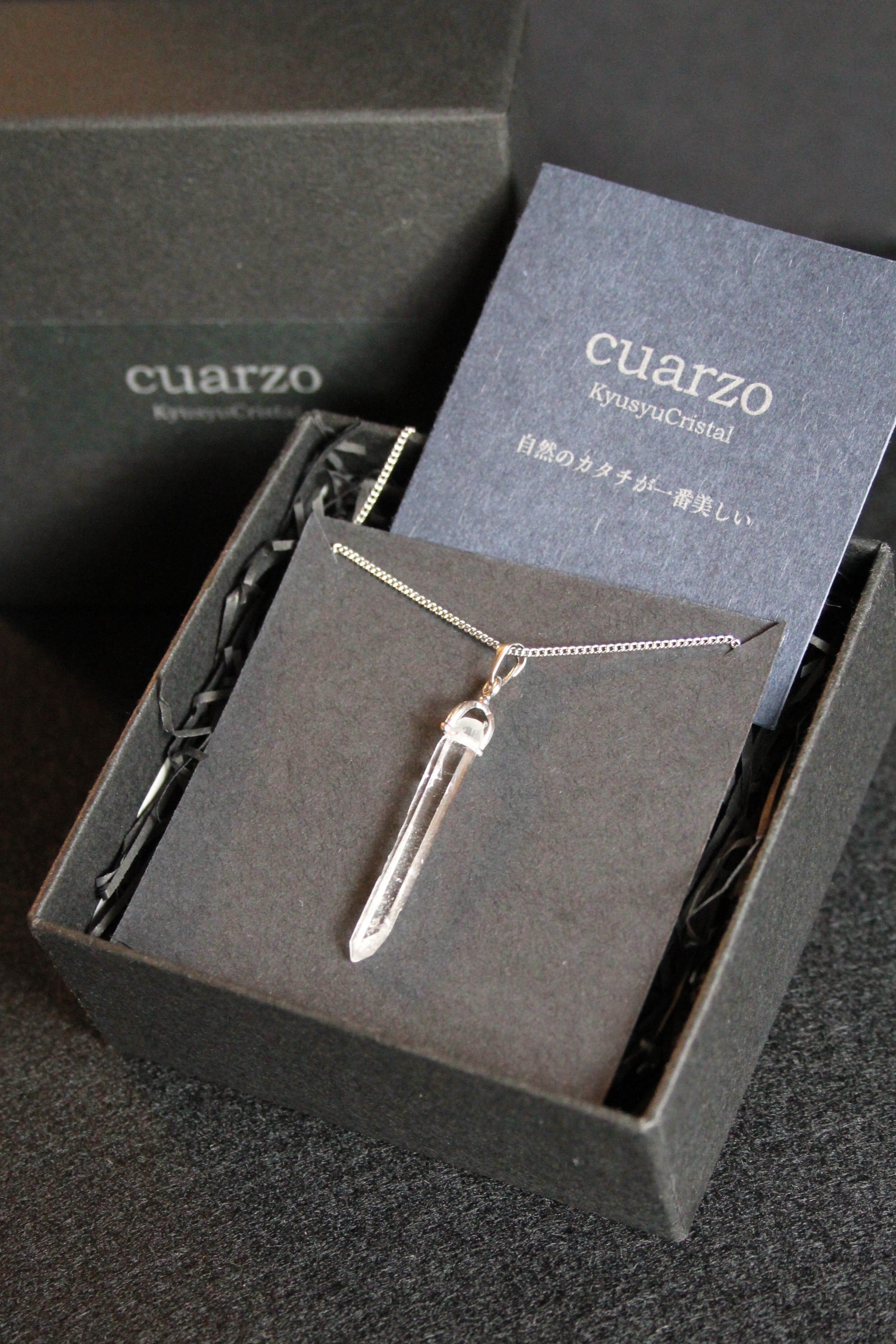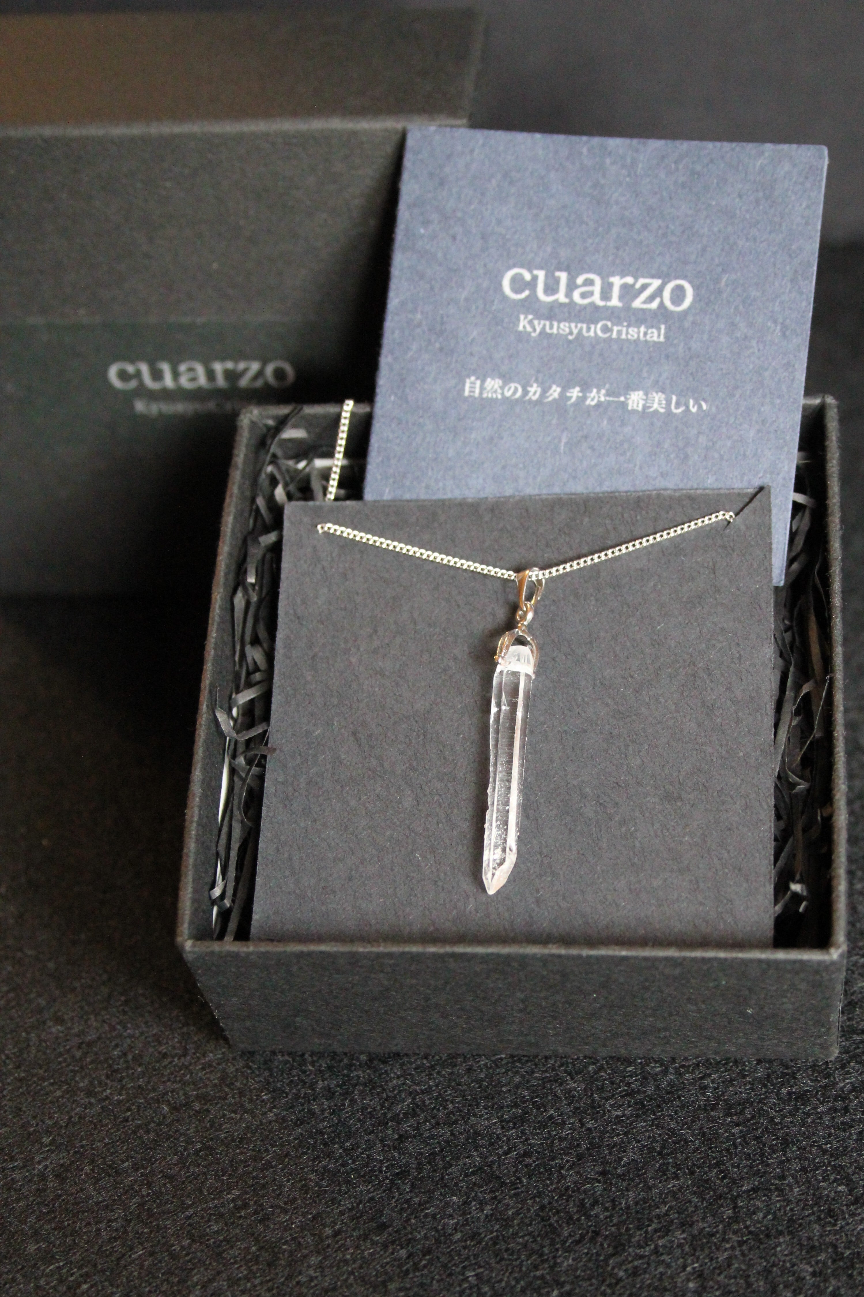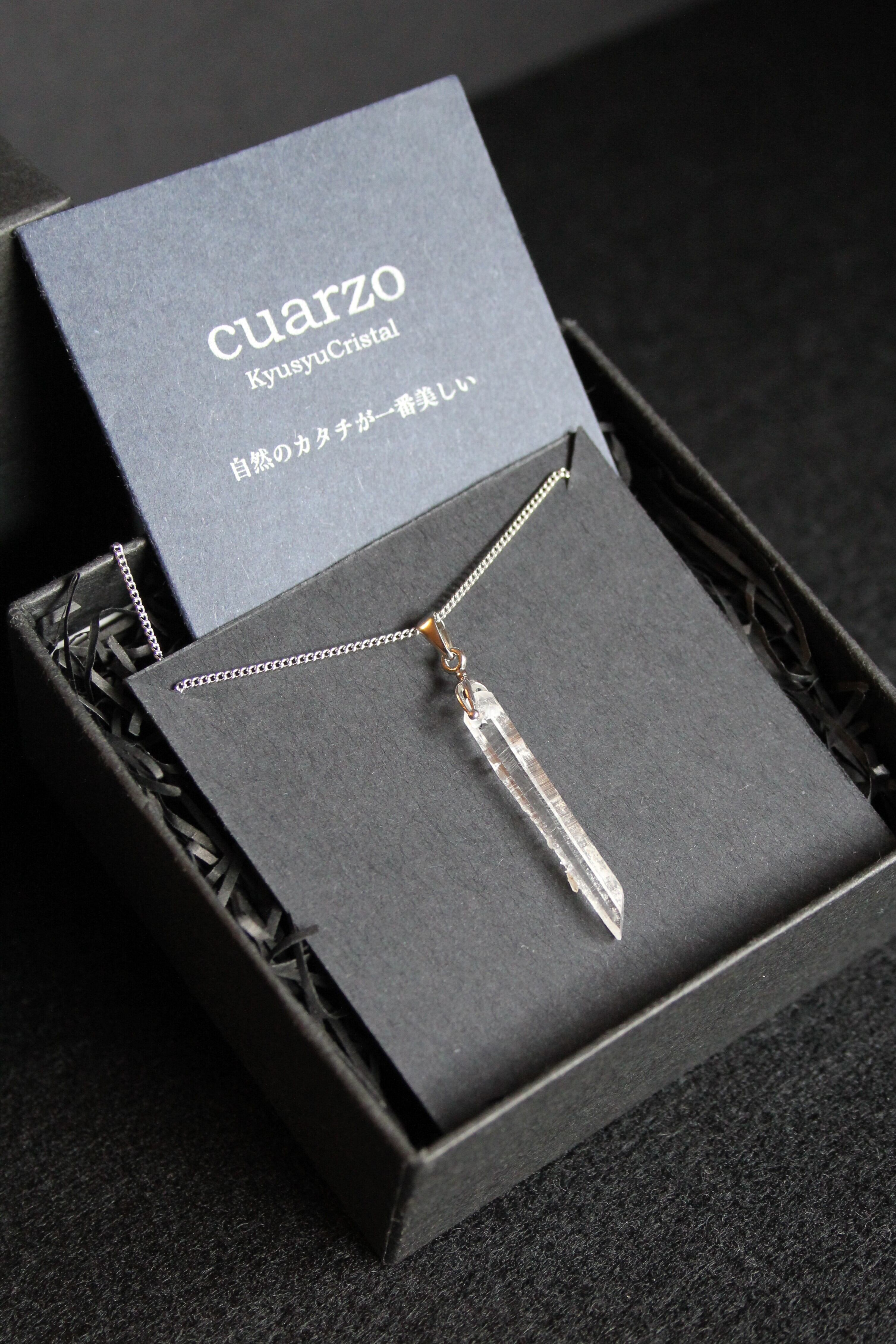 【商品説明】:水晶の原石を使用したネックレス。コロンビアレムリアンを彷彿させるような宮崎県西米良産水晶。細長く、この産地特有の柱面の一部に細かい水晶が付いていて、光の反射でキラキラきれいです。