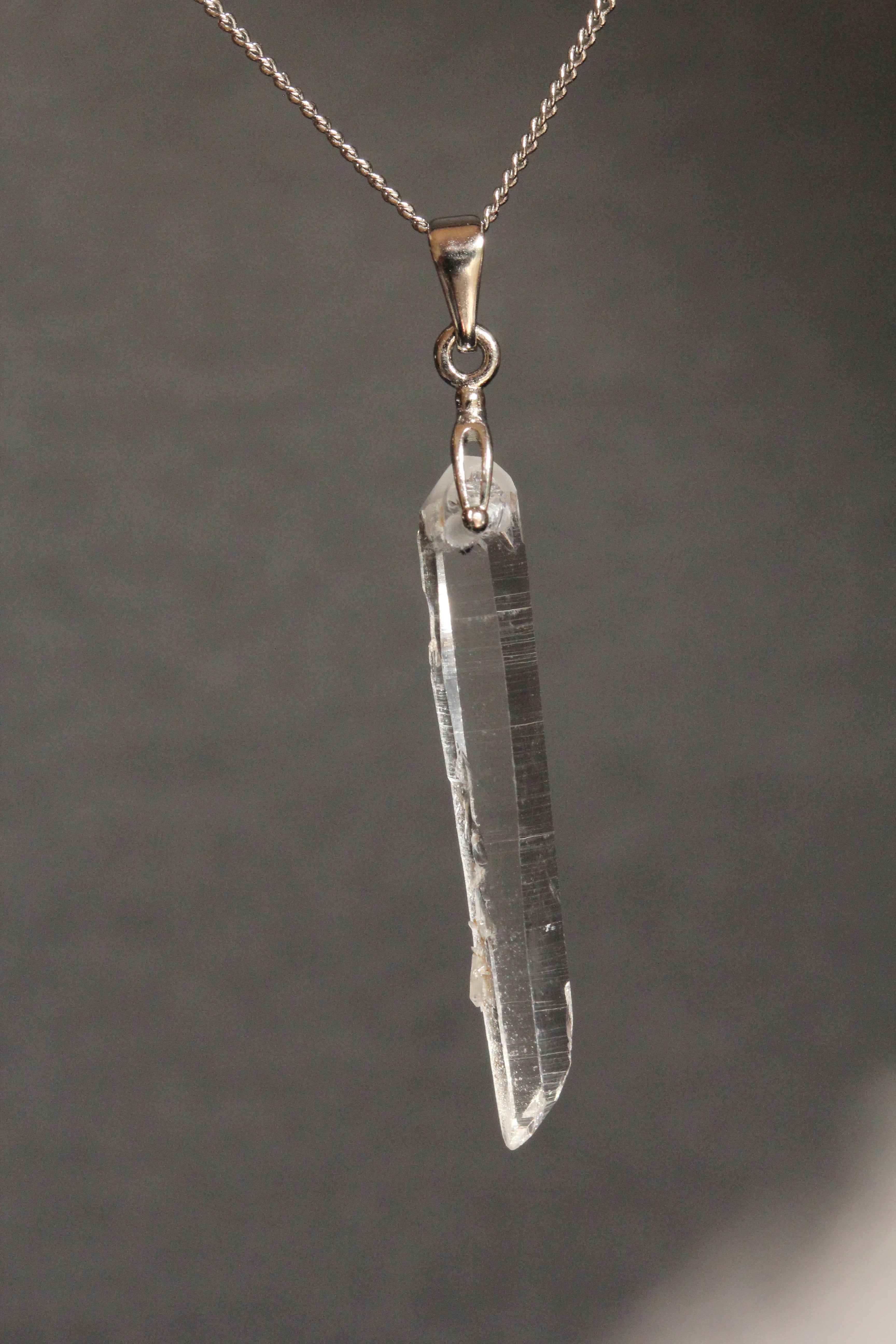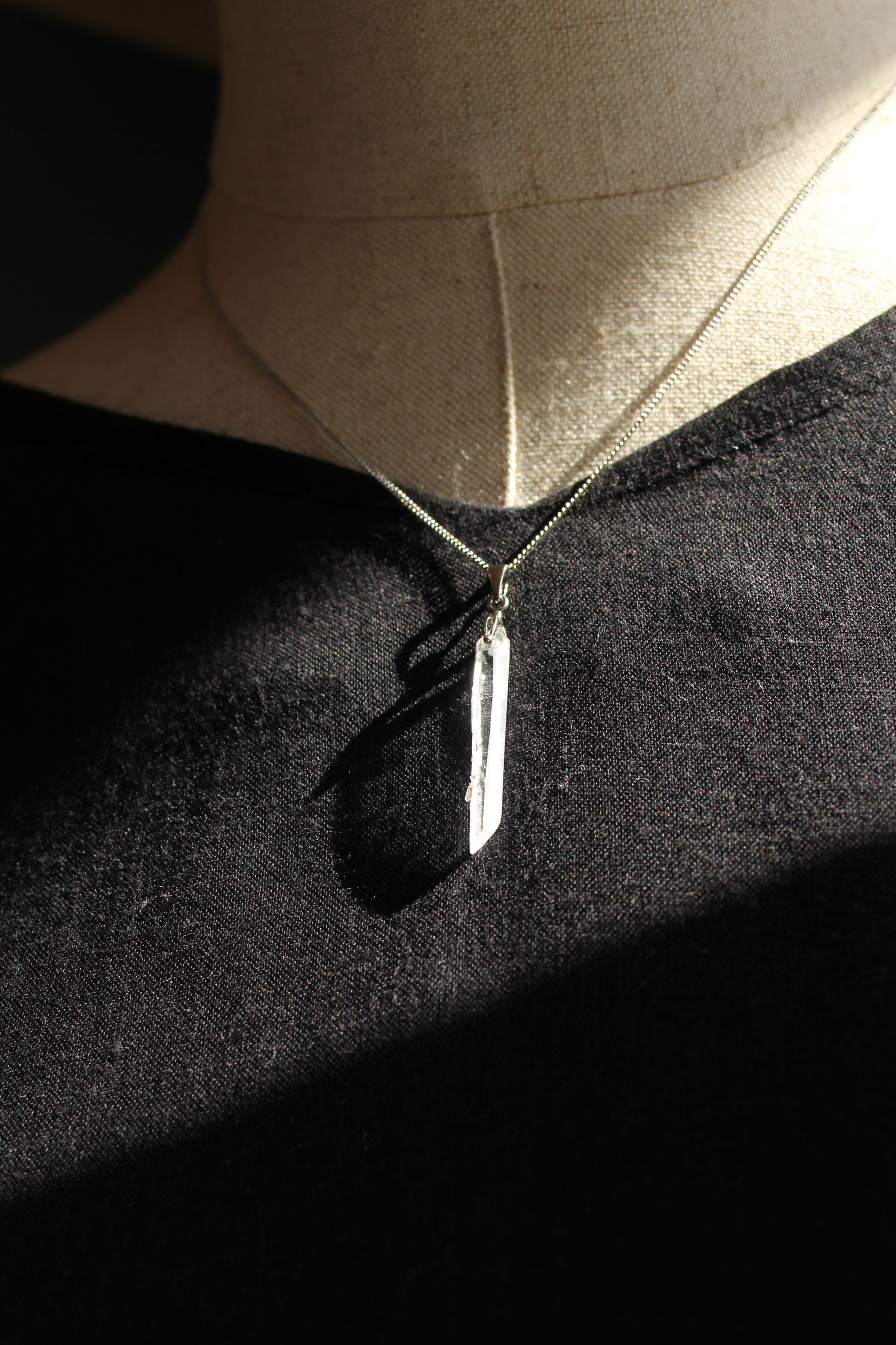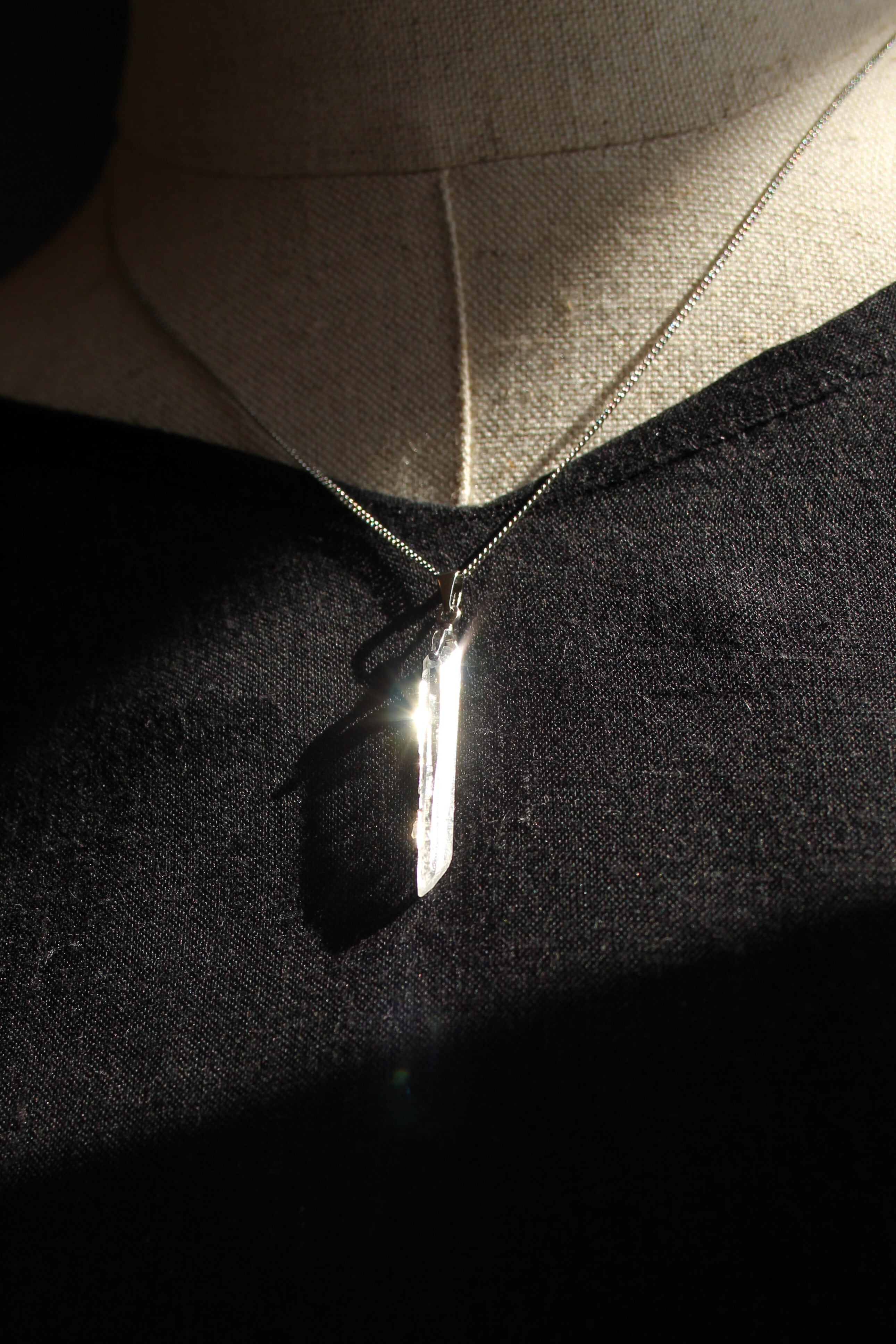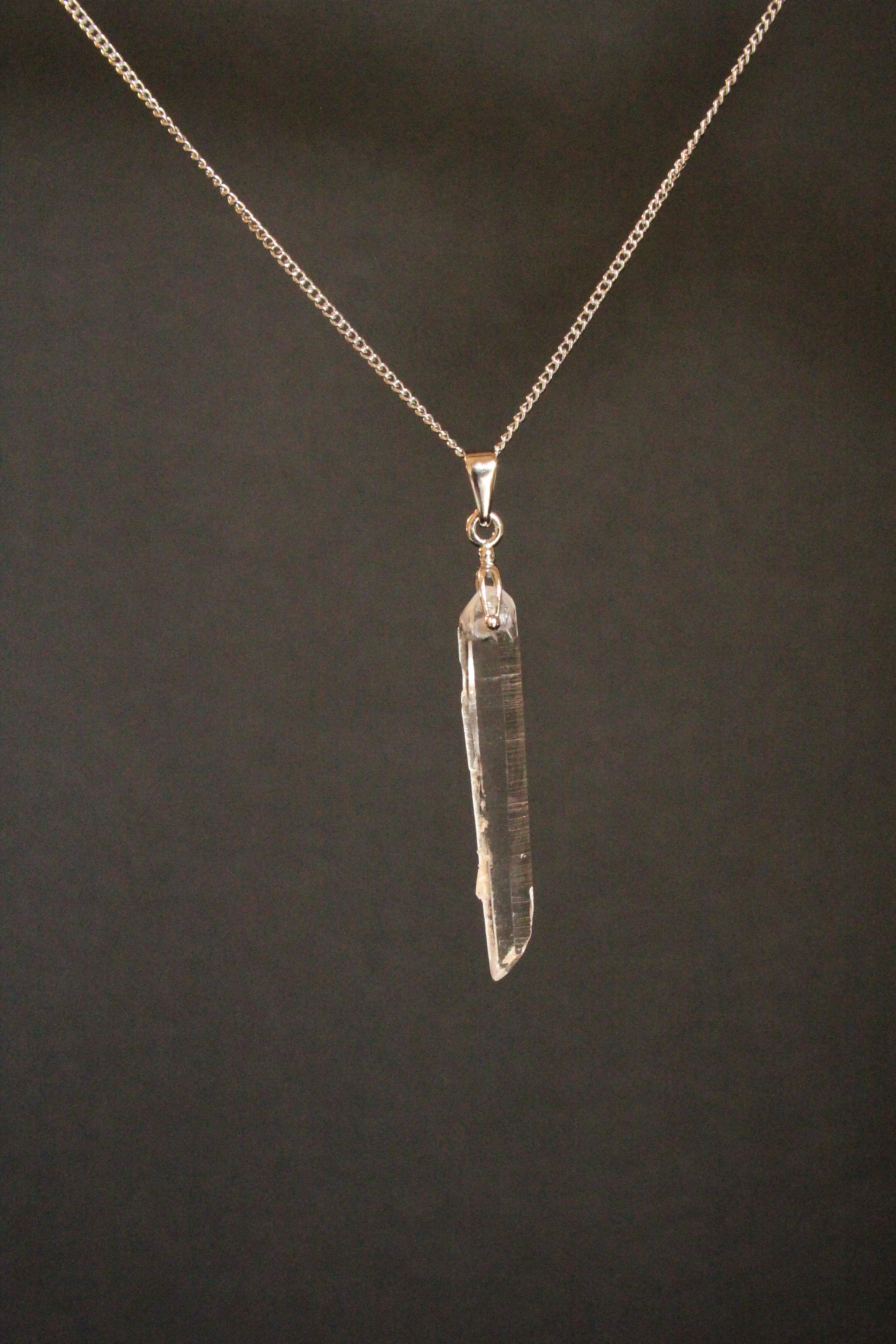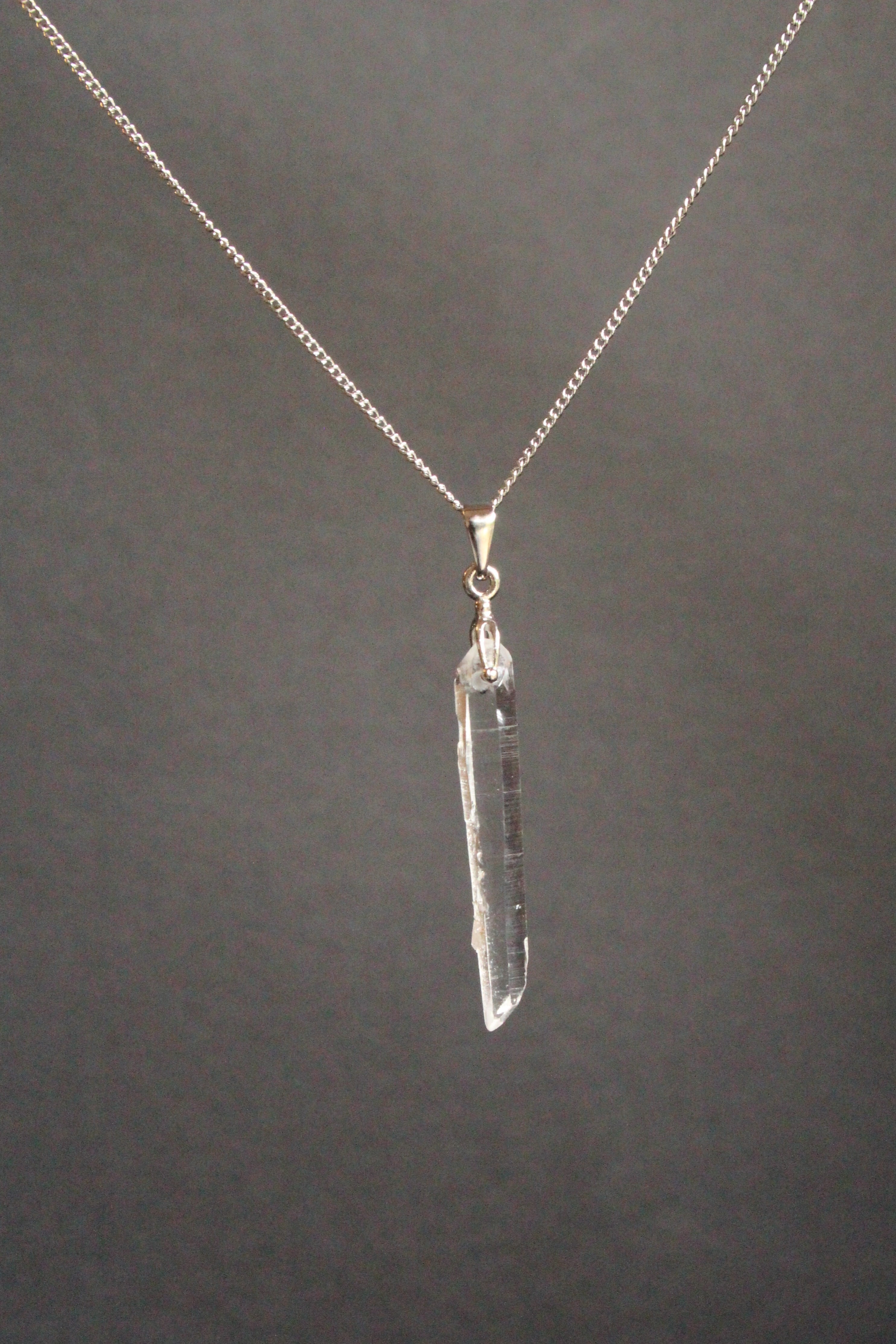 【商品説明】:水晶の原石を使用したネックレス。コロンビアレムリアンを彷彿させるような宮崎県西米良産水晶。細長く、この産地特有の柱面の一部に細かい水晶が付いていて、光の反射でキラキラきれいです。