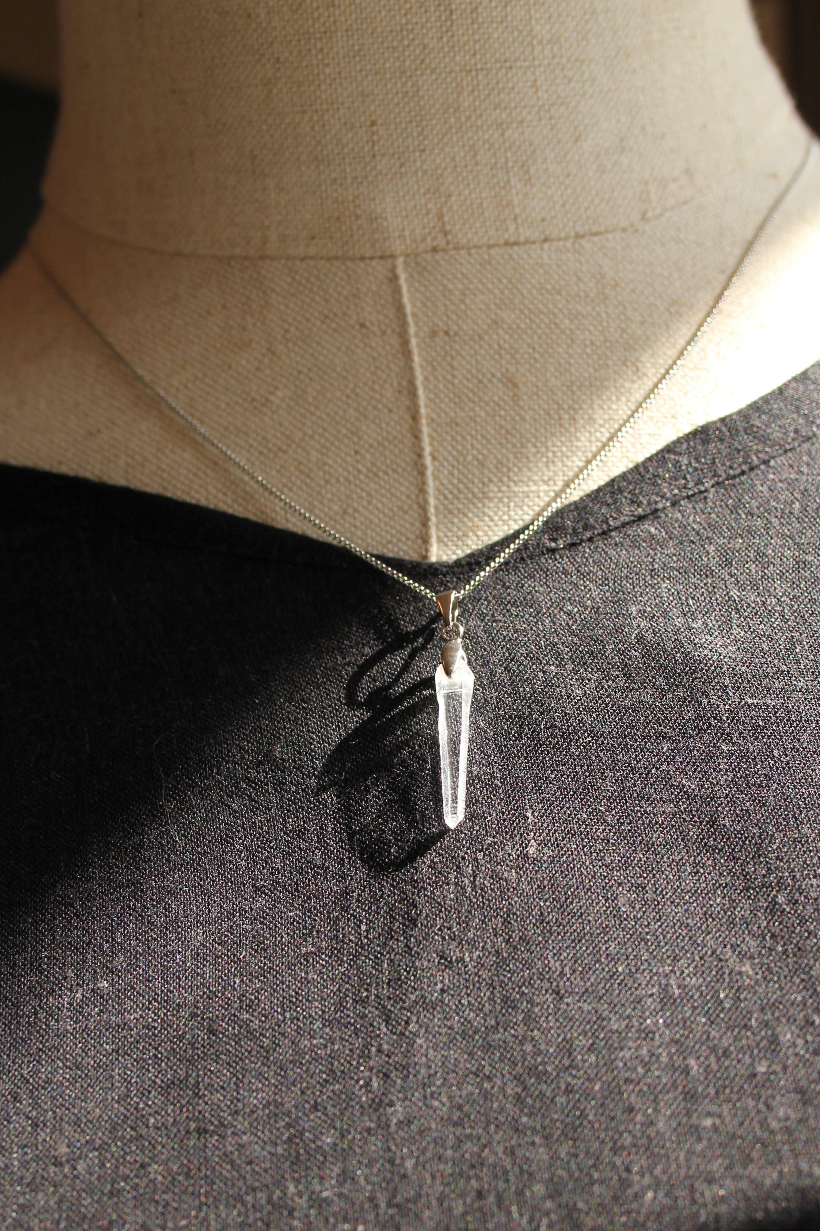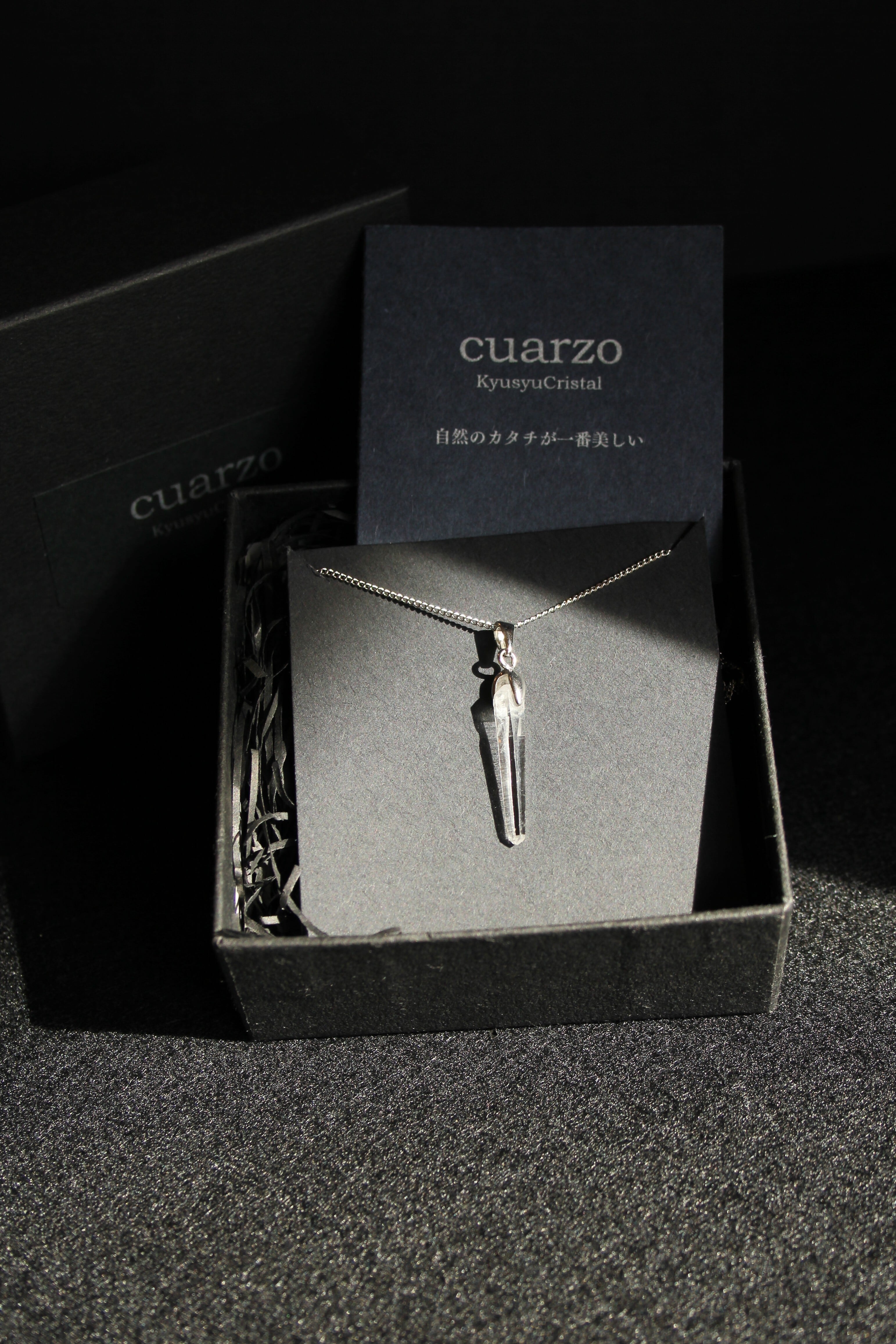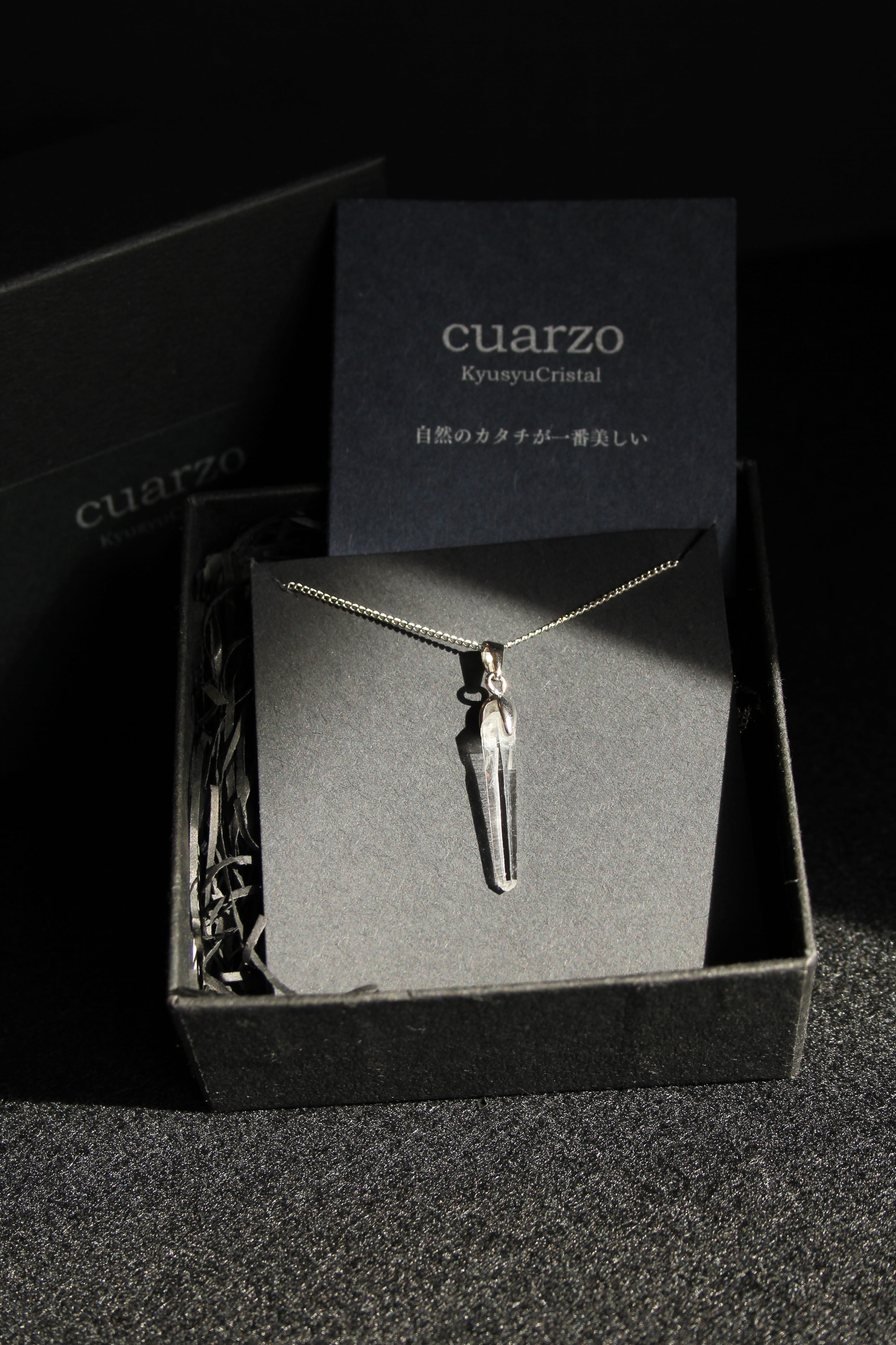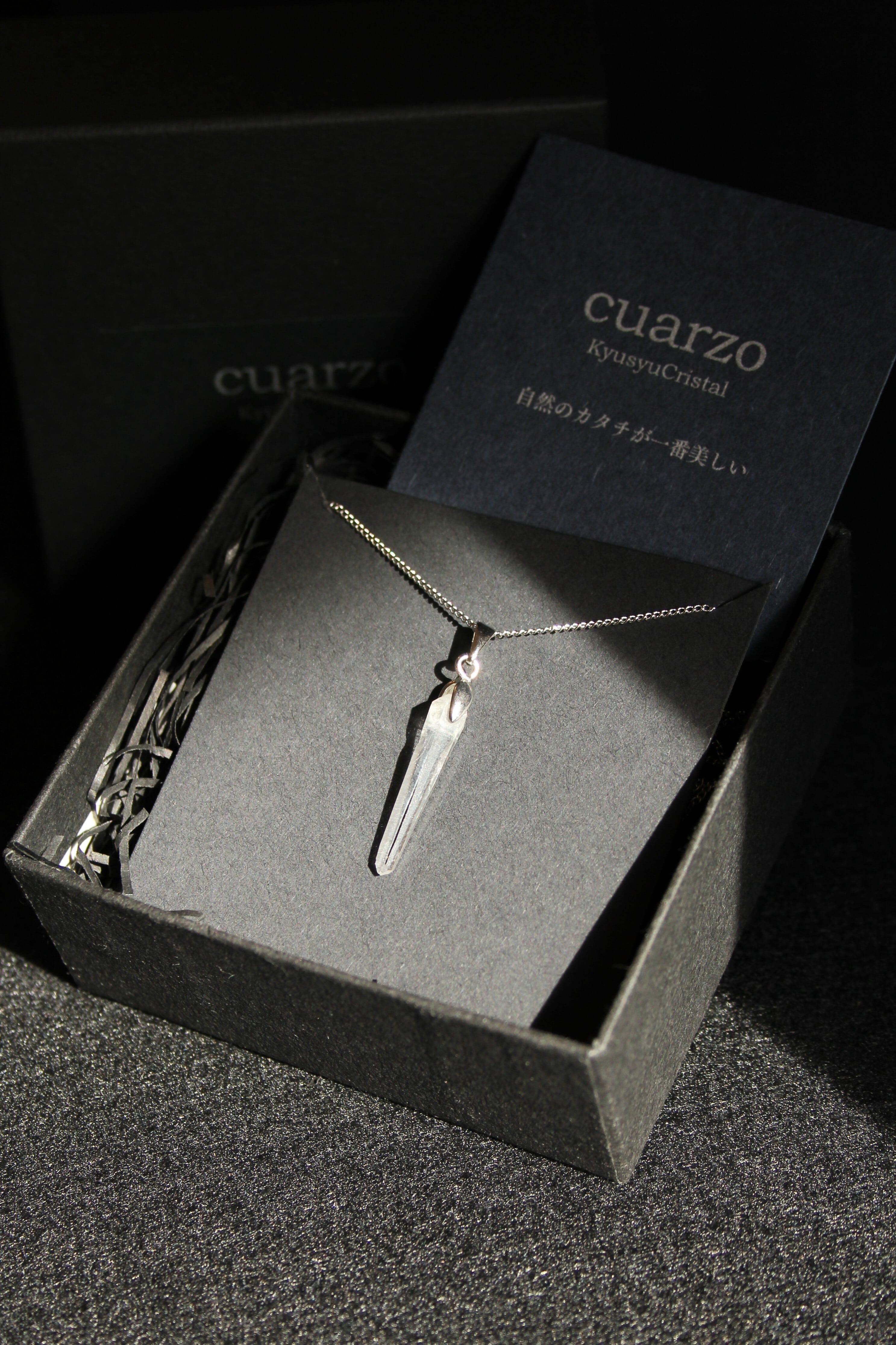 【商品説明】:水晶の原石を使用したネックレス。宮崎クリスタルの中でも、極限られた地域でしか産出されない透明度が抜群に高い日之影町見立産の水晶です。先端行くほど細くなり、先は綺麗な六角錘をしています。