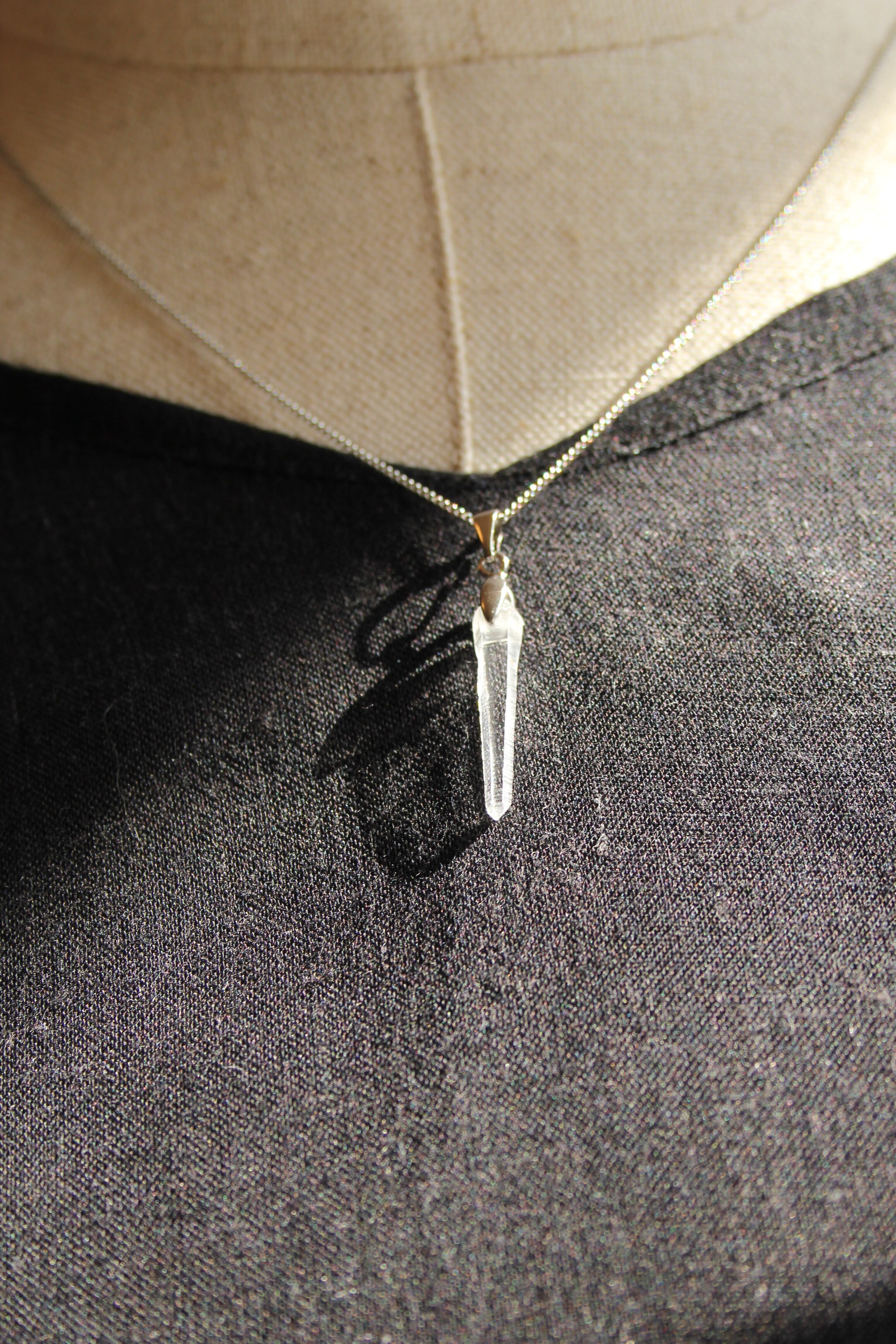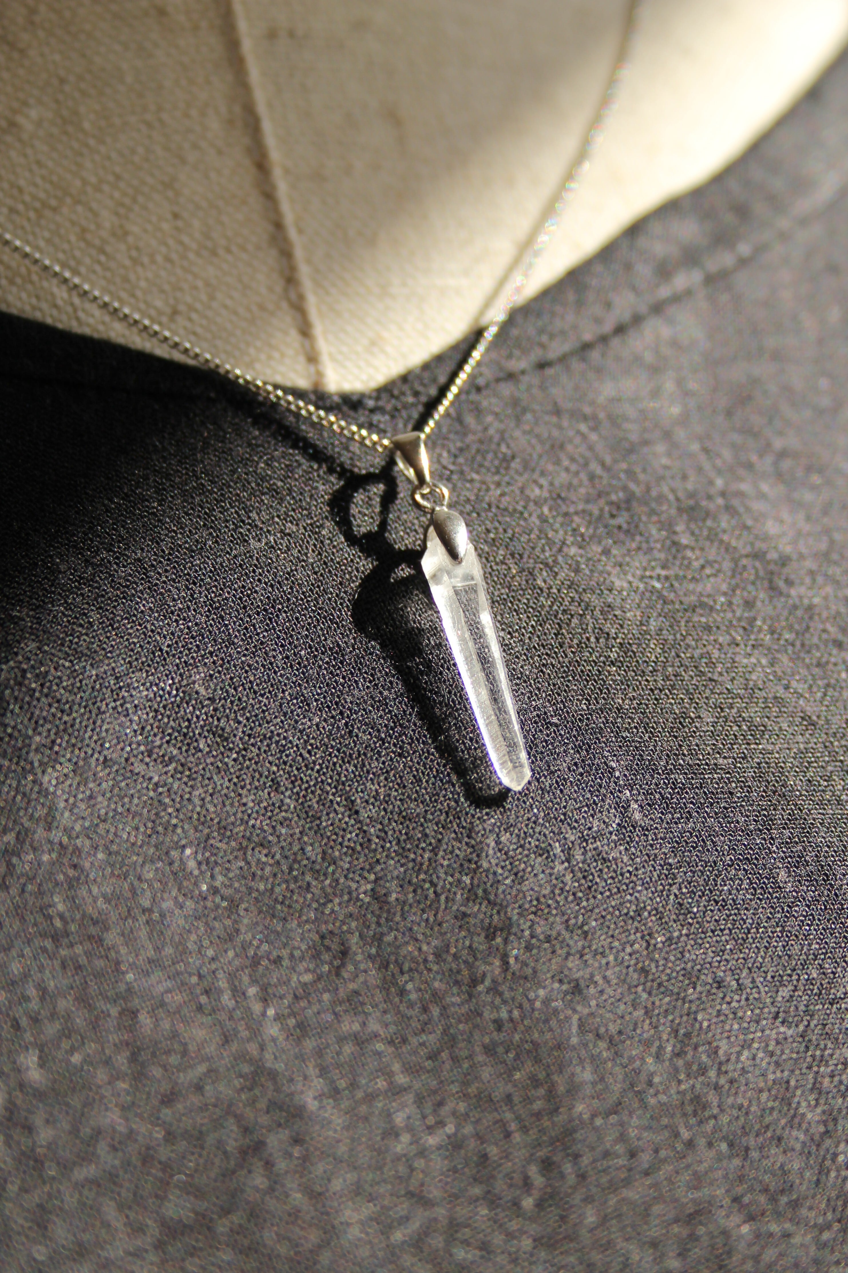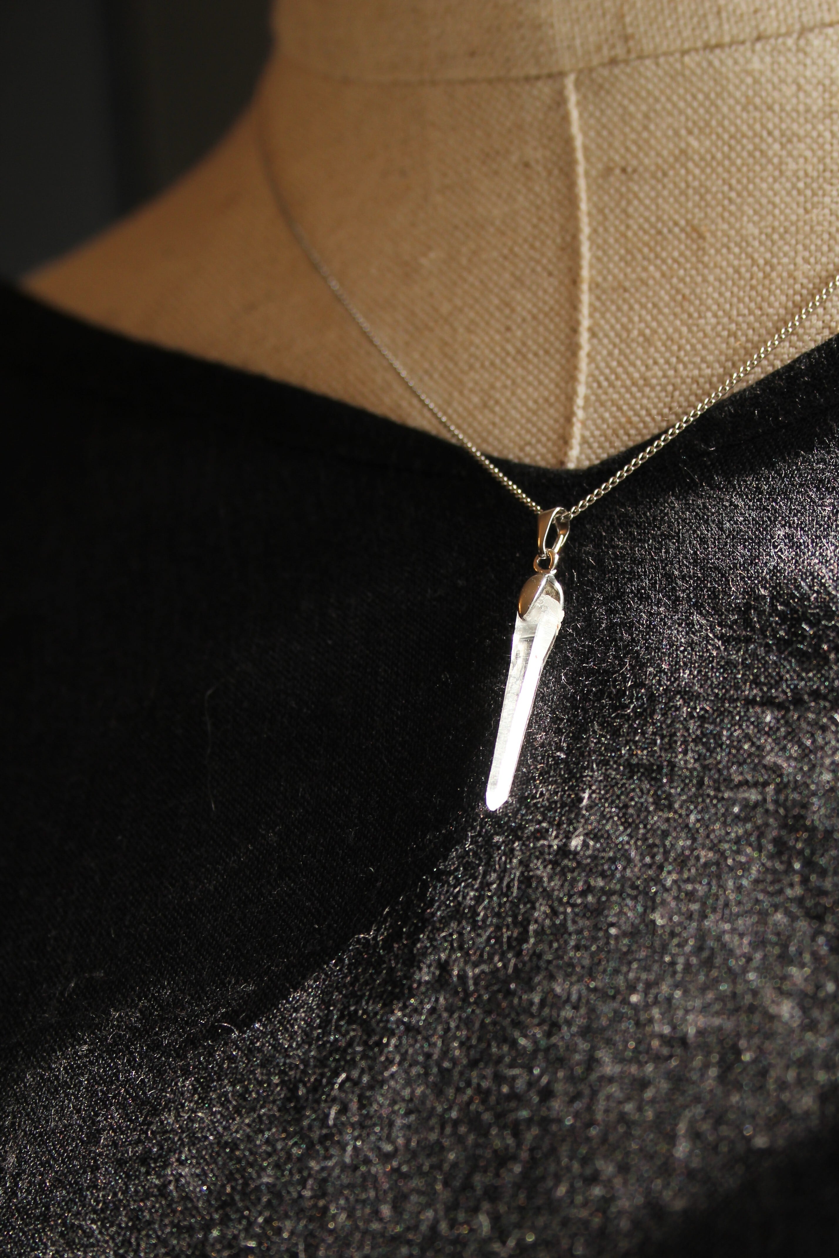 【商品説明】:水晶の原石を使用したネックレス。宮崎クリスタルの中でも、極限られた地域でしか産出されない透明度が抜群に高い日之影町見立産の水晶です。先端行くほど細くなり、先は綺麗な六角錘をしています。