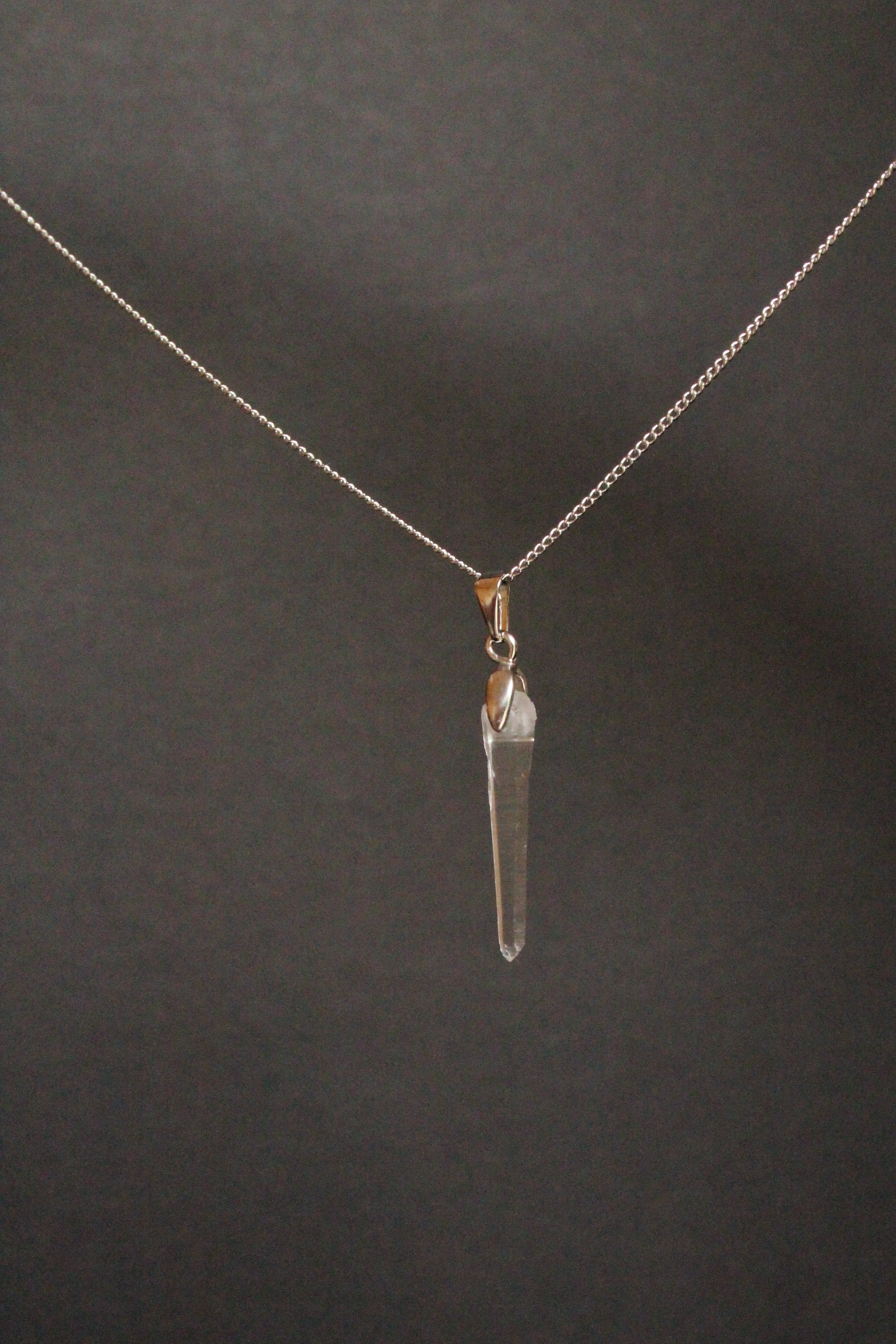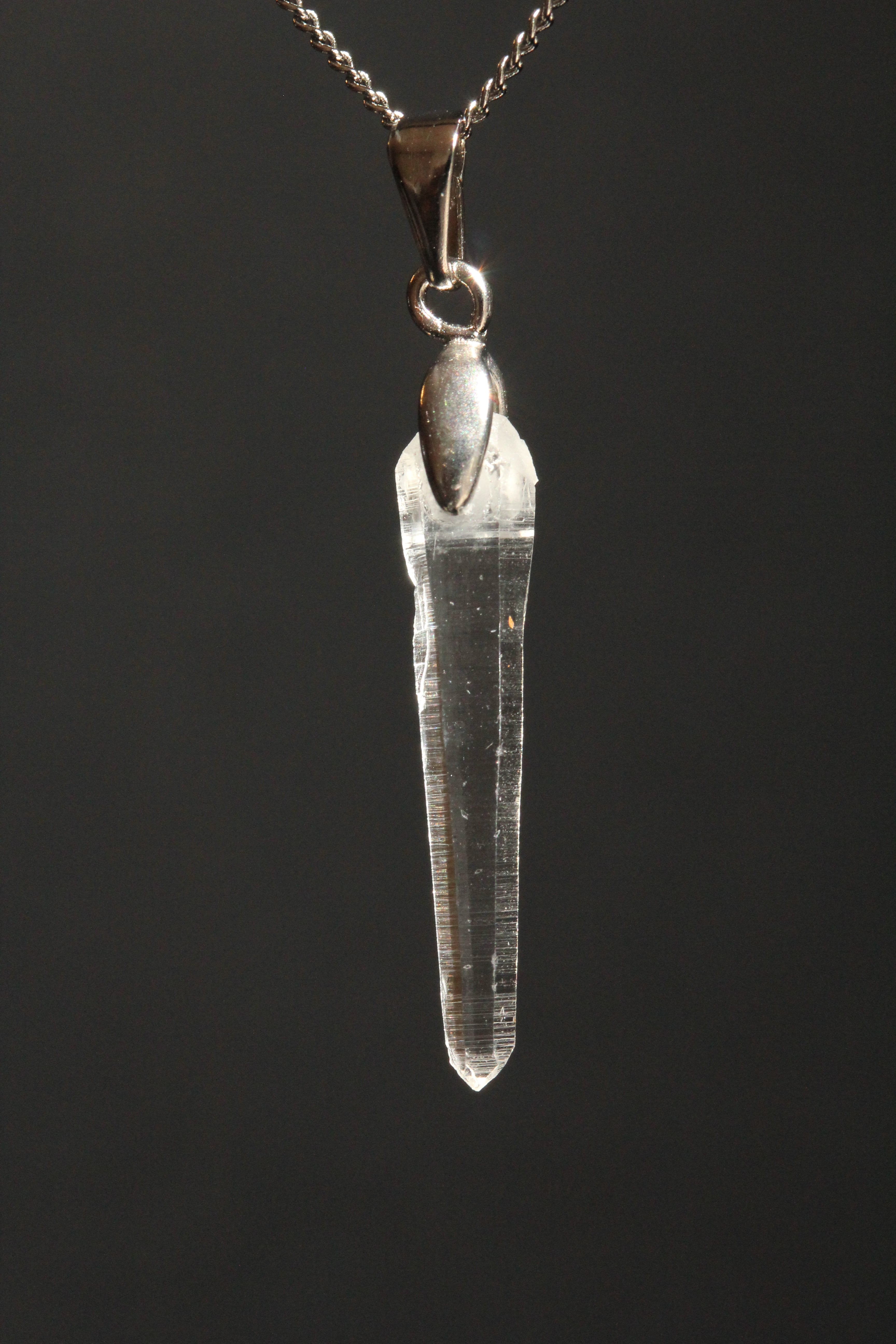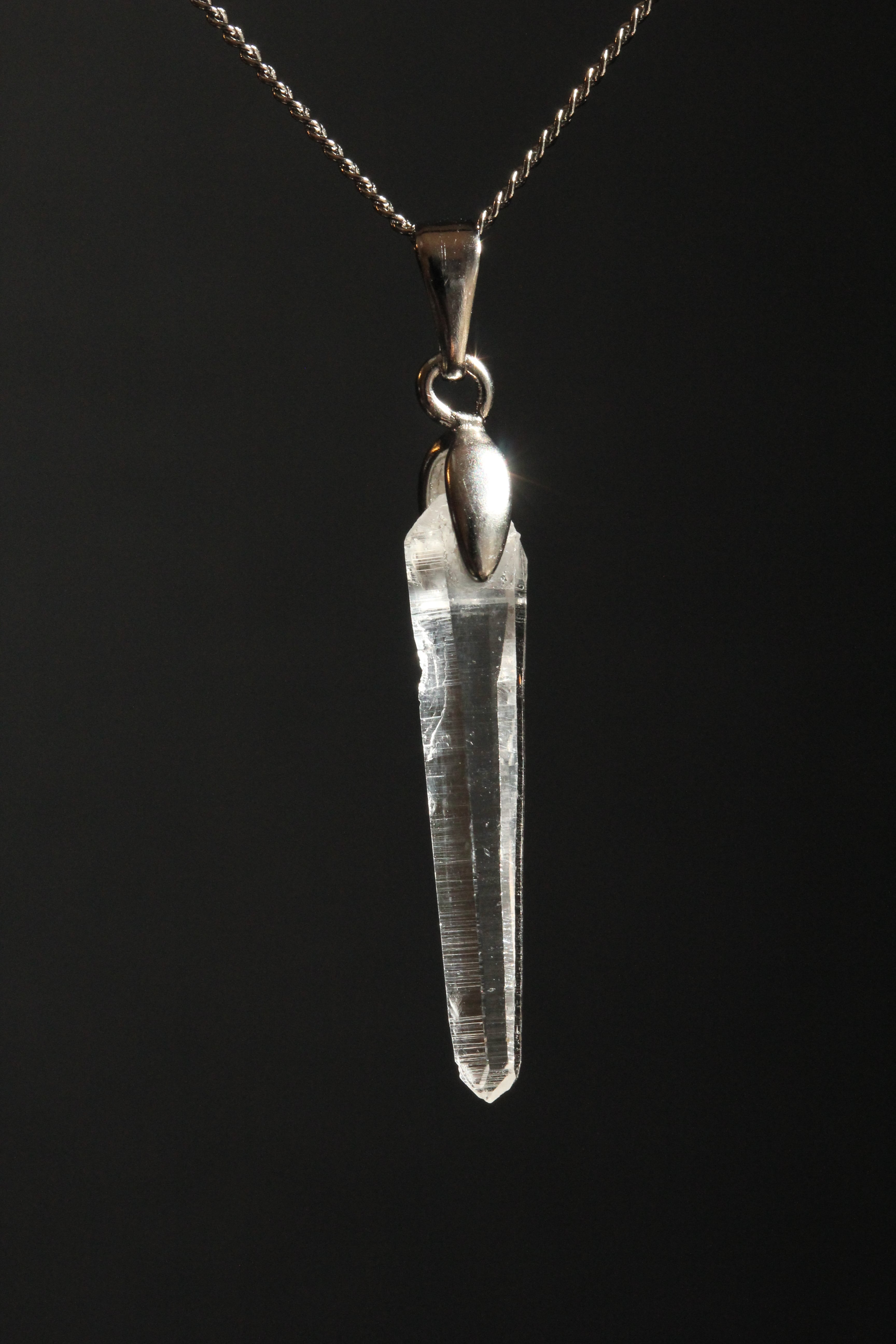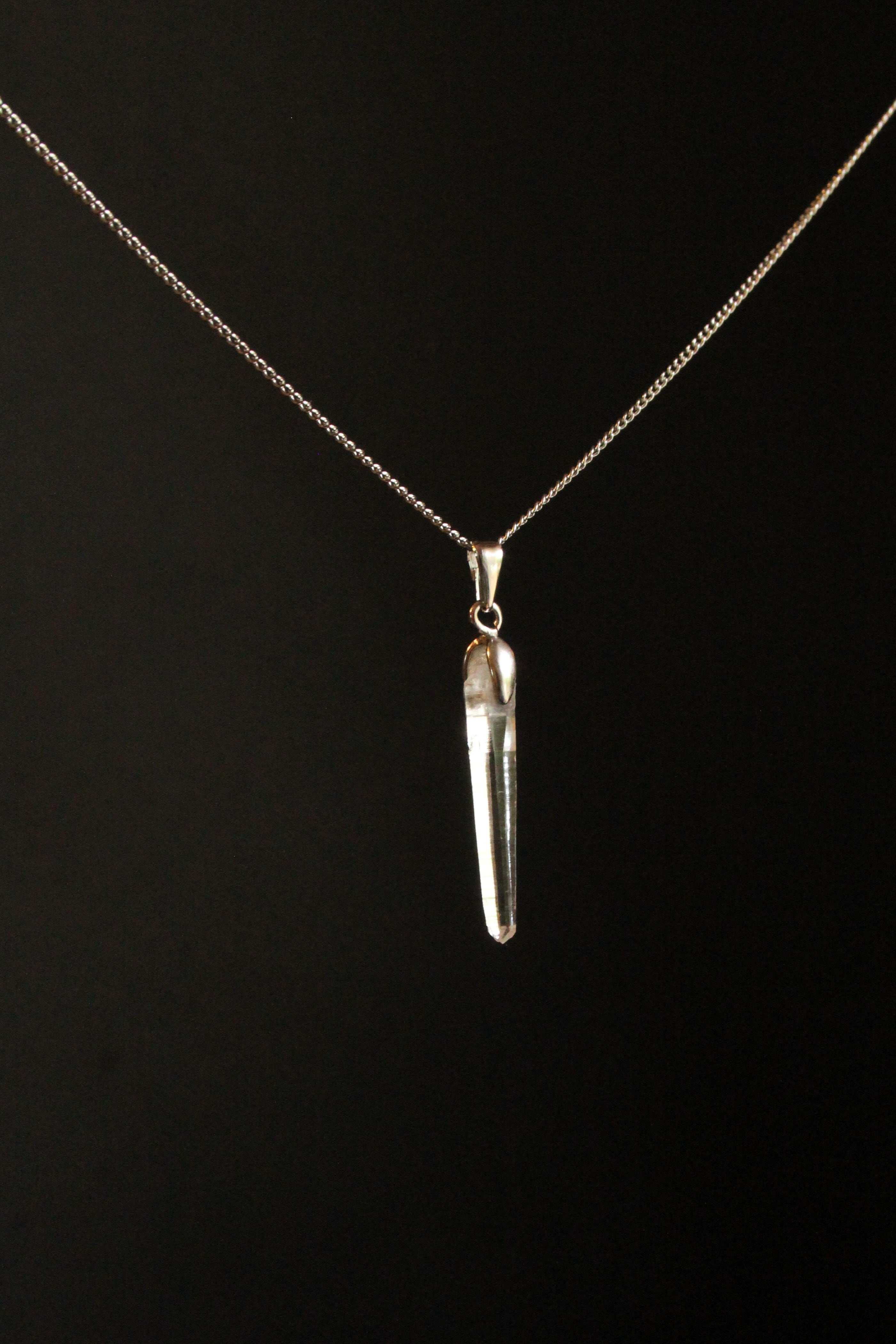 【商品説明】:水晶の原石を使用したネックレス。宮崎クリスタルの中でも、極限られた地域でしか産出されない透明度が抜群に高い日之影町見立産の水晶です。先端行くほど細くなり、先は綺麗な六角錘をしています。