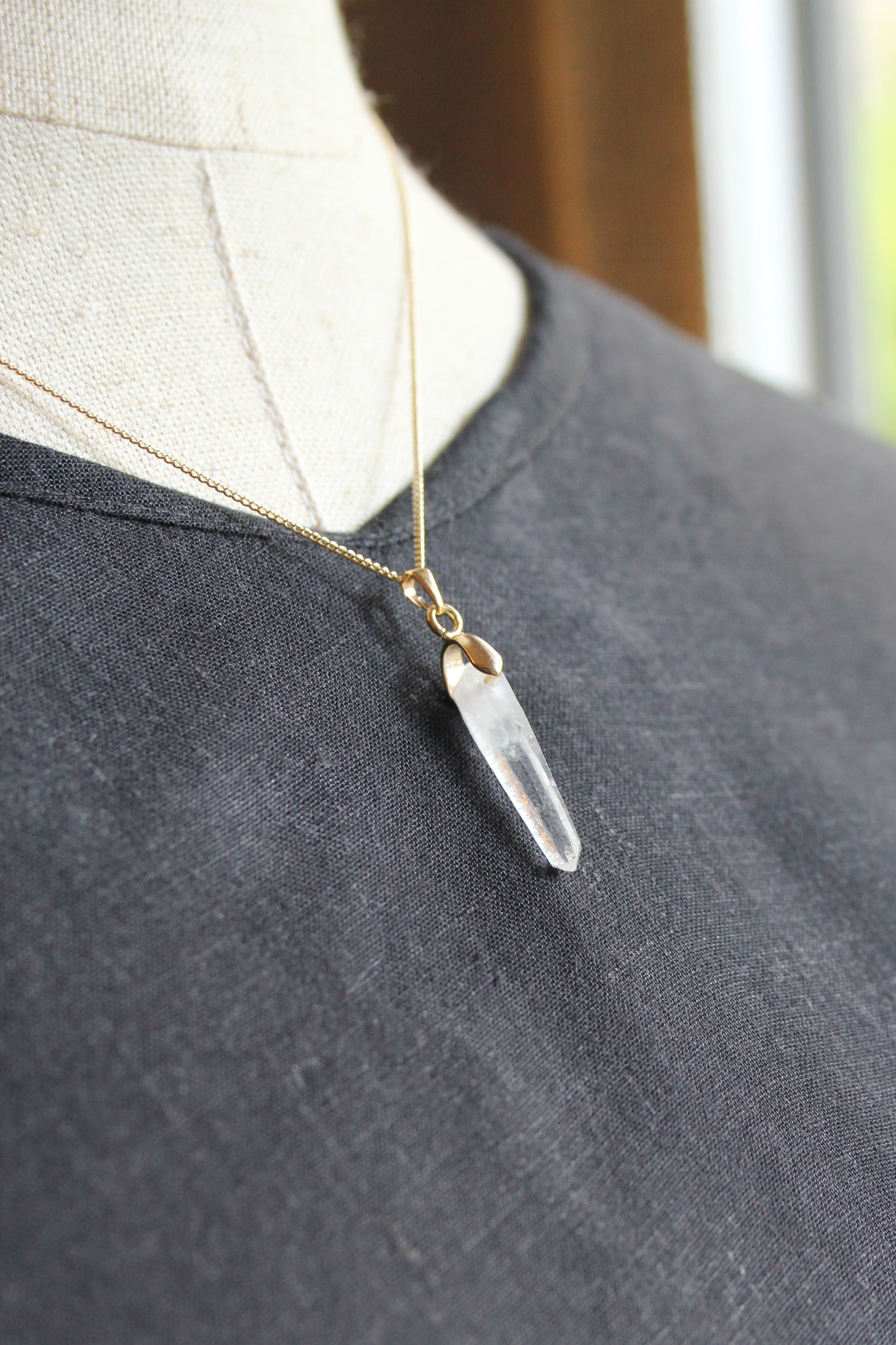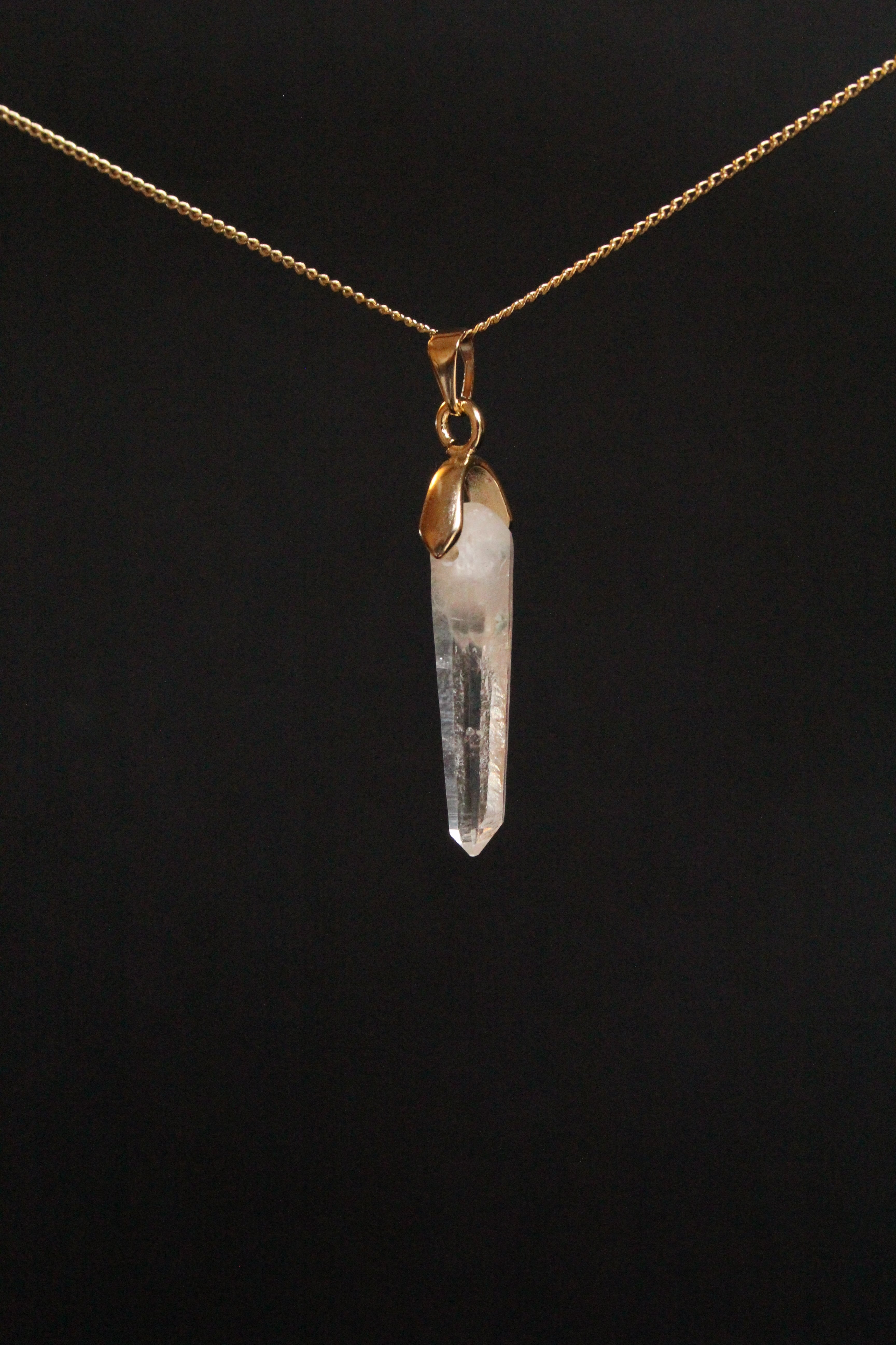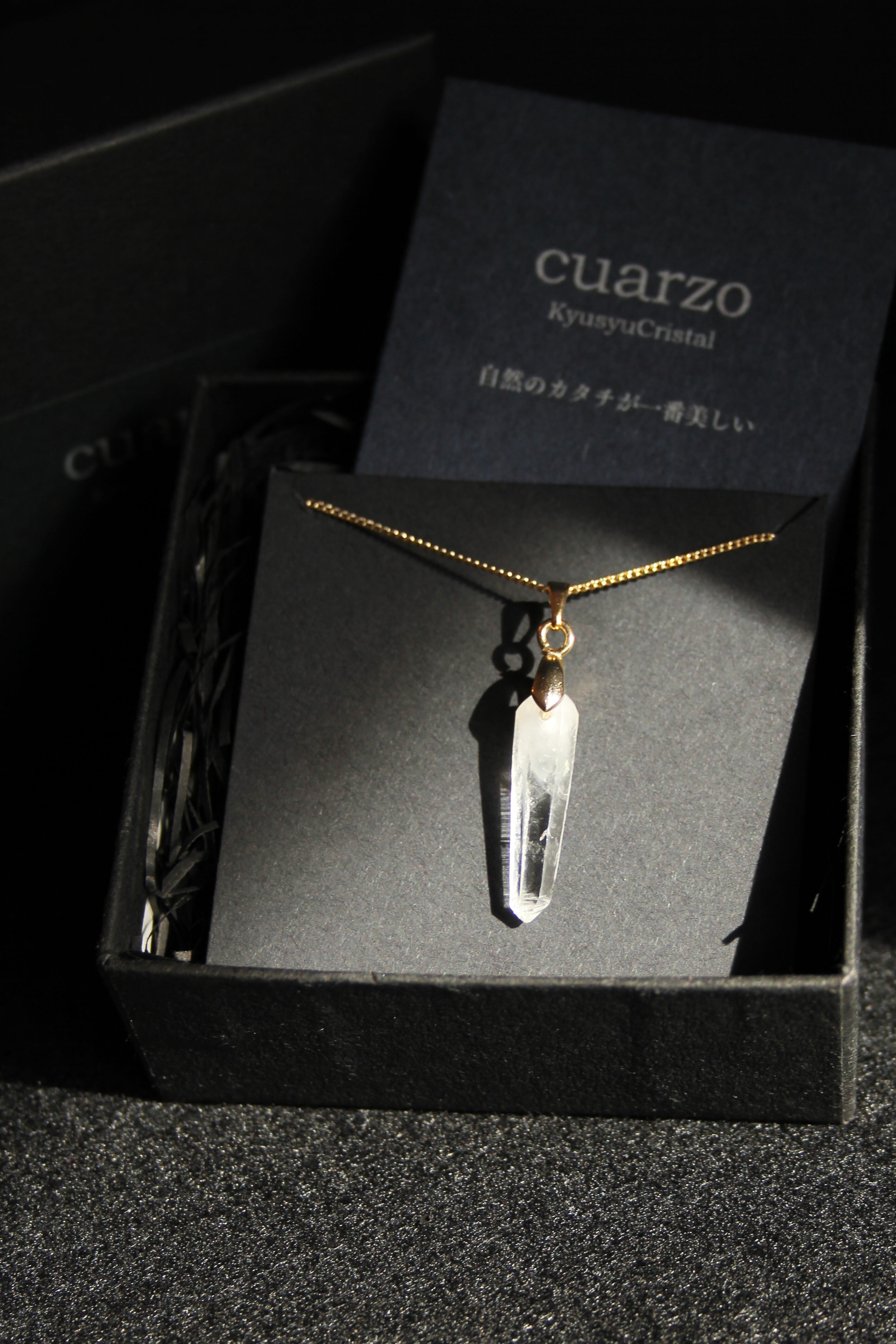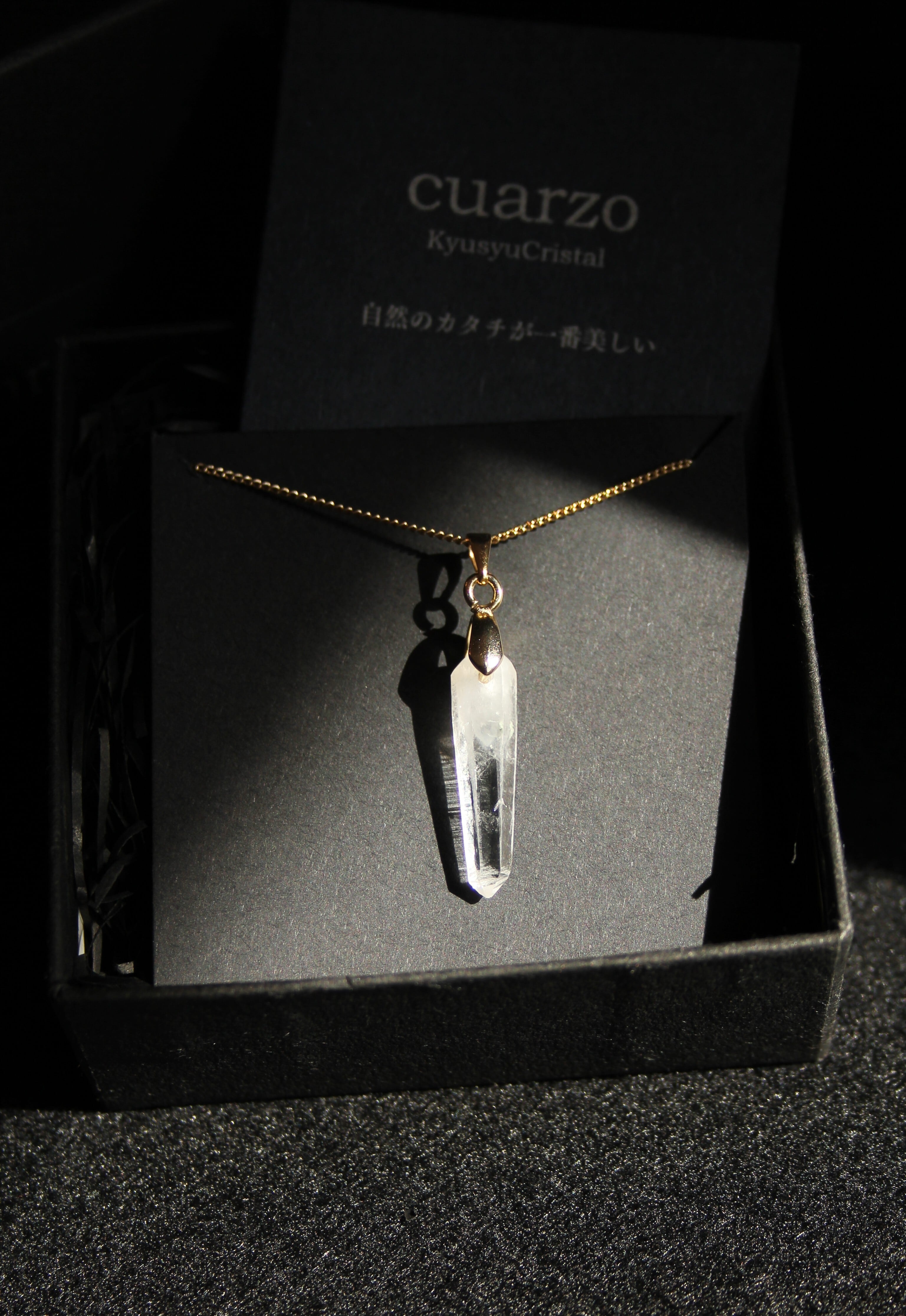 【商品説明】:水晶の原石を使用したネックレス。宮崎クリスタルの中でも、極限られた地域でしか産出されない透明度が抜群に高い日之影町見立産の水晶です。根元に綺麗なファントムが入った、この産地でも貴重な水晶です。