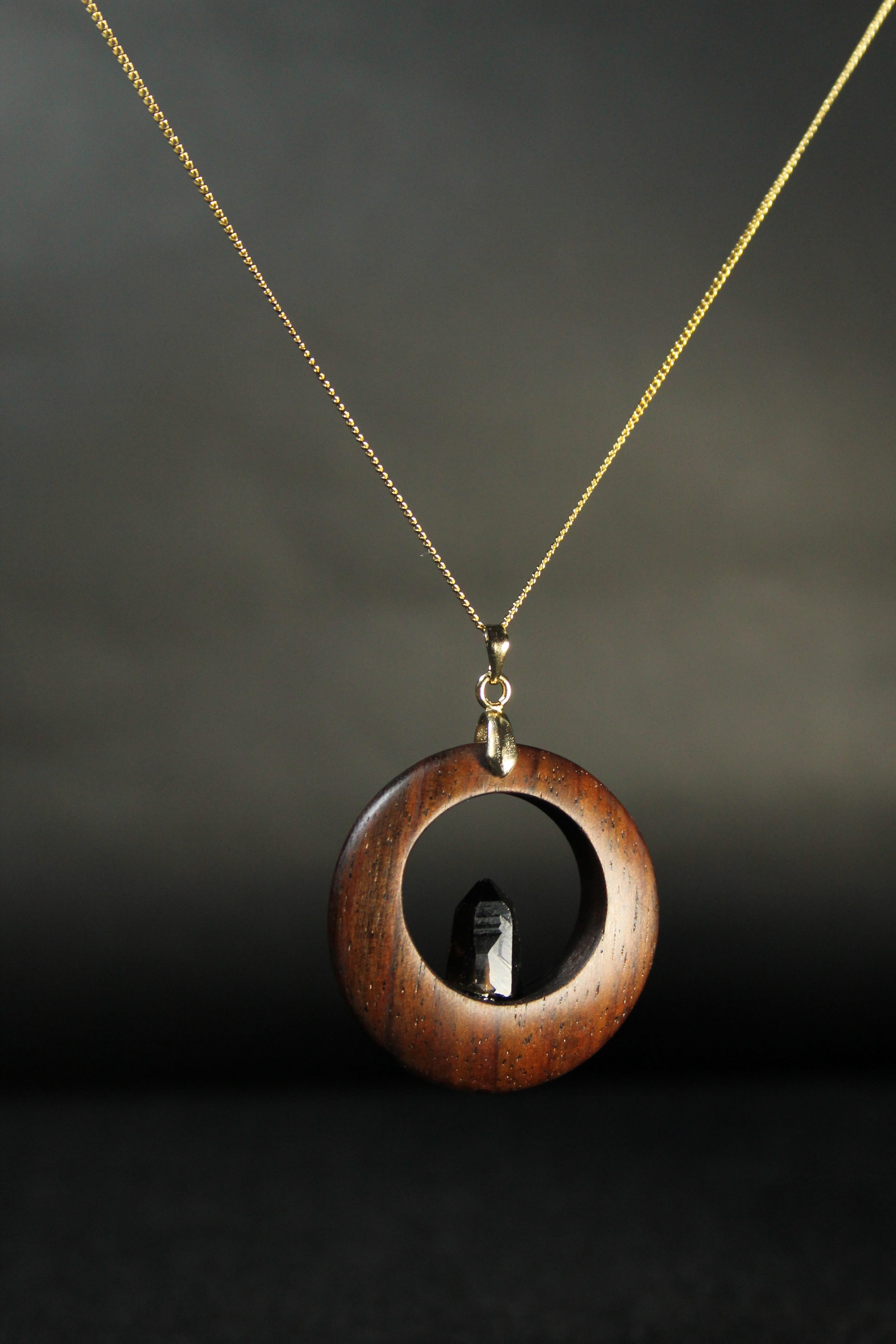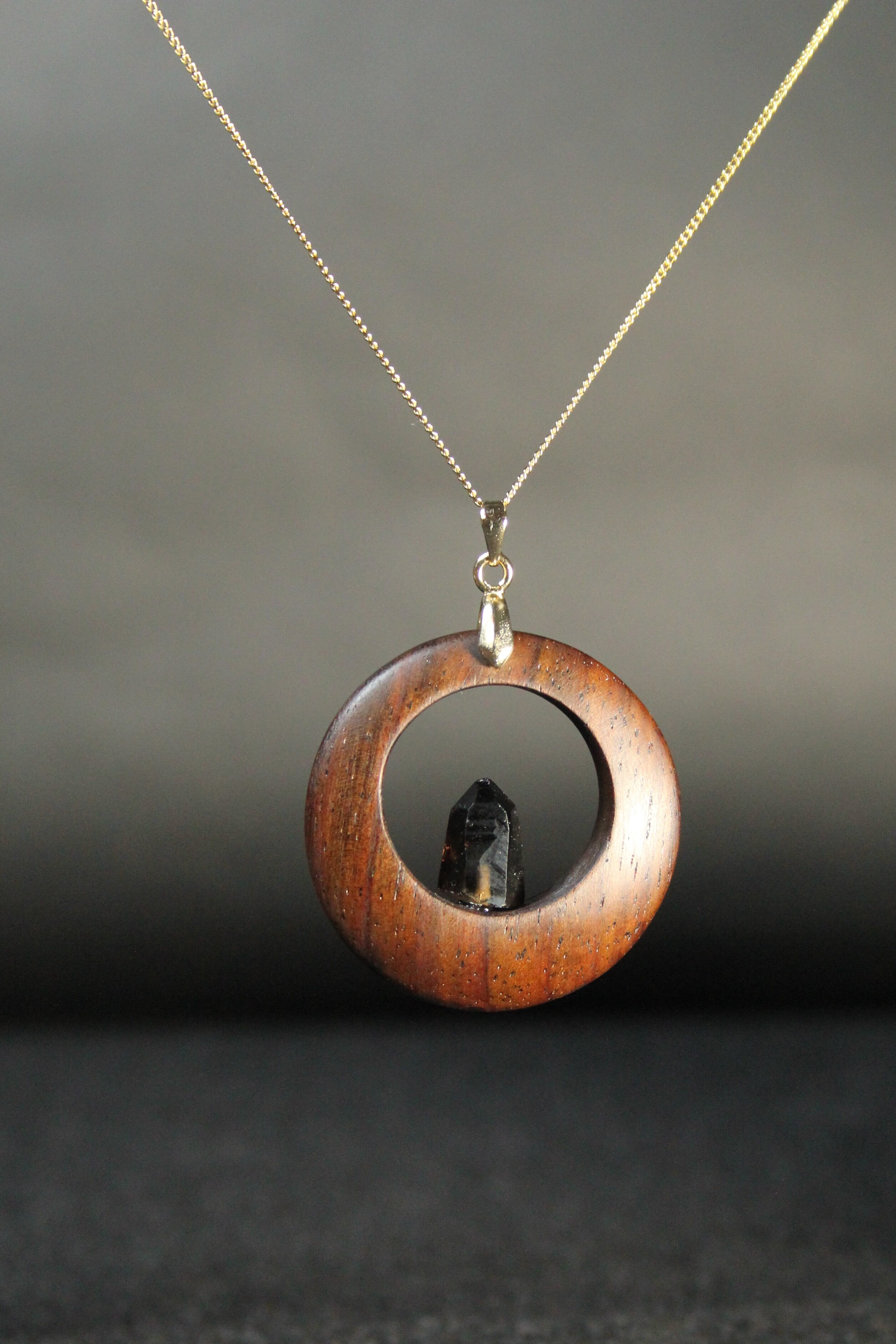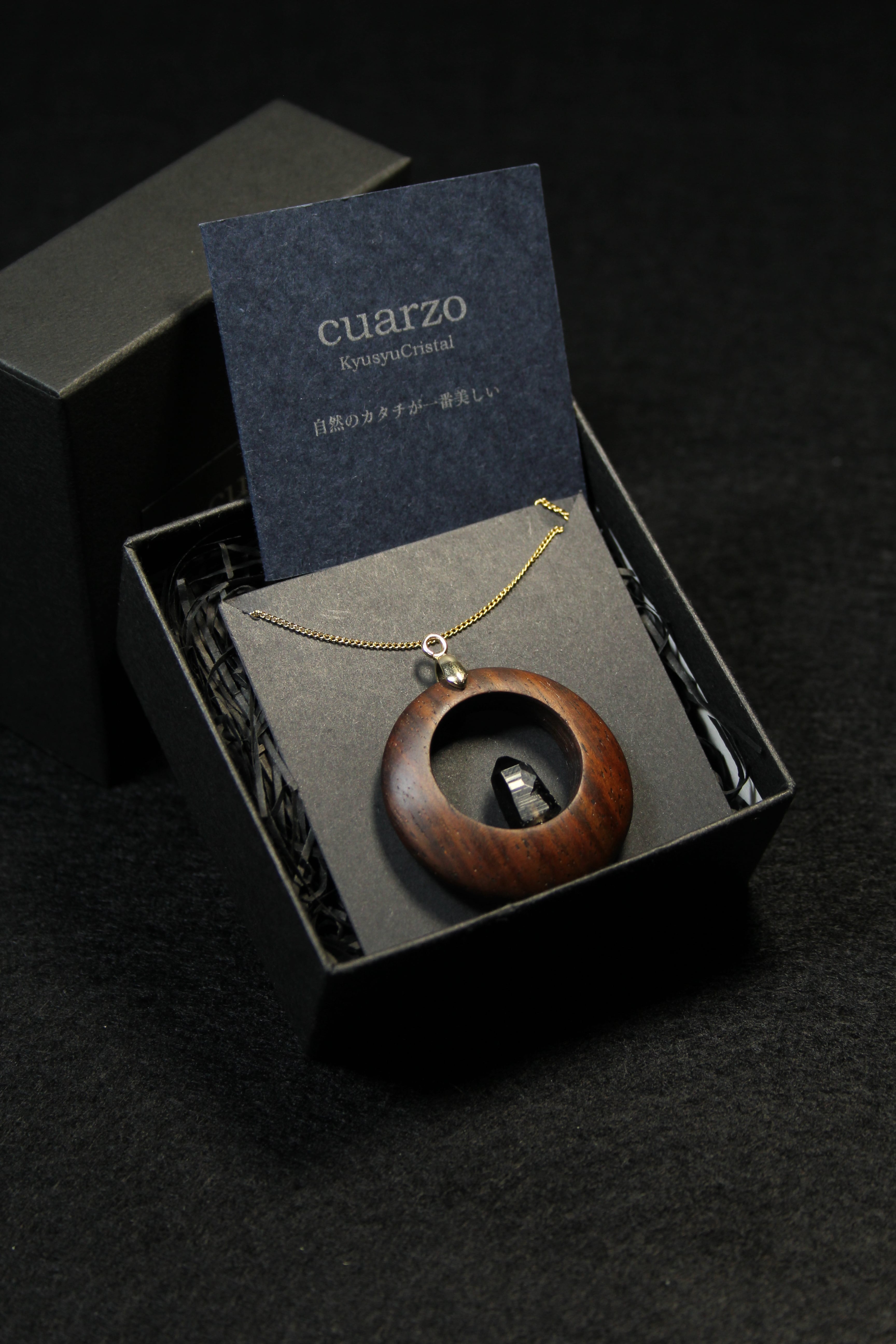 【商品説明】:煙水晶の原石と高級木材のローズウッドを使用したペンダント。ペンダントに使用している水晶は、産出した中でも、選りすぐり美しさを誇るものです。ほぼモリオンに近い感じの宮崎産の煙水晶です。