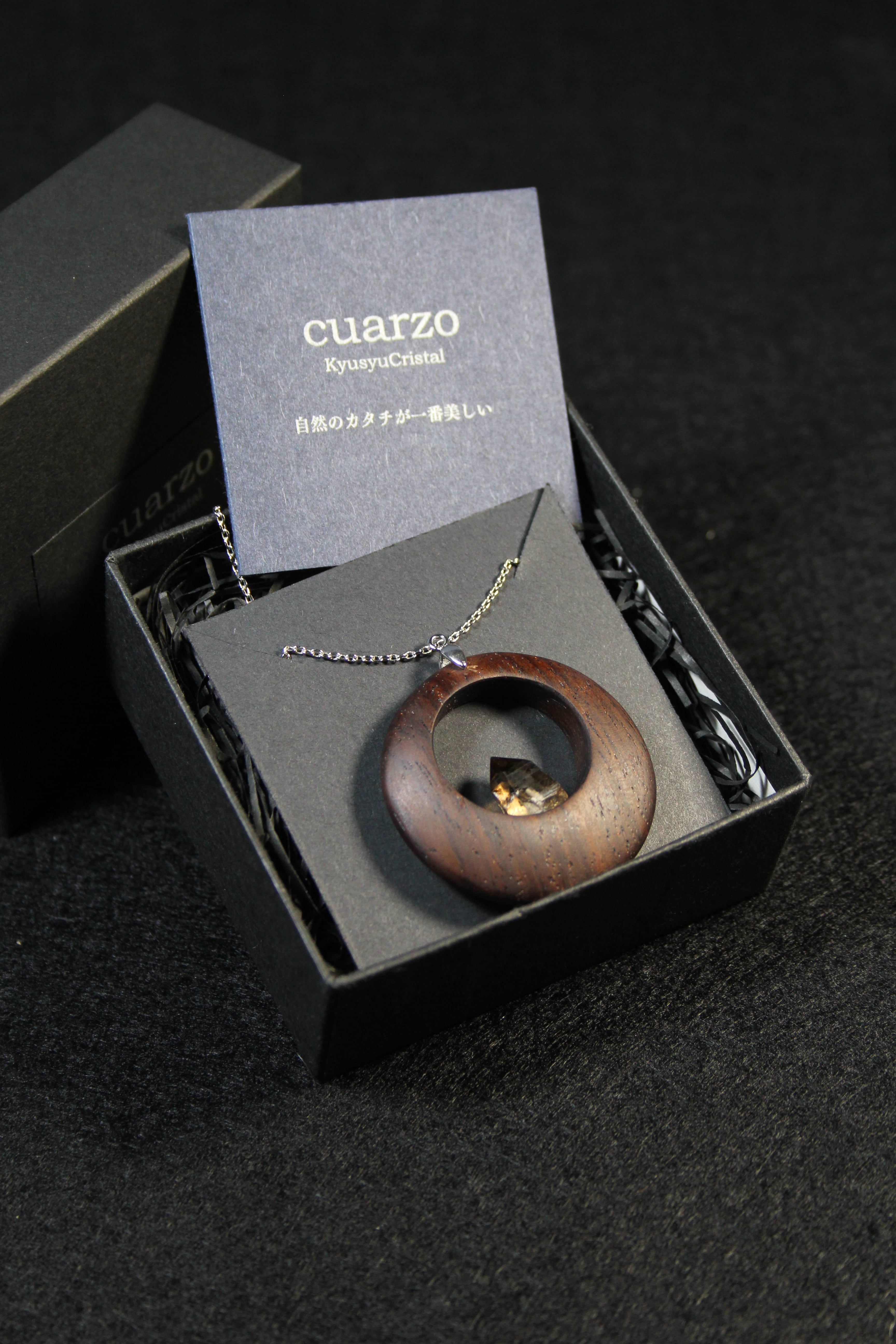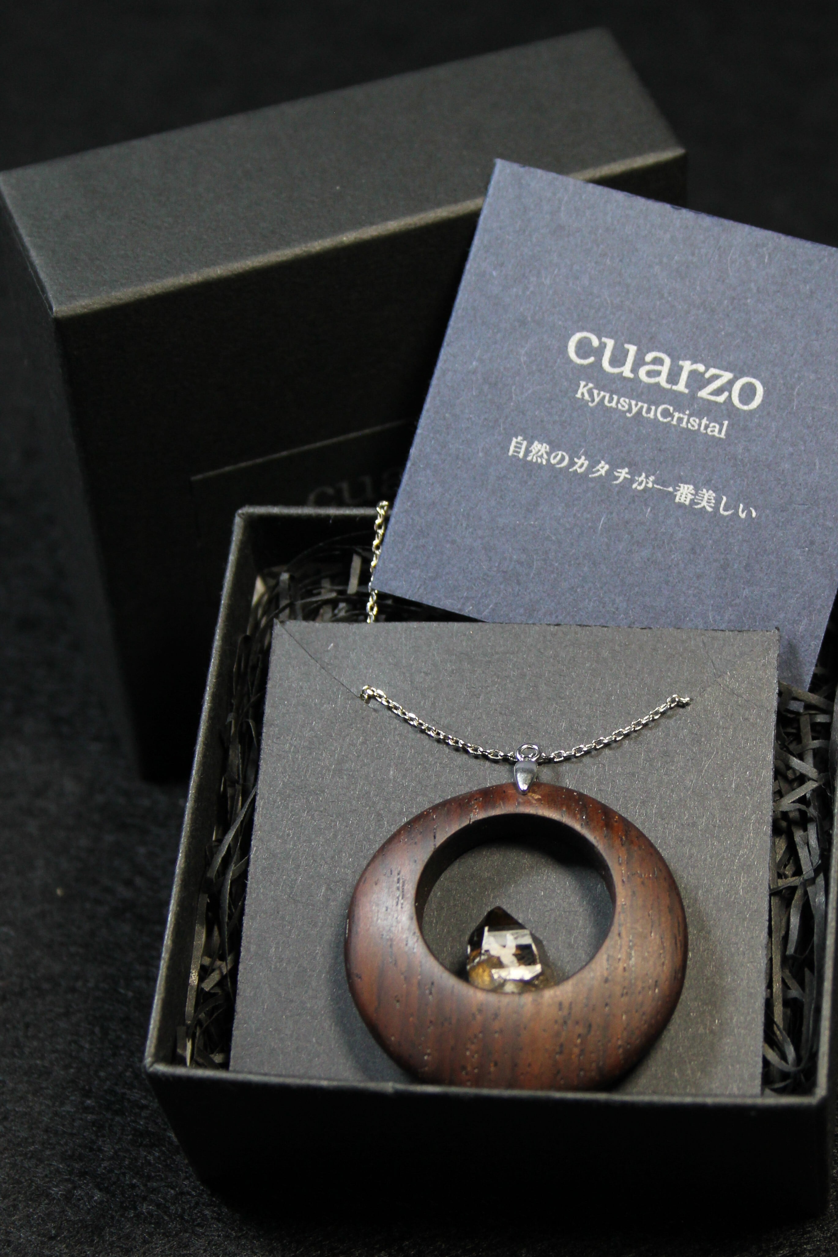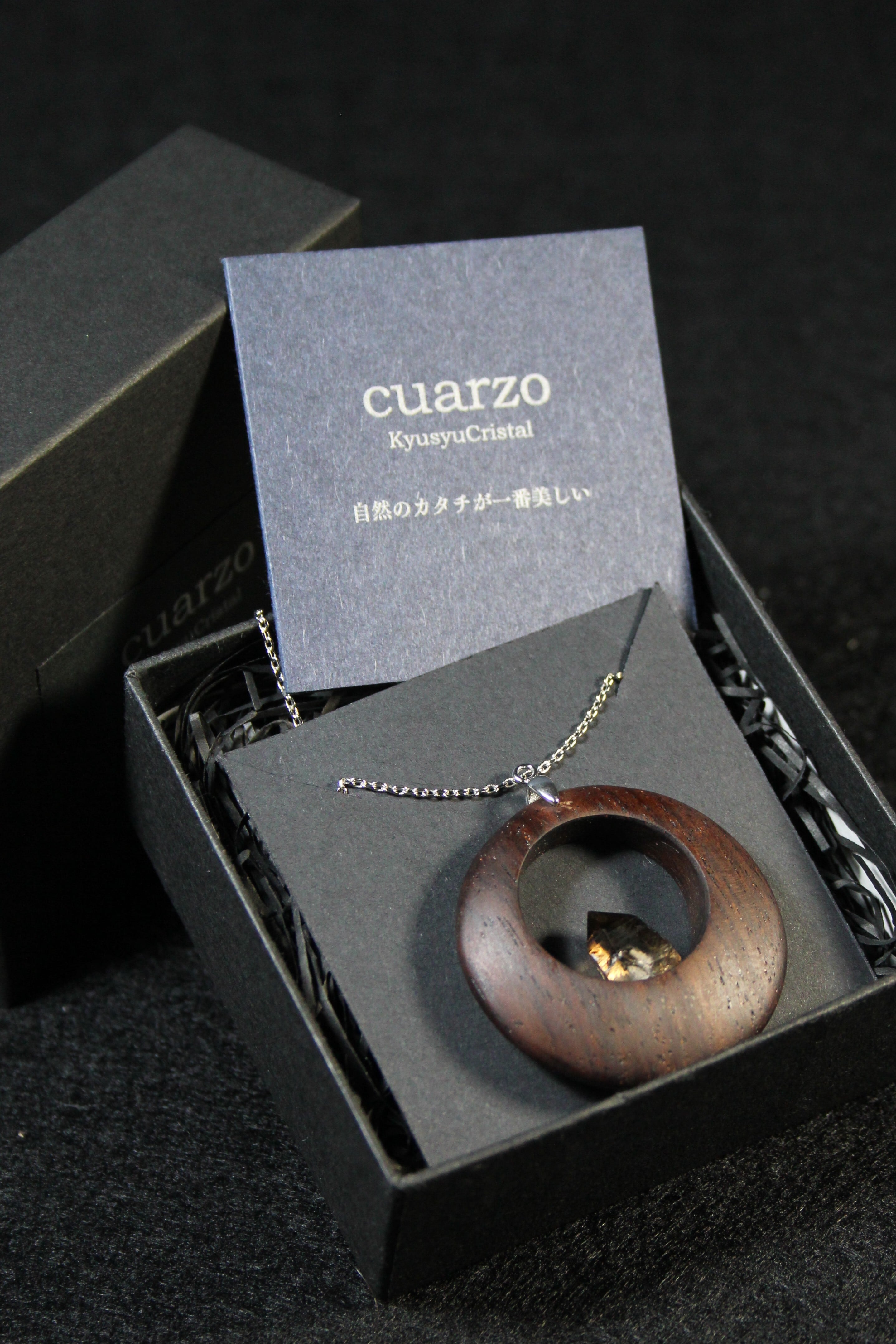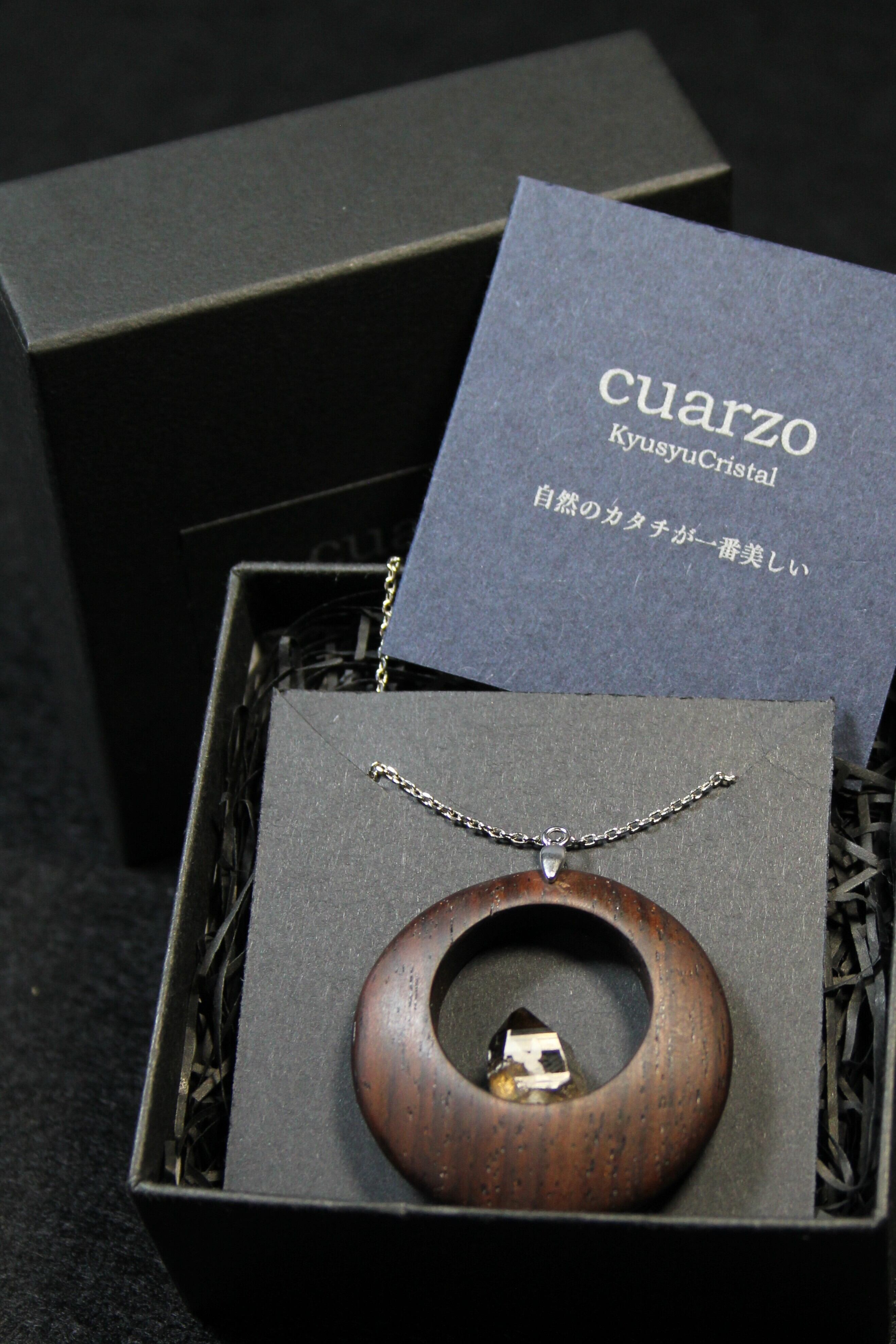 【商品説明】:煙水晶の原石と高級木材のローズウッドを使用したペンダント。ペンダントに使用している水晶は、産出した中でも、選りすぐり美しさを誇るものです。根元がグレーで頭に向けて黒い近い感じになる透明感溢れる宮崎産の煙水晶です。