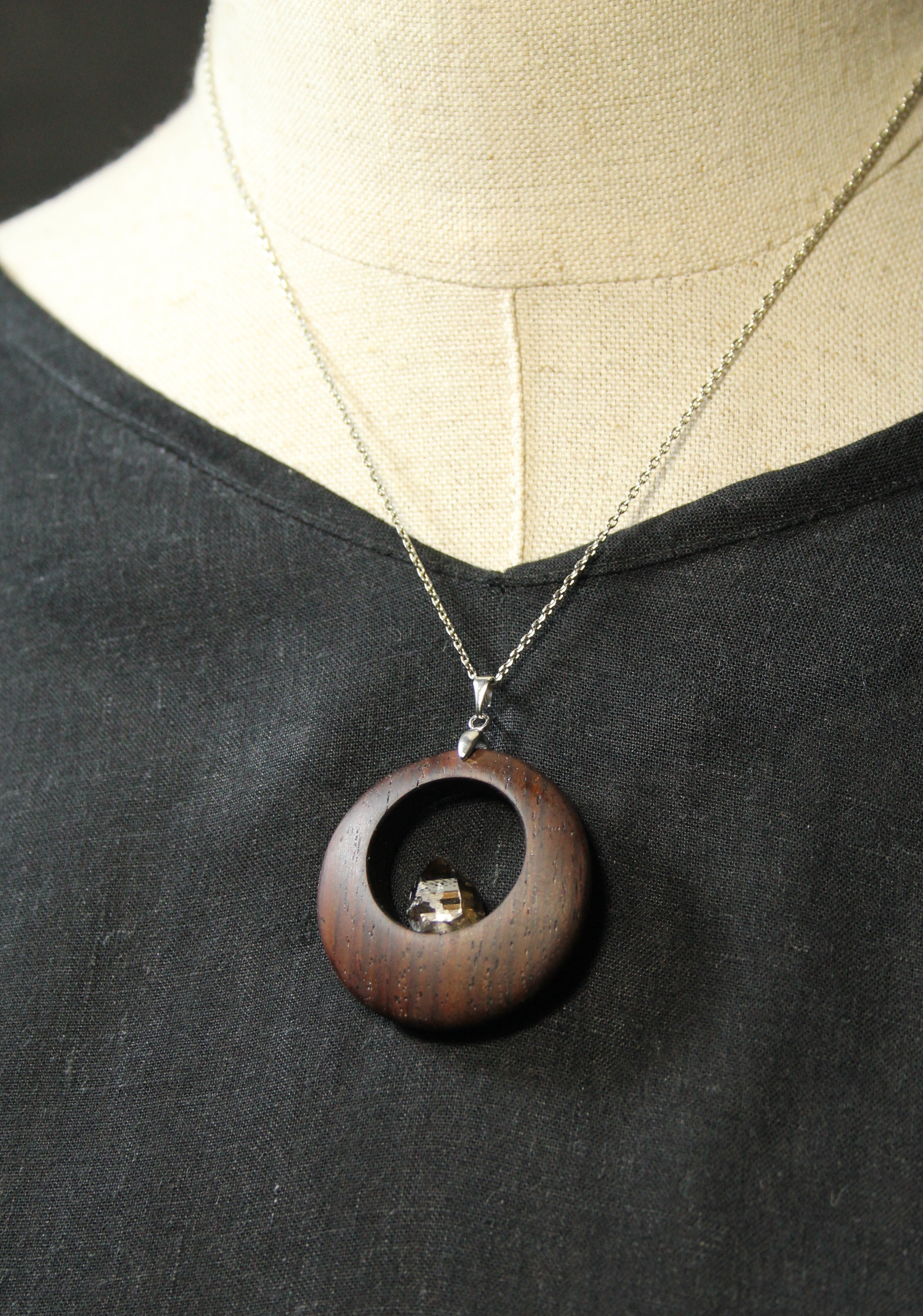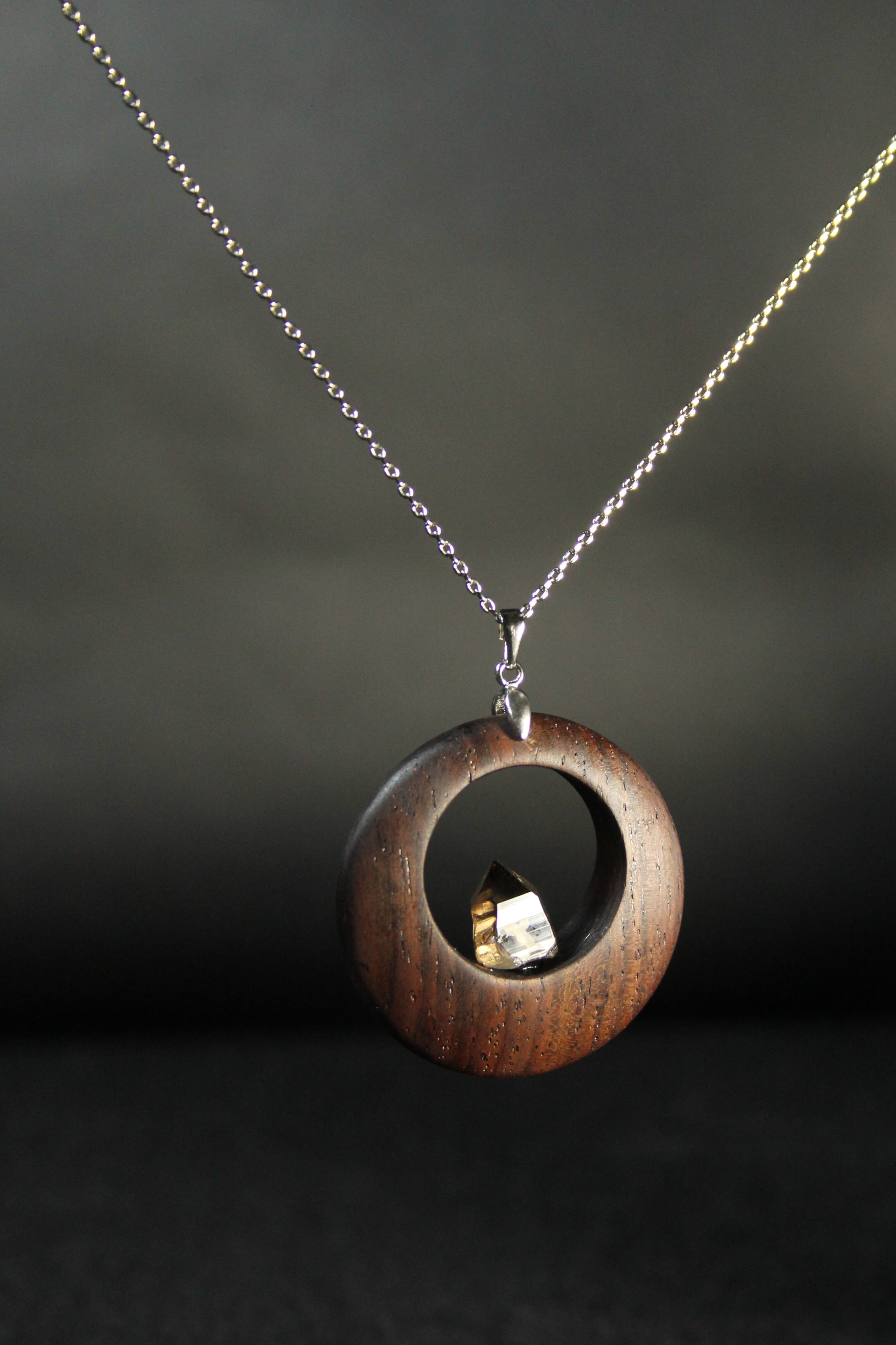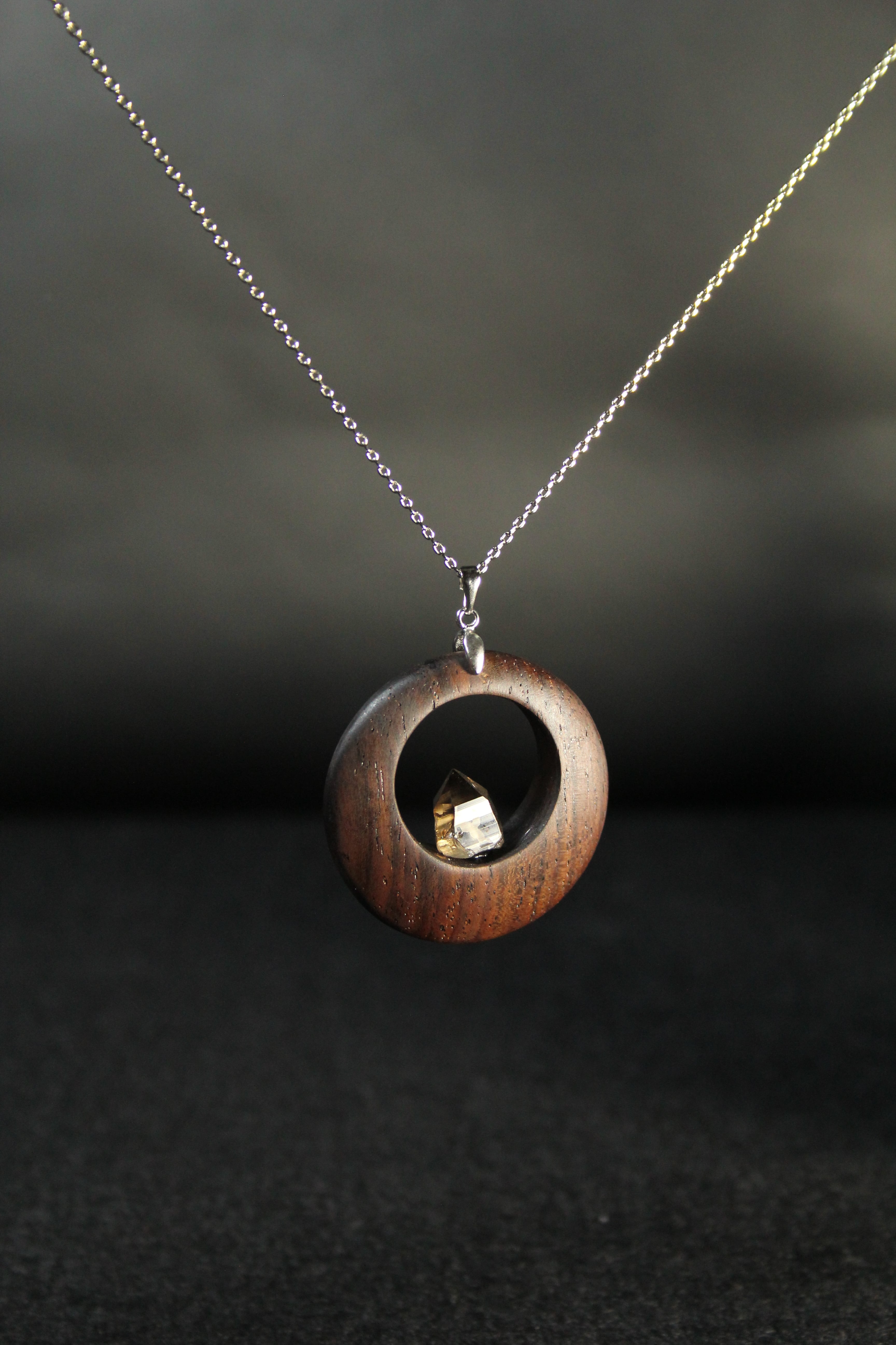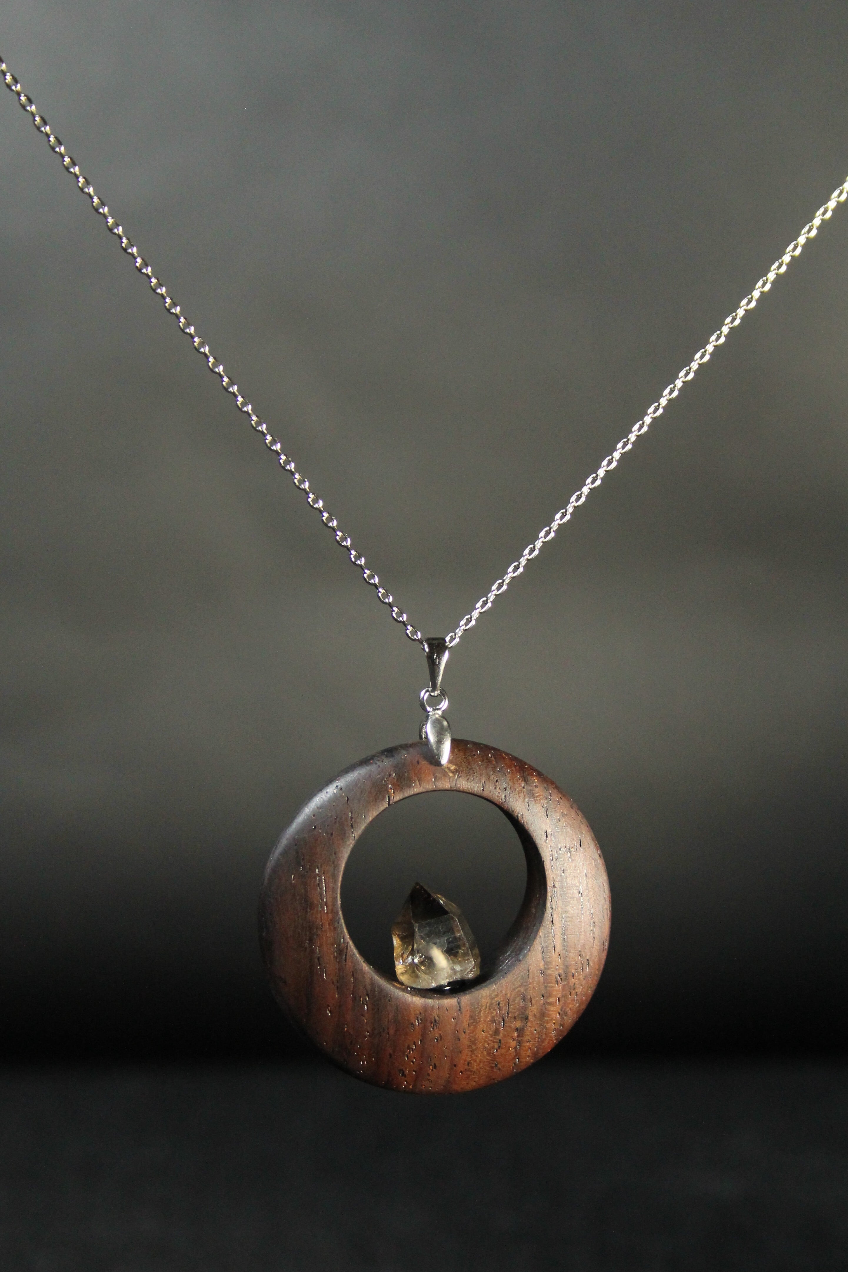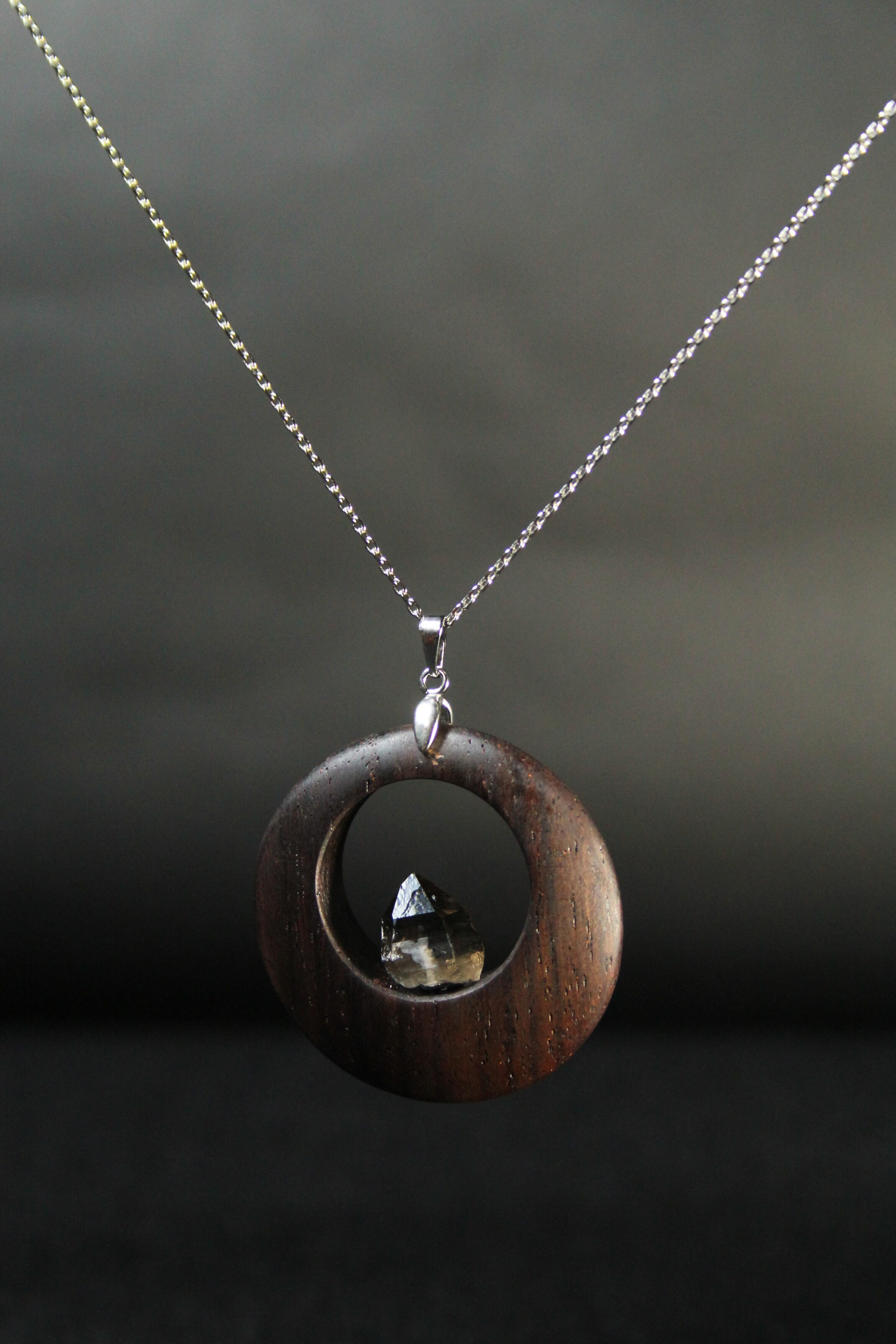 【商品説明】:煙水晶の原石と高級木材のローズウッドを使用したペンダント。ペンダントに使用している水晶は、産出した中でも、選りすぐり美しさを誇るものです。根元がグレーで頭に向けて黒い近い感じになる透明感溢れる宮崎産の煙水晶です。