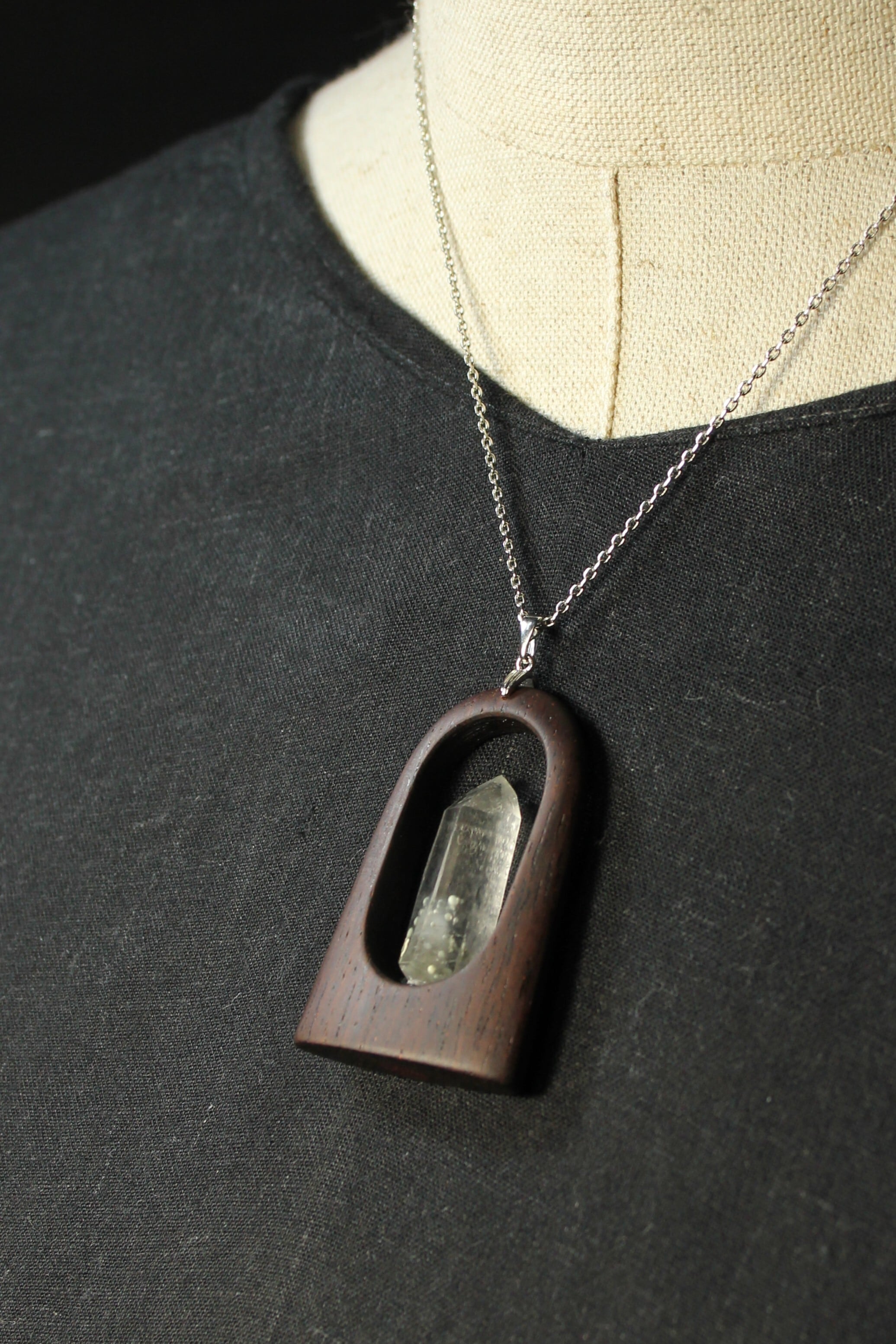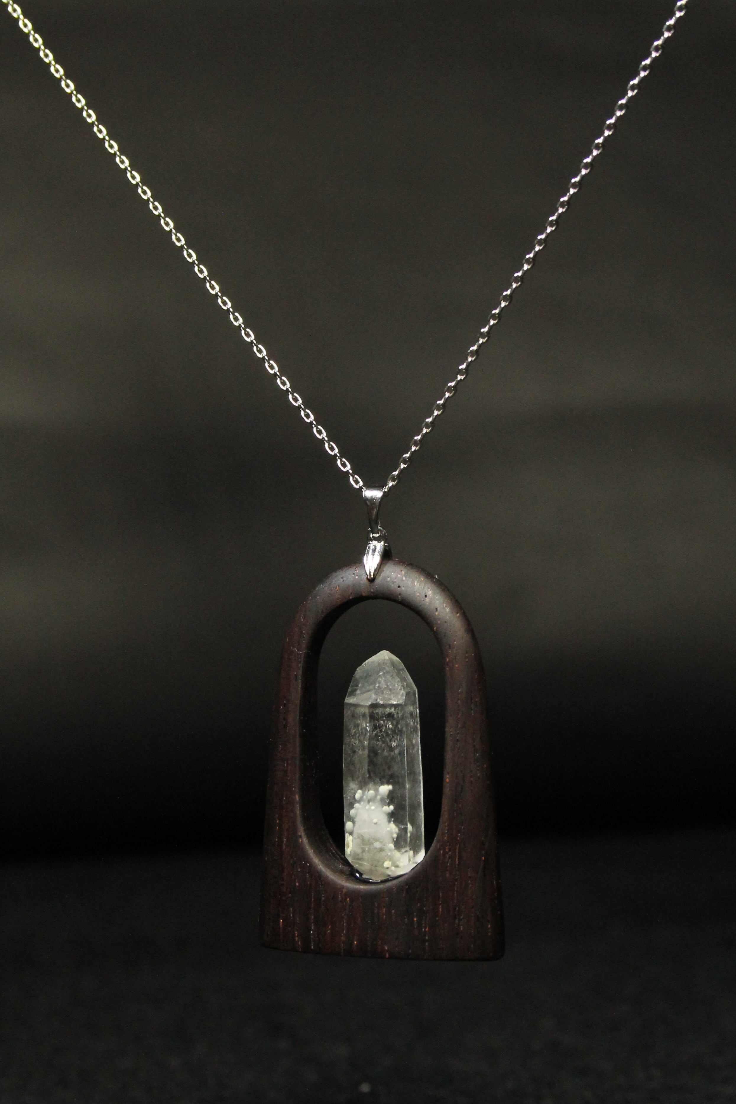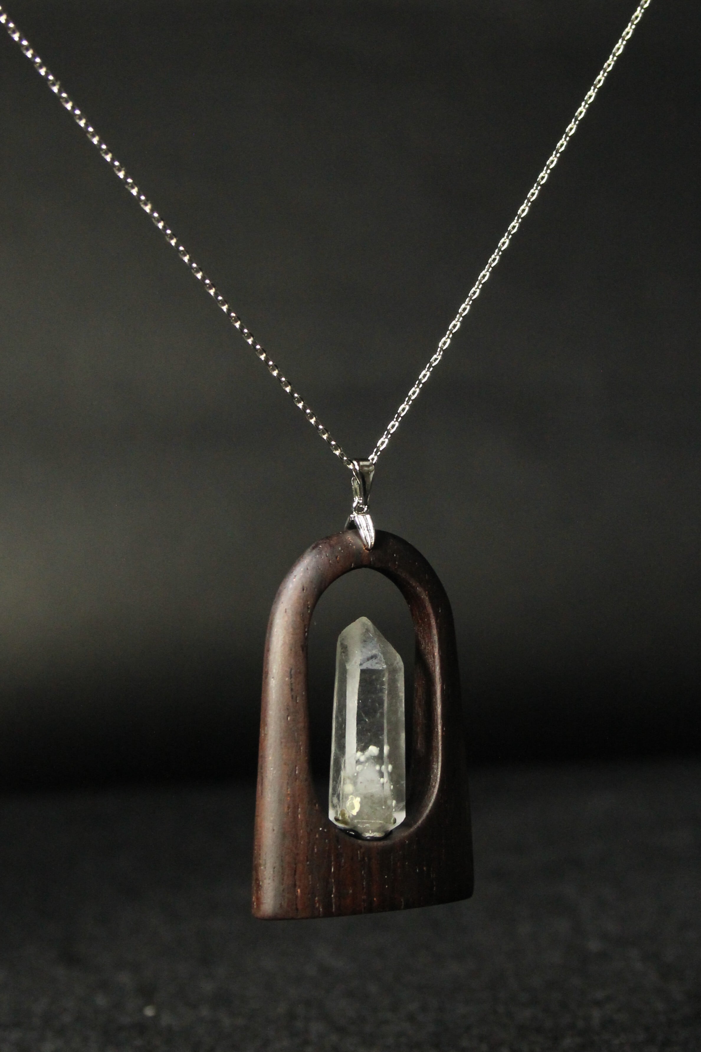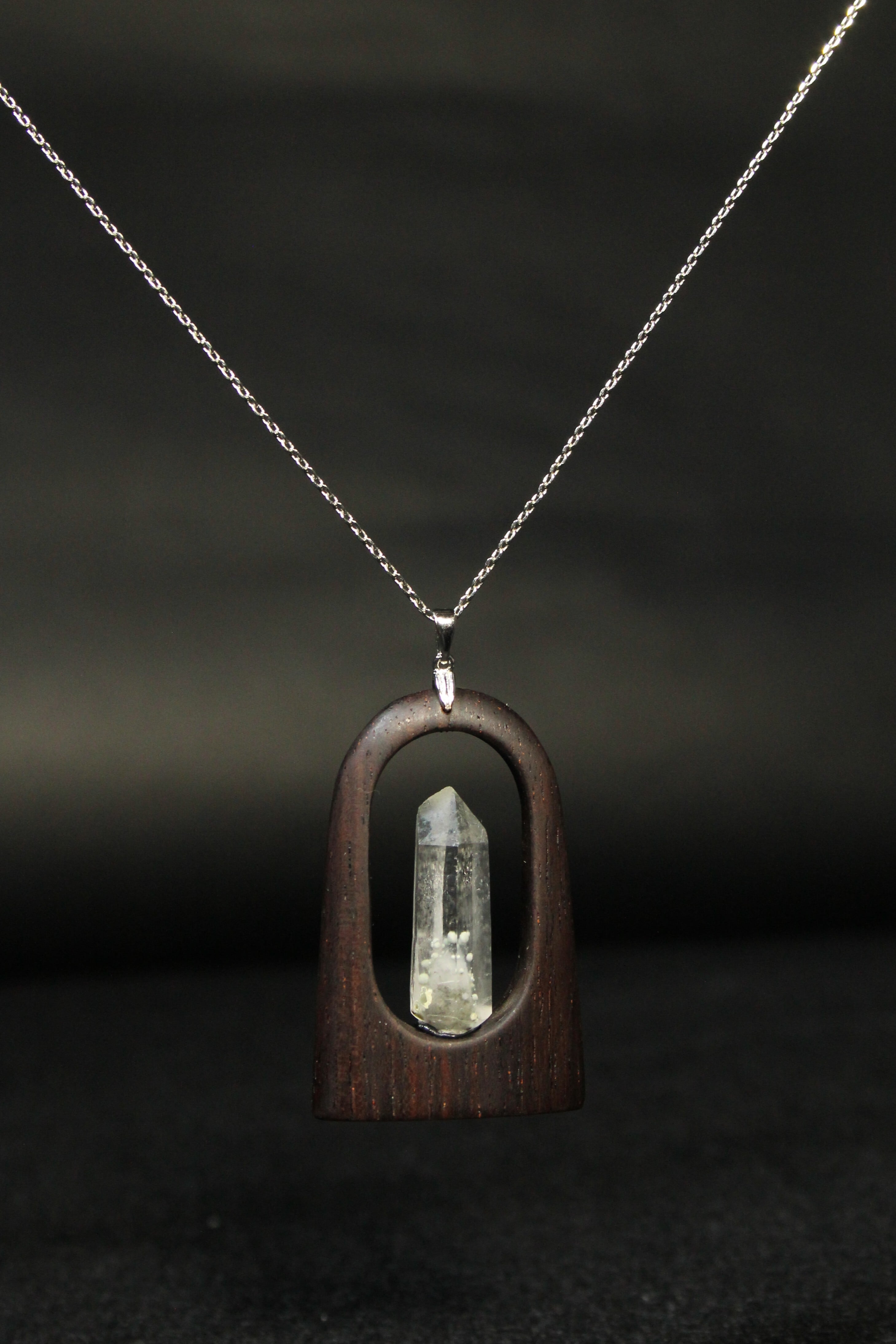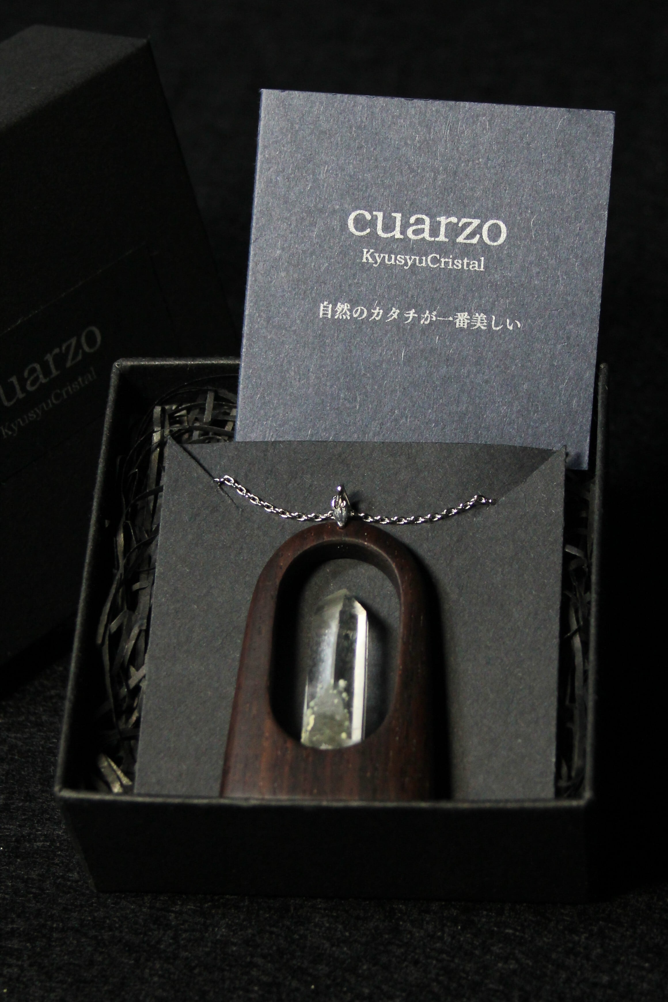 【商品説明】:水晶の原石と高級木材のローズウッドを使用したペンダント。国産水晶が好きな人なら知らない人はいないくらい有名なまりも水晶。まりもの正体は緑泥岩の仲間のクーク石で、通常は灰~灰緑色、たまに深緑~黒っぽい色がある。また最初にできた水晶が残っているファントムあるいはゴーストと言われる現象が見られることも多い。まりも水晶は、クーク石とファントムの色や形が1つ1つ個性があって同じものが無い。その中でもこのまりも水晶は、透明度が高く、淡いファントムの周りを多くのまりもが浮遊するように見れる水晶です
