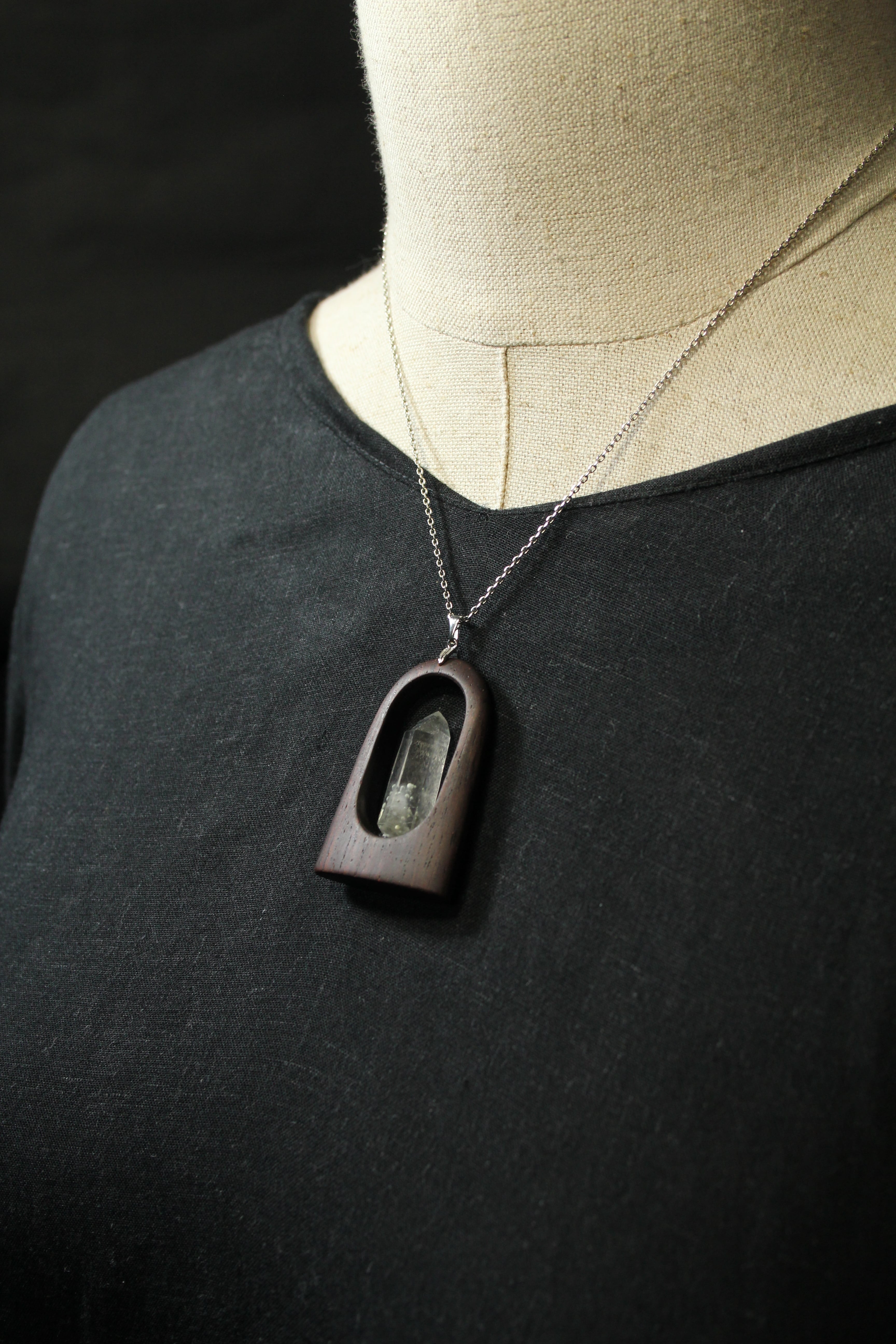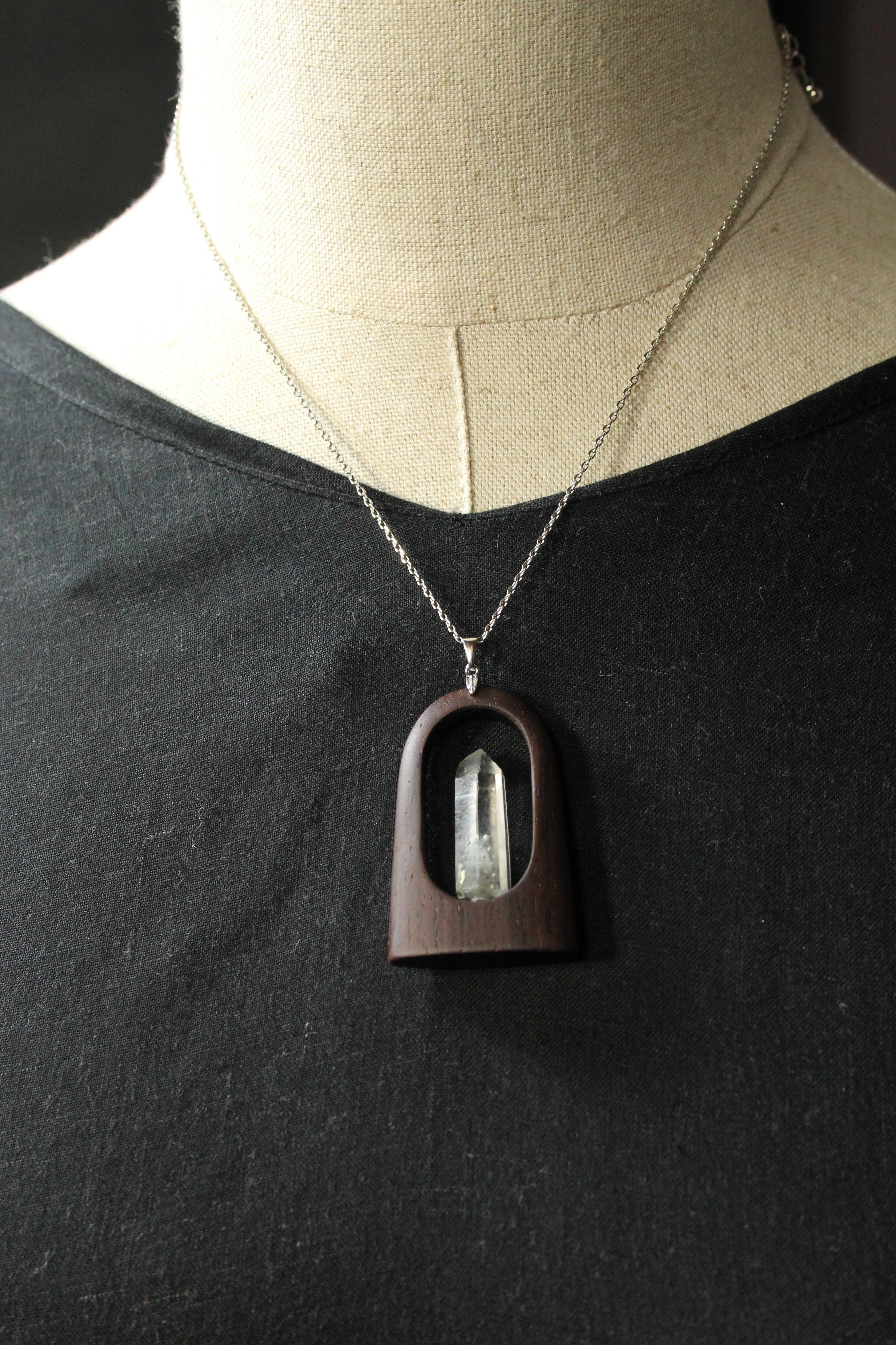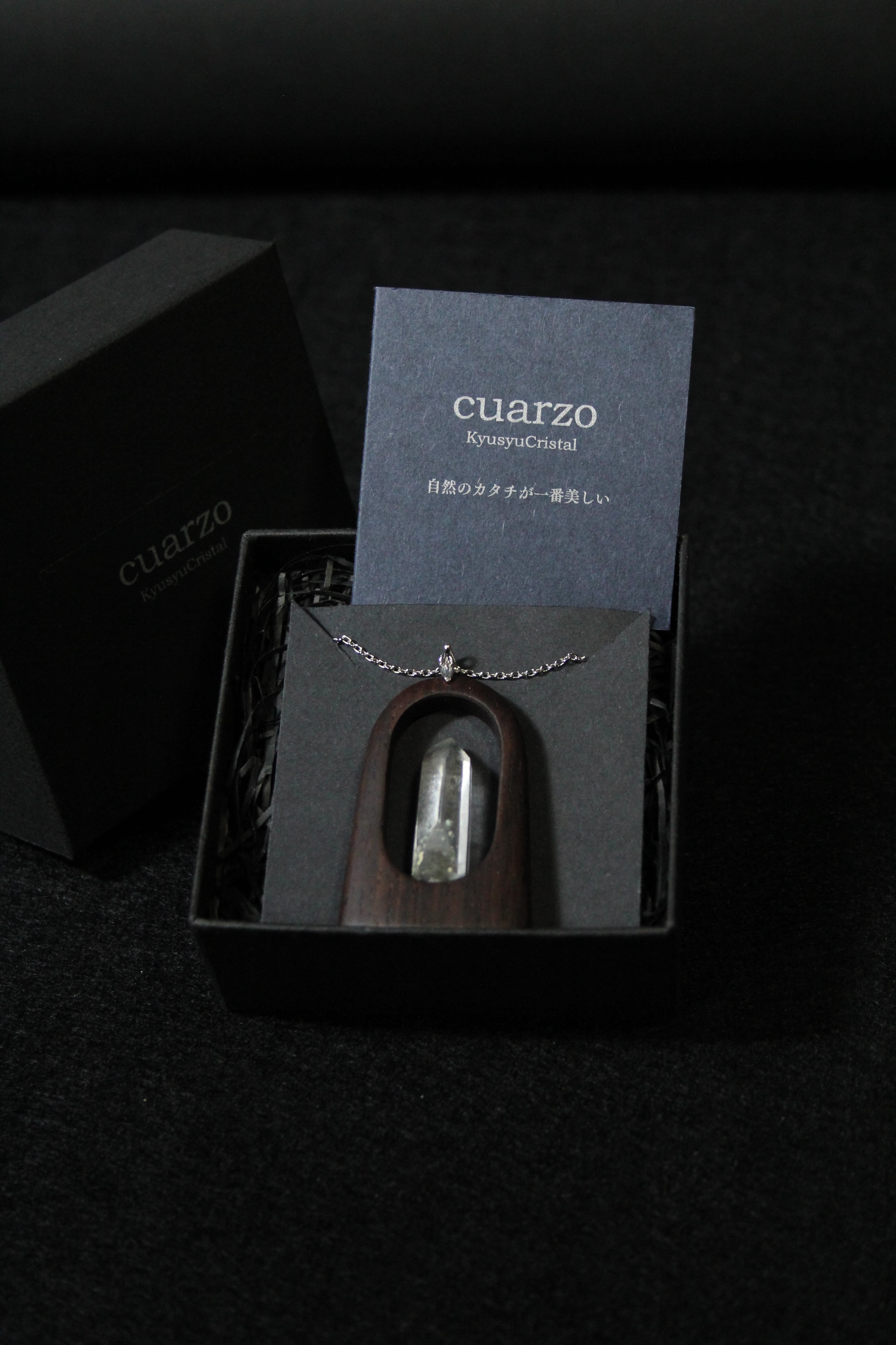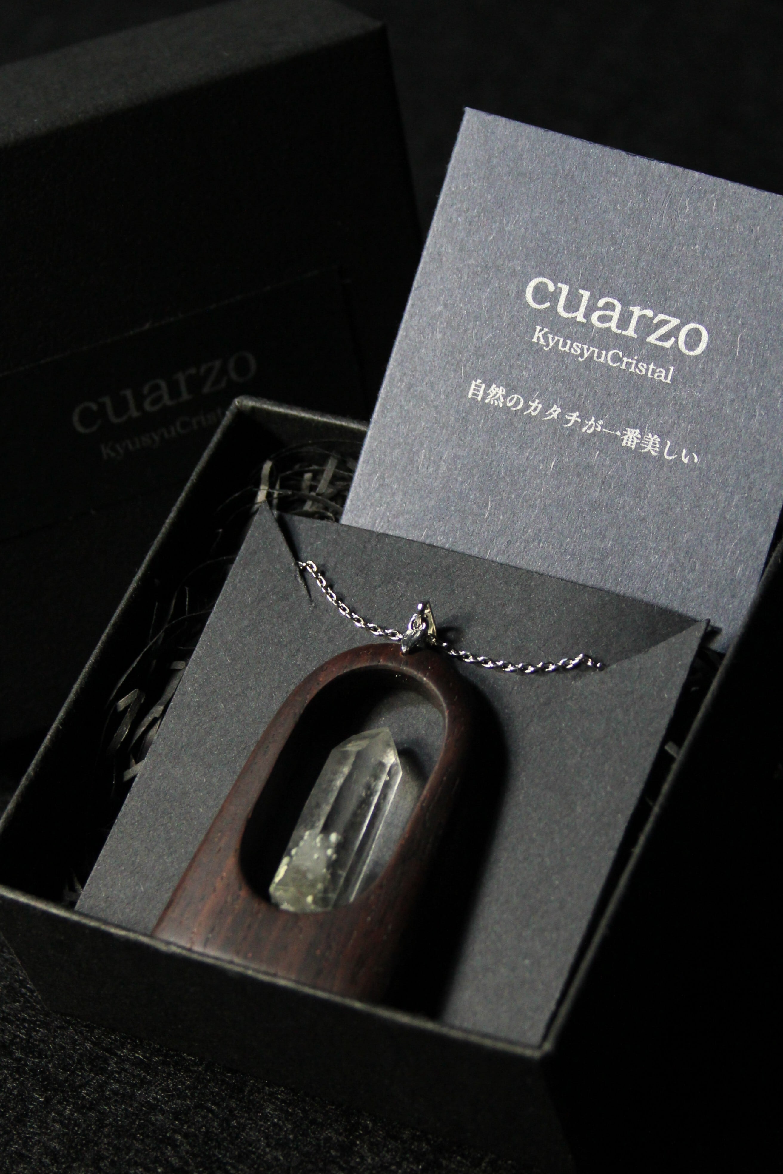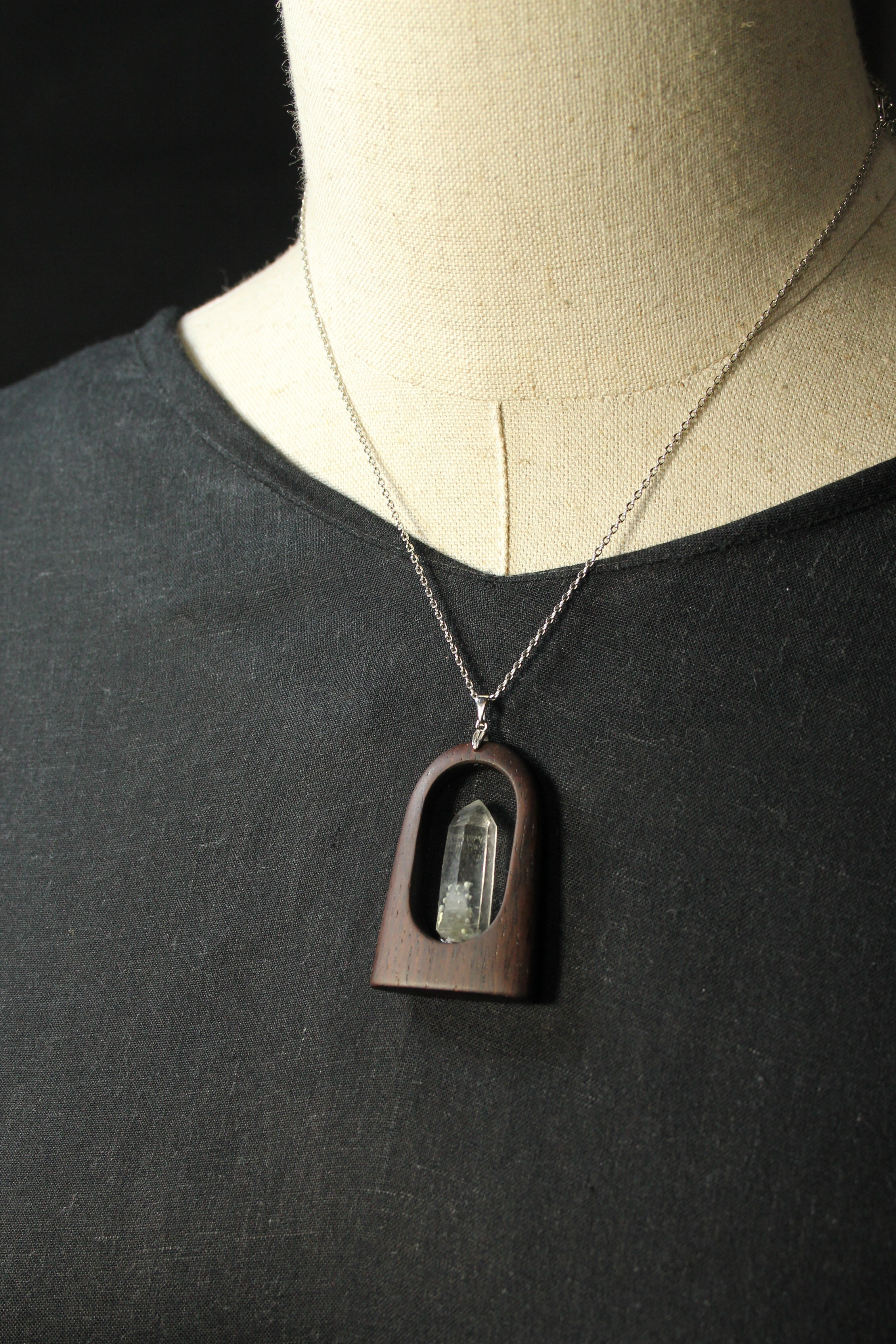 【商品説明】:水晶の原石と高級木材のローズウッドを使用したペンダント。国産水晶が好きな人なら知らない人はいないくらい有名なまりも水晶。まりもの正体は緑泥岩の仲間のクーク石で、通常は灰~灰緑色、たまに深緑~黒っぽい色がある。また最初にできた水晶が残っているファントムあるいはゴーストと言われる現象が見られることも多い。まりも水晶は、クーク石とファントムの色や形が1つ1つ個性があって同じものが無い。その中でもこのまりも水晶は、透明度が高く、淡いファントムの周りを多くのまりもが浮遊するように見れる水晶です