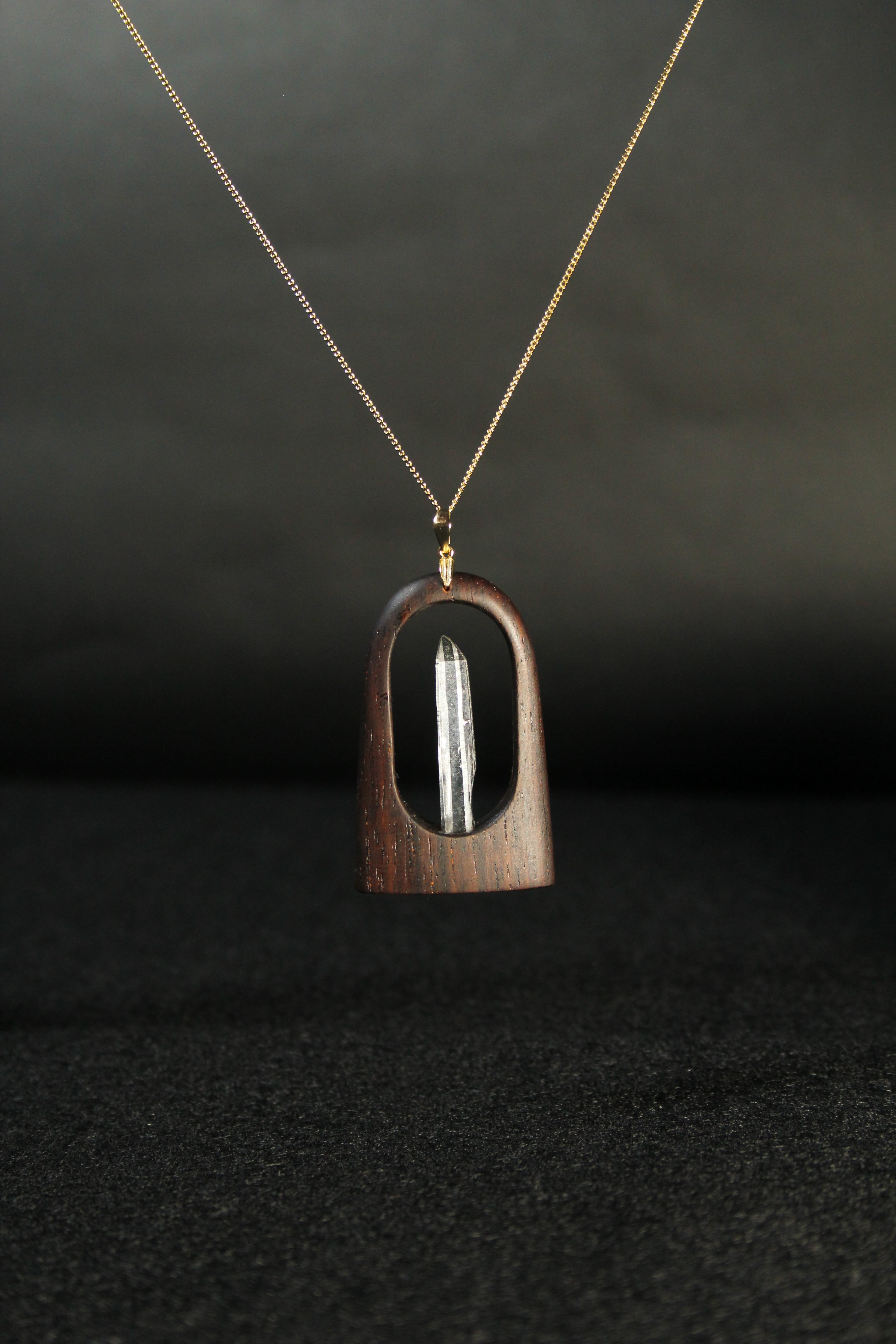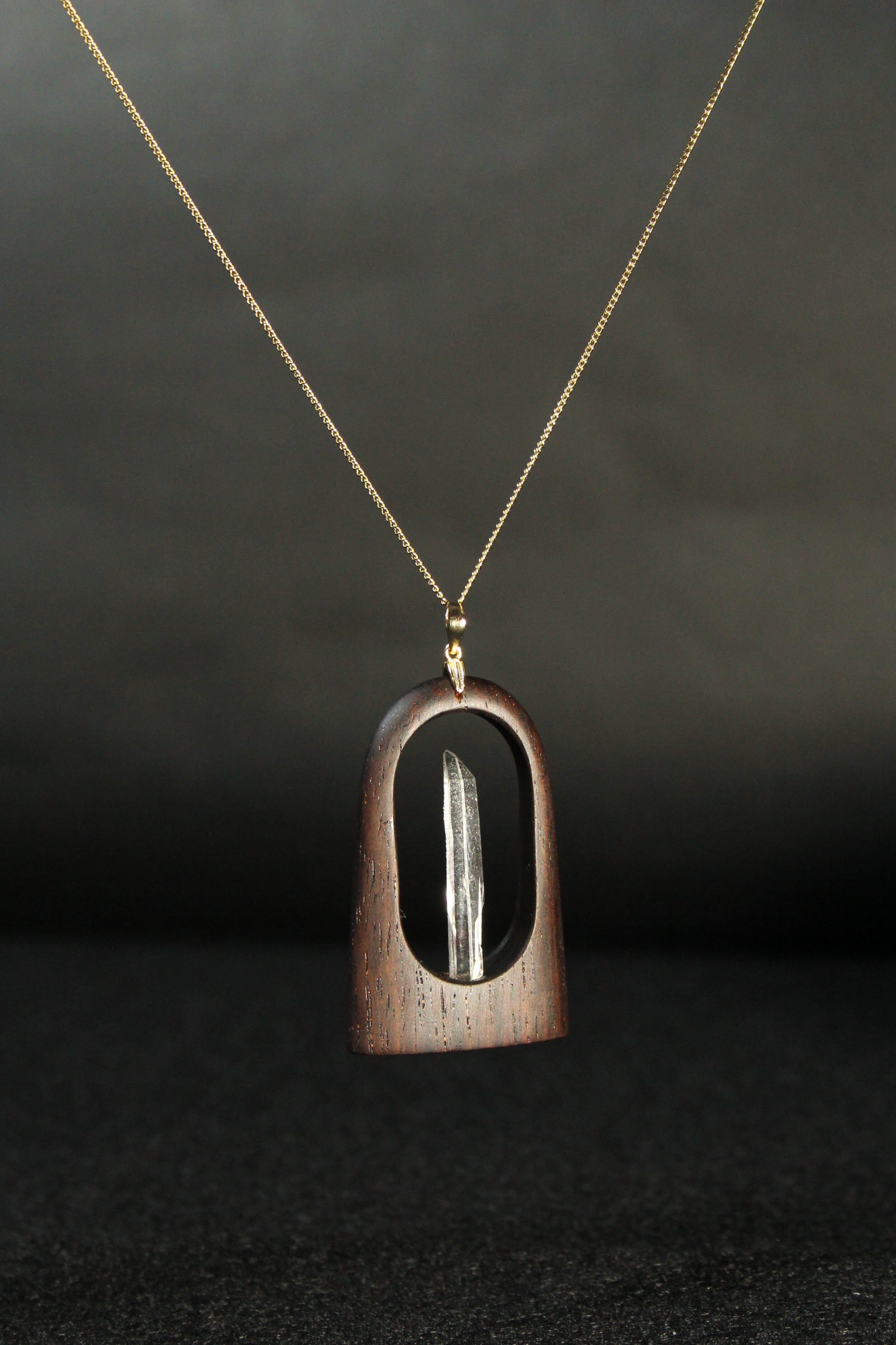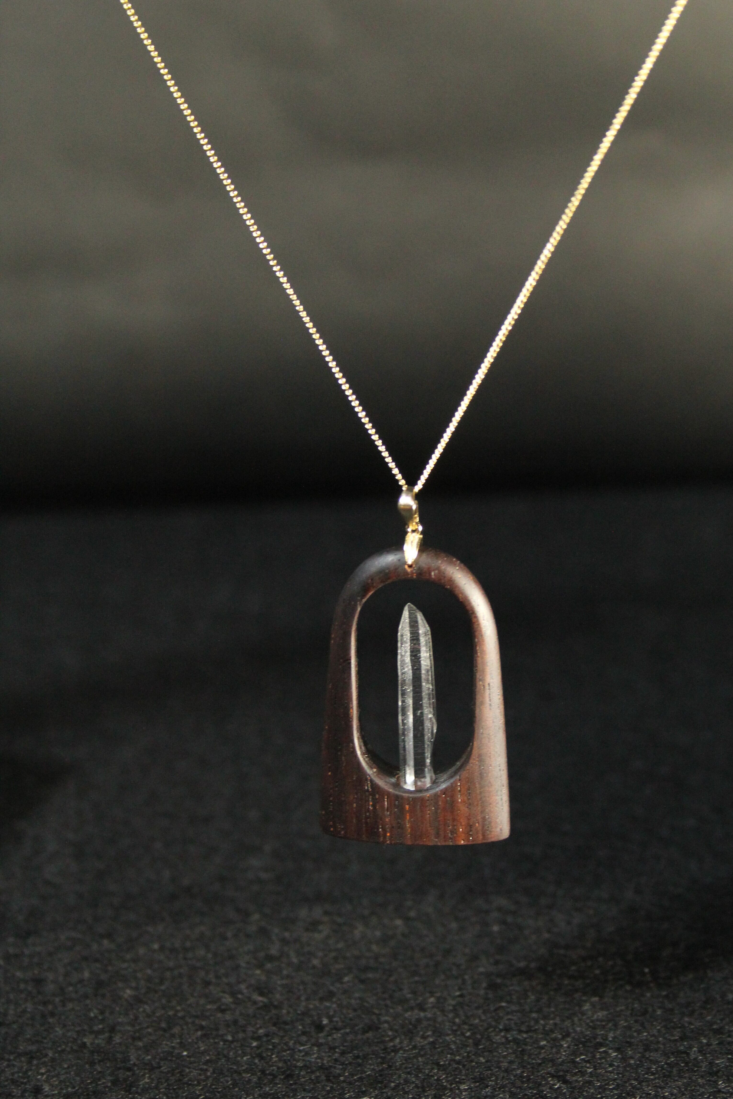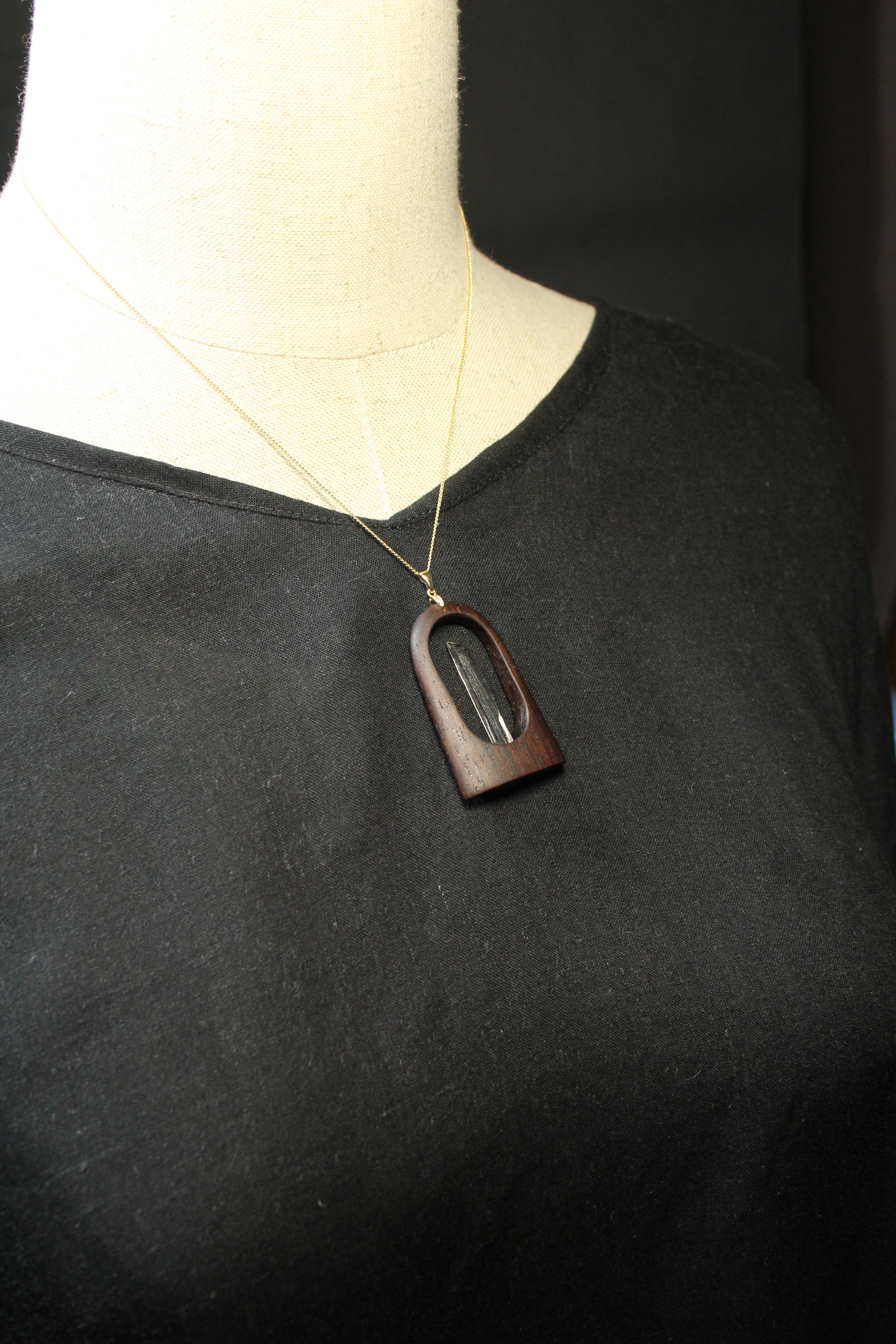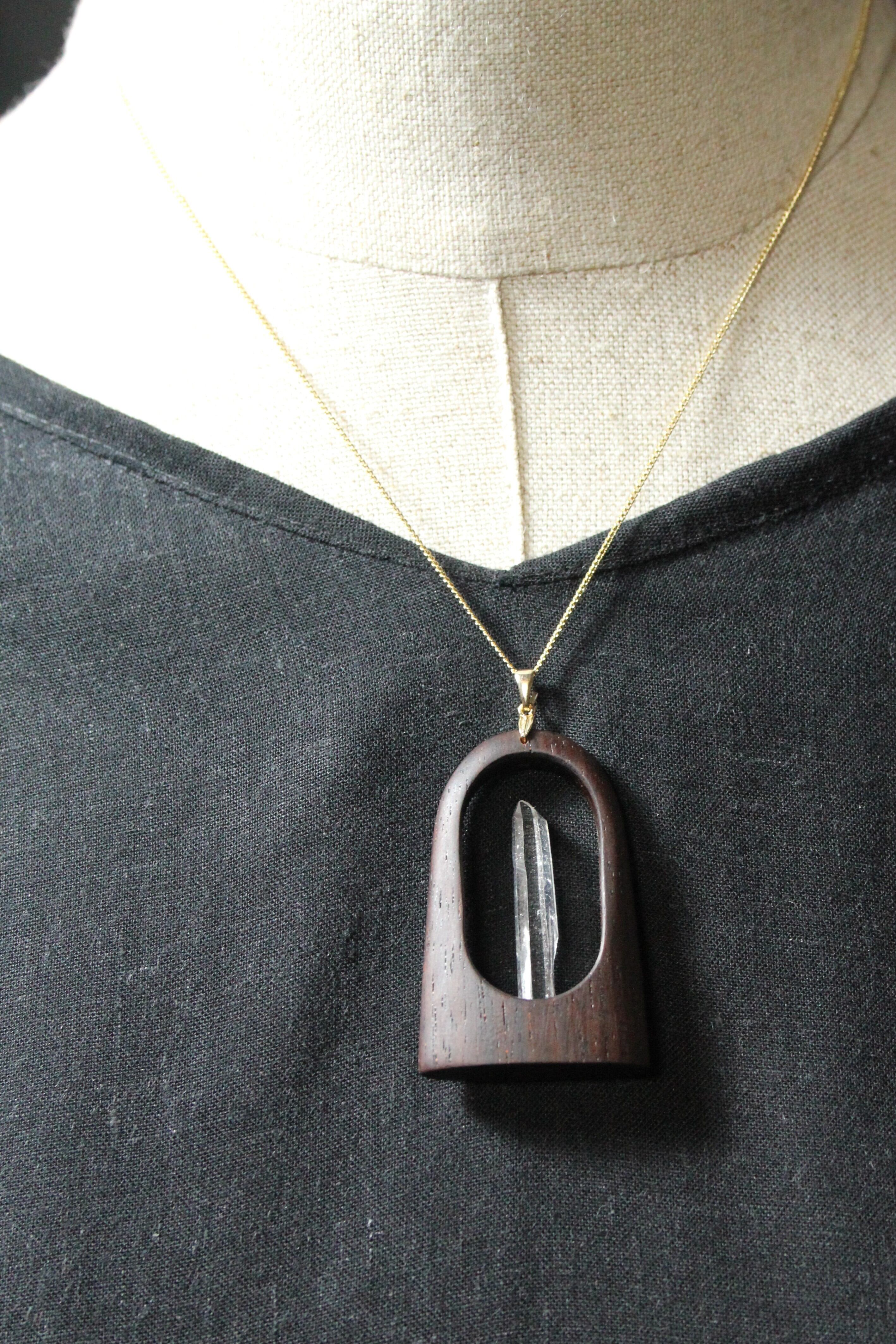 【商品説明】:水晶の原石と高級木材のローズウッドを使用したペンダント。コロンビアレムリアンを彷彿させるような透明度が高い宮崎産水晶。ギューンと伸びたポイント水晶に根元にチョイある山傷がカッコイイです