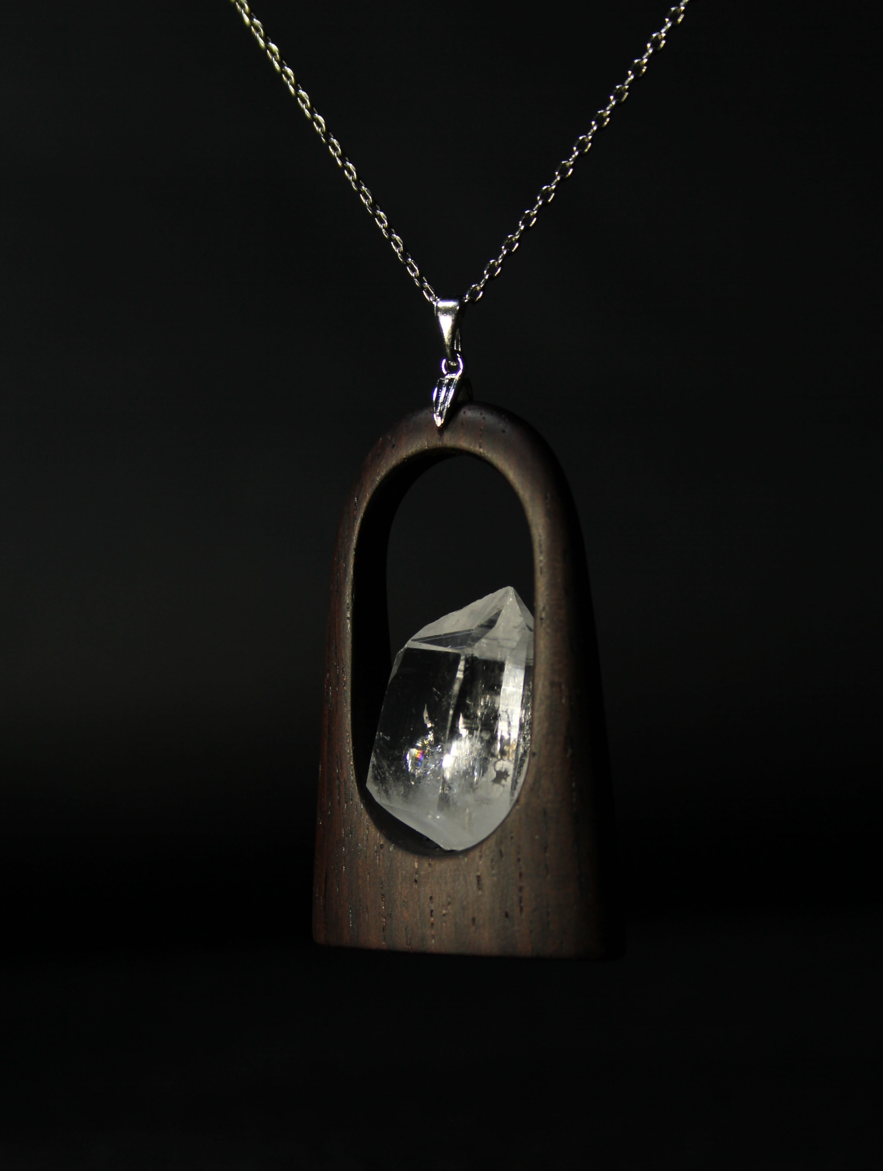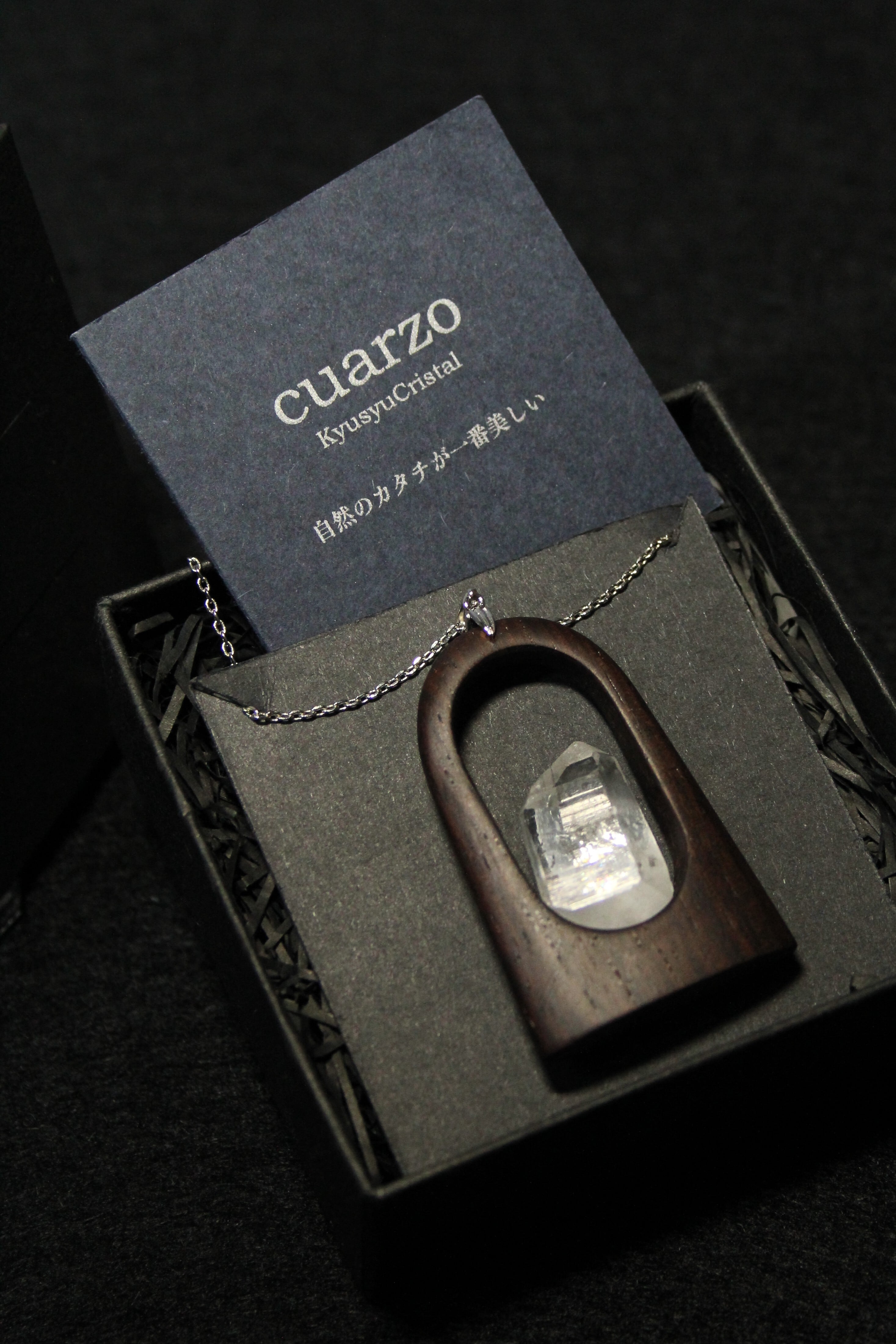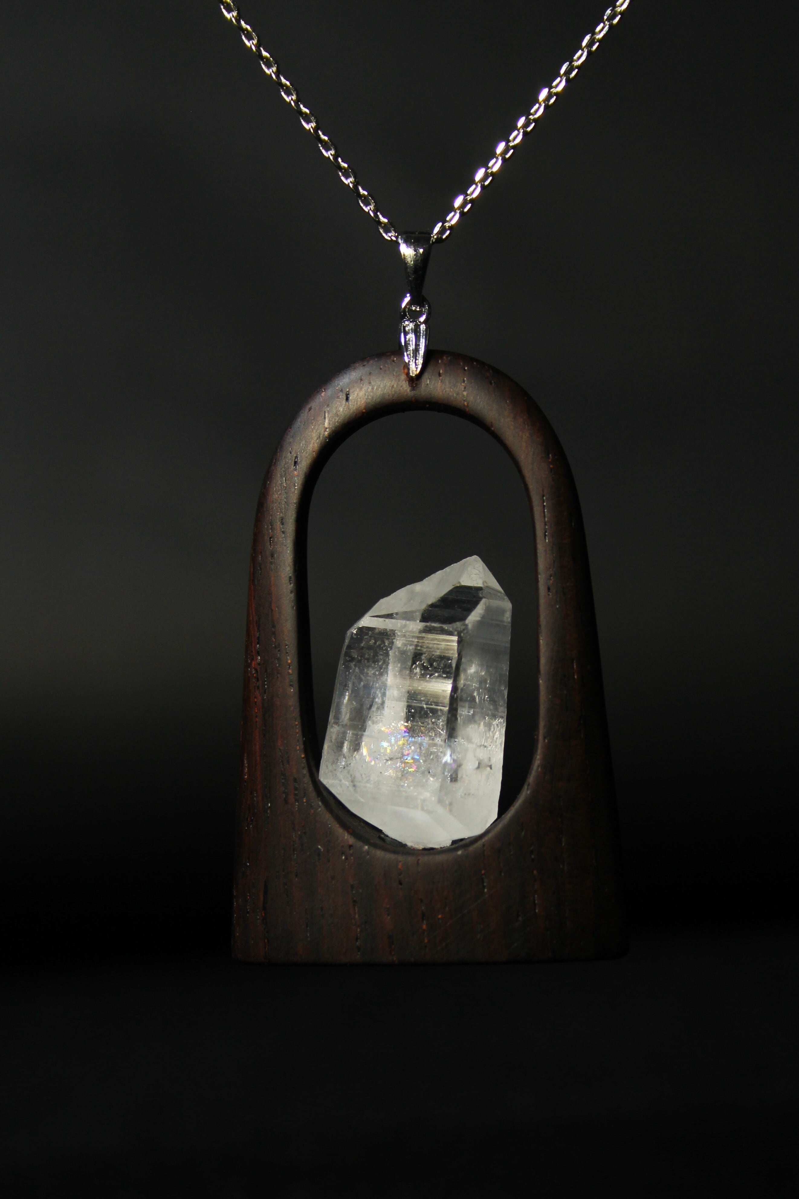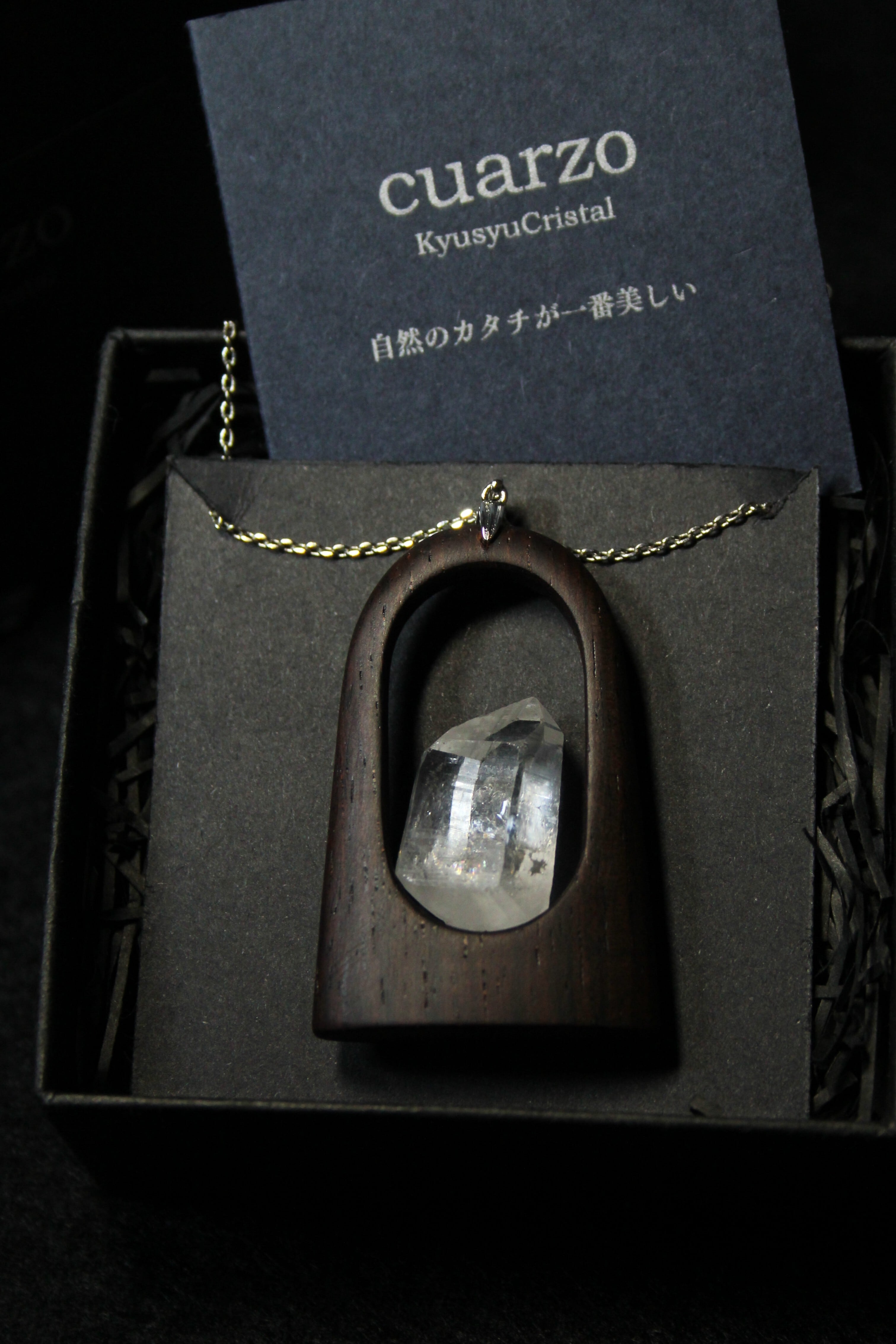 【商品説明】:水晶の原石と高級木材のローズウッドを使用したペンダント。宮崎クリスタルの中でも、抜群のテリと透明感を誇る日之影町産の水晶。ペンダントに使用している水晶は、産出した中でも、選りすぐり美しさを誇るものです。その中でもこの水晶は、透明度が高い上、虹入りです。