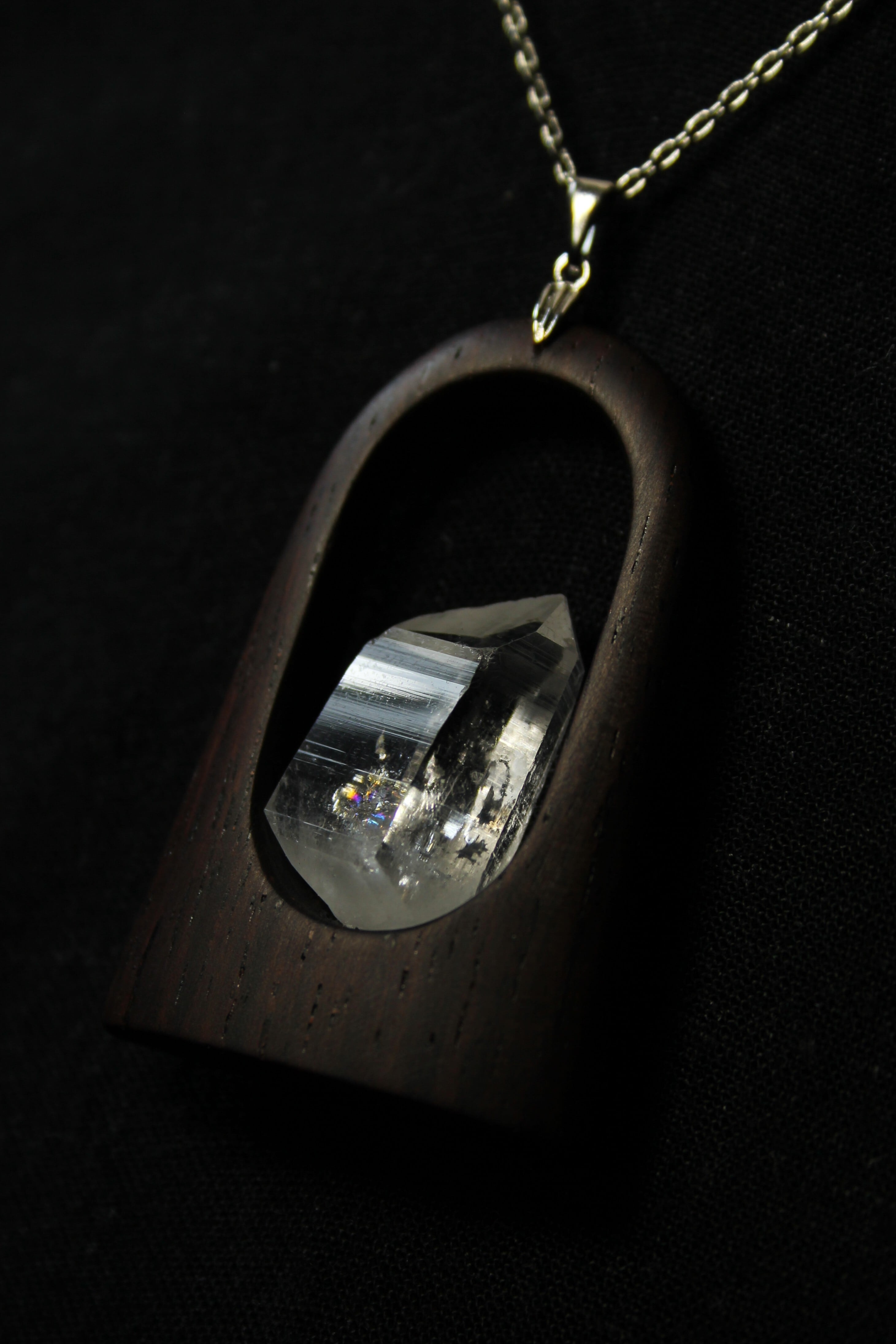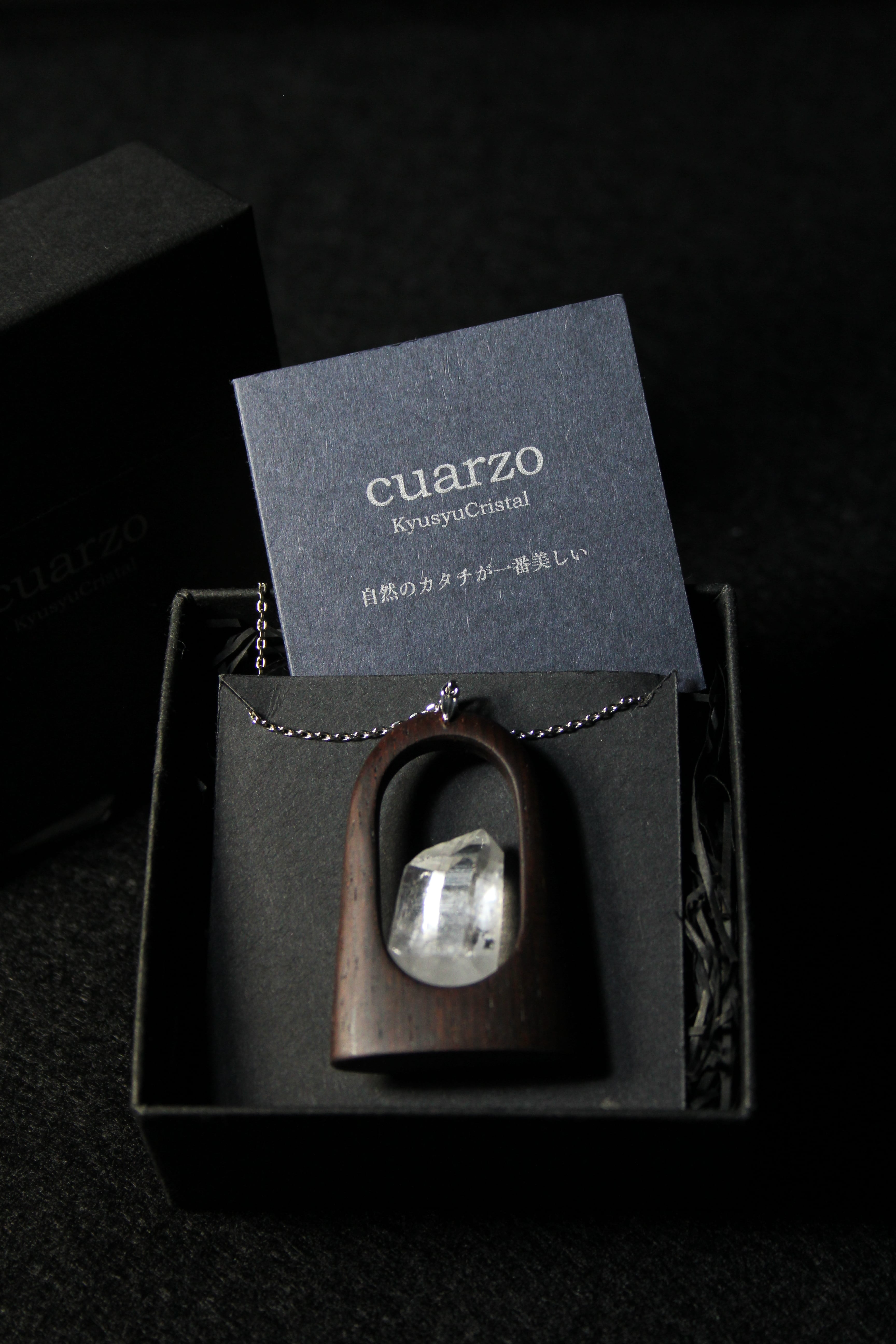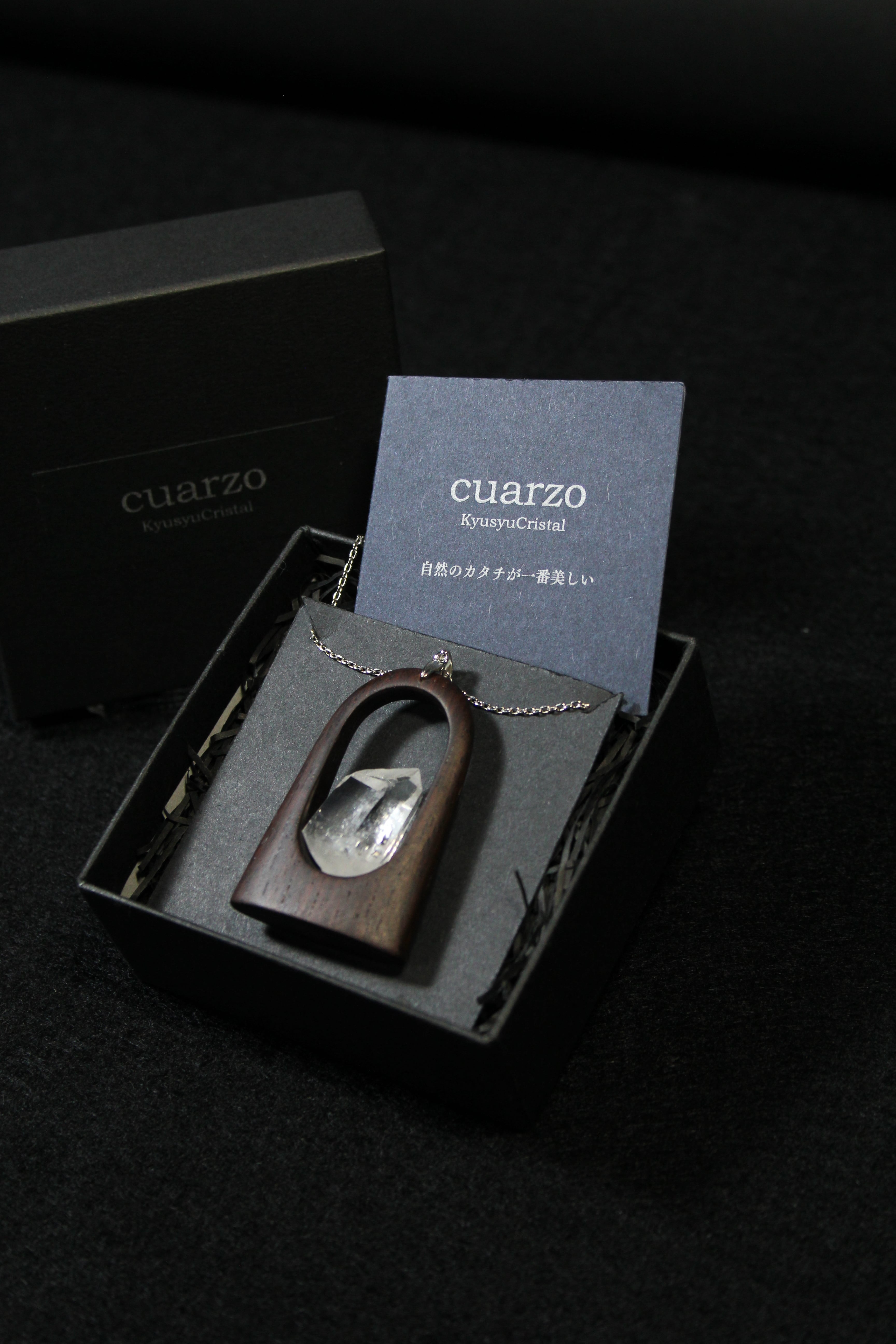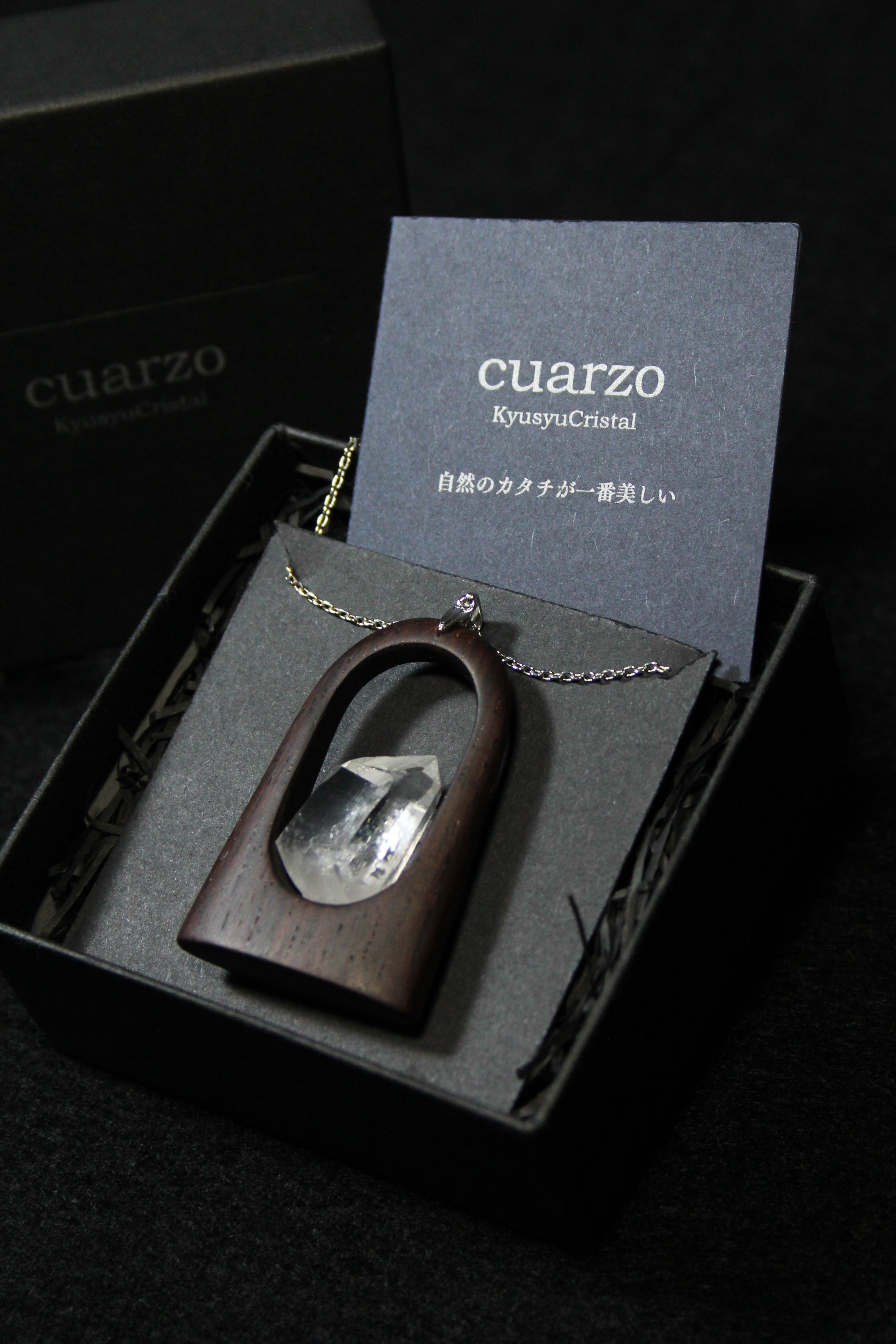 【商品説明】:水晶の原石と高級木材のローズウッドを使用したペンダント。宮崎クリスタルの中でも、抜群のテリと透明感を誇る日之影町産の水晶。ペンダントに使用している水晶は、産出した中でも、選りすぐり美しさを誇るものです。その中でもこの水晶は、透明度が高い上、虹入りです。