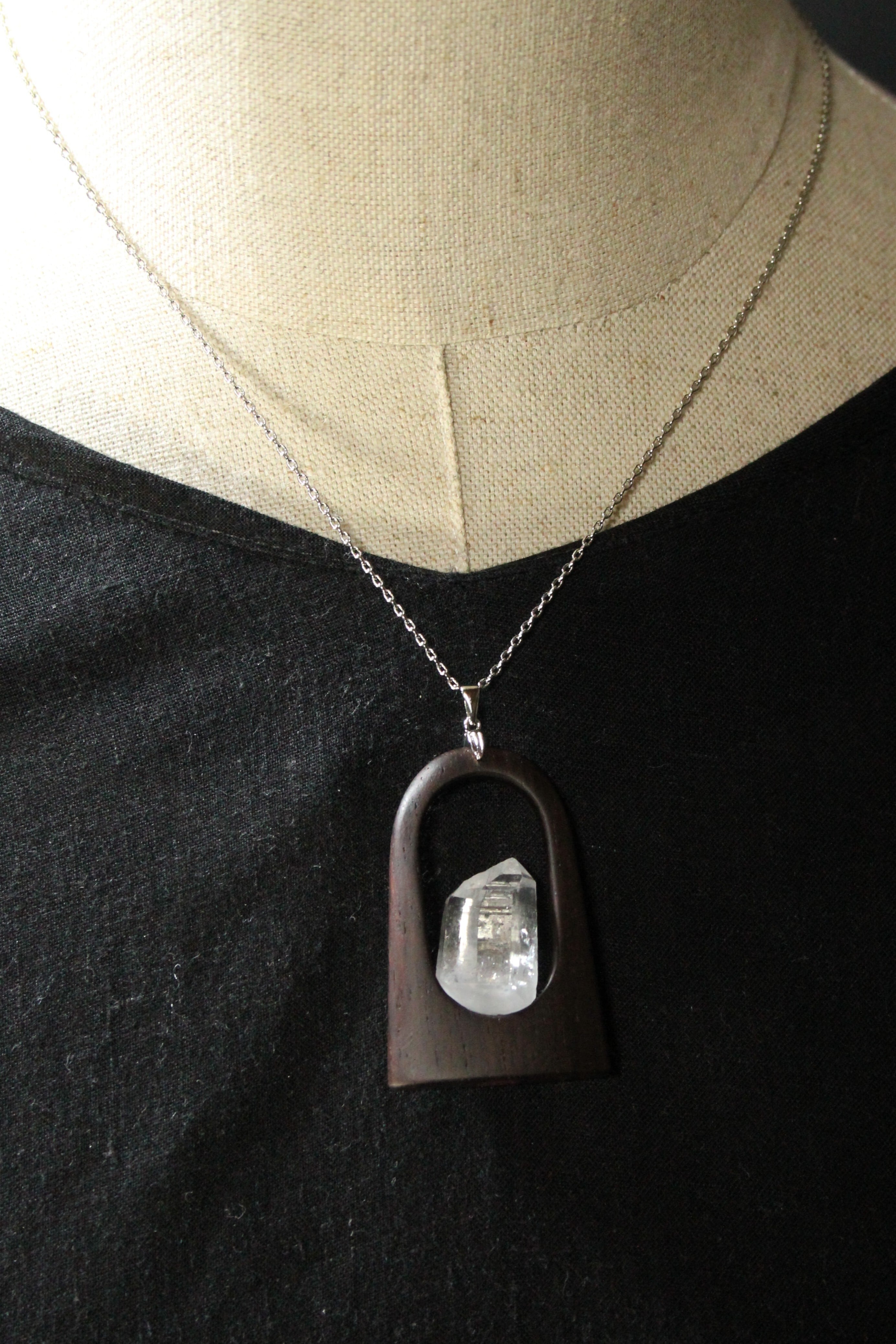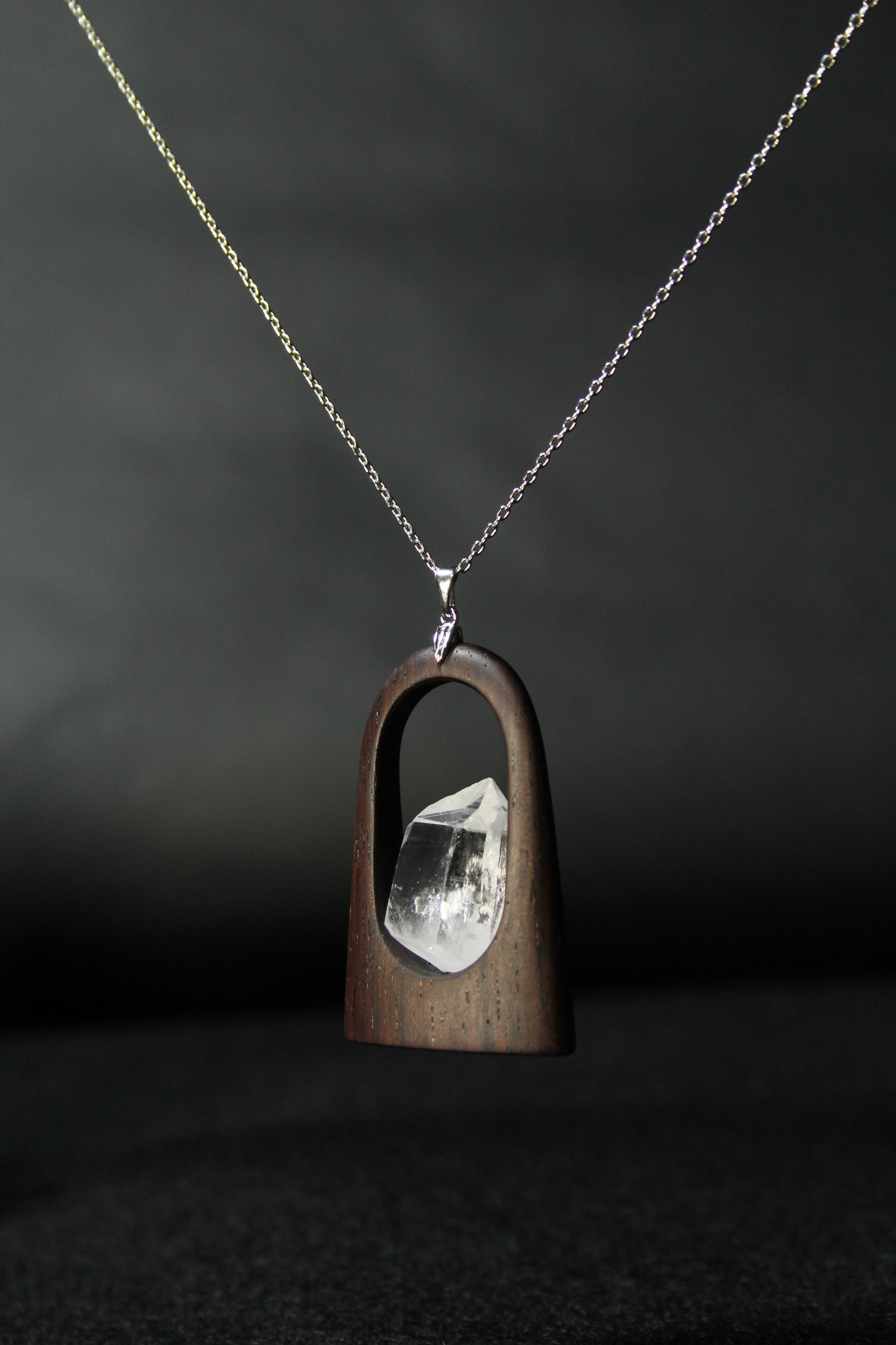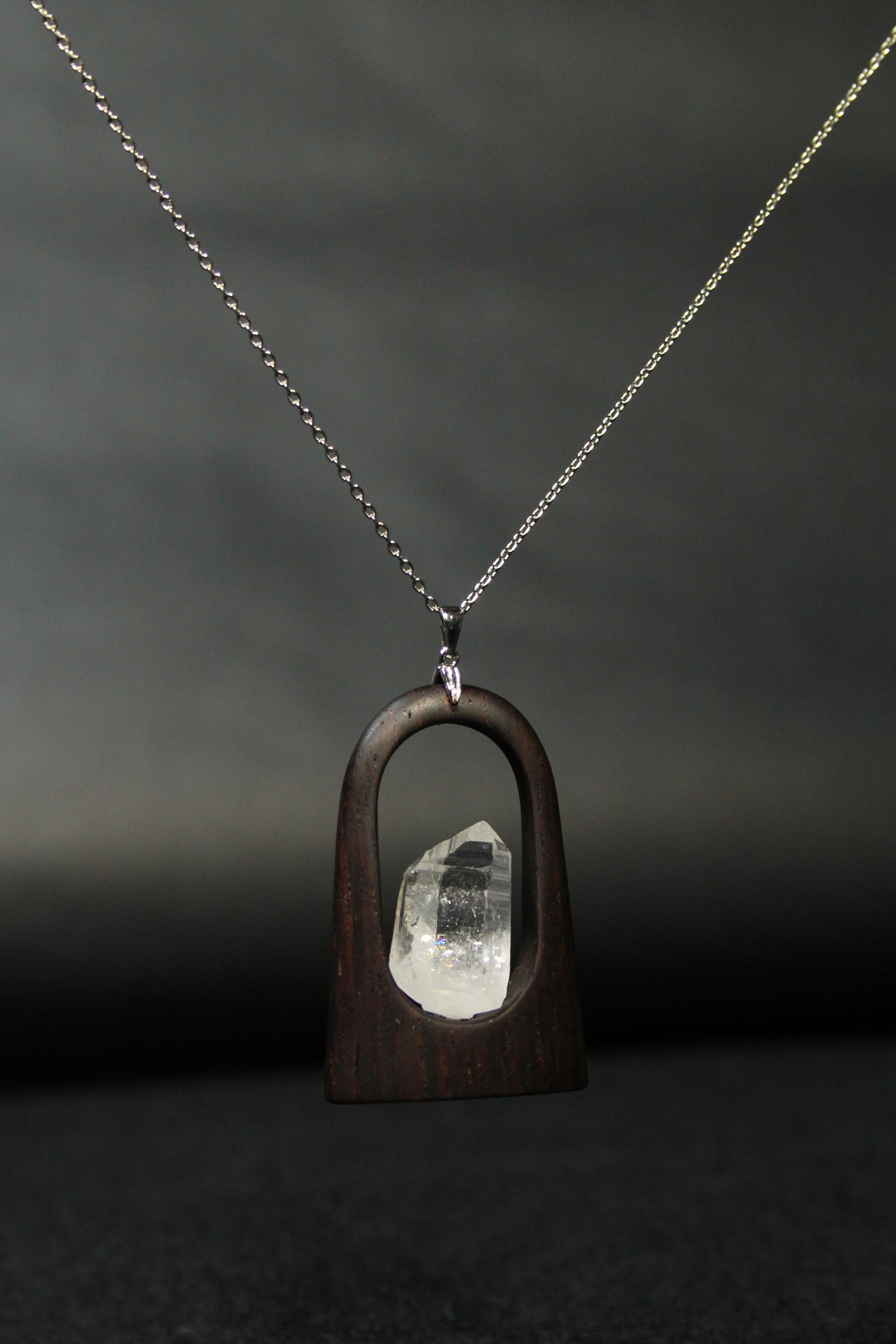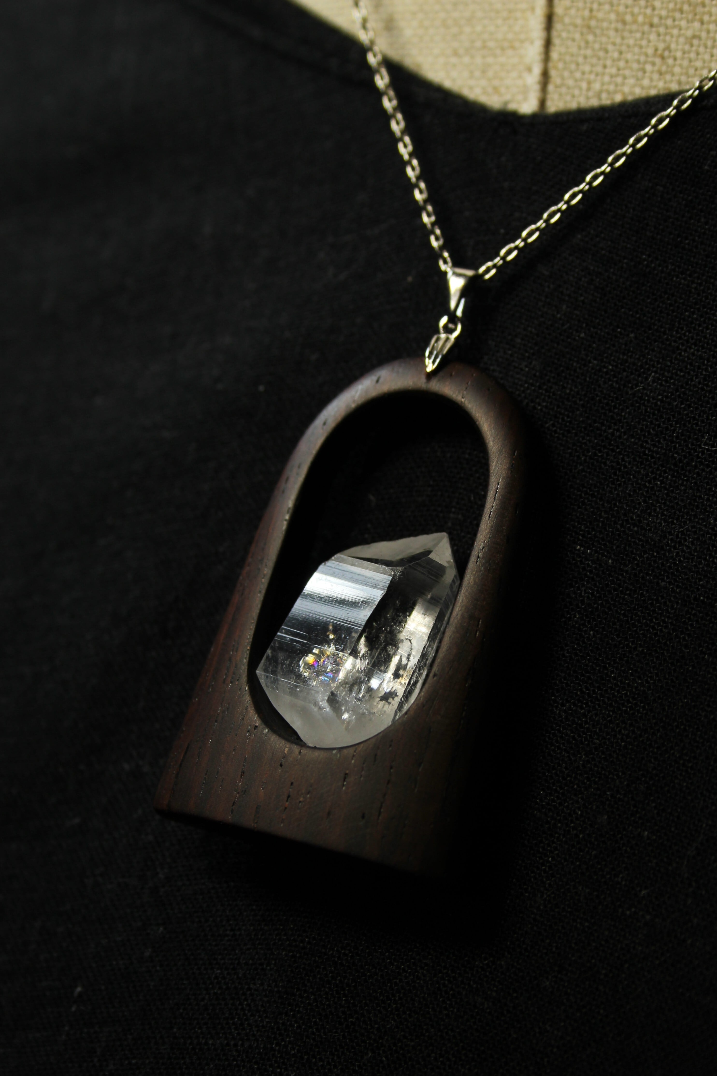 【商品説明】:水晶の原石と高級木材のローズウッドを使用したペンダント。宮崎クリスタルの中でも、抜群のテリと透明感を誇る日之影町産の水晶。ペンダントに使用している水晶は、産出した中でも、選りすぐり美しさを誇るものです。その中でもこの水晶は、透明度が高い上、虹入りです。