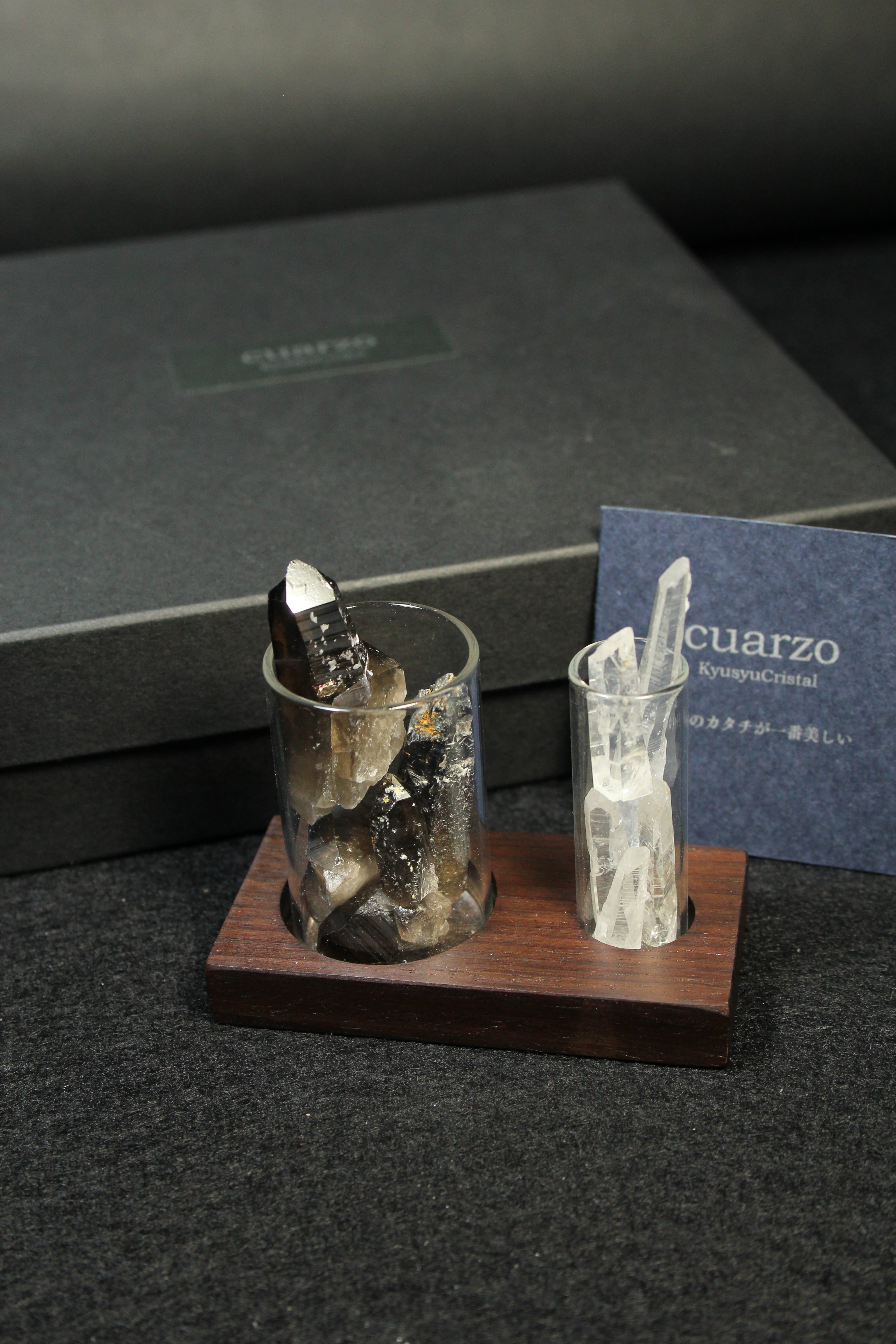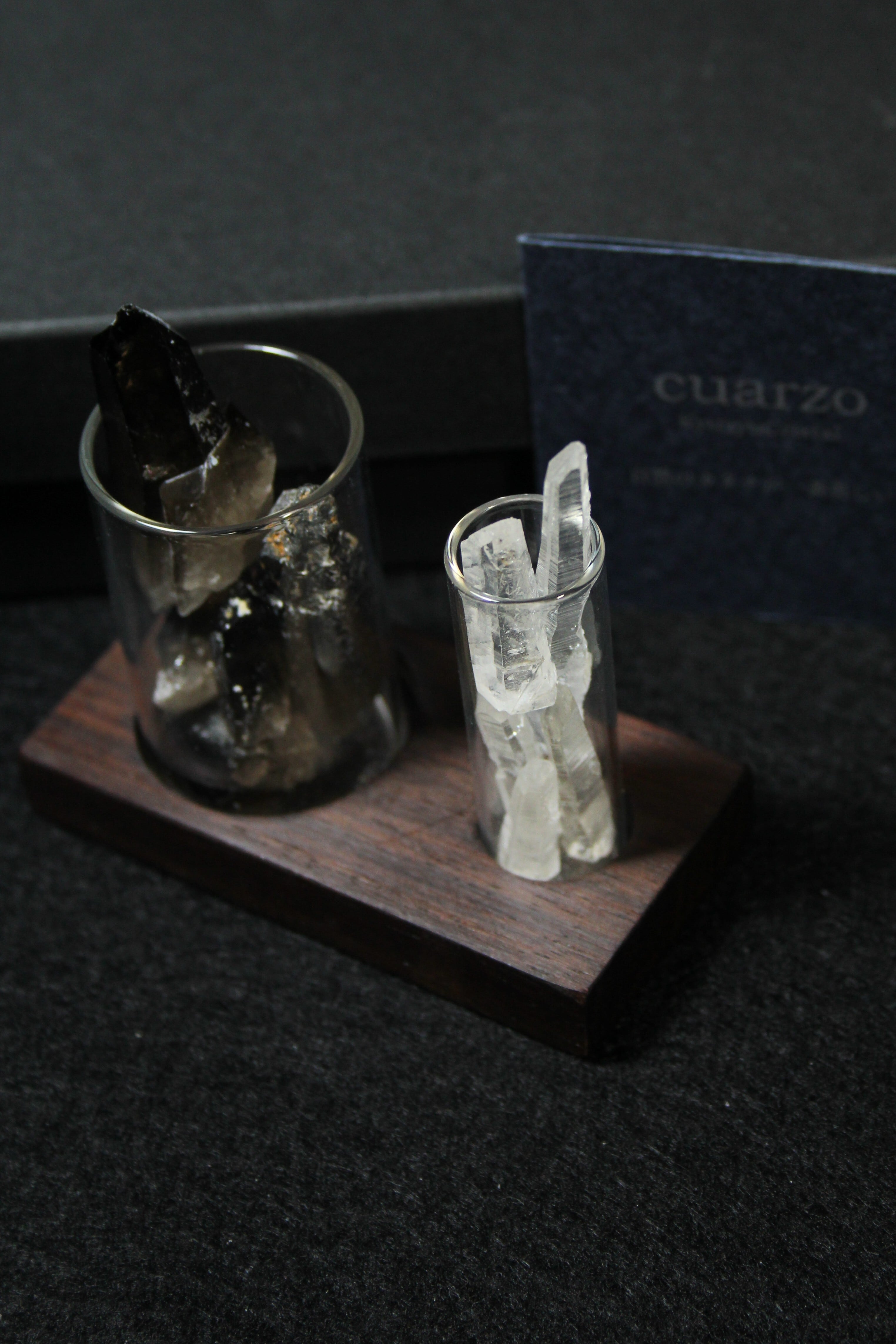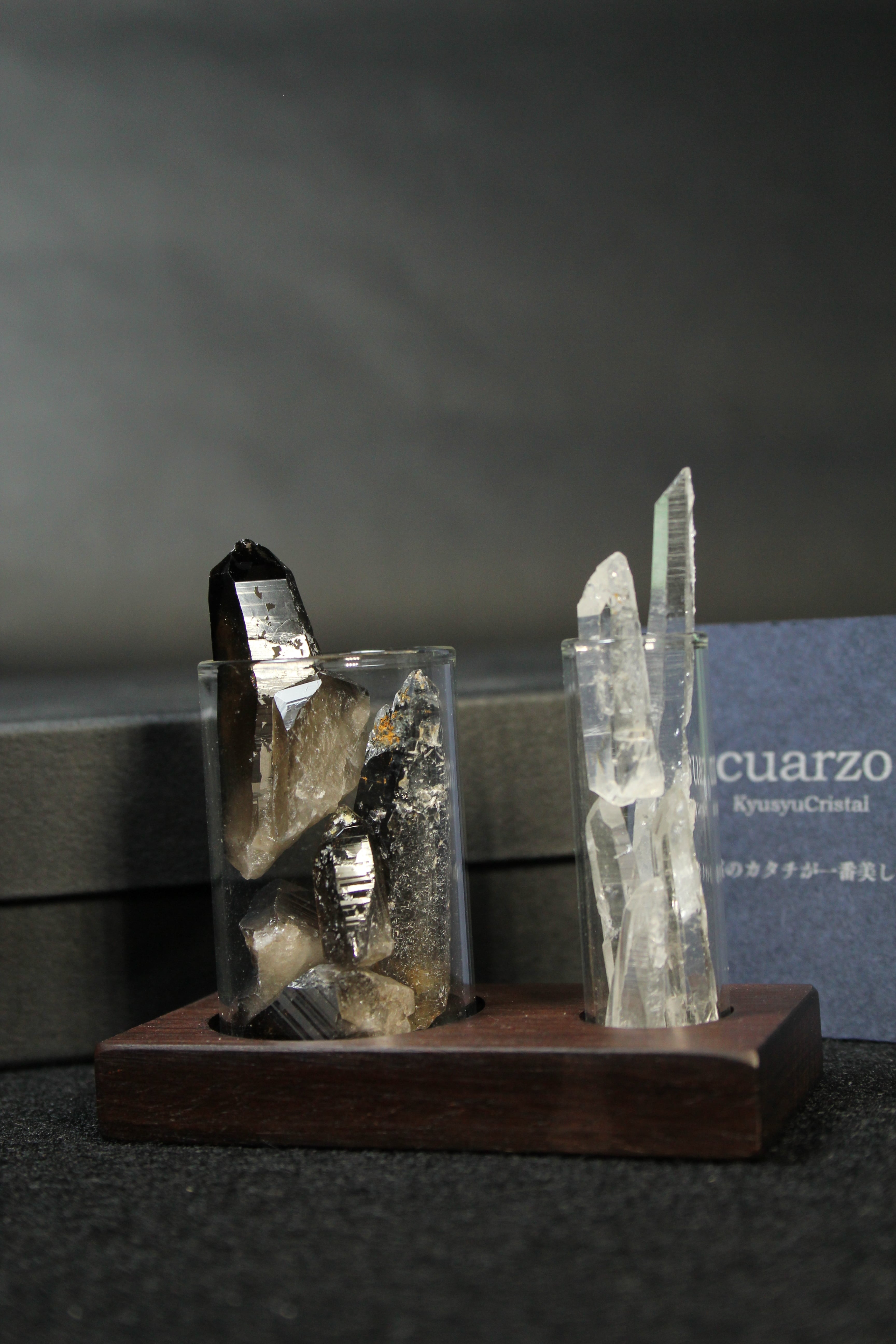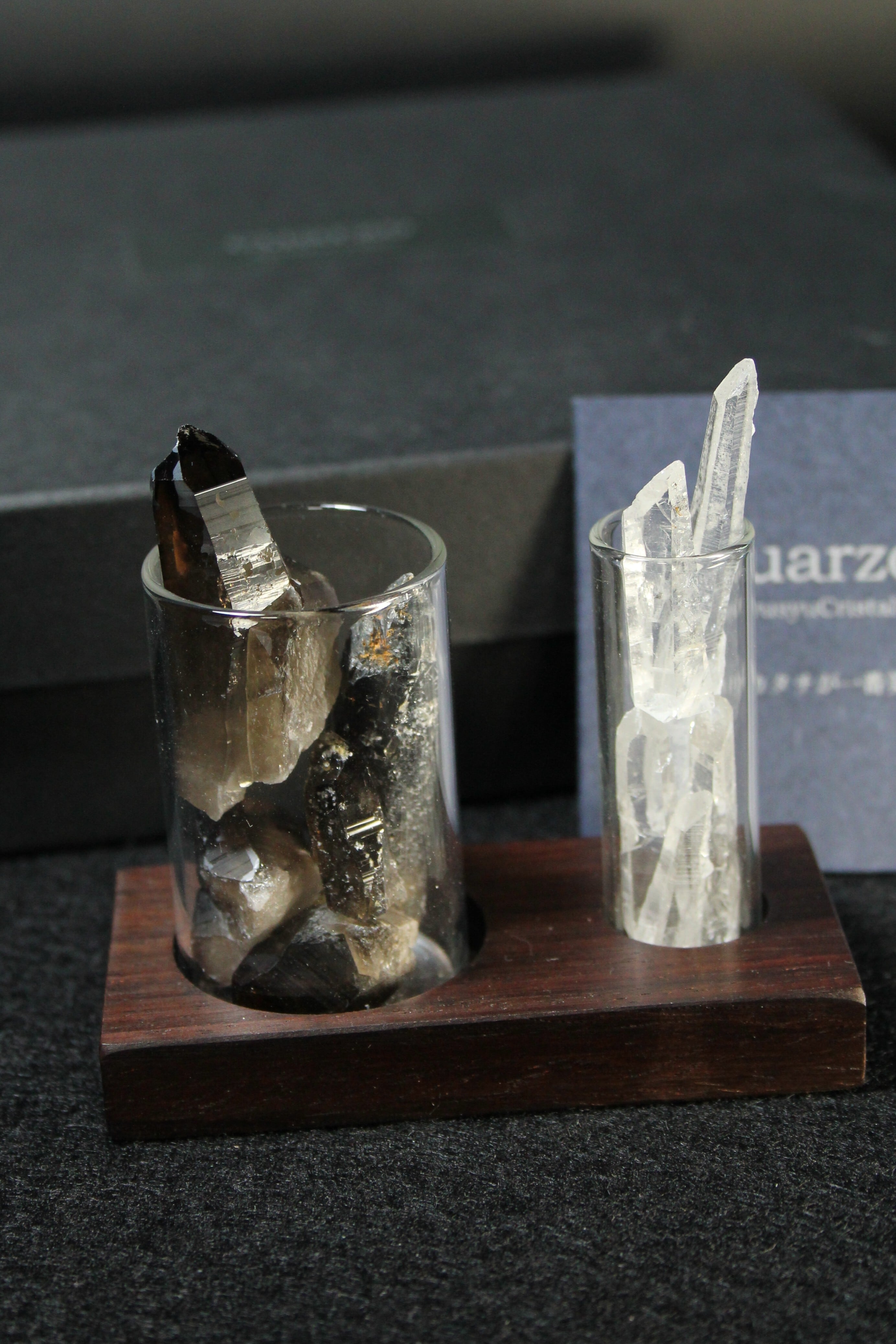【商品説明】:宮崎産の透明度高い水晶と、ほんのり茶色からモリオンに近い黒水晶など、バリエーションが豊富な煙水晶を各5本づつガラス製の試験管に詰めたセット。試験管台は、もちろんローズウッド。水晶は欠けや傷はありますが、宮崎産水晶の原石をお手元に置きたい人は、とってもお得なセットです。