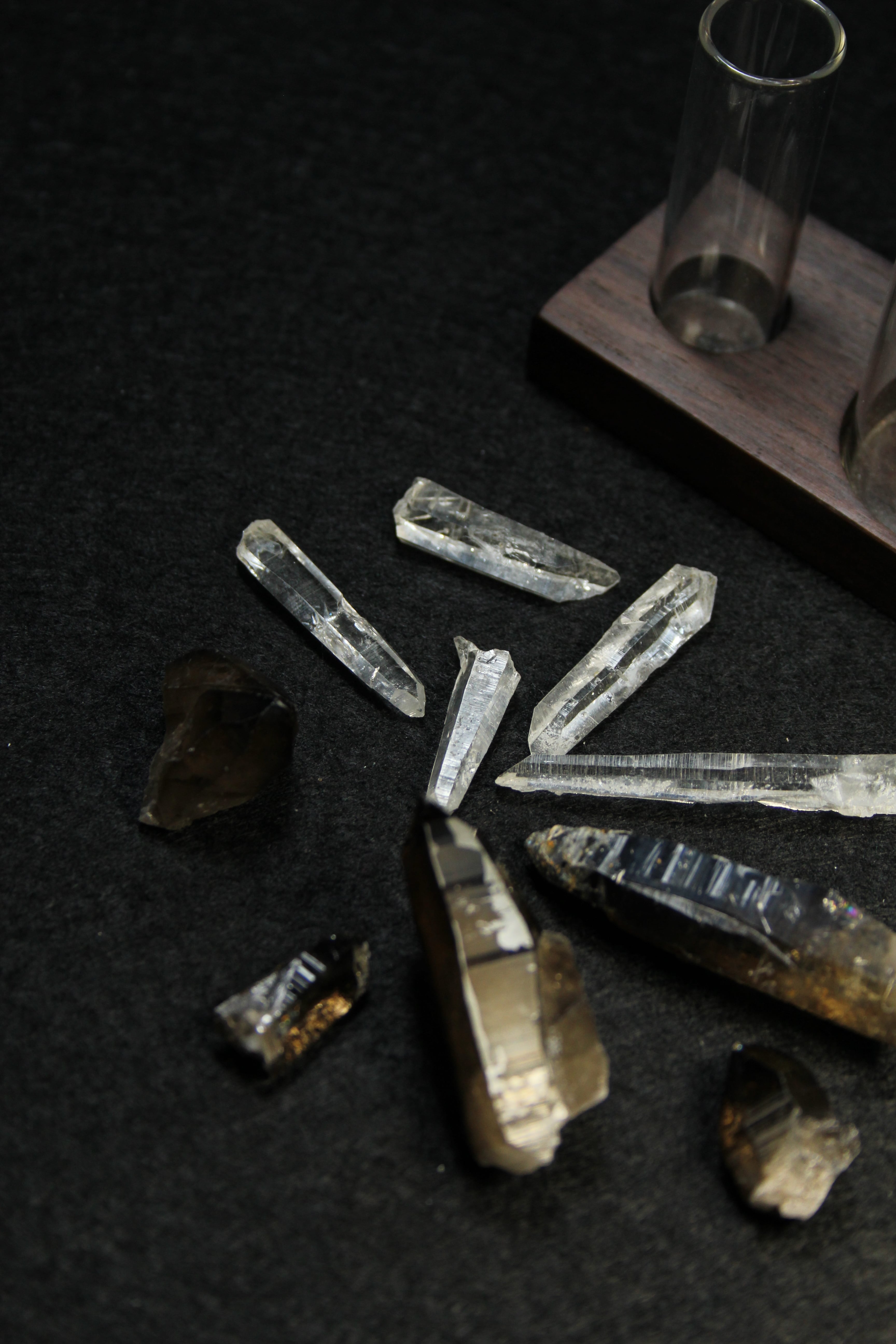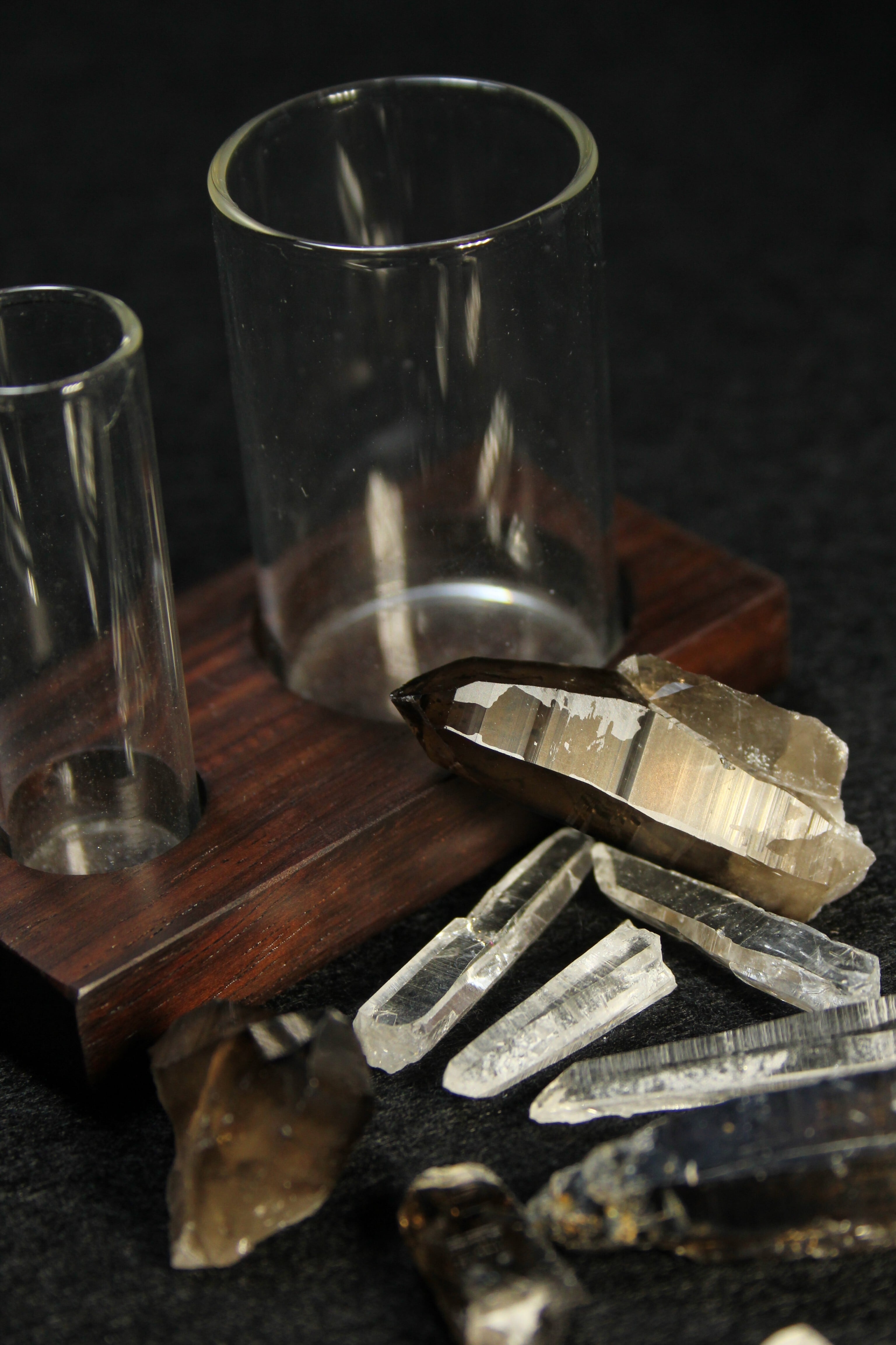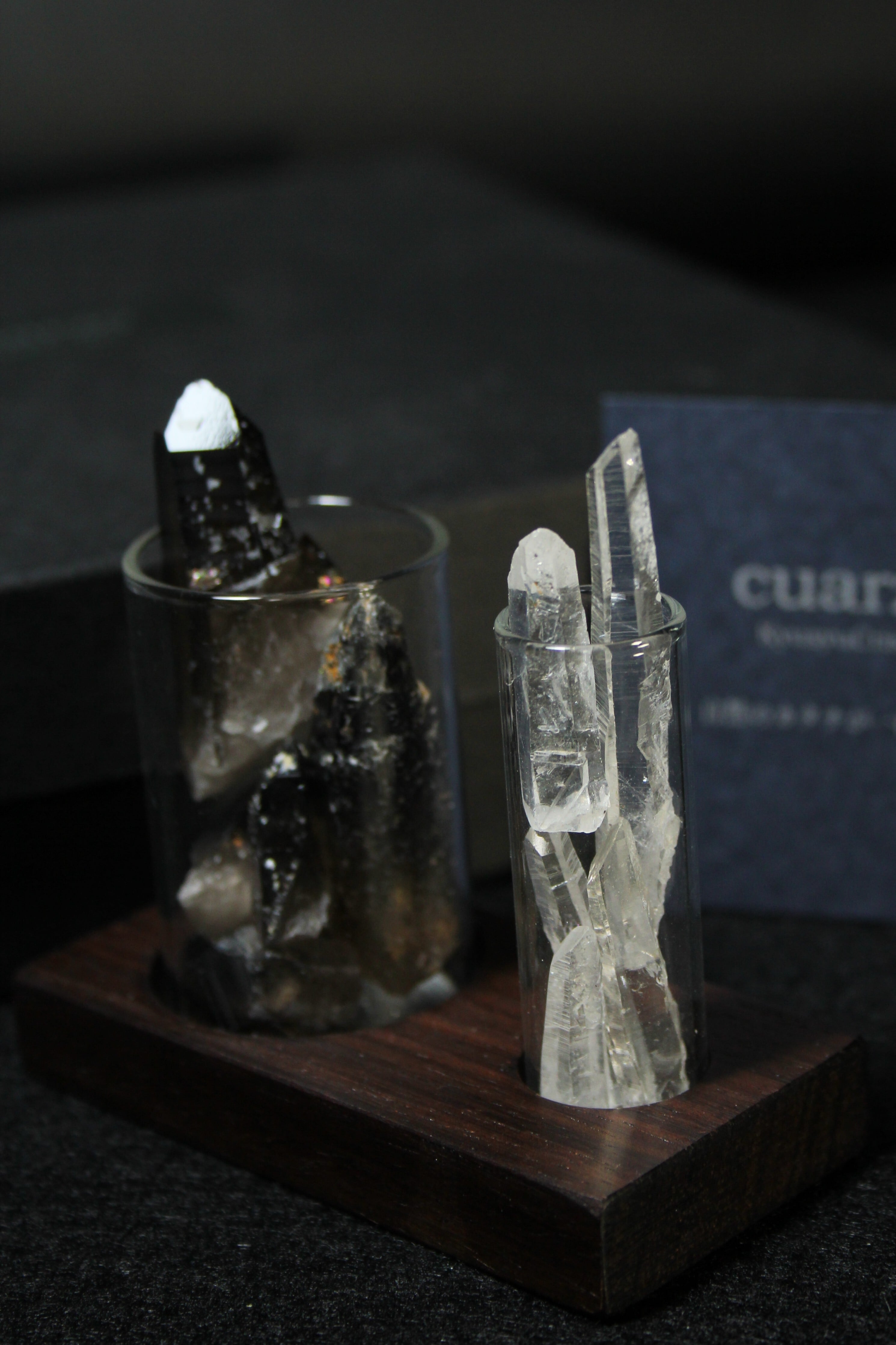 【商品説明】:宮崎産の透明度高い水晶と、ほんのり茶色からモリオンに近い黒水晶など、バリエーションが豊富な煙水晶を各5本づつガラス製の試験管に詰めたセット。試験管台は、もちろんローズウッド。水晶は欠けや傷はありますが、宮崎産水晶の原石をお手元に置きたい人は、とってもお得なセットです。