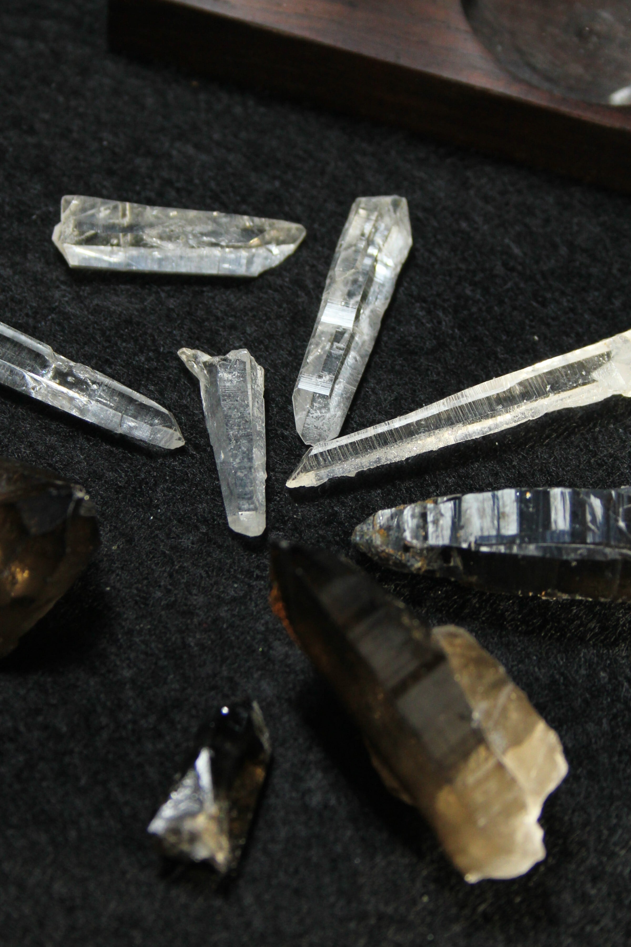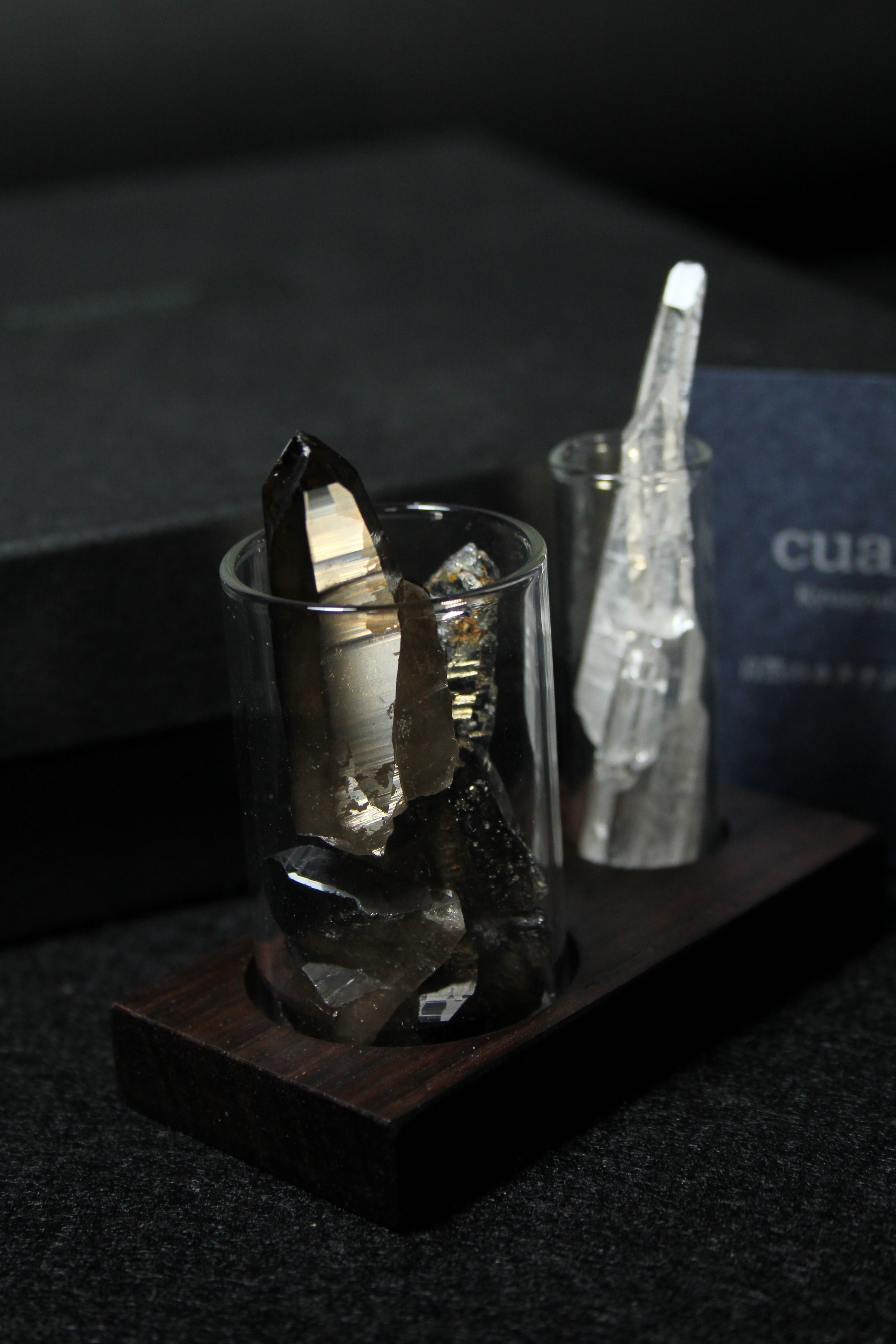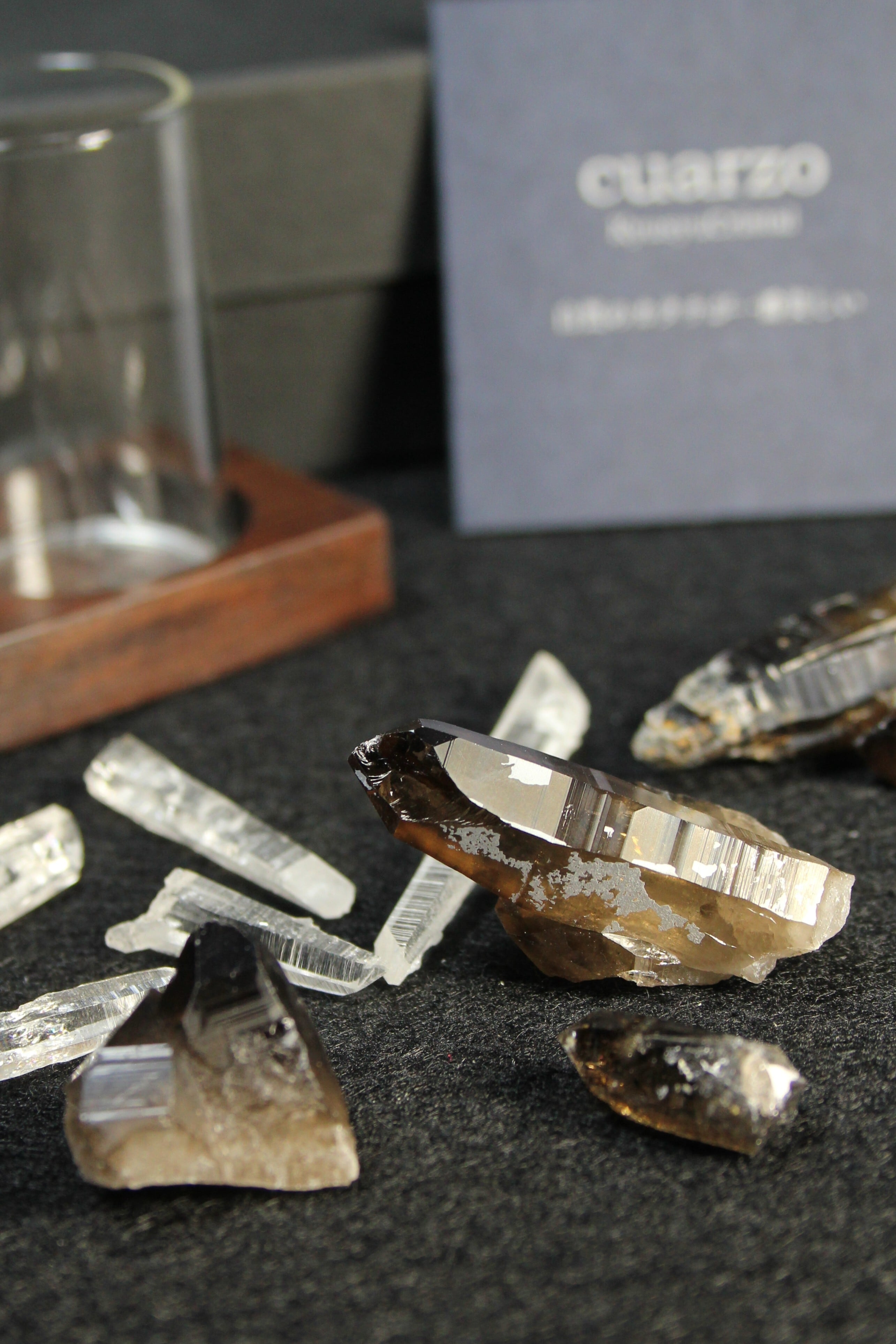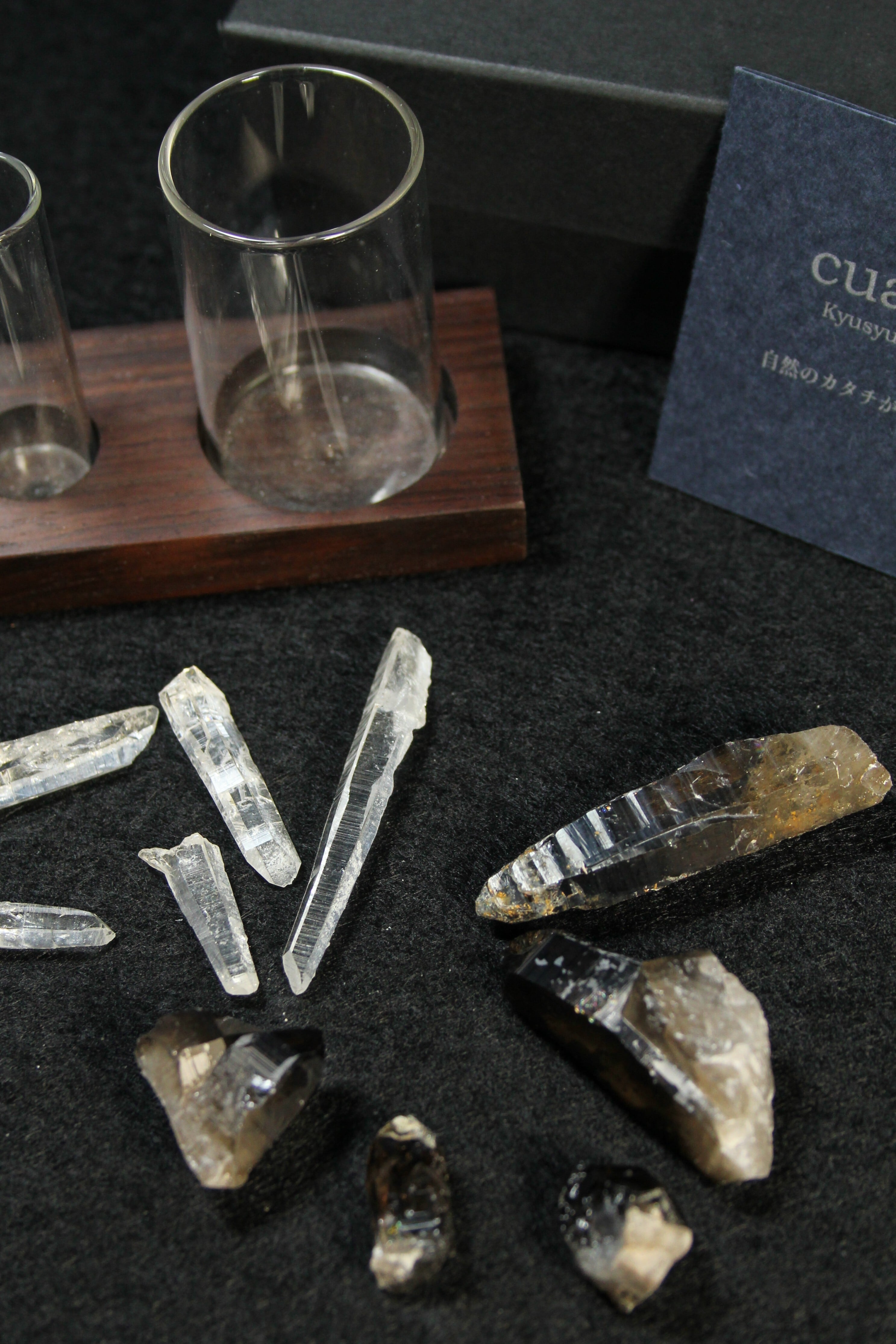【商品説明】:宮崎産の透明度高い水晶と、ほんのり茶色からモリオンに近い黒水晶など、バリエーションが豊富な煙水晶を各5本づつガラス製の試験管に詰めたセット。試験管台は、もちろんローズウッド。水晶は欠けや傷はありますが、宮崎産水晶の原石をお手元に置きたい人は、とってもお得なセットです。