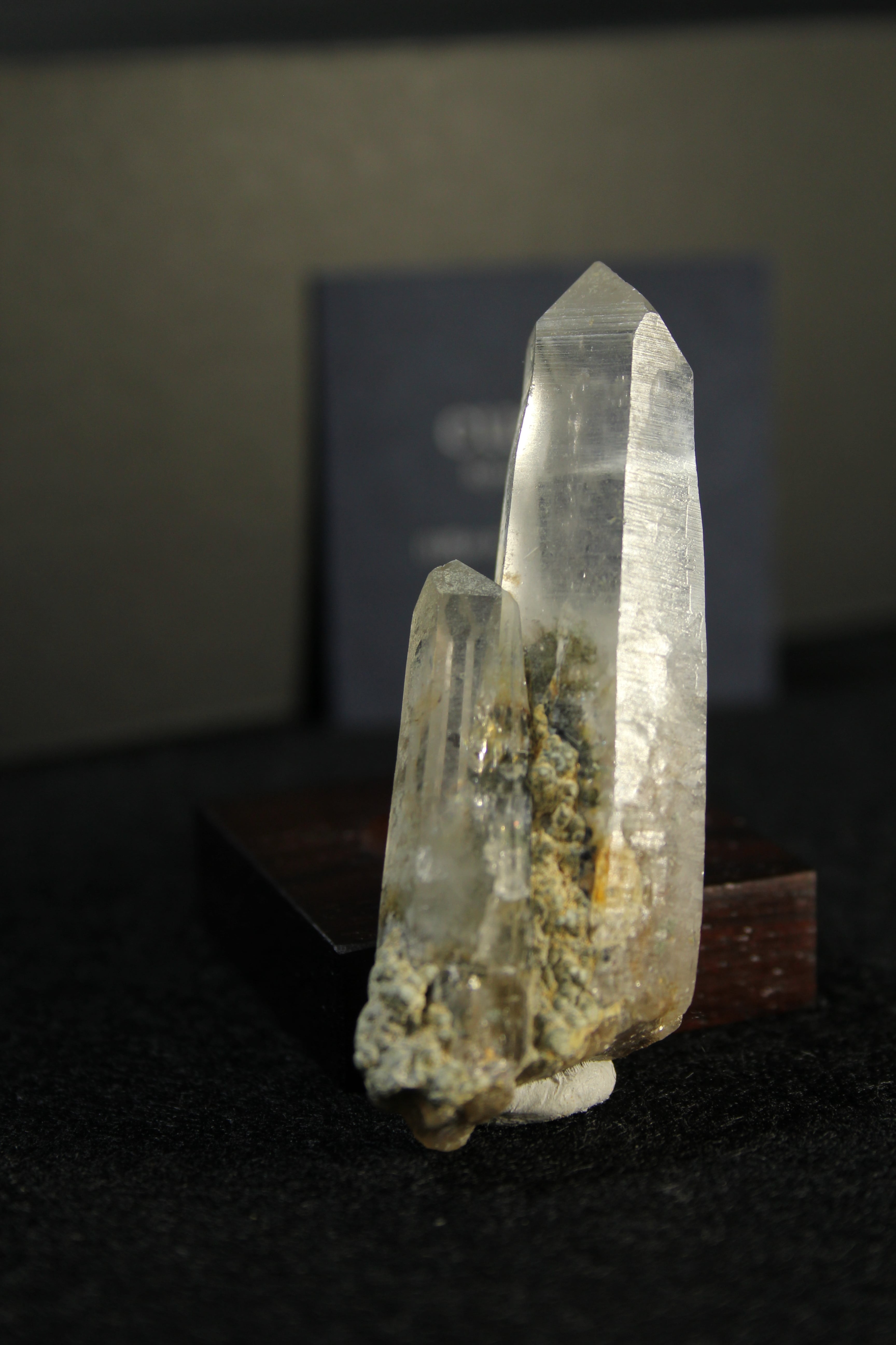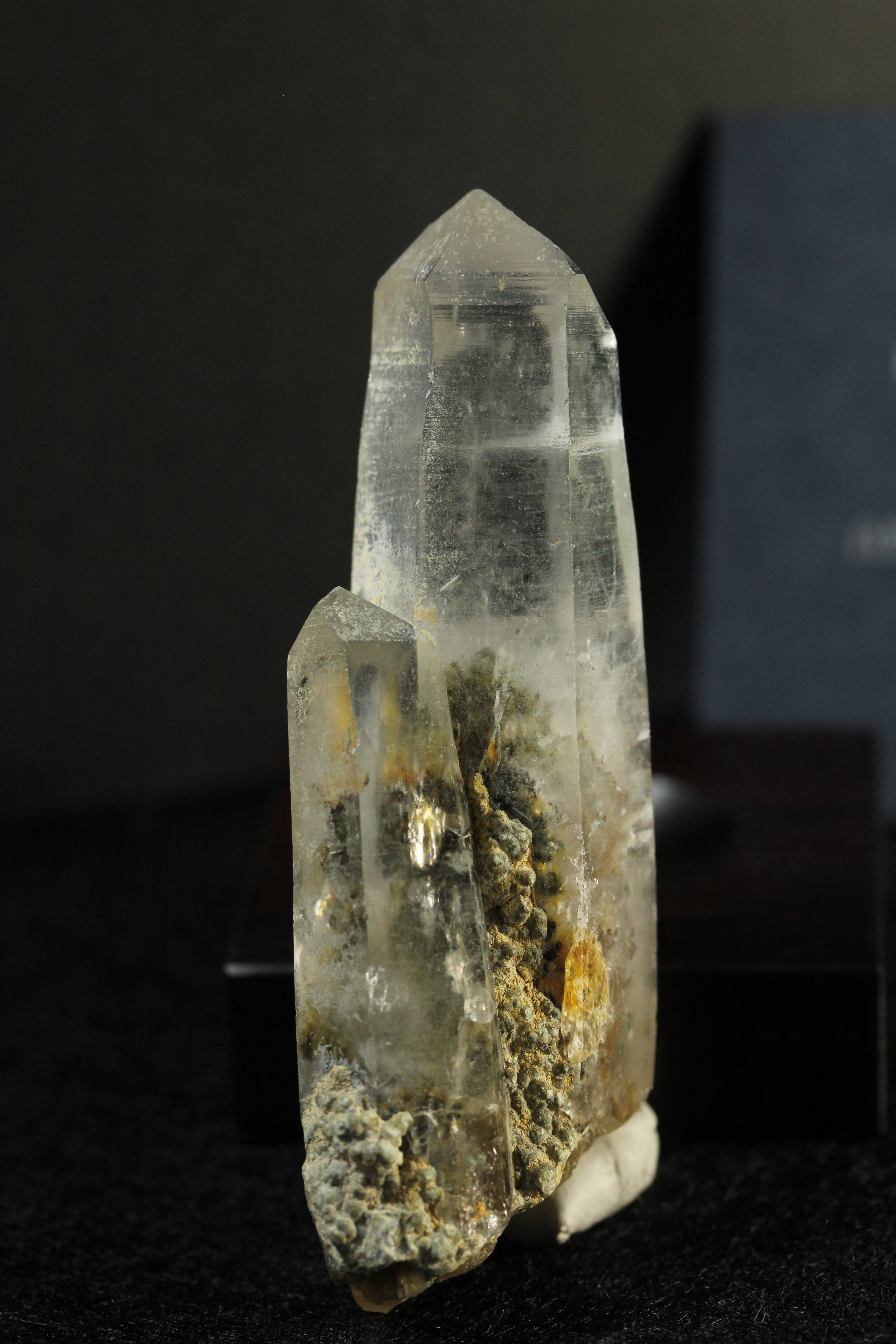 【商品説明】:大分県産水晶の原石と高級木材のローズウッドを使用した置物。国産水晶が好きな人なら知らない人はいないくらい有名なまりも水晶。まりもの正体は緑泥岩の仲間のクーク石で、通常は灰~灰緑色、たまに深緑~黒っぽい色がある。また最初にできた水晶が残っているファントムあるいはゴーストと言われる現象が見られることも多い。まりも水晶は、クーク石とファントムの色や形が1つ1つ個性があって同じものが無い。その中でもこのまりも水晶は、今では見つけることが非常に難しい6cm越え。しかも大小の水晶がくっ付いた親子のまりも水晶。透明度が高く、濃い緑のファントムにまりもが散らばる、とても個性的なまりも水晶です。ローズウッドベースの大きさ(約40x40x12mm)水晶を置く部分には「座ぐり」と呼ばれる円形の溝を掘っております。簡単のように見えますが、硬い木材のローズウッドに、一定の深さの溝を掘るには、非常に高度な技術を用います。木工歴50年の職人が成せる技です