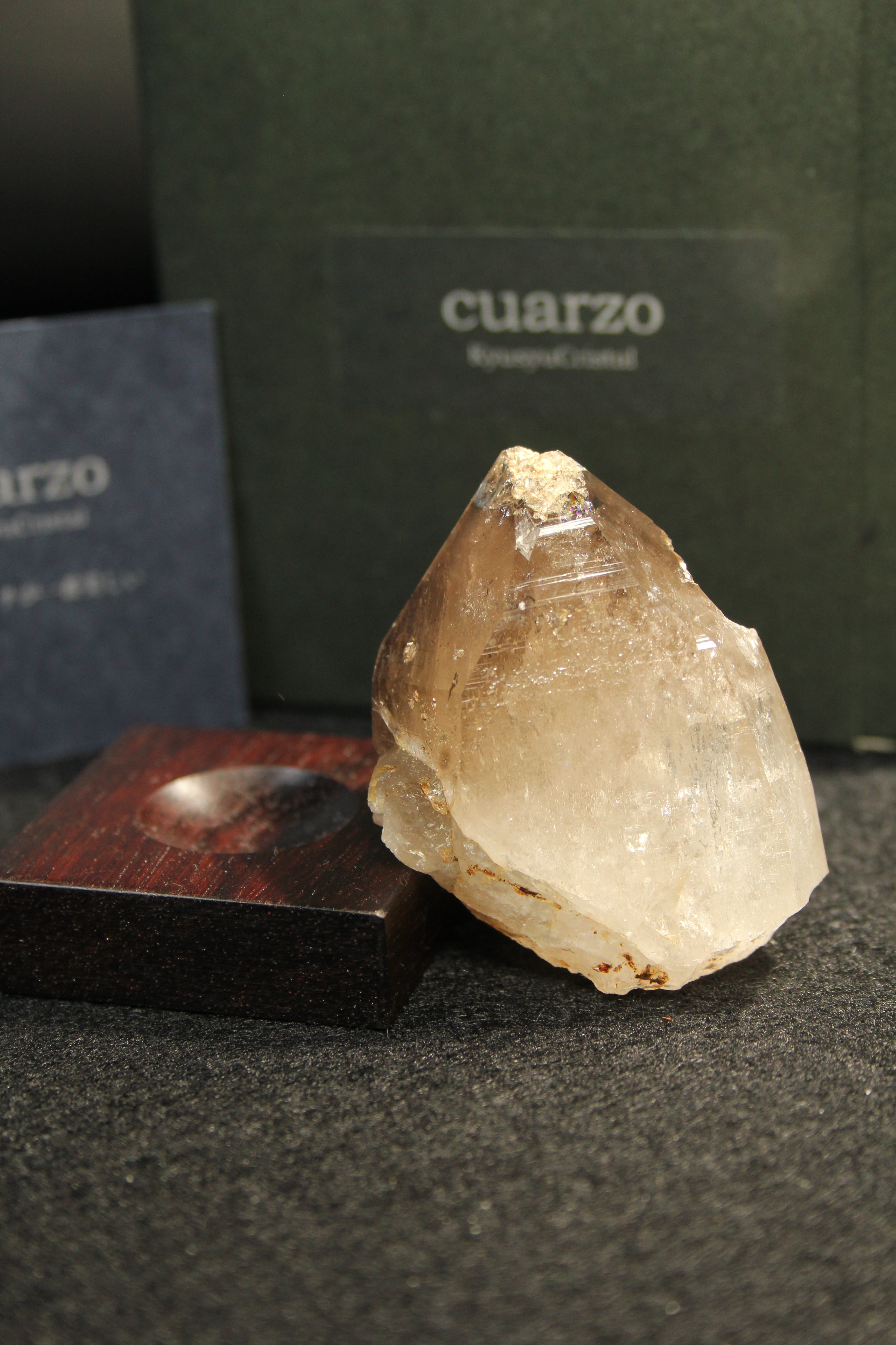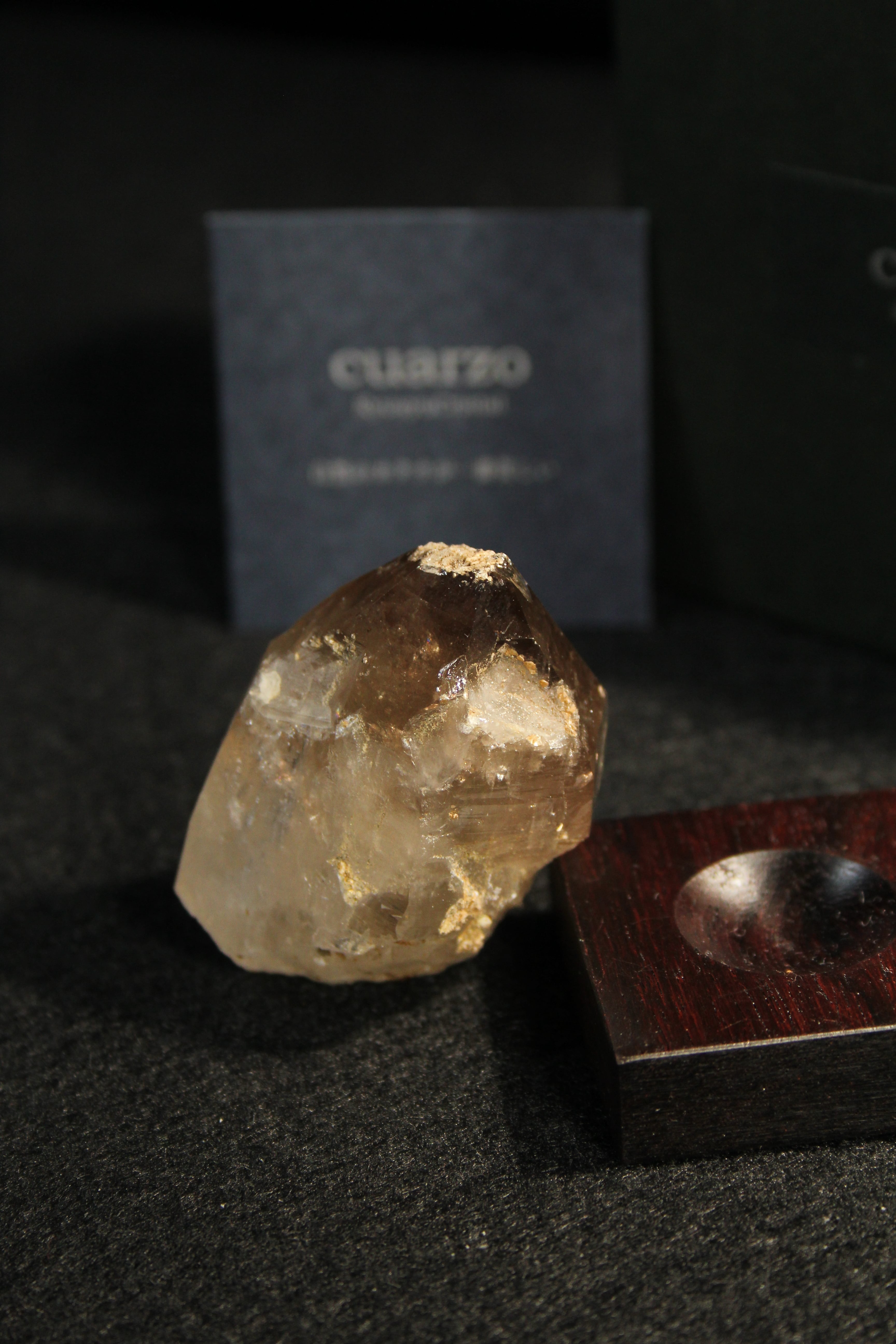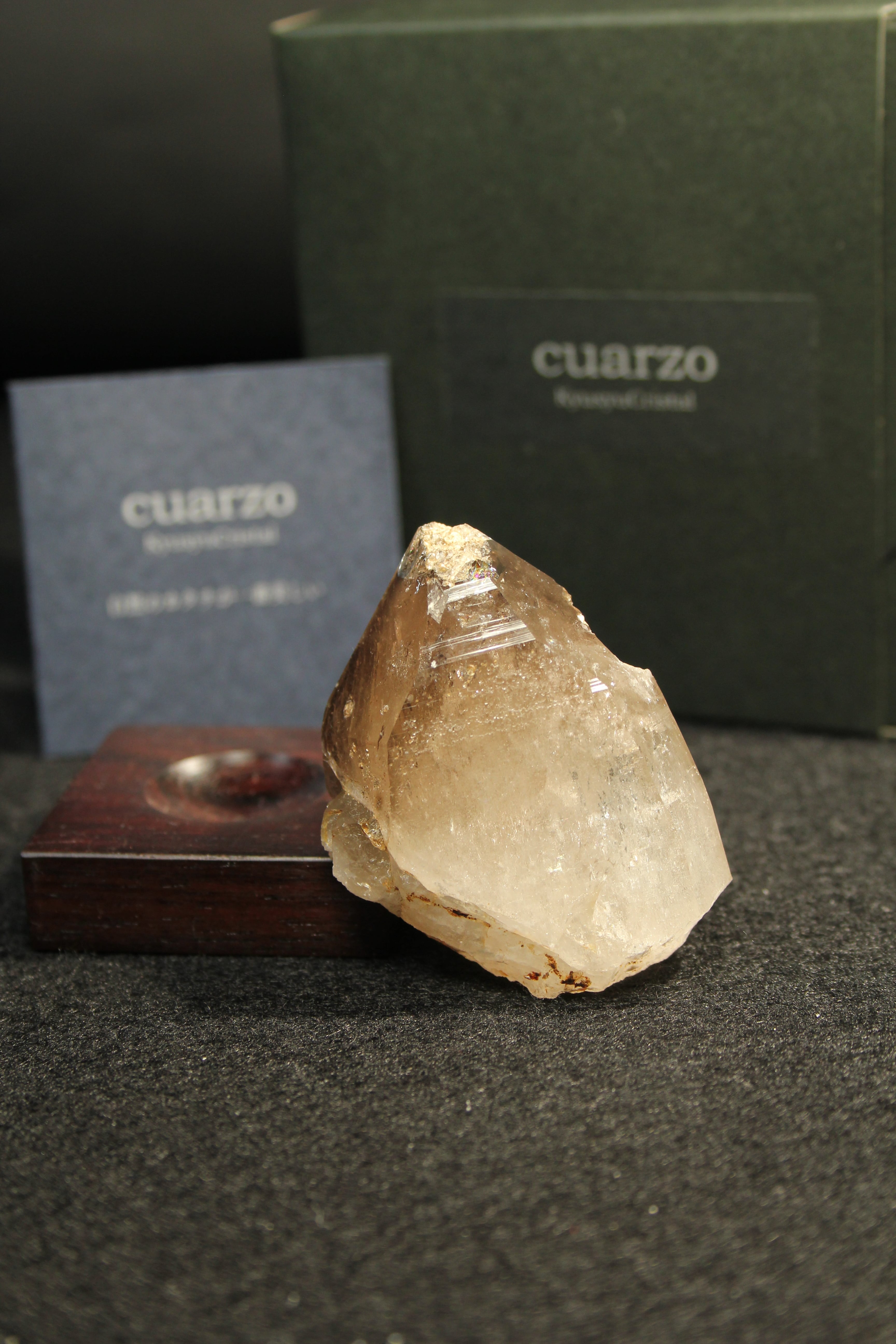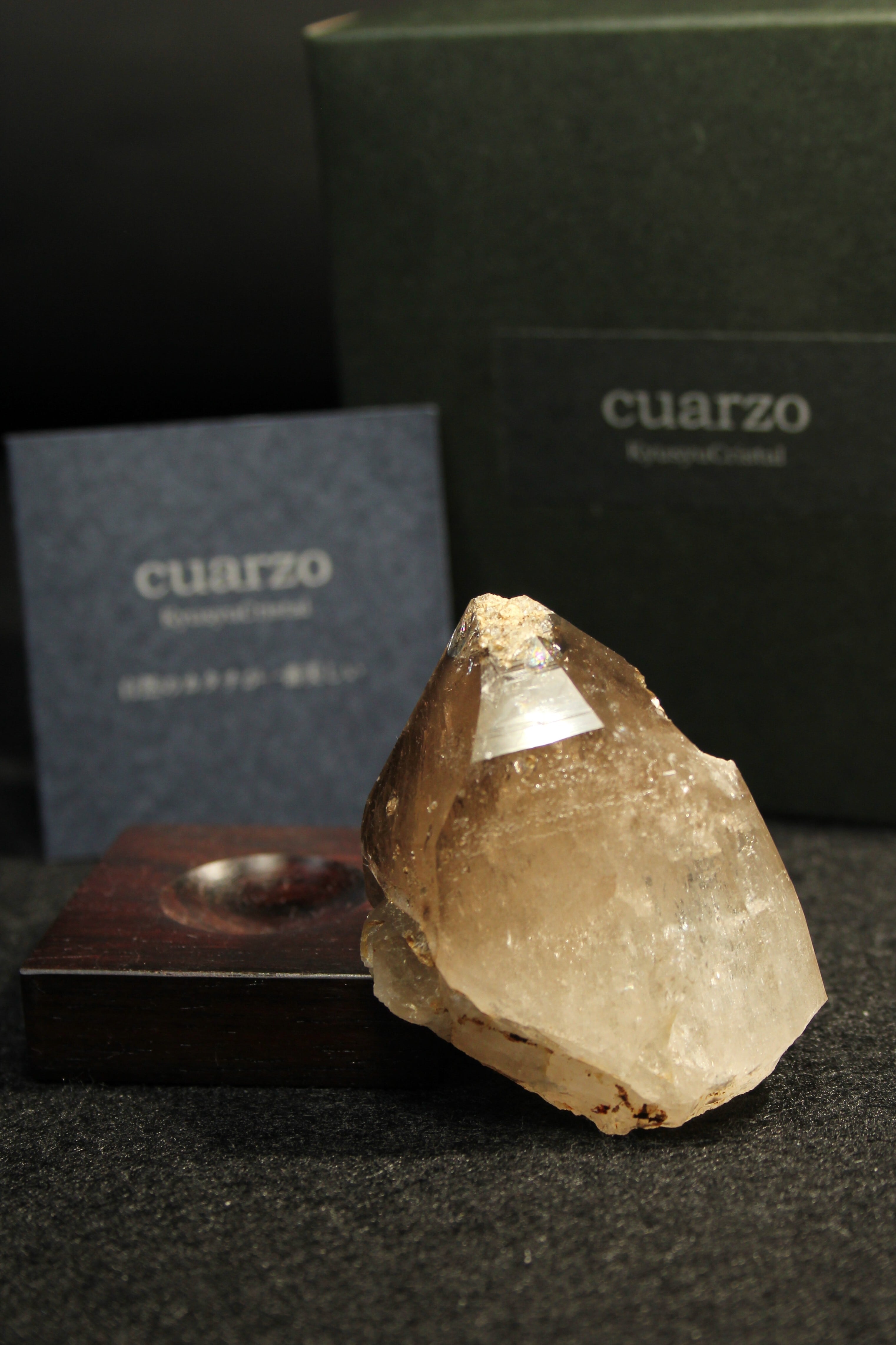 【商品説明】:5cm越えの宮崎産煙水晶です。薄いグレーからTOPに掛けて濃くなる透明感溢れる水晶です。TOPの部分に他の鉱物の干渉があるが、今では5cm越えの煙水晶は、なかなか採れません。ローズウッドベースの大きさ(約40x40x12mm)水晶を置く部分には「座ぐり」と呼ばれる円形の溝を掘っております。簡単のように見えますが、硬い木材のローズウッドに、一定の深さの溝を掘るには、非常に高度な技術を用います。木工歴50年の職人が成せる技です