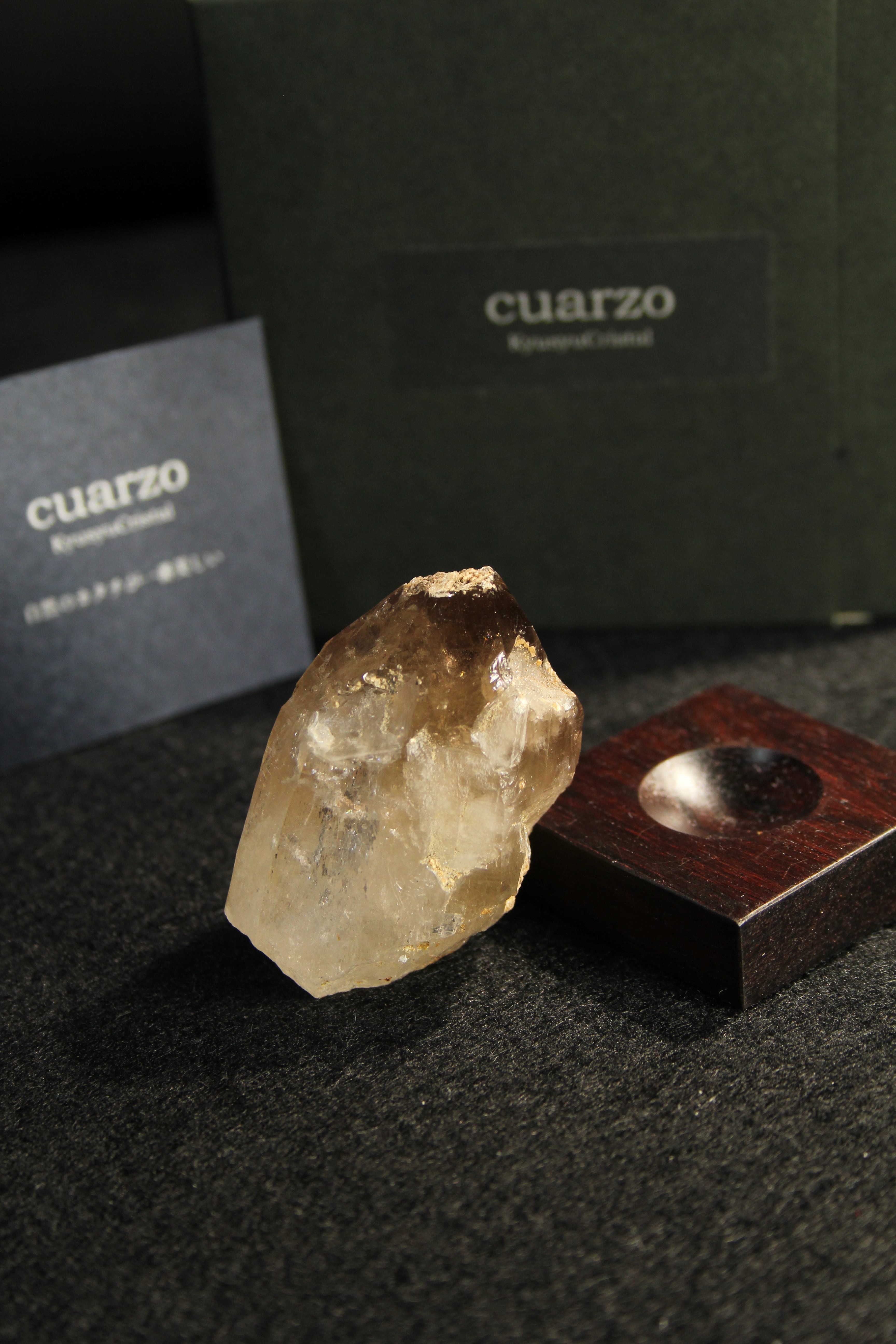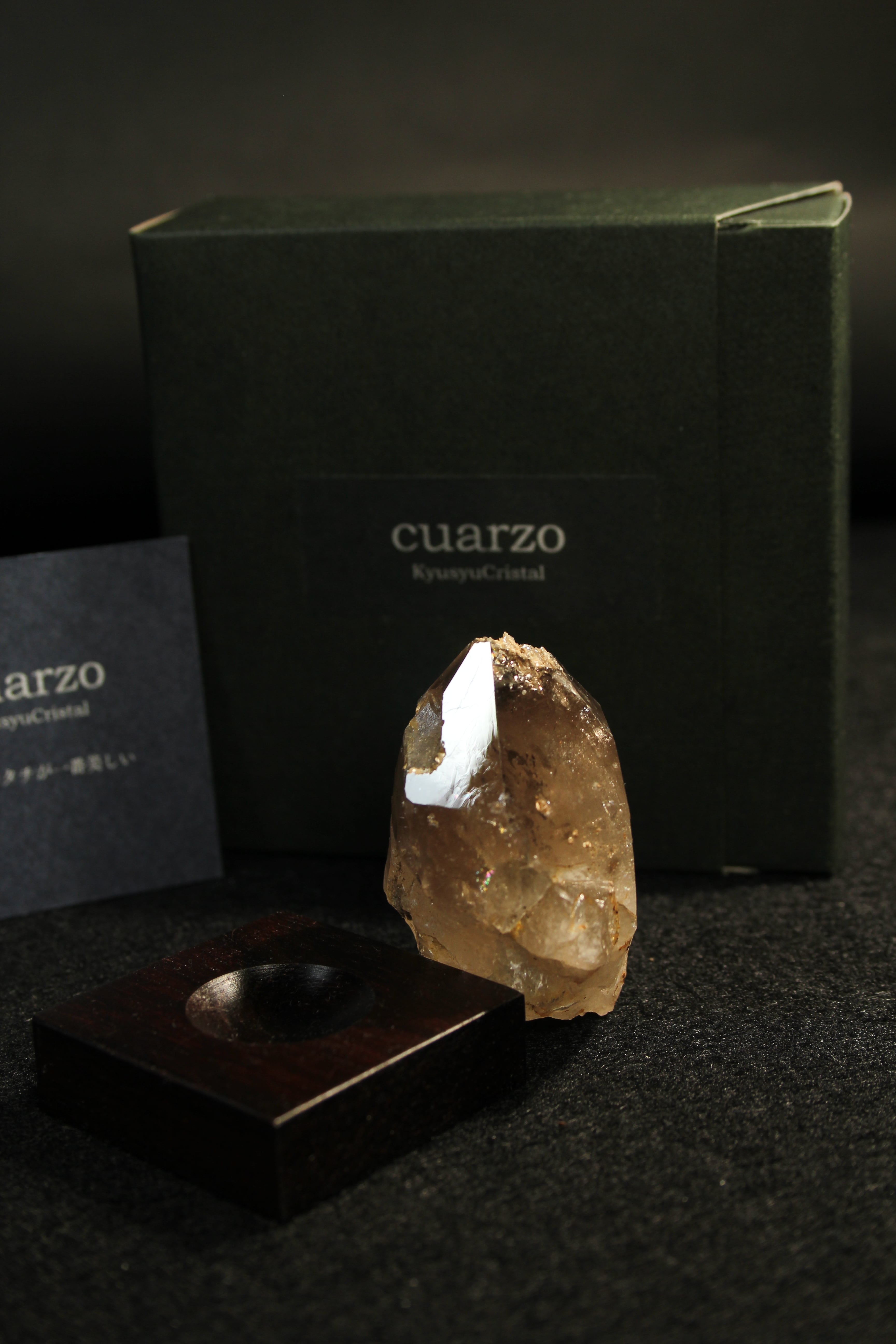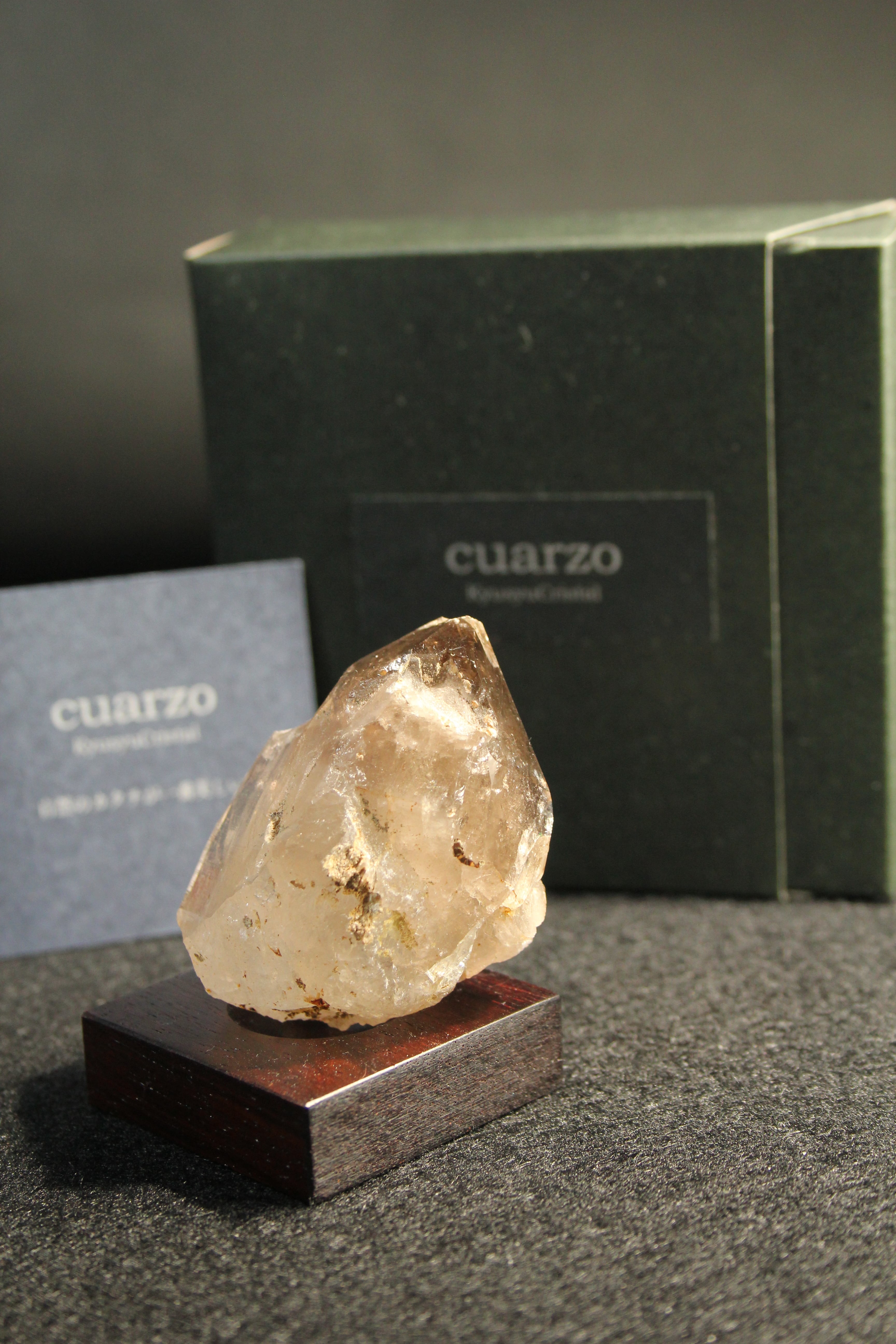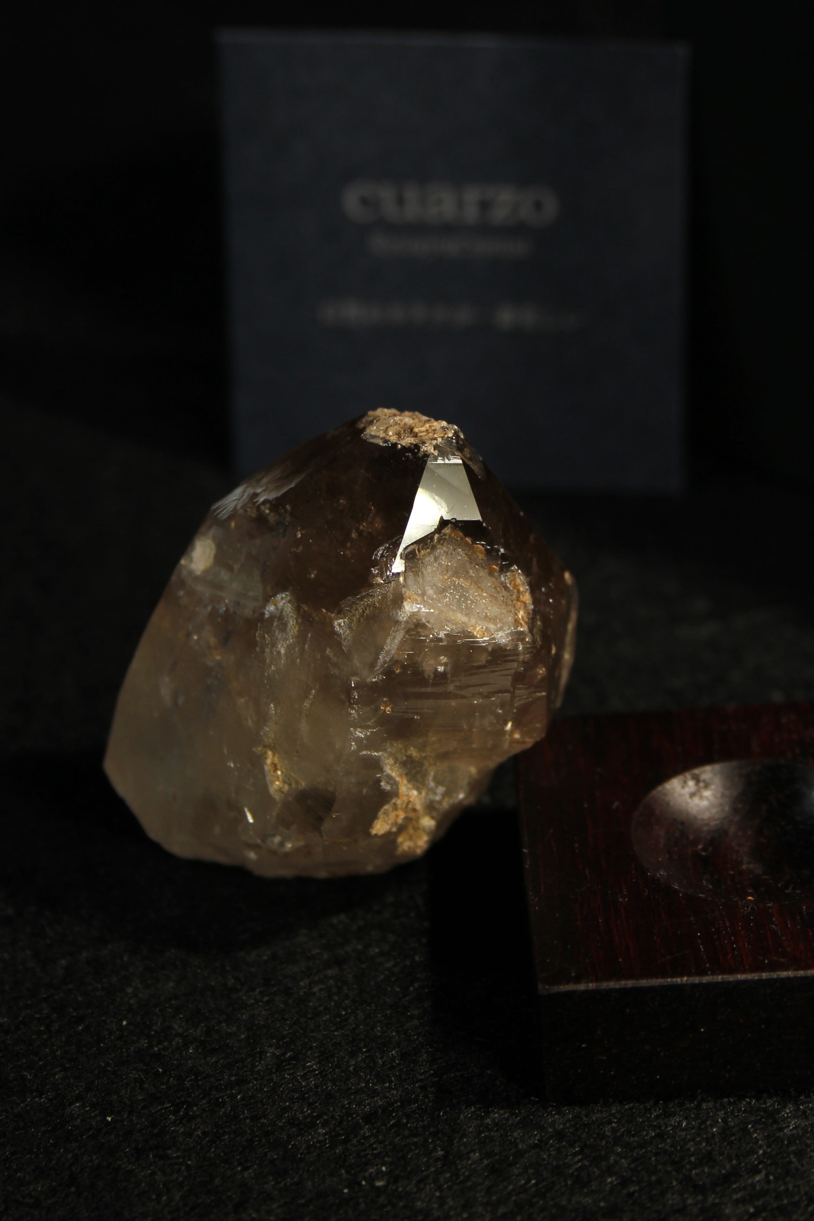 【商品説明】:5cm越えの宮崎産煙水晶です。薄いグレーからTOPに掛けて濃くなる透明感溢れる水晶です。TOPの部分に他の鉱物の干渉があるが、今では5cm越えの煙水晶は、なかなか採れません。ローズウッドベースの大きさ(約40x40x12mm)水晶を置く部分には「座ぐり」と呼ばれる円形の溝を掘っております。簡単のように見えますが、硬い木材のローズウッドに、一定の深さの溝を掘るには、非常に高度な技術を用います。木工歴50年の職人が成せる技です