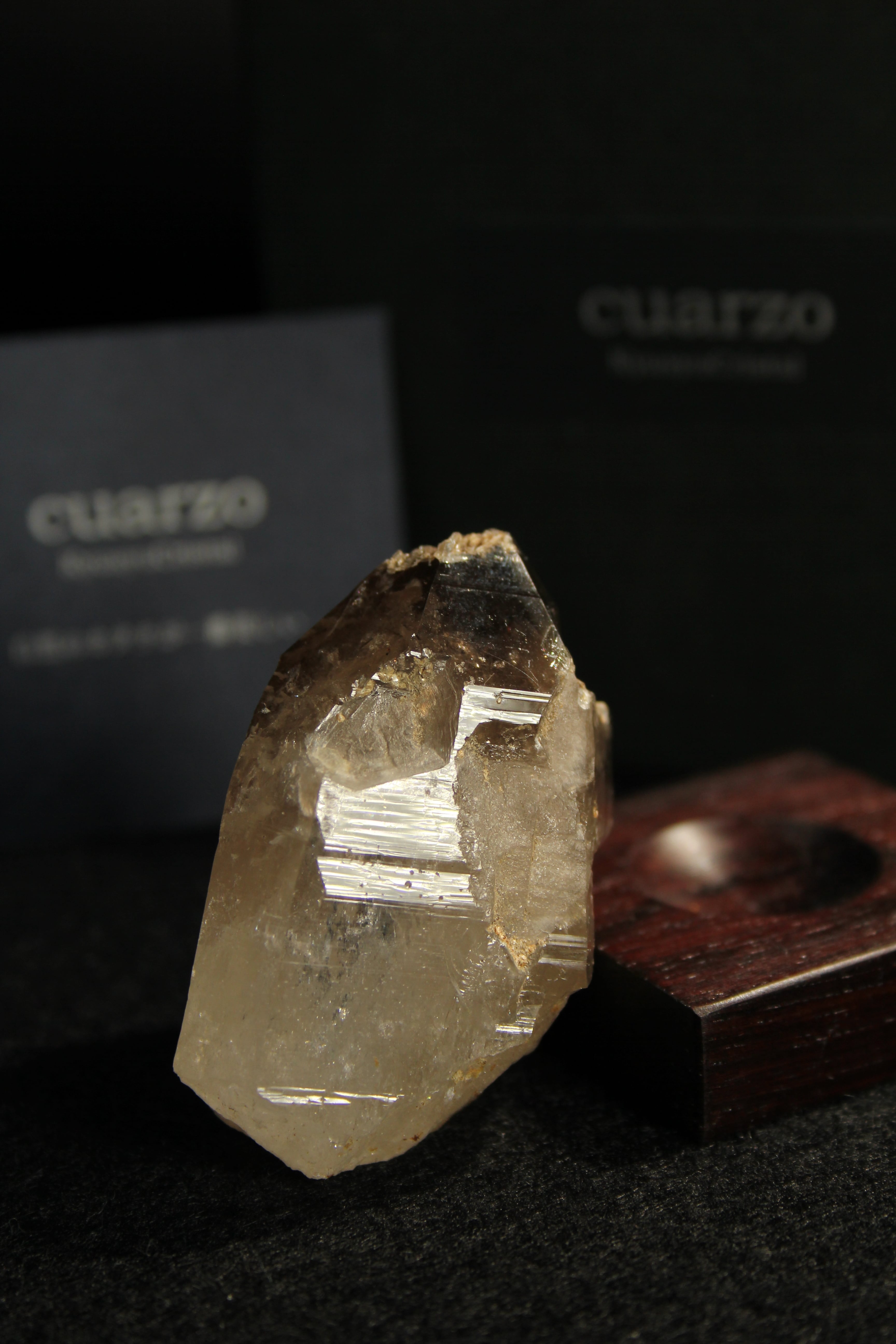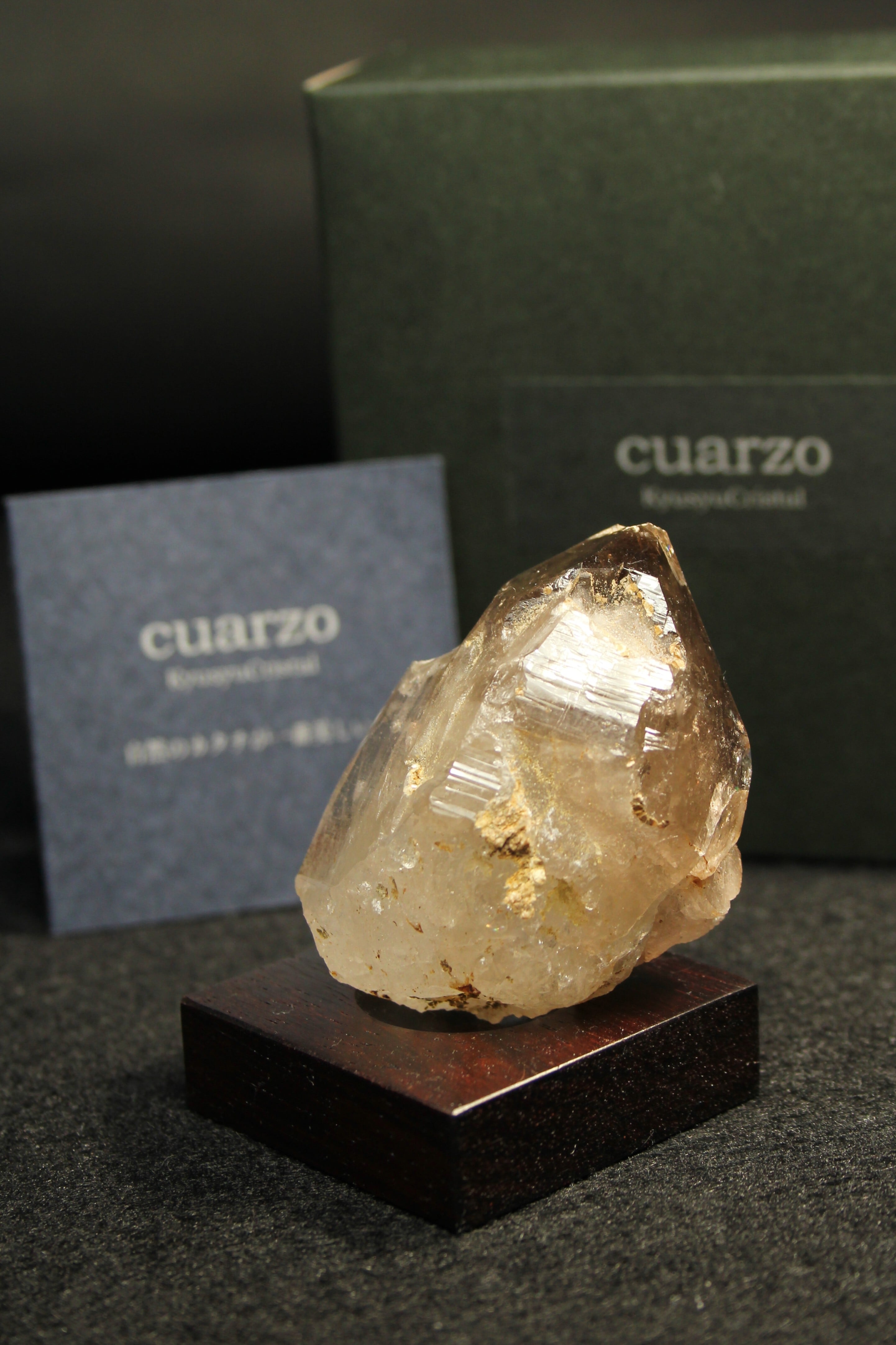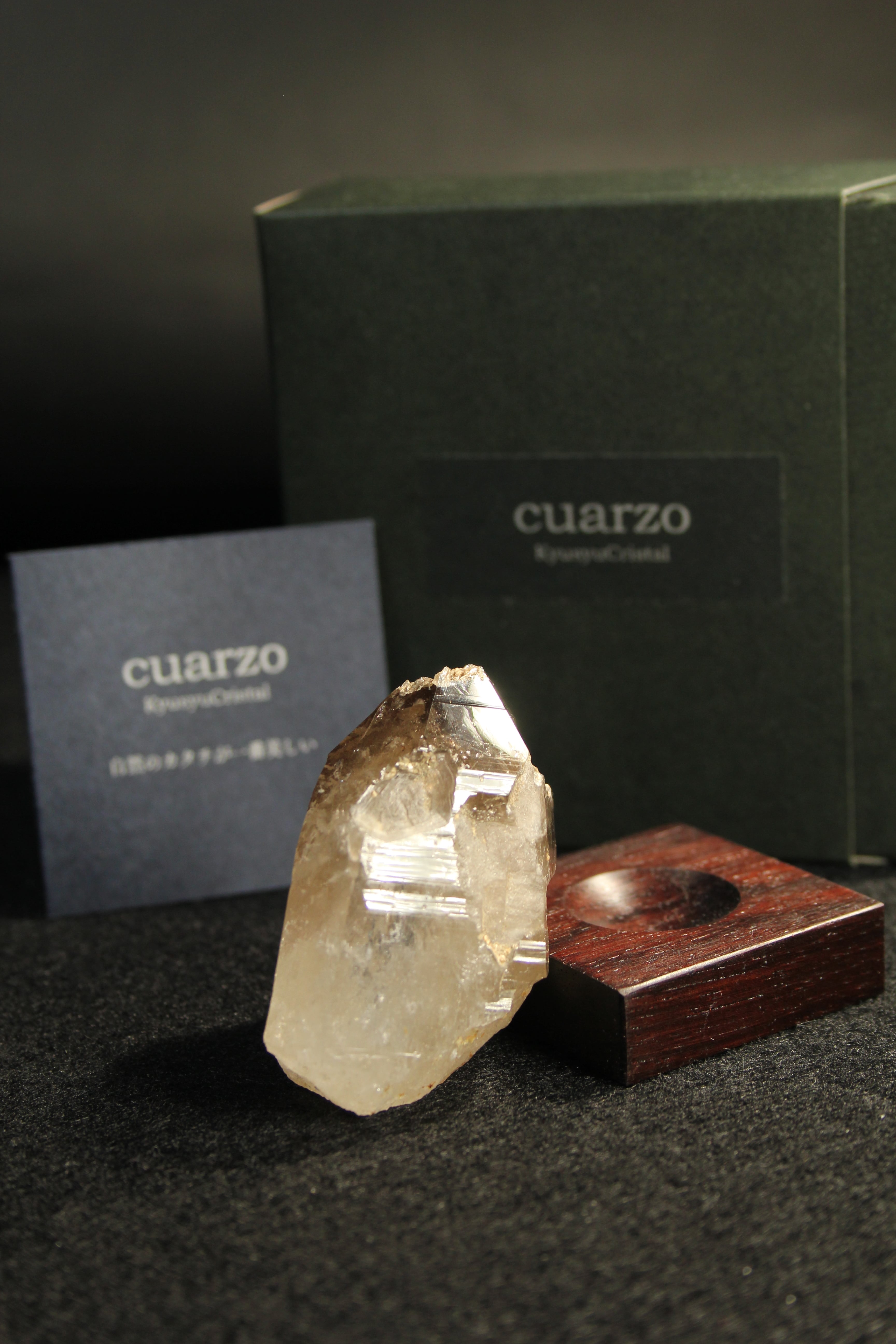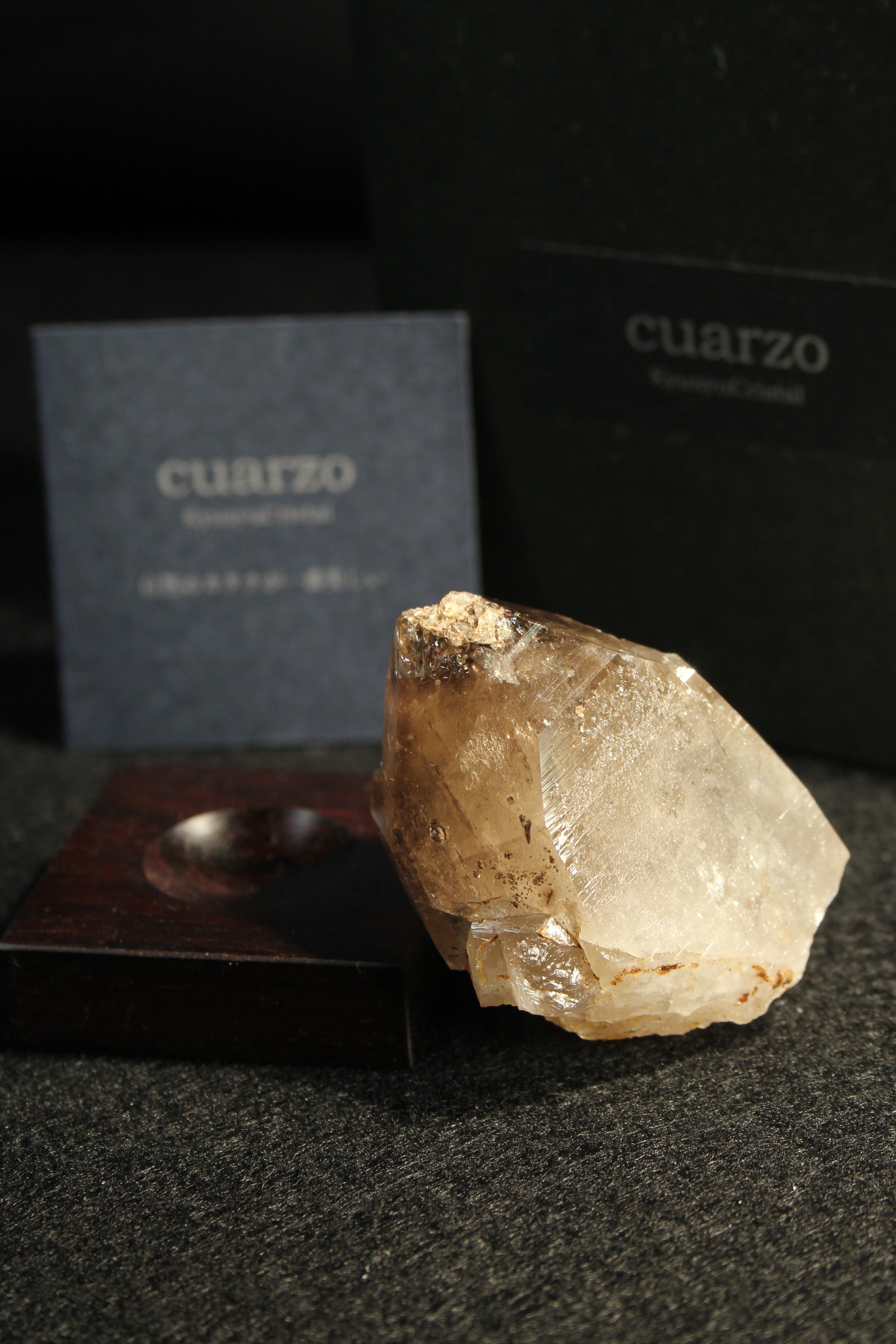 【商品説明】:5cm越えの宮崎産煙水晶です。薄いグレーからTOPに掛けて濃くなる透明感溢れる水晶です。TOPの部分に他の鉱物の干渉があるが、今では5cm越えの煙水晶は、なかなか採れません。ローズウッドベースの大きさ(約40x40x12mm)水晶を置く部分には「座ぐり」と呼ばれる円形の溝を掘っております。簡単のように見えますが、硬い木材のローズウッドに、一定の深さの溝を掘るには、非常に高度な技術を用います。木工歴50年の職人が成せる技です