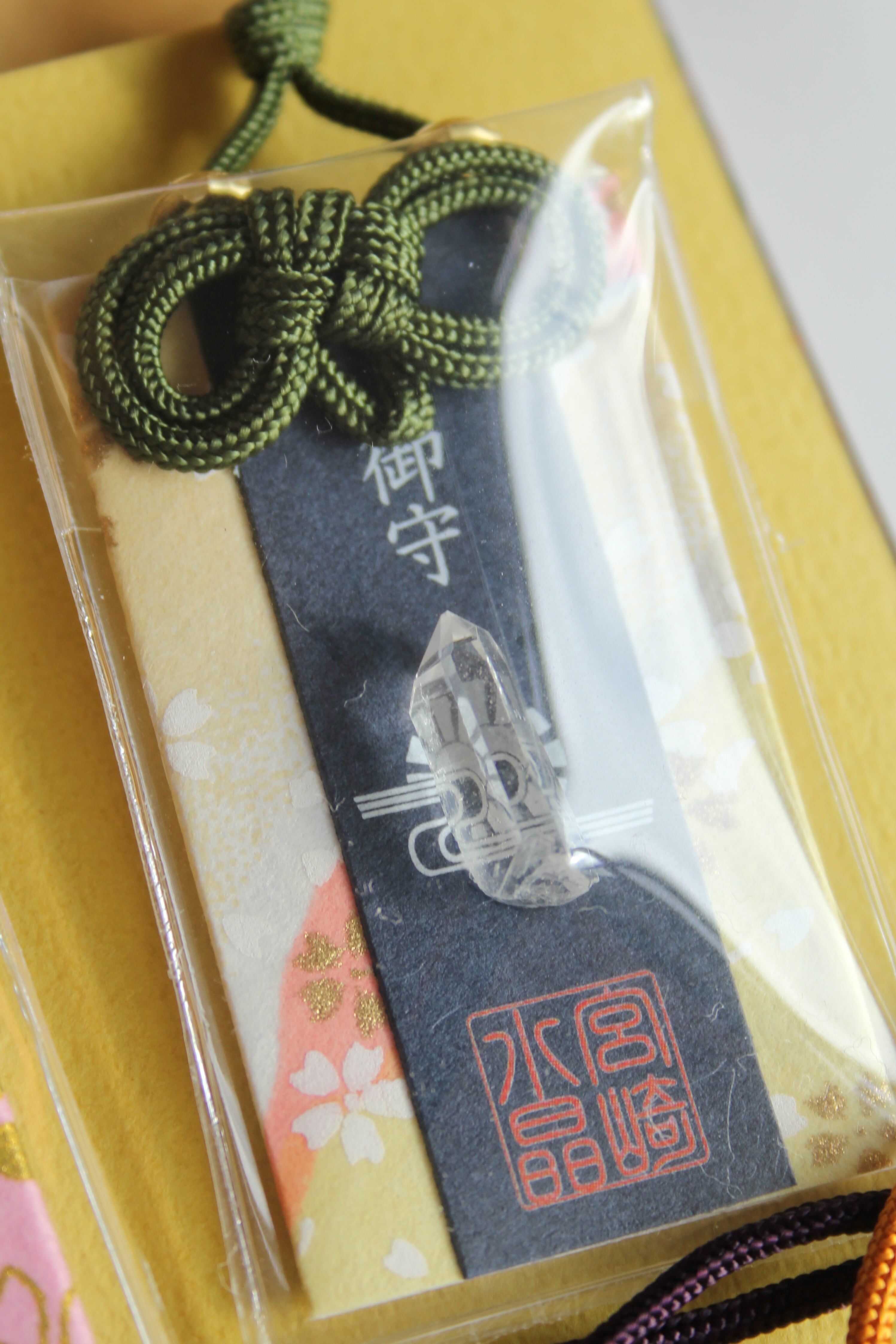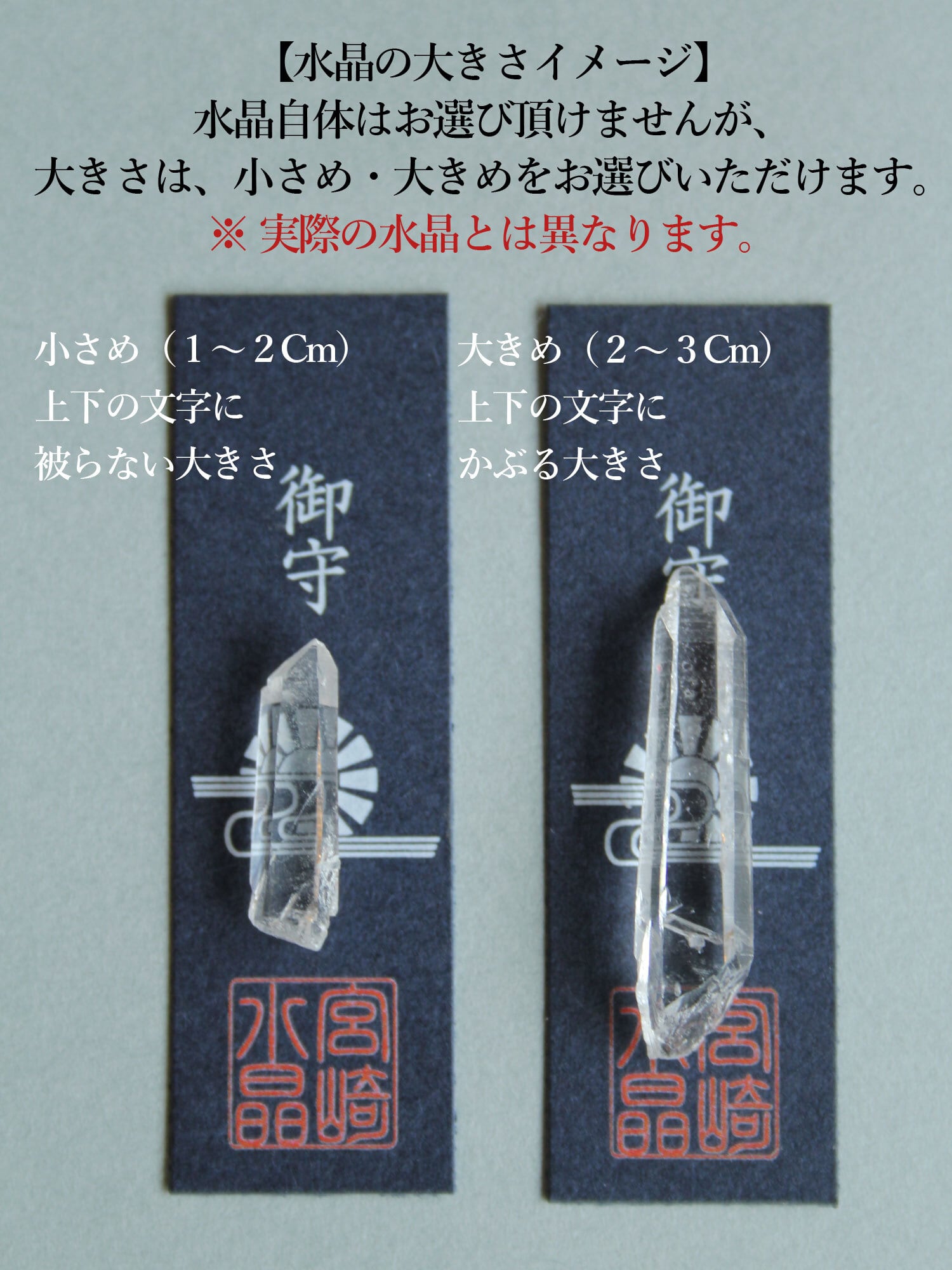 御守 宮崎水晶では国産水晶の中でも、特に透明度の高い宮崎県西米良産の水晶を、削らず磨かず自然のまま使用しております。水晶の透明度は、その浄化能力や潜在能力を引き出すパワーと深く関係しており、一般的に透明度が高いほど浄化力も高いとされています。水晶の無垢なる石としての透明な輝きは、持ち主の精神的な浄化や心身のバランスを整え、あらゆる負のエネルギーをクリーンにする万能なパワーストーンとして、古くから信じられています。