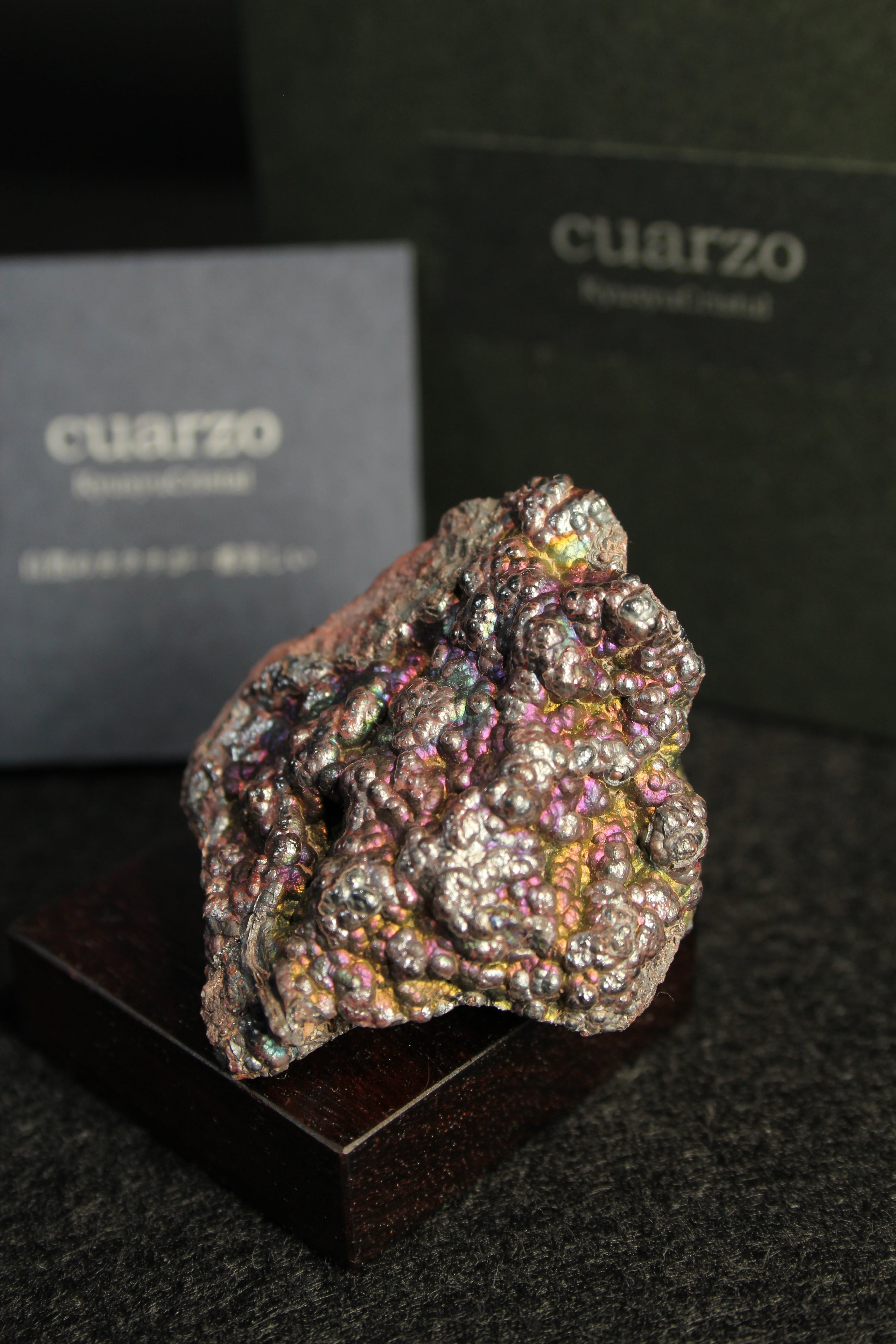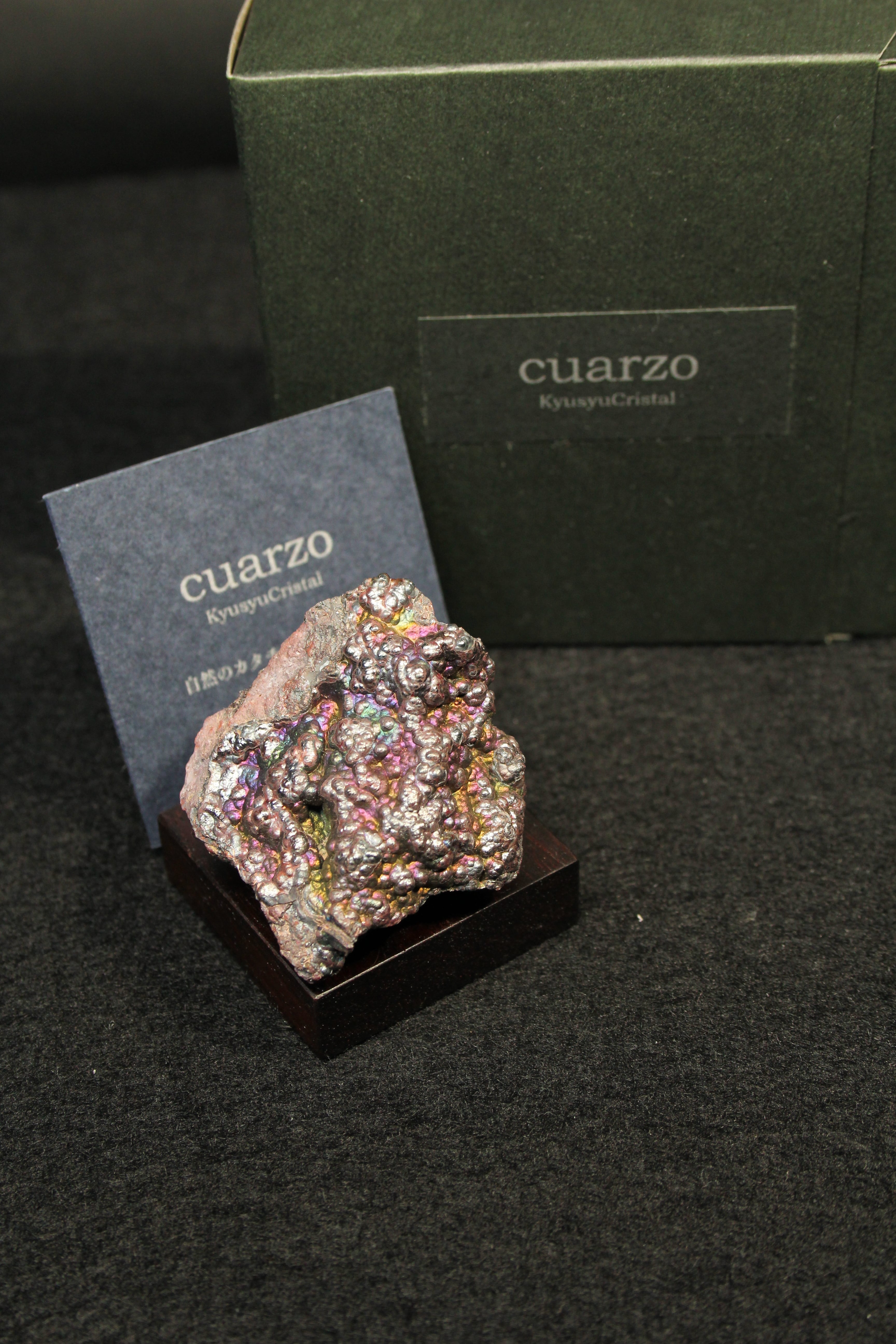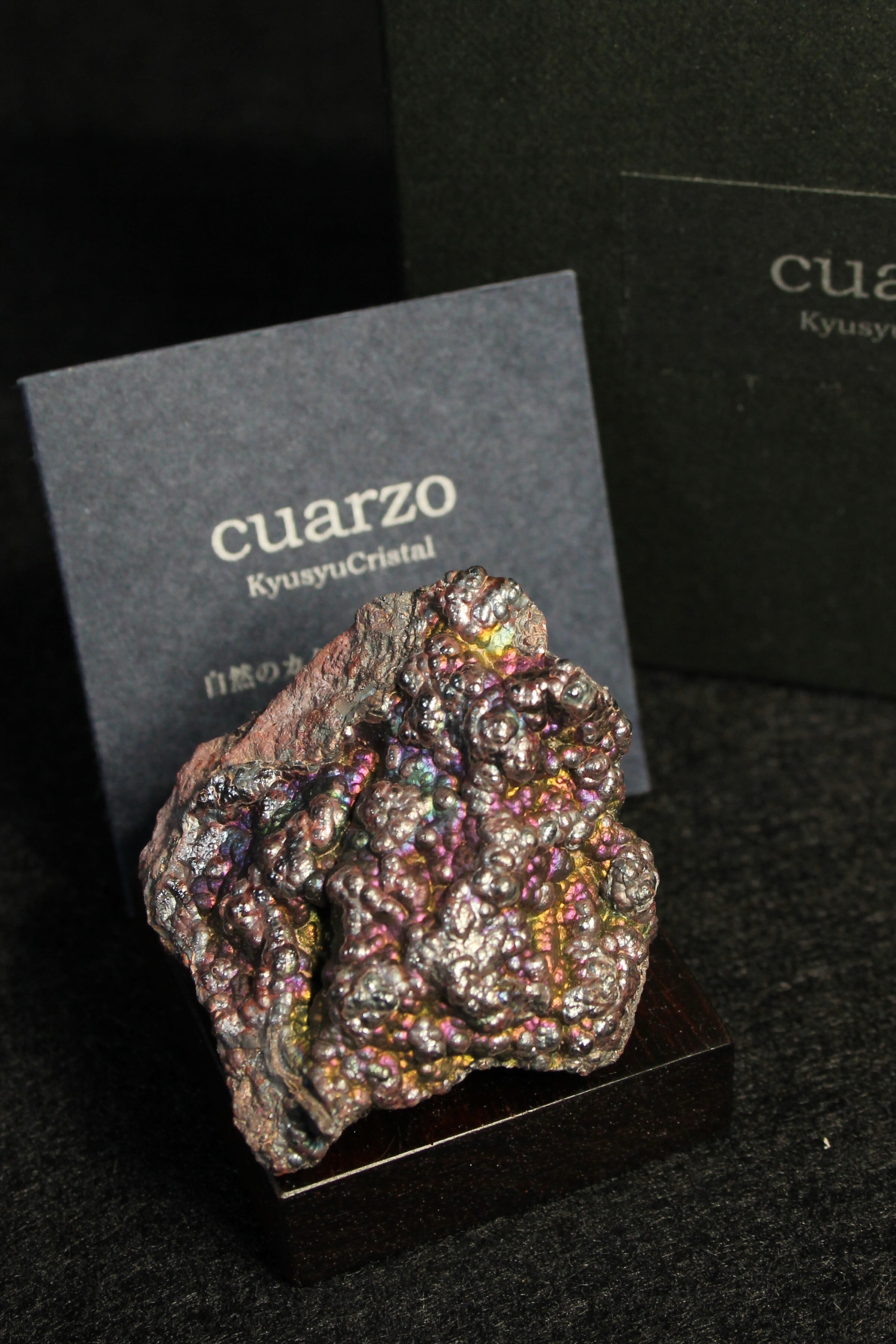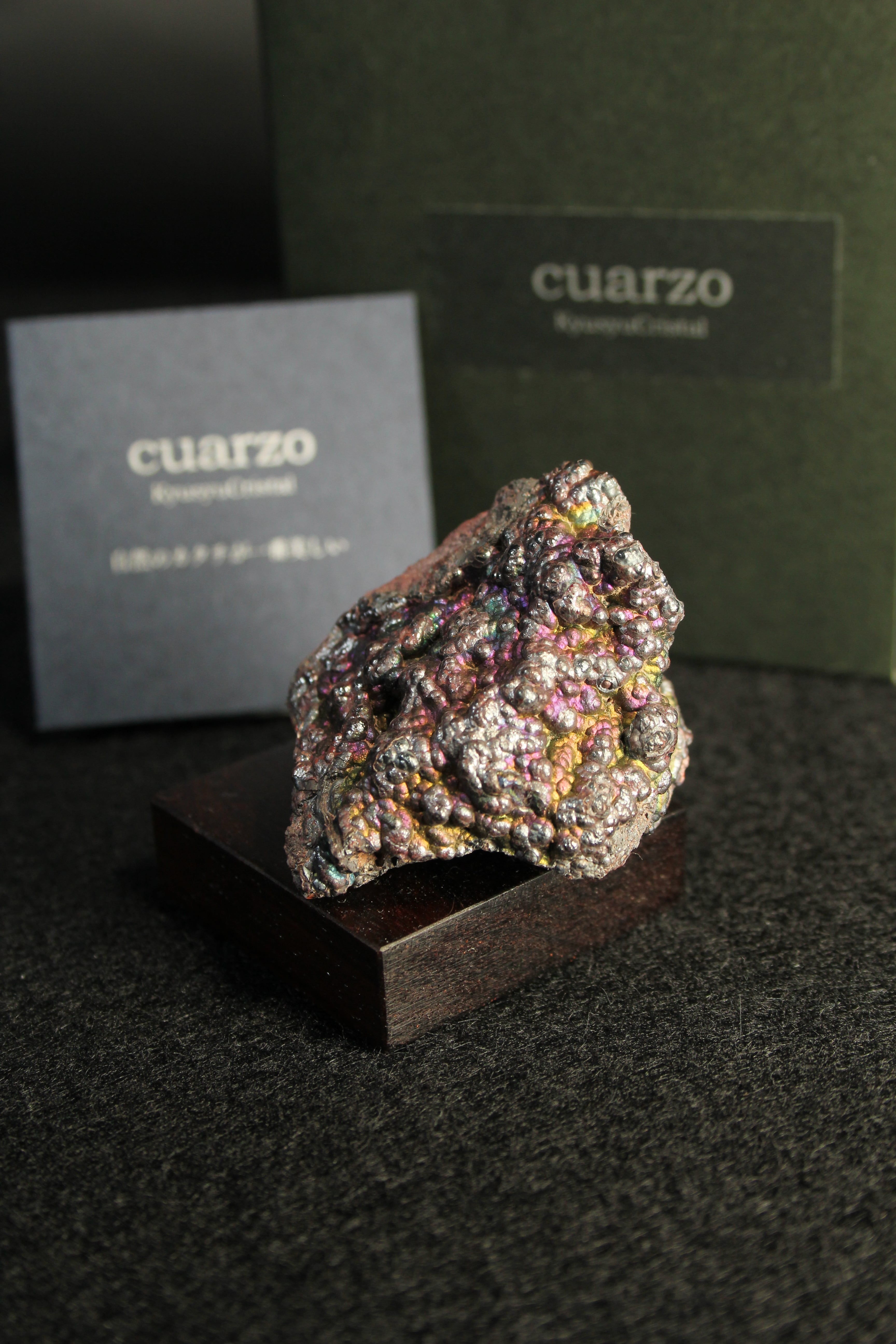 【商品説明】:宮崎産赤鉄鉱の原石と高級木材のローズウッドを使用した置物。赤鉄鋼の表面に酸化皮膜がコーティングされ、光の回折・干渉作用によって遊色に輝く天然のレインボーヘマタイトです。スペインなどの海外産のものは、NETなどでたまに見かけますが、国産のレインボーヘマタイトは非常に珍しいです。形状はブツブツした葡萄状と、ミルフィーユのように層になったものがありますが、こちらは葡萄状です。その中でもこのレインボーヘマタイトは、青、銀、緑などの色が見える。