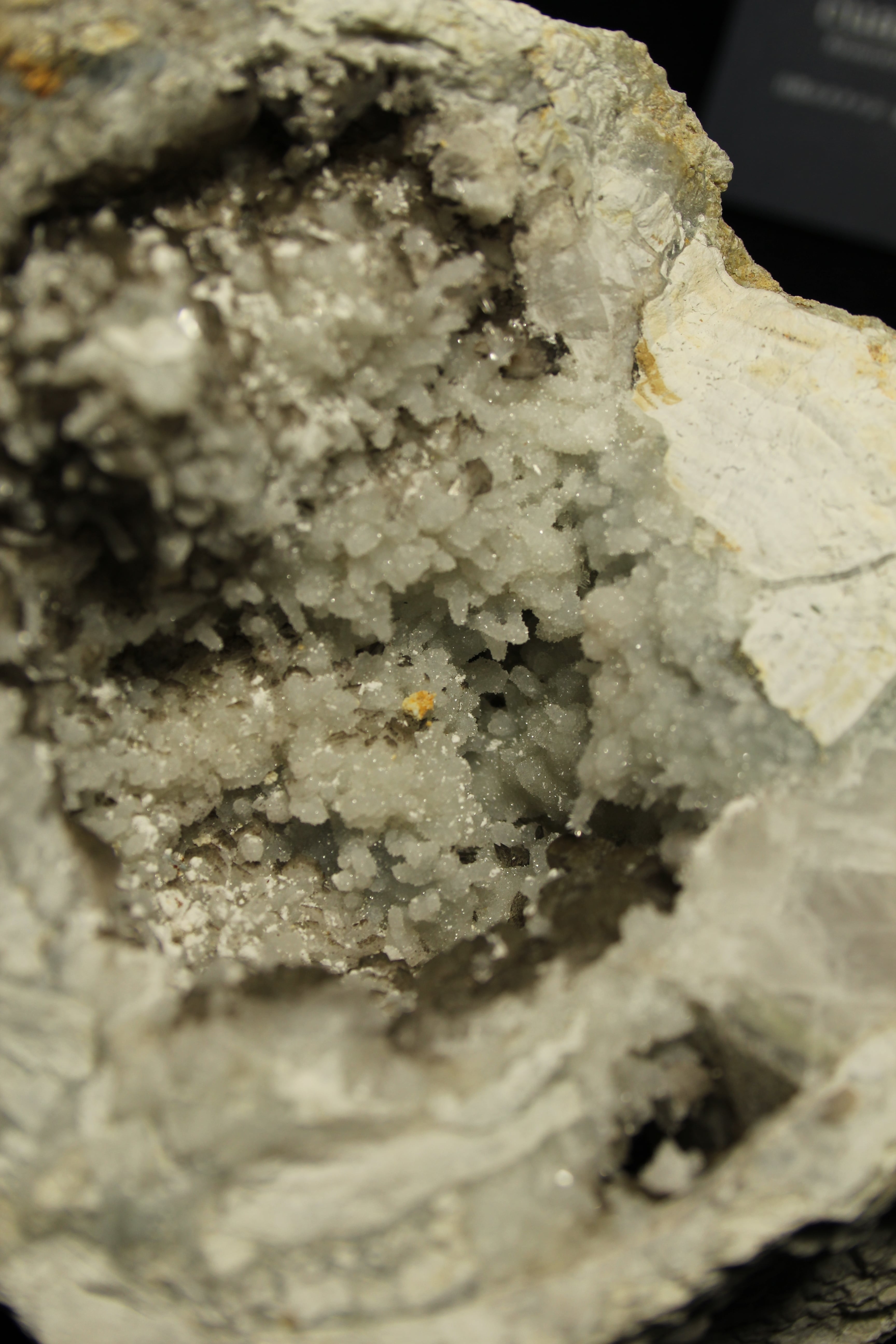 【産地の特徴】:日本では数少ないジオードが見つかる産地。白っぽい粘土質の崖から丸い玉石が出てくる。この石は、球顆流紋岩。流紋岩は花崗岩と同じような成分だが、花崗岩はマグマが地下深くでくゆっくり固まってできるのに対し,流紋岩は地表付近で急に冷えて固まる。ここの球顆流紋岩は、中が空洞になるものがあり、そこから水晶や方解石が出てくる。丸い石の全て空洞になっている訳では無く、空洞でも水晶が出てくるか、方解石が出てくるかはわかない。