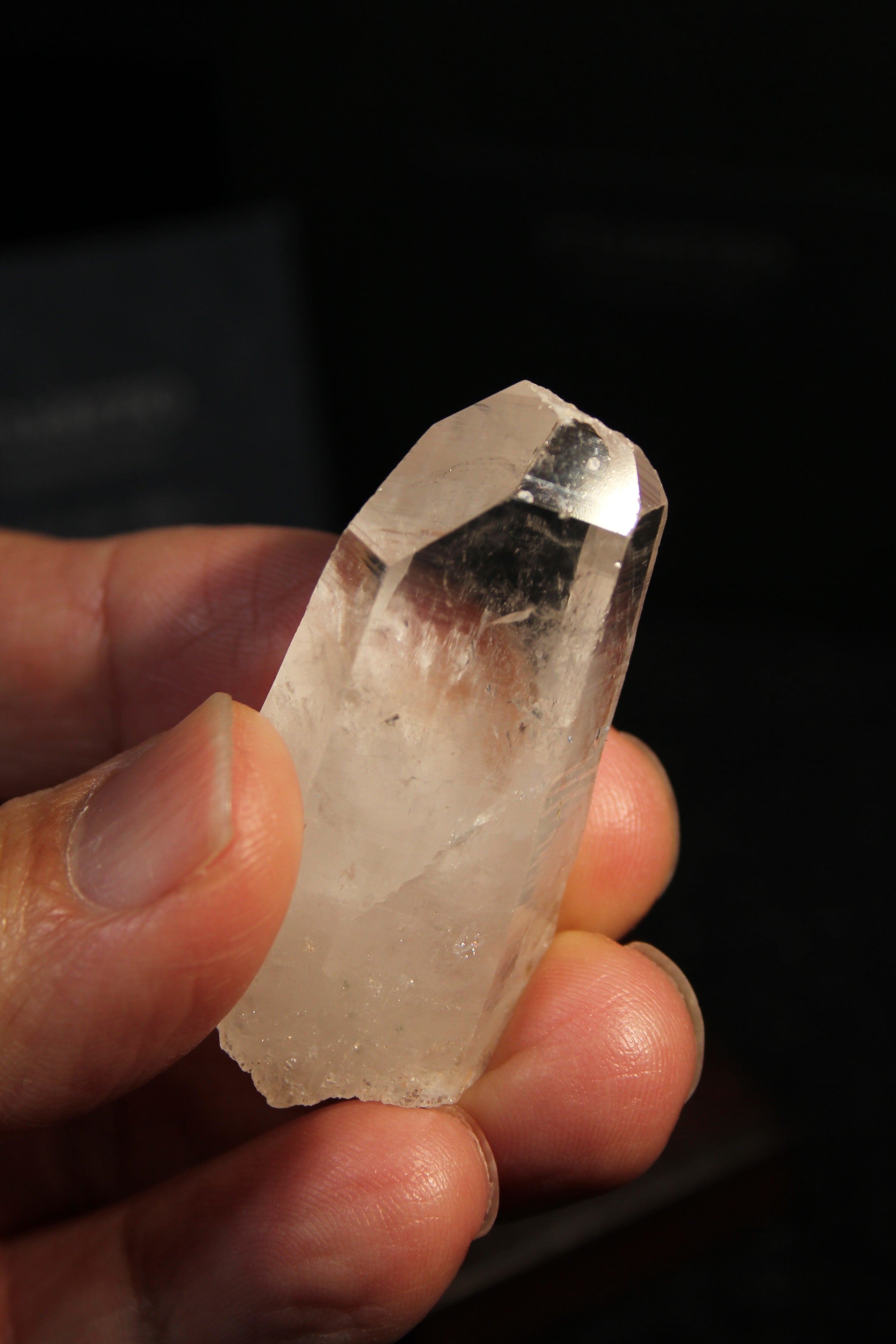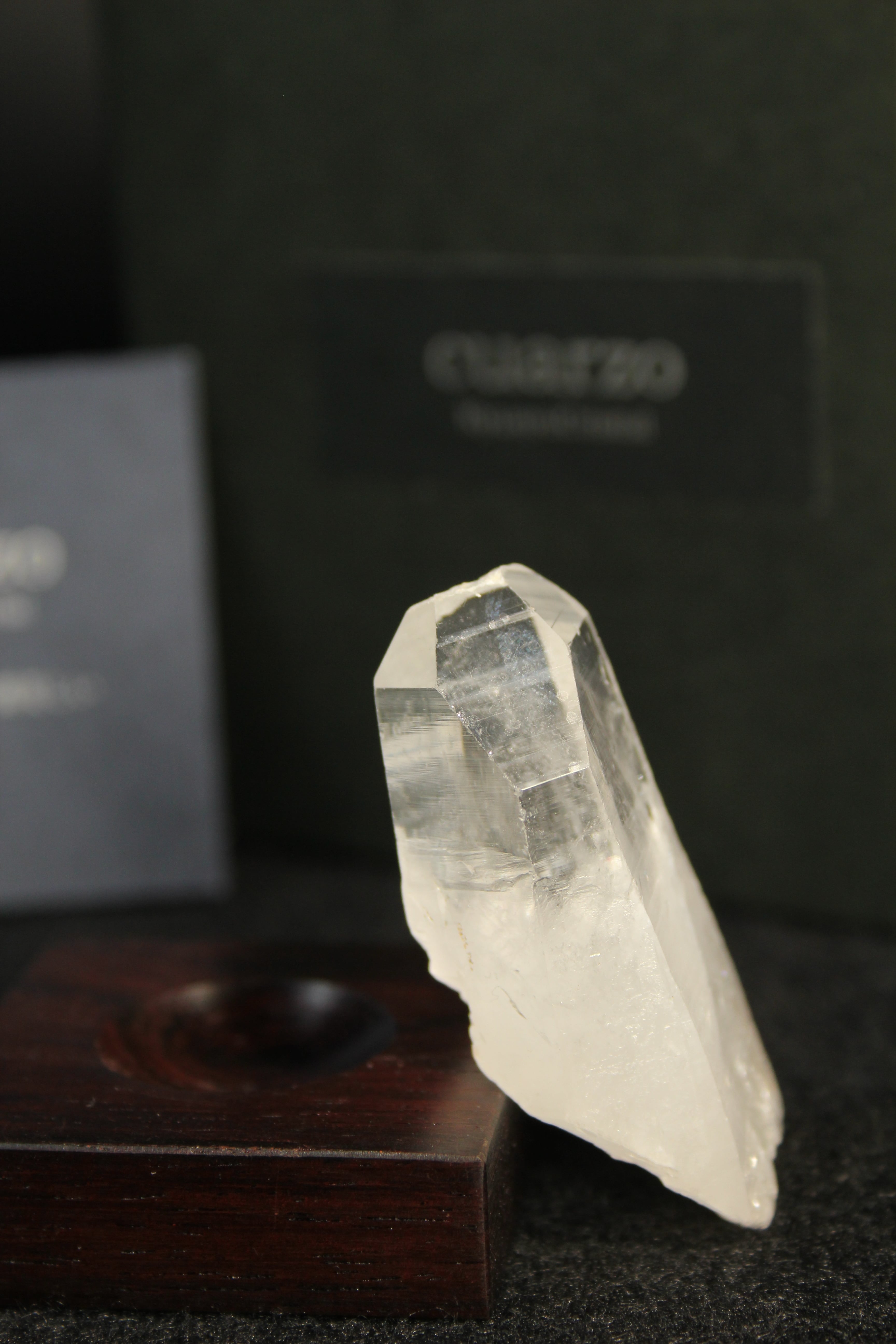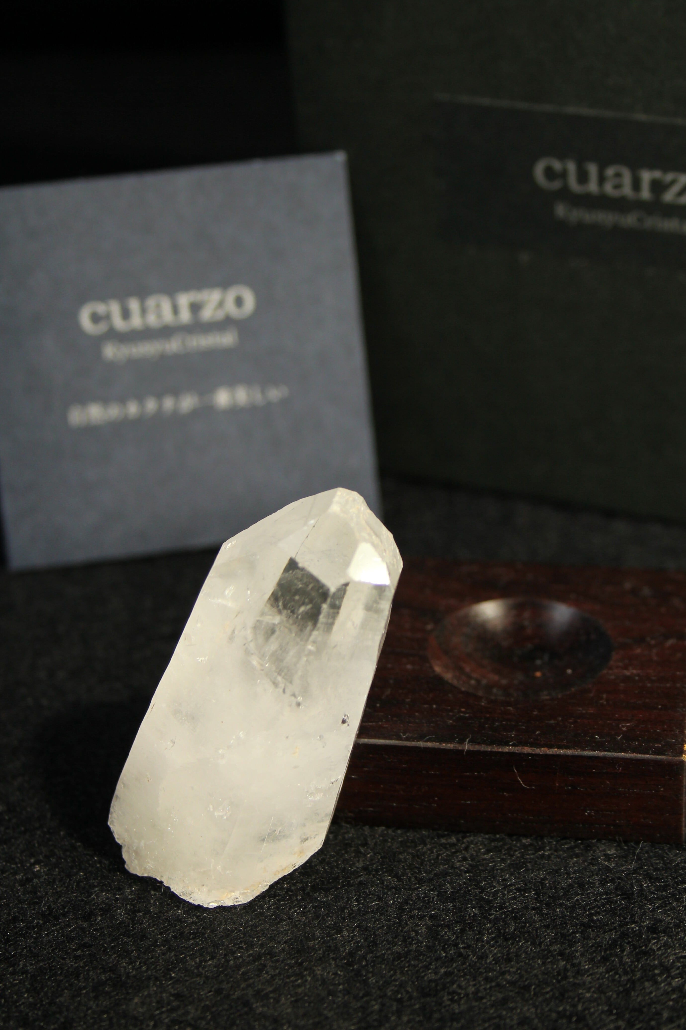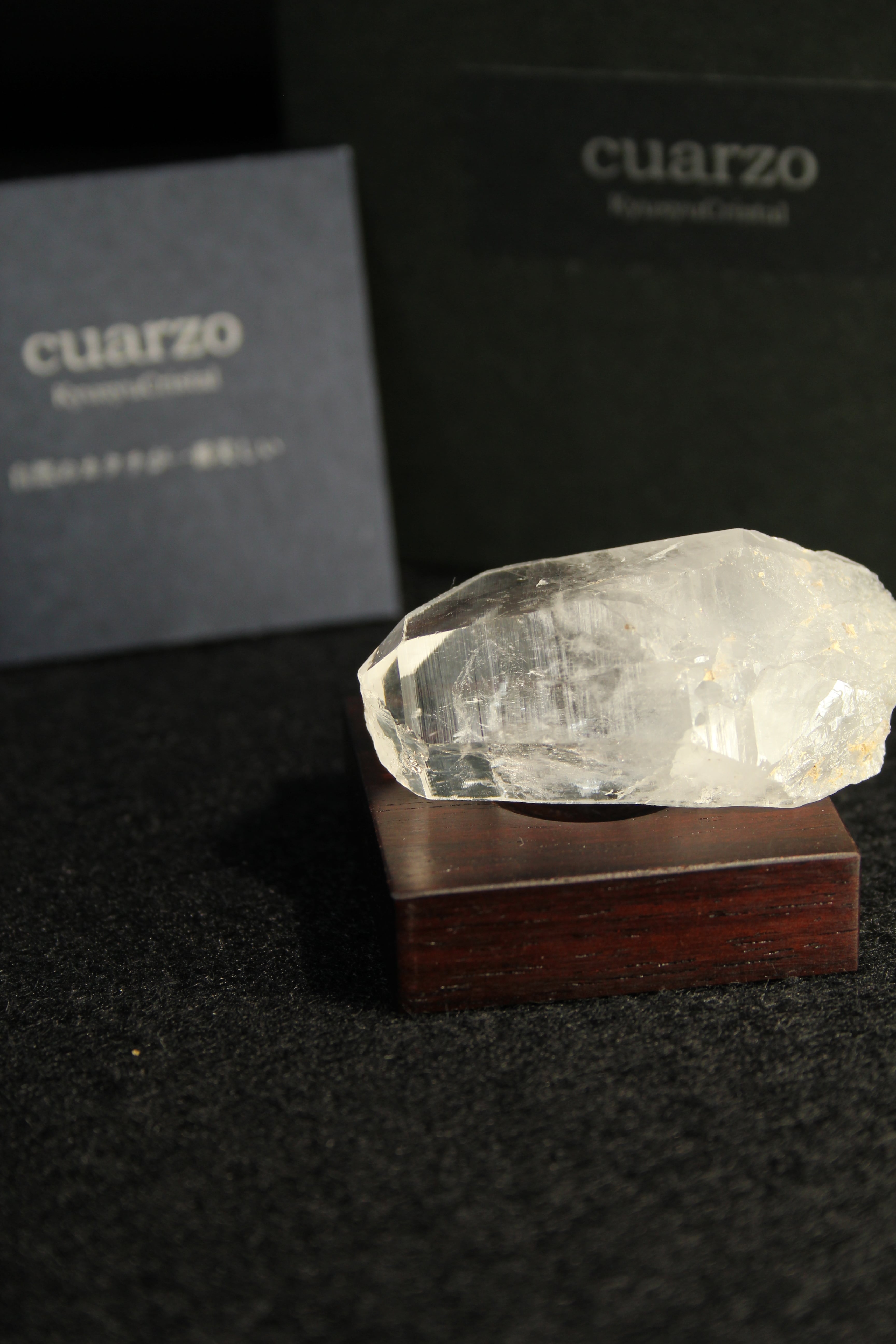 【商品説明】:水晶の原石と高級木材のローズウッドを使用した置物。宮崎クリスタルの中でも、極限られた地域でしか産出されない透明度が抜群に高い日之影町見立産の水晶です。TOPに若干の欠けがあるが、その山傷もカッコイイ宮崎クリスタルです。ローズウッドベースの大きさ(約40x40x12mm)水晶を置く部分には「座ぐり」と呼ばれる円形の溝を掘っております。簡単のように見えますが、硬い木材のローズウッドに、一定の深さの溝を掘るには、非常に高度な技術を用います。木工歴50年の職人が成せる技です