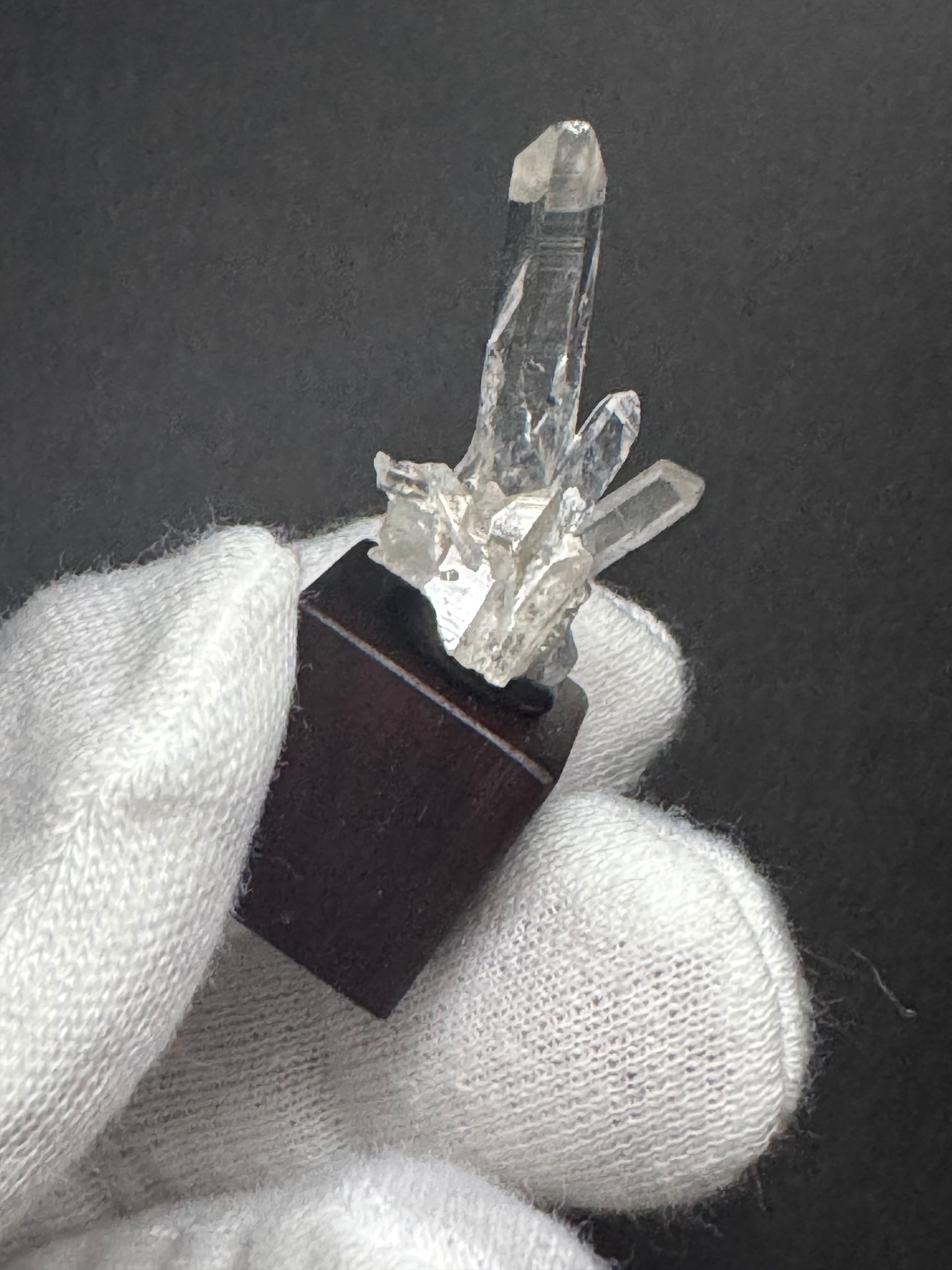 【商品説明】:水晶の原石と高級木材のローズウッドを使用した置物。コロンビアレムリアンを彷彿させるような透明度が高い宮崎産水晶。それぞれ長さの違う3本のポイント水晶が交差しています。ローズウッドキューブの大きさ(約15x15x15mm)