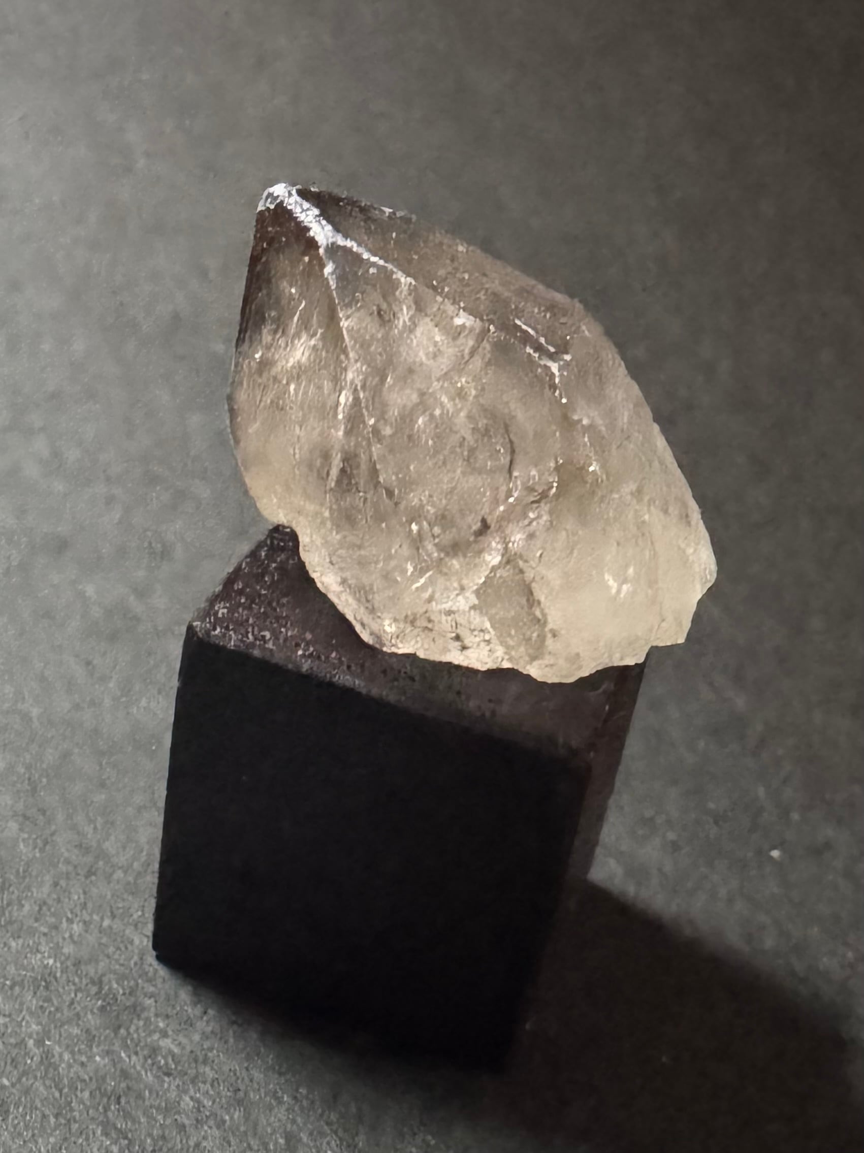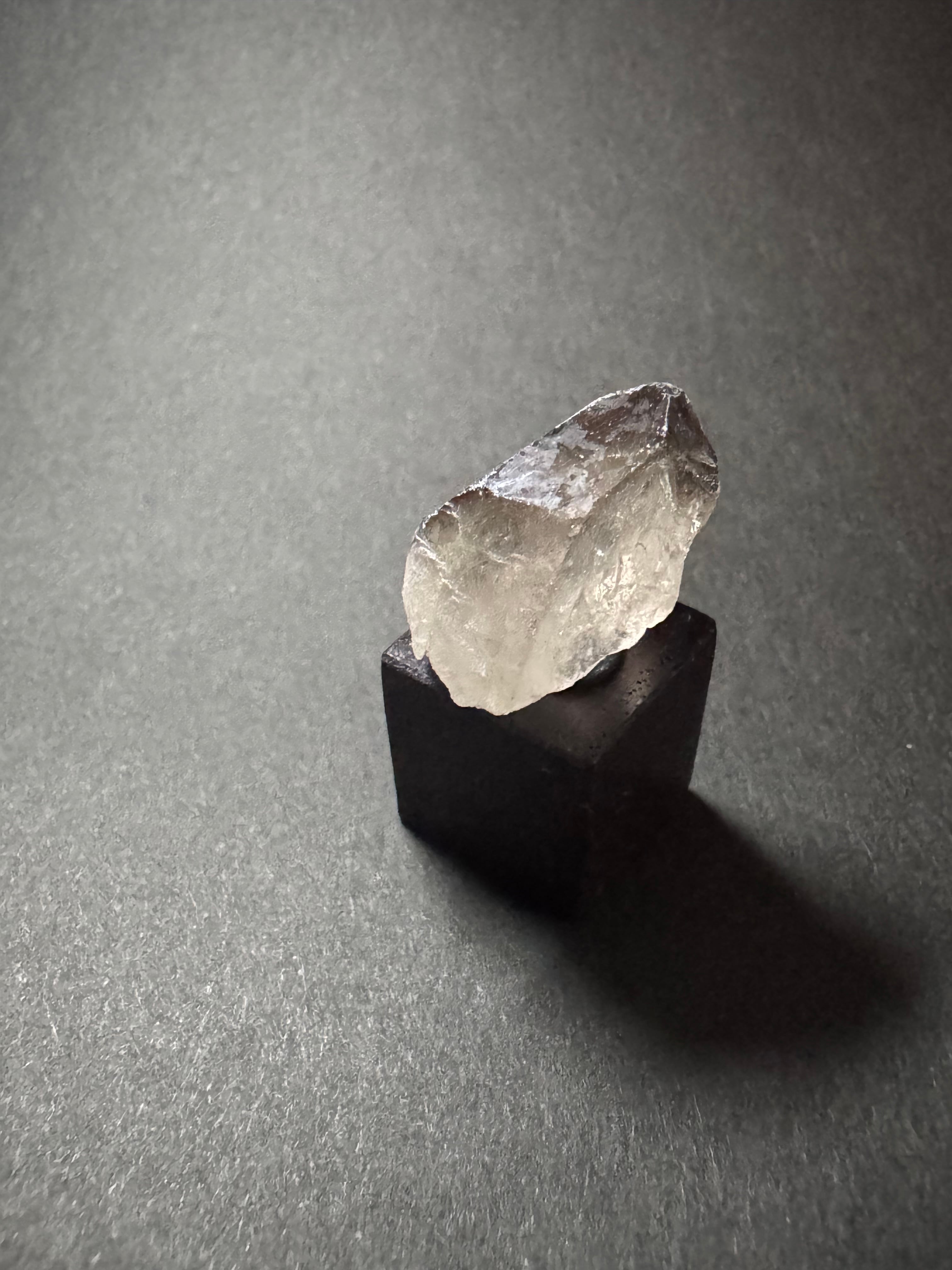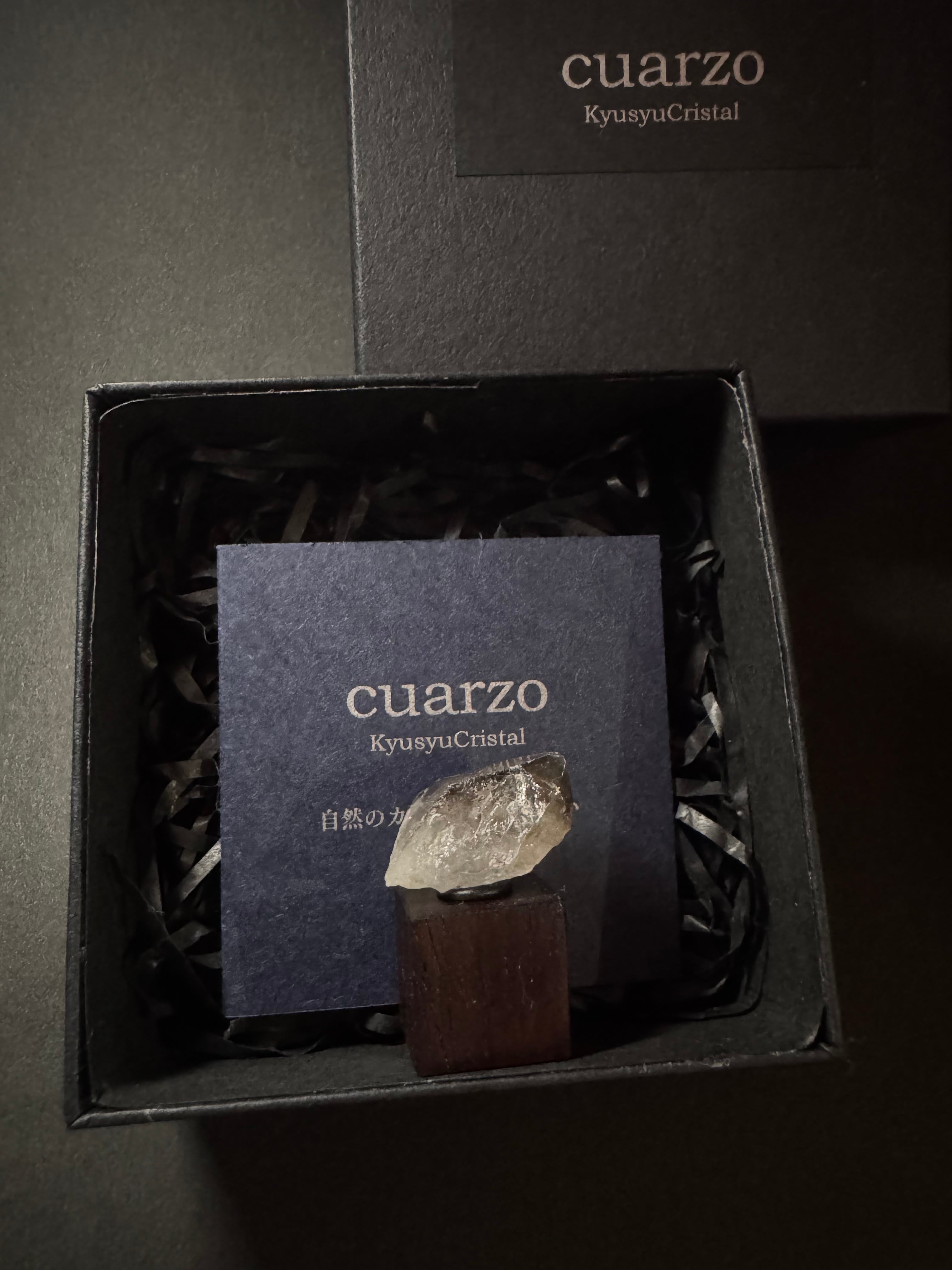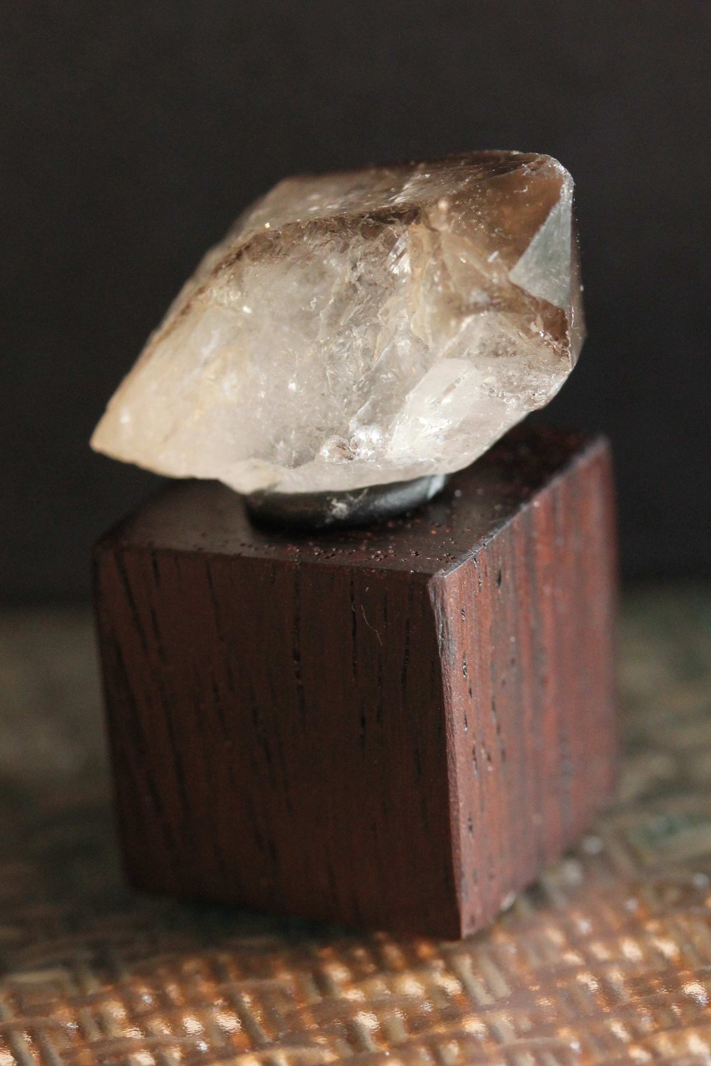 【商品説明】:煙水晶の原石と高級木材のローズウッドを使用した置物。どちらかというとグレーに近い感じの透明感溢れる宮崎産の煙水晶です。水晶の中のクラックが光に当たるとキレイです。ローズウッドキューブの大きさ(約15x15x15mm)