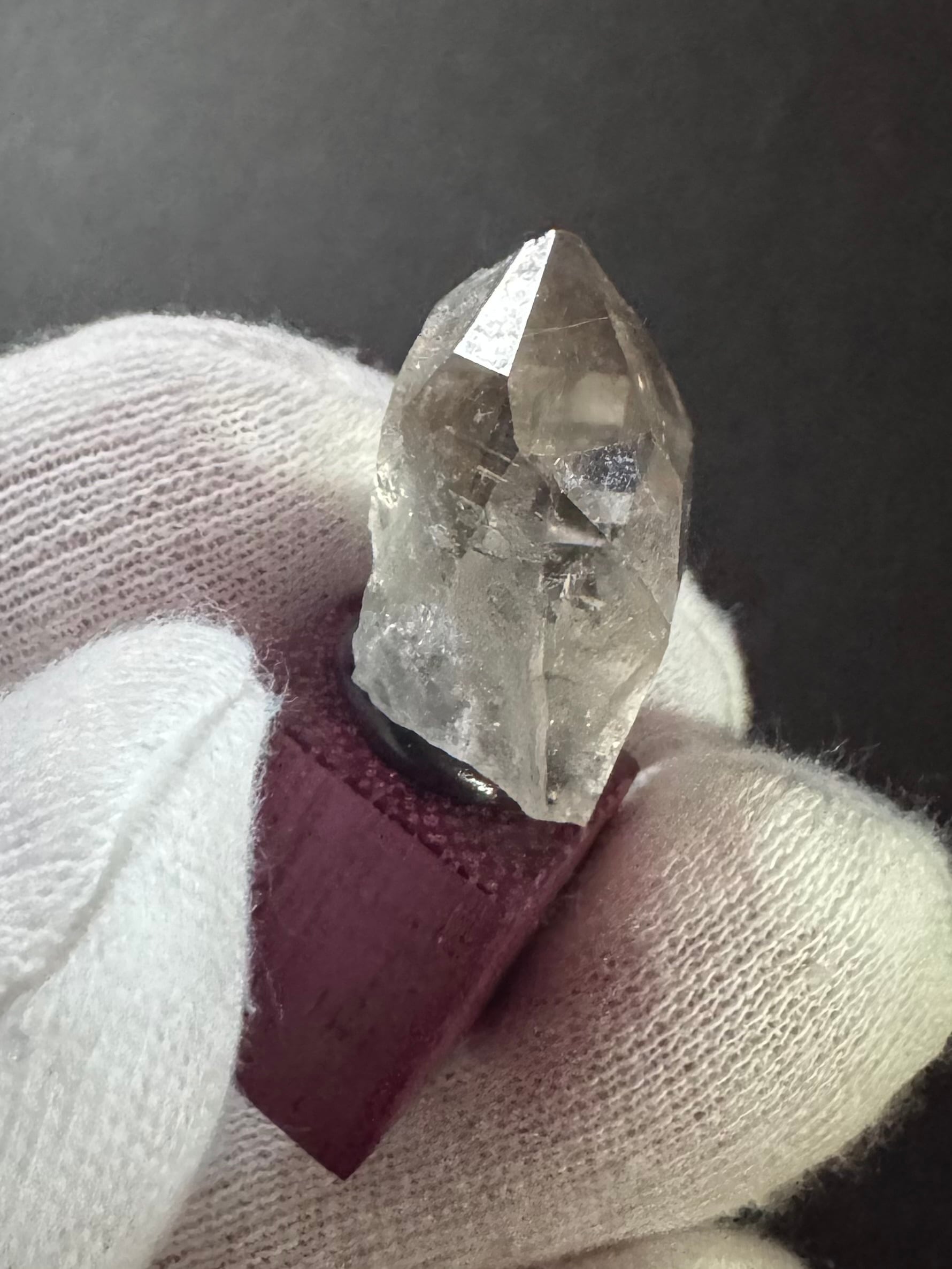【商品説明】:煙水晶の原石と高級木材のパープルハートキューブを使用した置物。全体的に薄いグレーに近い感じの透明感溢れる宮崎産の煙水晶です。背面のクラックが光に当たるとキレイです。パープルハートキューブの大きさ(約15x15x15mm)
