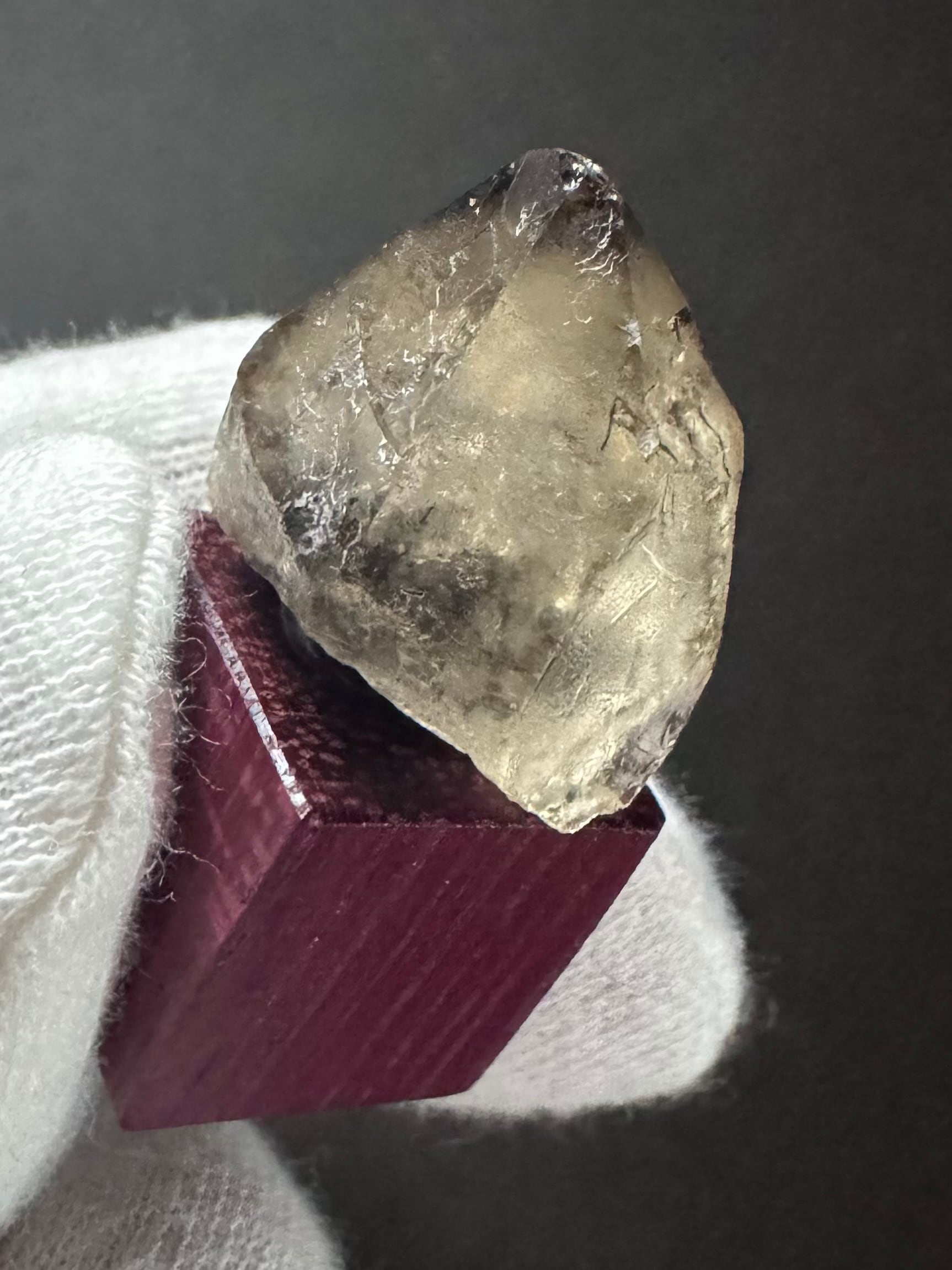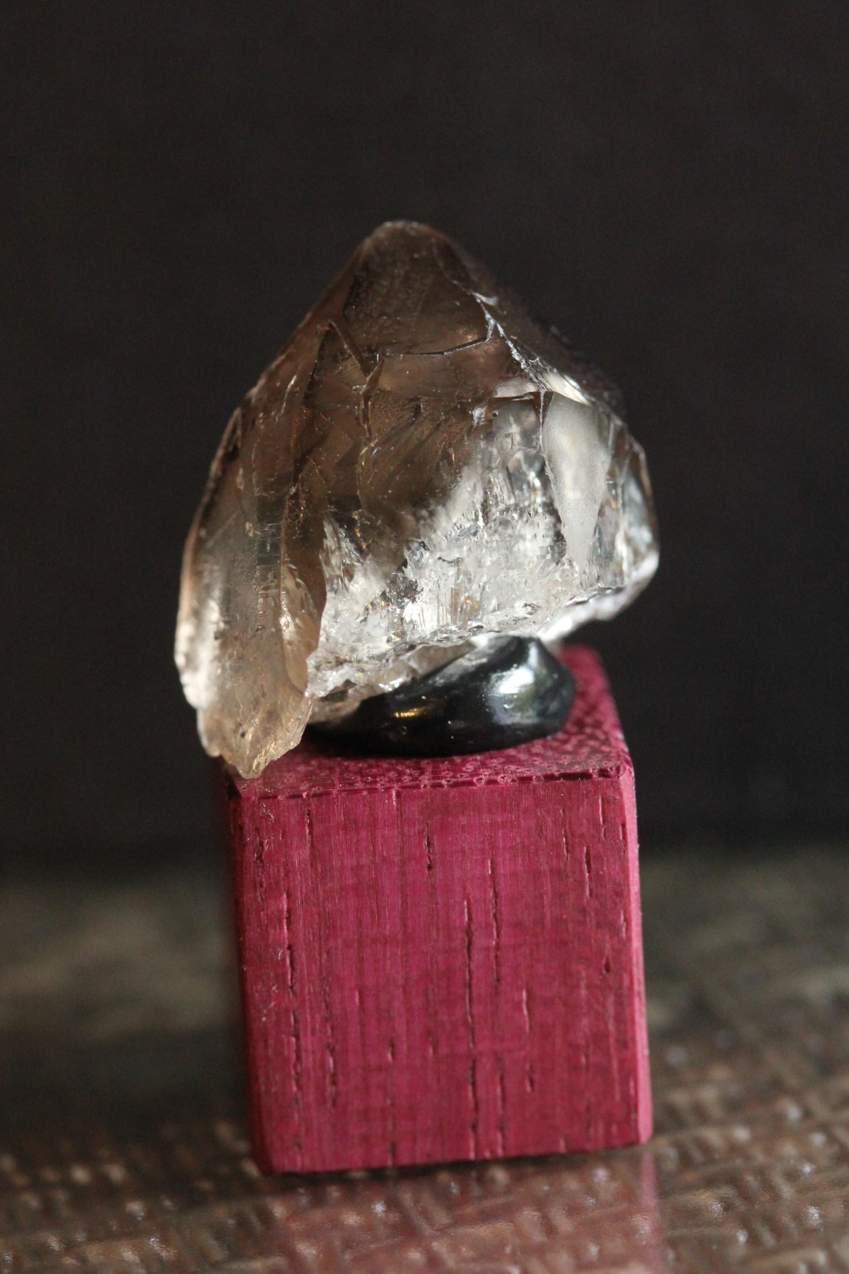 【商品説明】:煙水晶の原石と高級木材のパープルハートキューブを使用した置物。この産地に多いコロンとした姿がカワイイ宮崎産の煙水晶です。水晶の中のクラックが光に当たるとキレイです。パープルハートキューブの大きさ(約15x15x15mm)