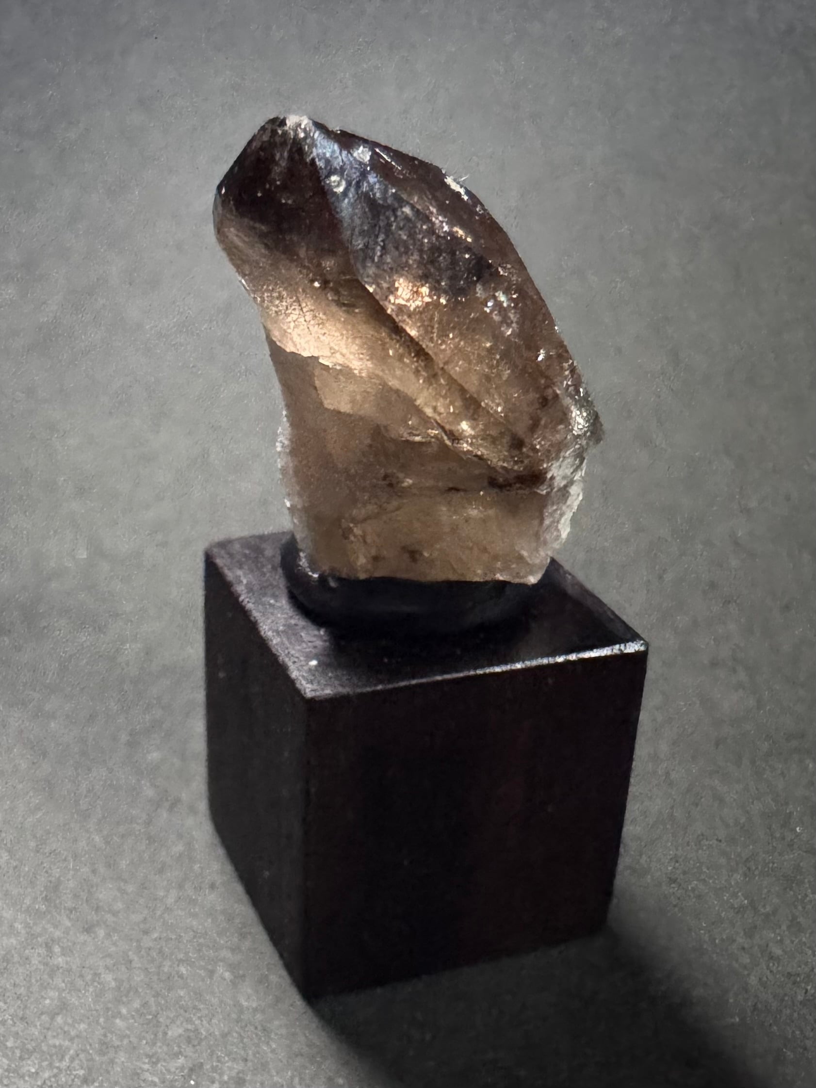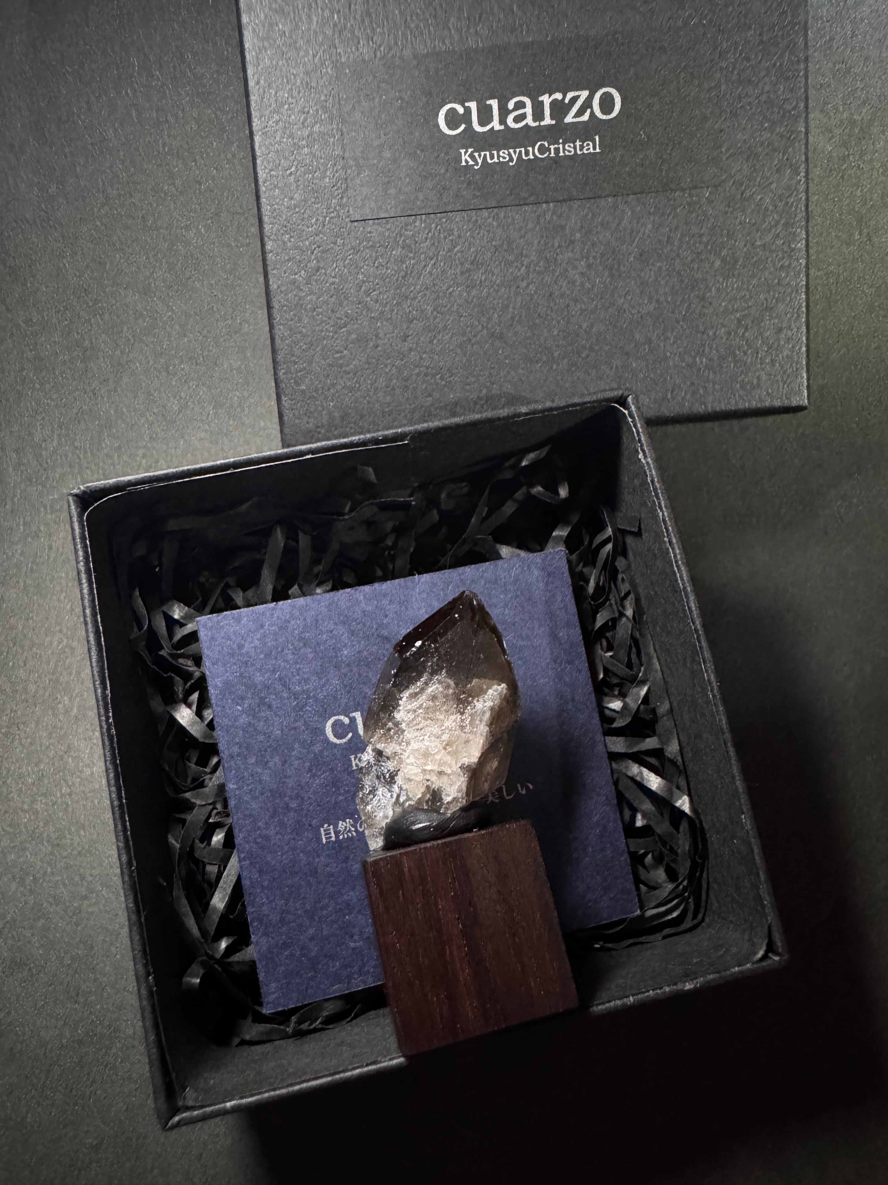 【商品説明】:煙水晶の原石と高級木材のローズウッドを使用した置物。どちらかというとブラウンに近い感じの透明感溢れる宮崎産の煙水晶です。背面の他の鉱物の干渉によってできたえぐられたような山傷が、よりワイルドさを引き立てています。ローズウッドキューブの大きさ(約20x20x20mm)