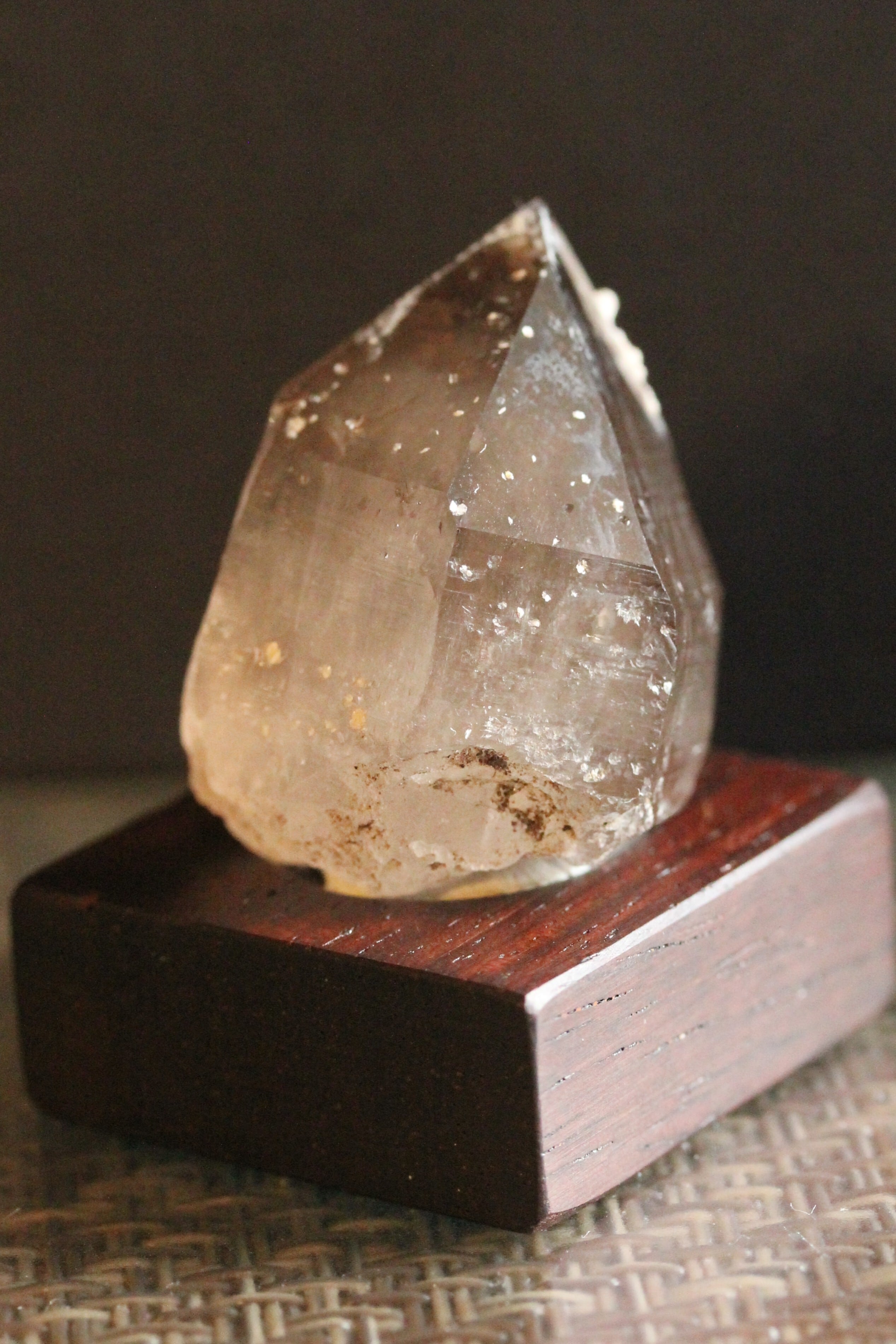 【商品説明】:煙水晶の原石と高級木材のローズウッドを使用した置物。ボリューム感のあるコロンとした姿が愛らしい宮崎産の煙水晶です。錐面に貼り付いた長石の残骸がワンポイントです。ローズウッドベースの大きさ(約30x30x12mm)水晶を置く部分には「座ぐり」と呼ばれる円形の溝を掘っております。簡単のように見えますが、硬い木材のローズウッドに、一定の深さの溝を掘るには、非常に高度な技術を用います。木工歴50年の職人が成せる技です