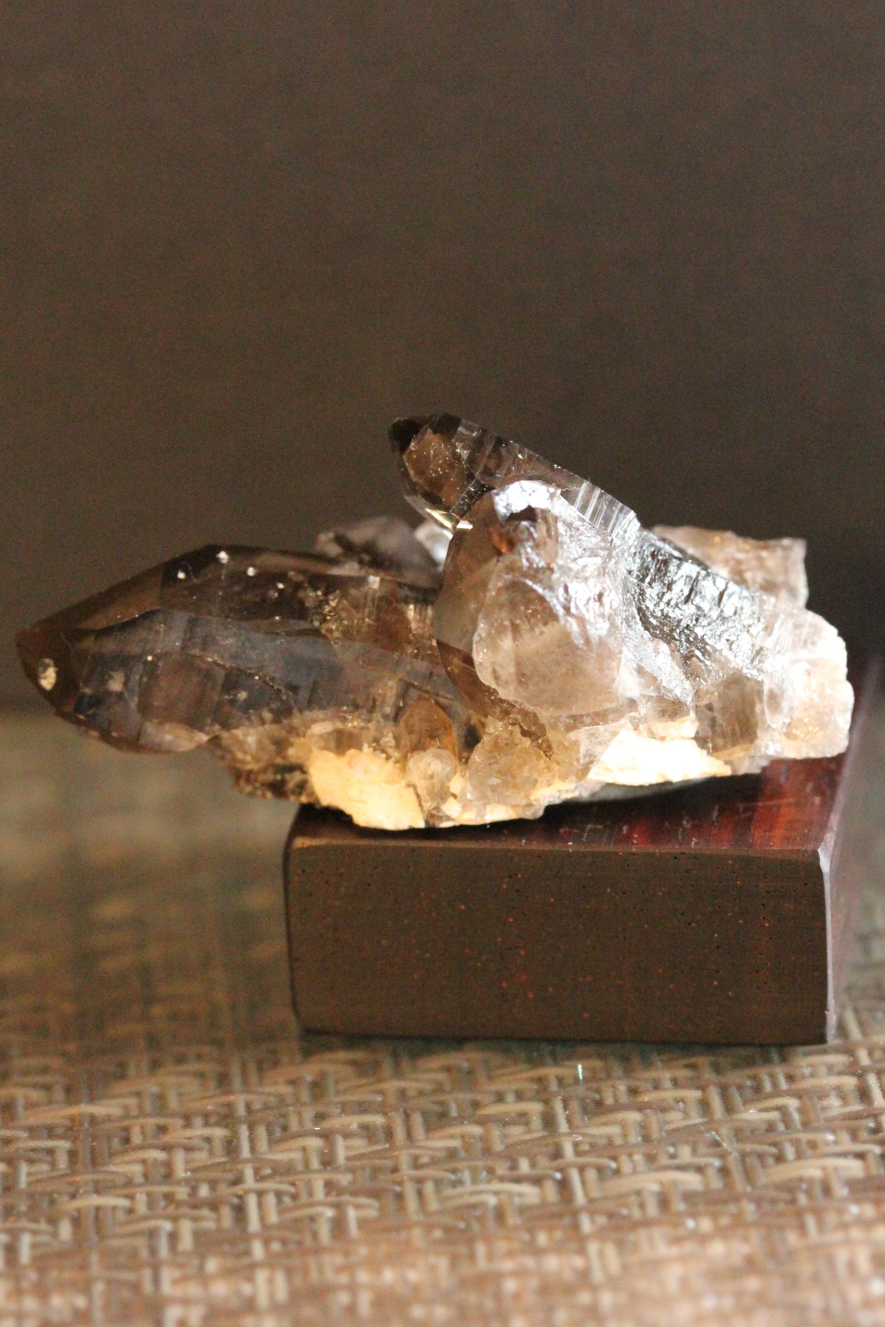 【商品説明】:煙水晶の原石と高級木材のローズウッドを使用した置物。透明感溢れる煙をまとったような宮崎産の煙水晶が3つ付いたミニクラスターです。3つとも淡い雲のようなファントムになっています。このタイプは、この産地の中でも限られた範囲でしか取れない煙水晶です。ローズウッドベースの大きさ(約30x30x12mm)水晶を置く部分には「座ぐり」と呼ばれる円形の溝を掘っております。簡単のように見えますが、硬い木材のローズウッドに、一定の深さの溝を掘るには、非常に高度な技術を用います。木工歴50年の職人が成せる技です