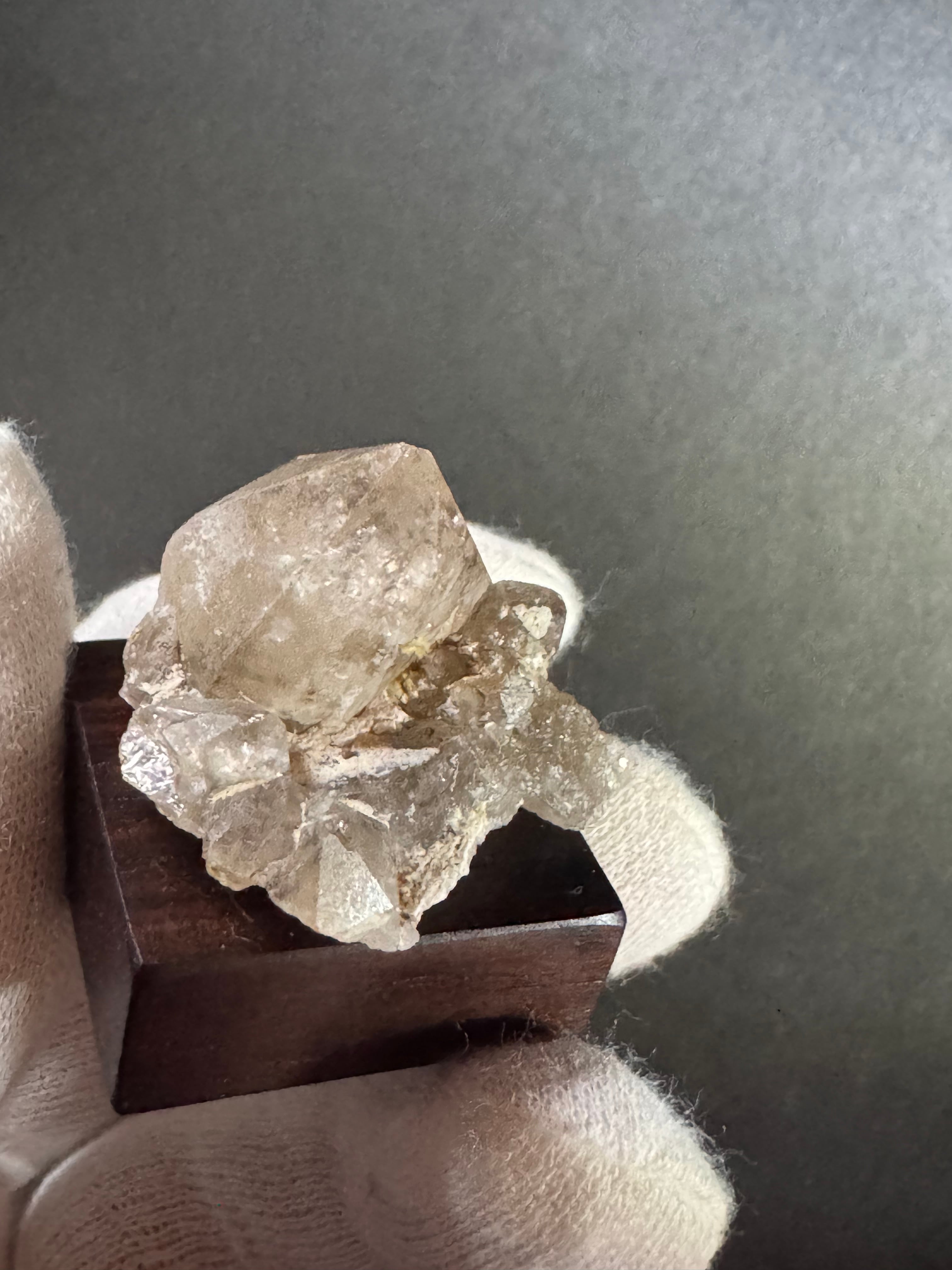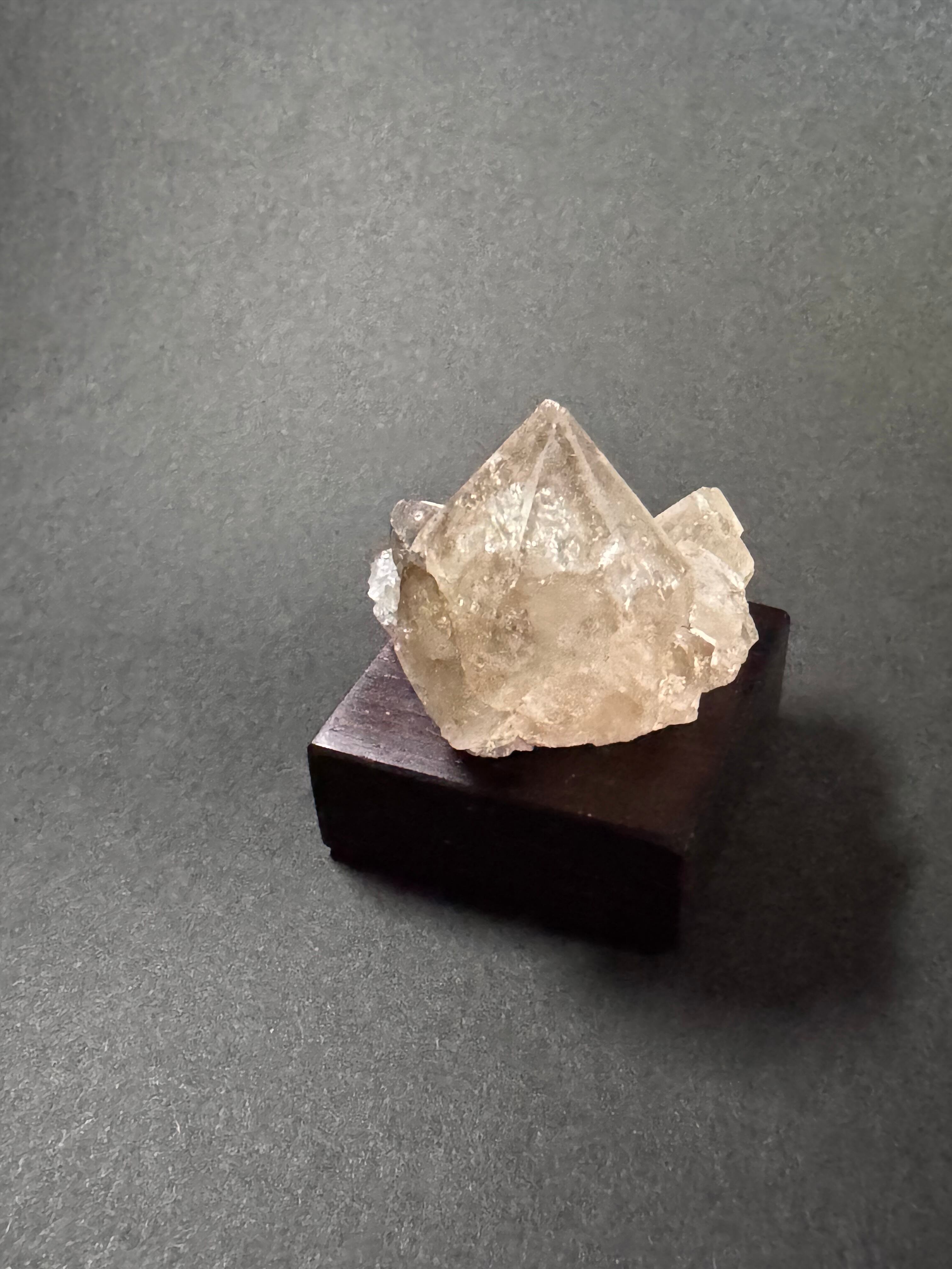 【商品説明】:煙水晶の原石と高級木材のローズウッドを使用した置物。全体的に薄いグレーに近い感じの透明感溢れる宮崎産の煙水晶です。大きい水晶のまわりに、かわいい小さな水晶が何個か付いています。水晶の中のクラックが光の確度によってレインボーに光る虹入りです。ローズウッドベースの大きさ(約30x30x12mm)水晶を置く部分には「座ぐり」と呼ばれる円形の溝を掘っております。簡単のように見えますが、硬い木材のローズウッドに、一定の深さの溝を掘るには、非常に高度な技術を用います。木工歴50年の職人が成せる技です